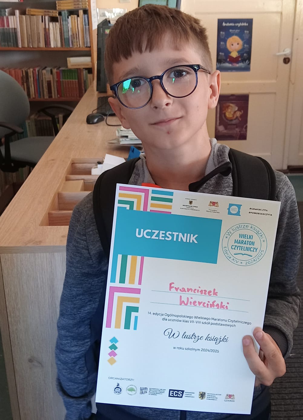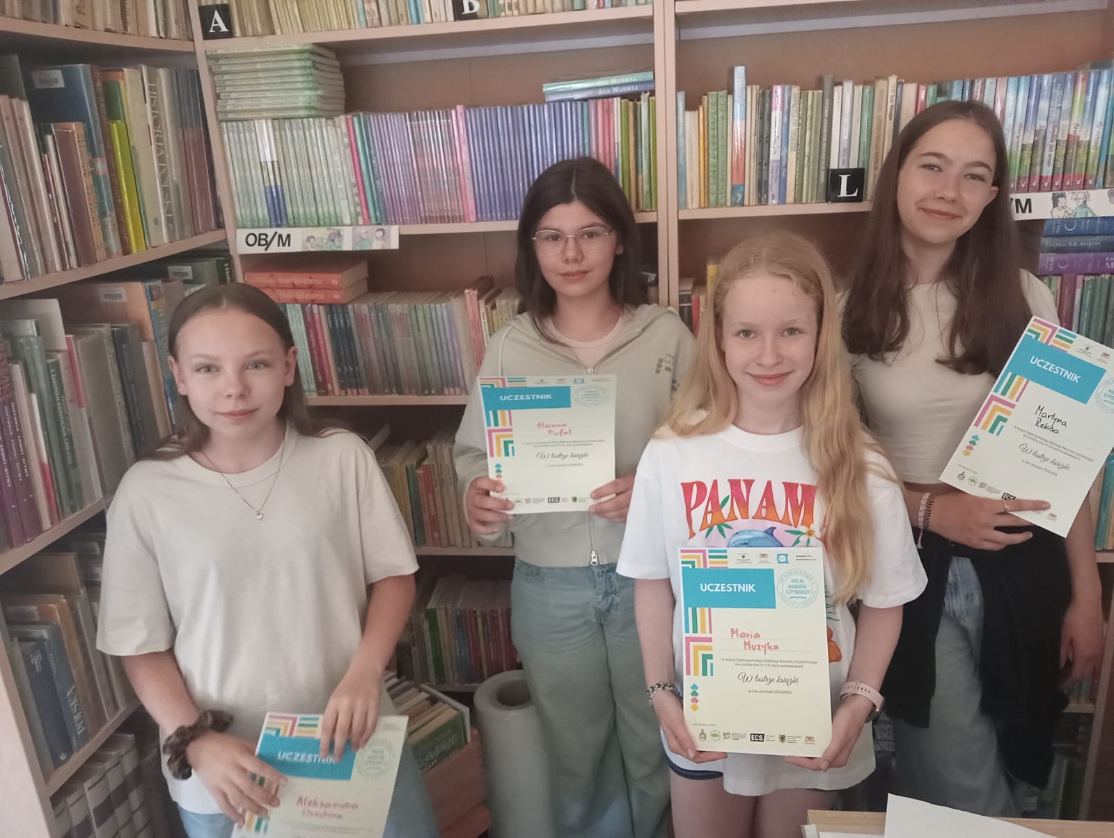 Szkolny aktyw czytelniczy odebrał wczoraj w bibliotece z rąk nauczycieli p. Adama Liszewskiego i p. Janiny Łańko dyplomy za udział w ogólnopolskim konkursie czytelniczym WMC oraz za ogólną promocję czytelnictwa w szkole, pomoc biblioteczną i wyniki czytelnicze. Czytelnikami tymi są: Amelka, Jakub, Zuzia, Lena, Ola, Martyna, Franek, Michalina, Maria, Hania oraz Natalka. Na pewno uczestnictwo w konkursach czytelniczych było wspaniałą przygodą, która na długo pozostanie w ich pamięci i zachęci też innych do sięgnięcia po książkę.