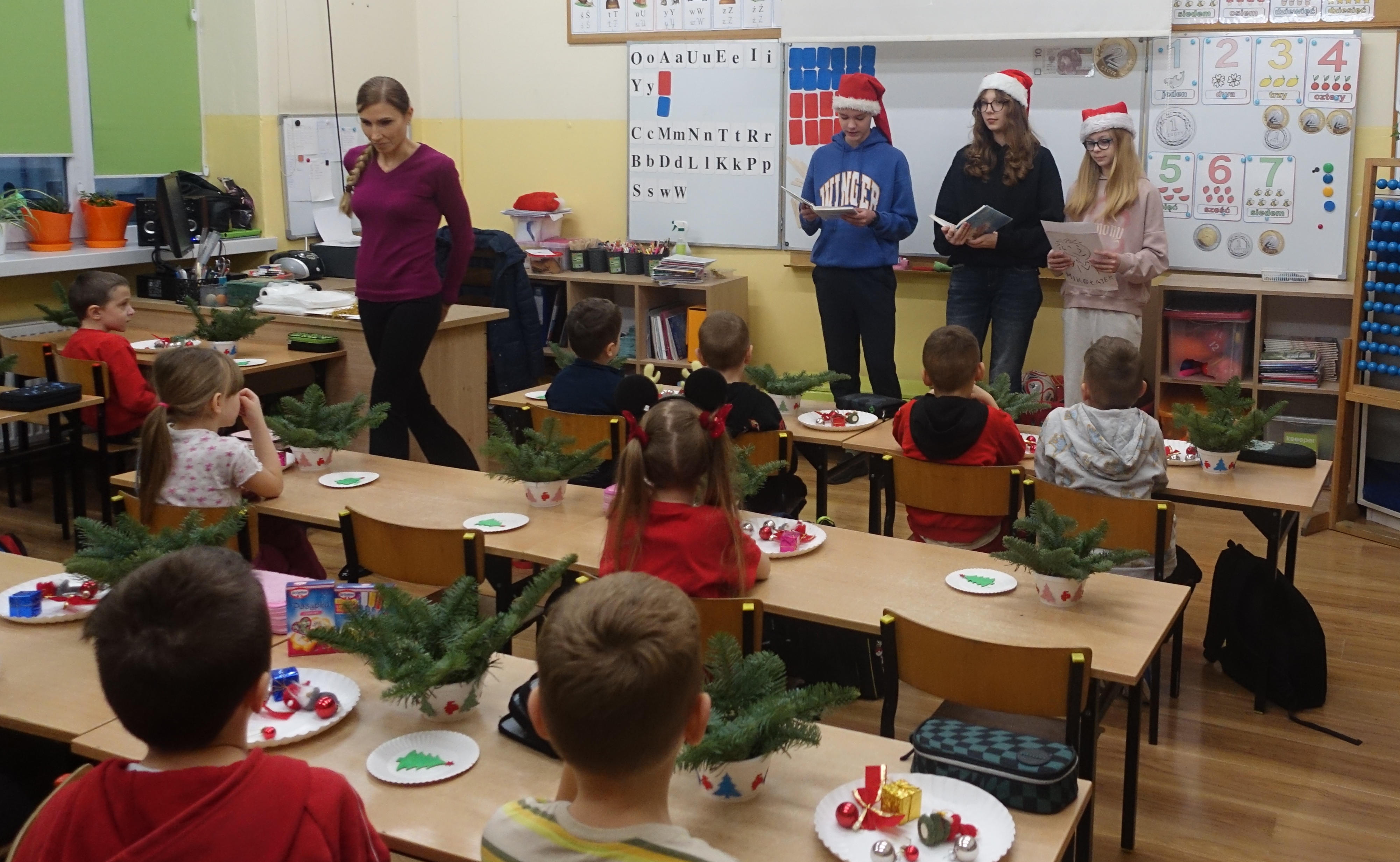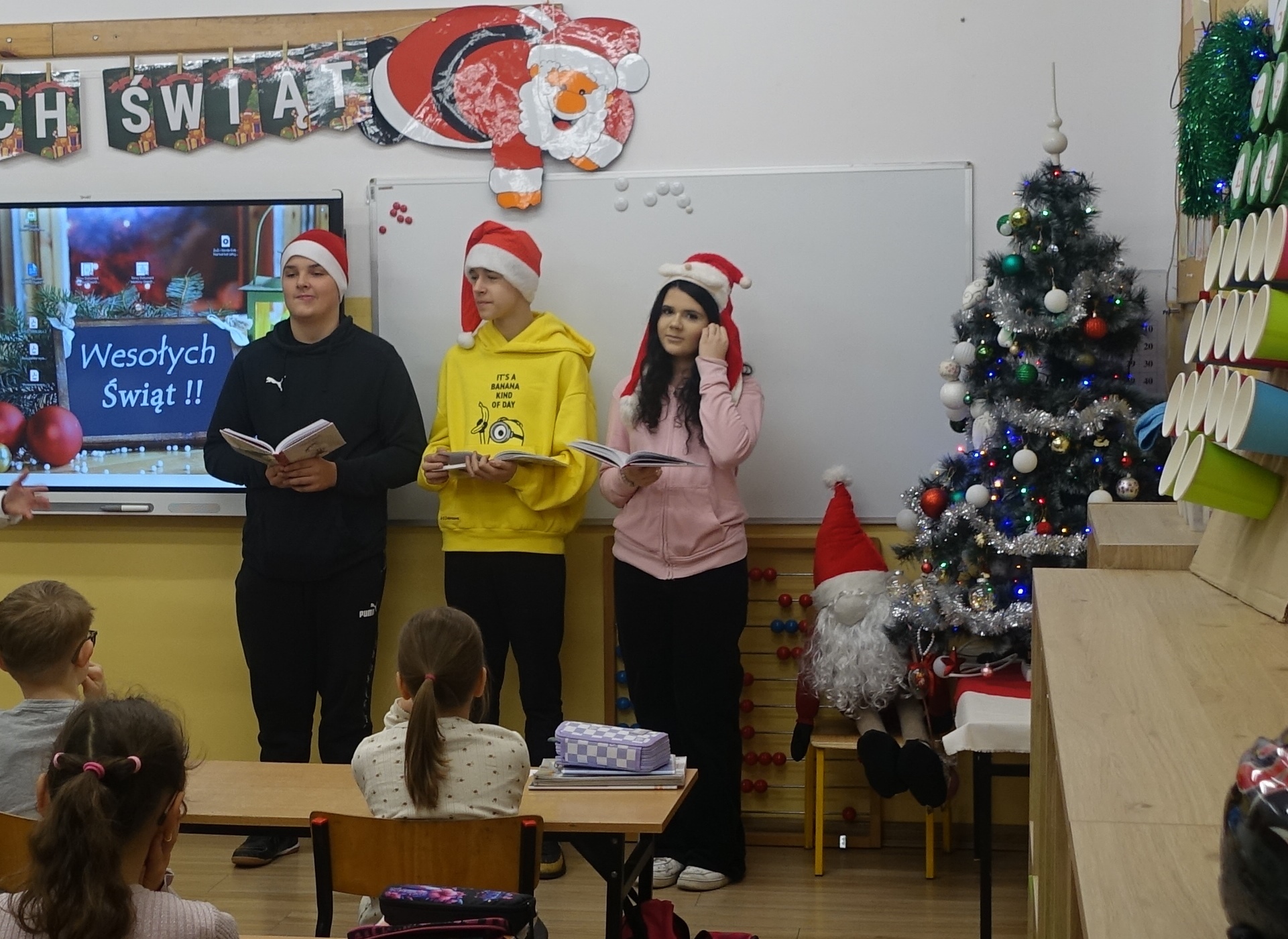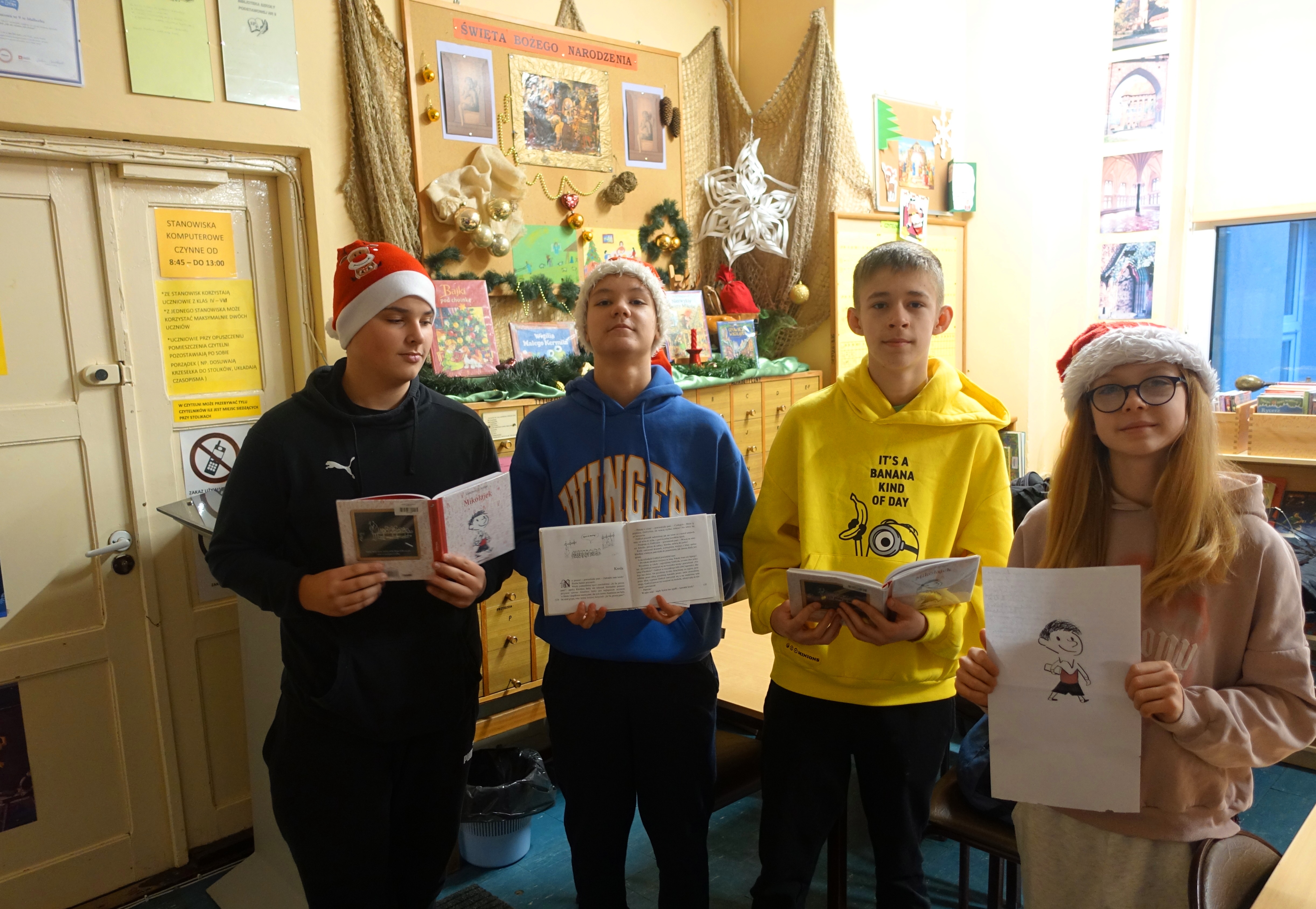 Dnia 18 grudnia szkolny aktyw czytelniczy ( Janek, Zuzia K., Zuzia W., Weronika, Bartek i Kuba z kl. 7b) /pod opieką p.Janiny Łańko i p.Adama Liszewskiego/ czytał fragmenty Mikołajka uczniom klas I-III, który wprowadził najmłodszych uczniów naszej szkoły w magiczny, przedświąteczny nastrój. Książki o Mikołajku /autor R. Goscinny i J.Sempe / to idealna lektura dla klas młodszych, ponieważ opisują świat widziany oczami dziecka, pełen humoru, drobnych kłótni i wielkich przyjaźni.. Seria o Mikołajku idealnie wpisuje się w czas świąt Bożego Narodzenia, gdyż w opowiadaniu "Mikołaje" chłopiec i jego koledzy przeżywają magię przygotowań do świąt, choć często ich starania o bycie grzecznymi kończą się zabawnymi kłopotami.