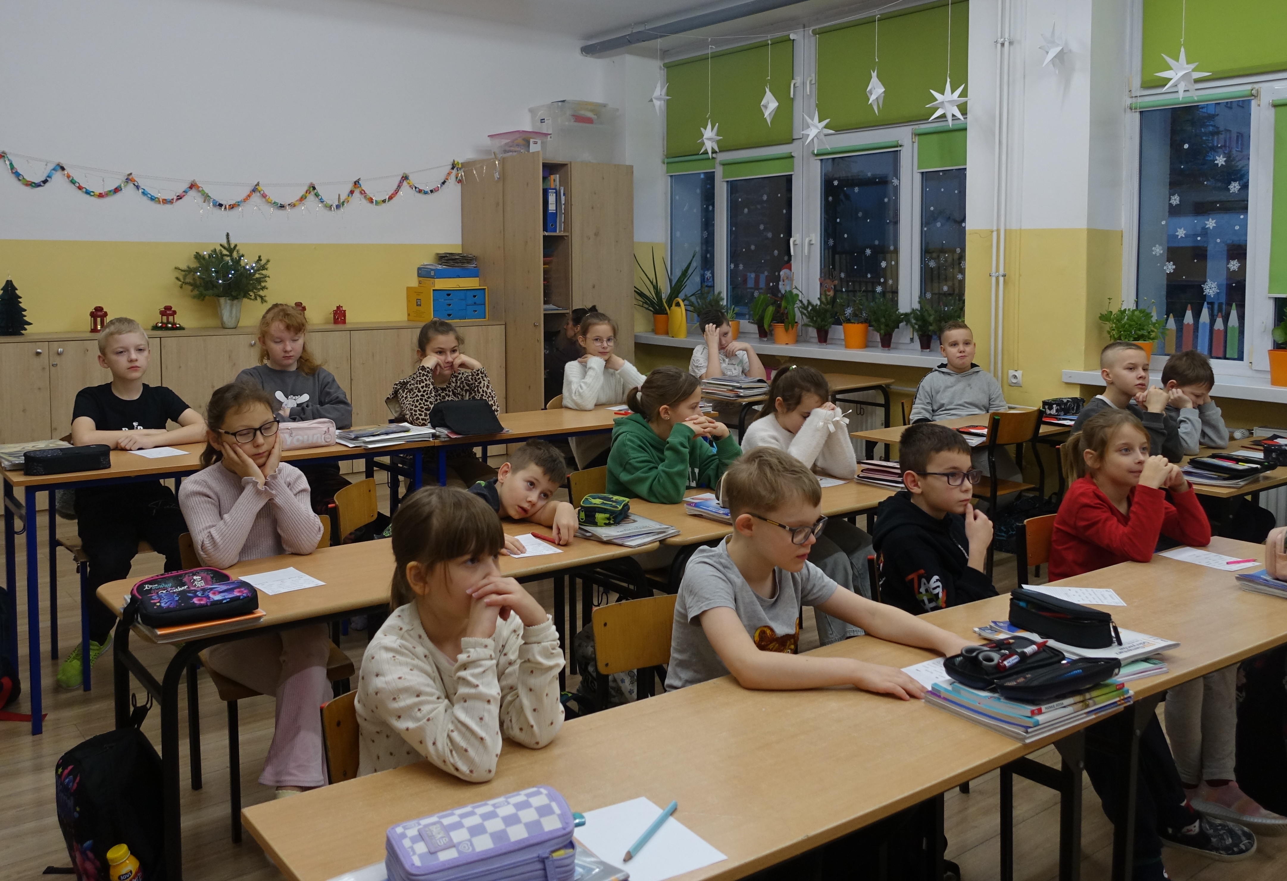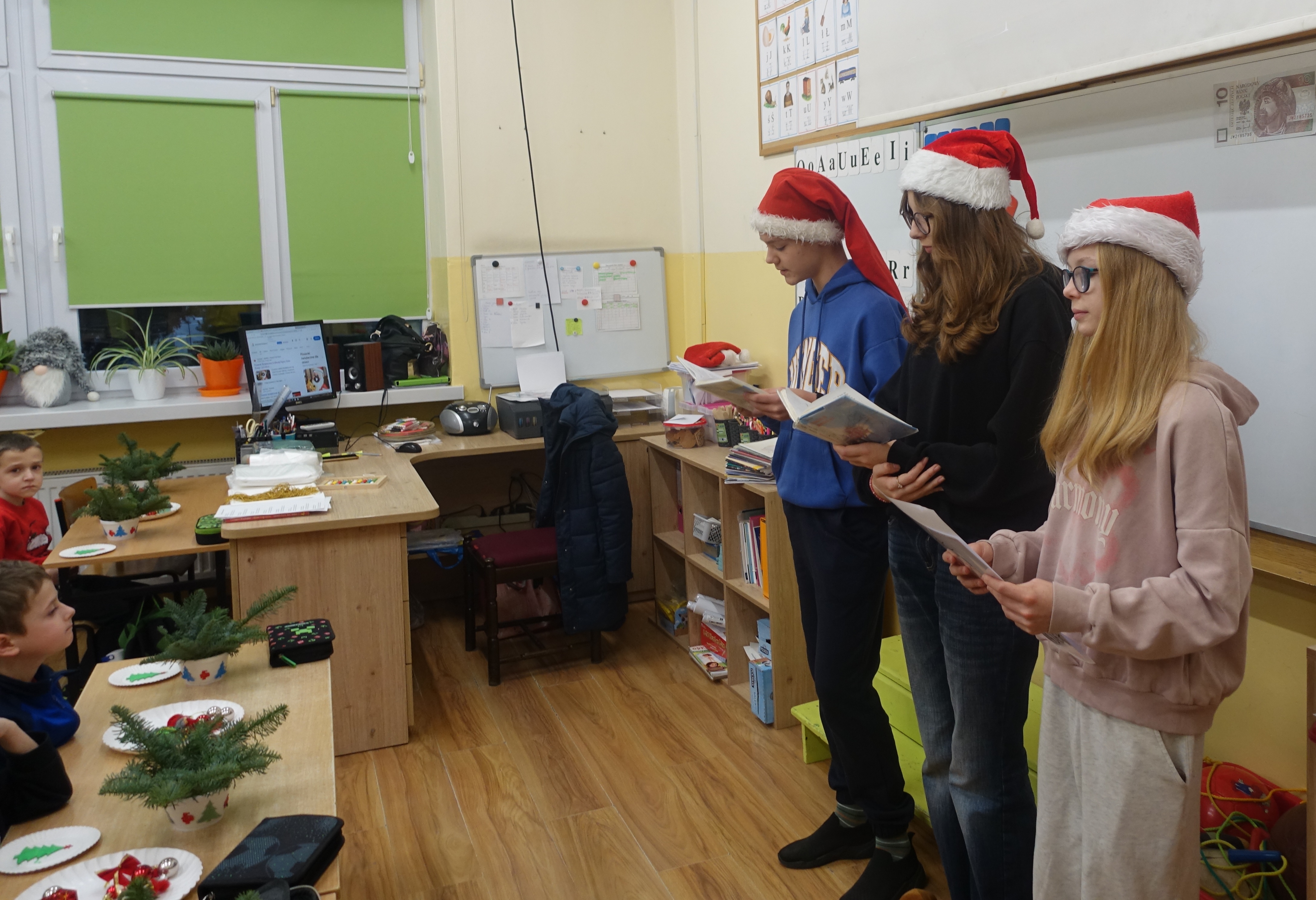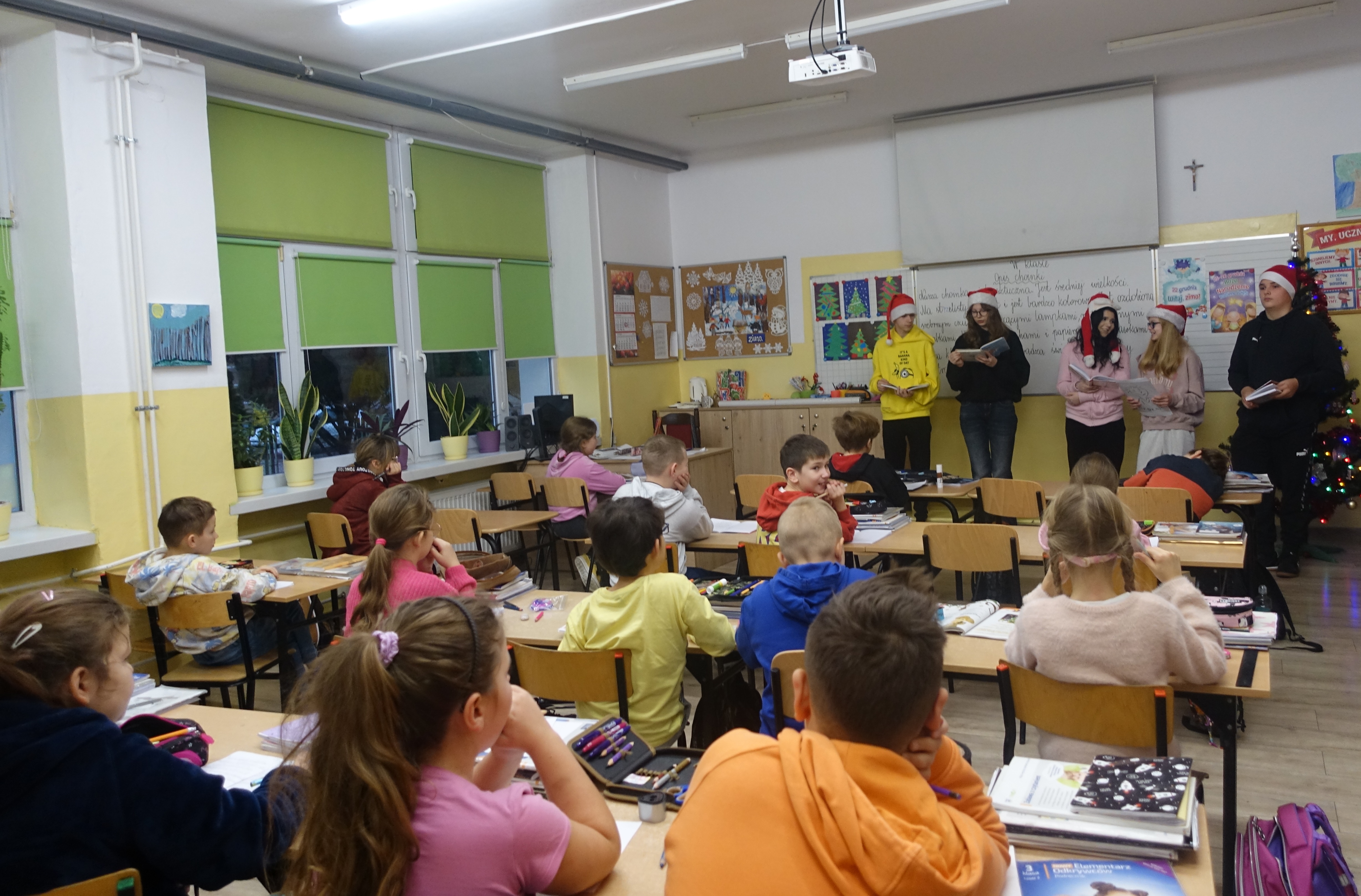 Dnia 18 grudnia szkolny aktyw czytelniczy ( Janek, Zuzia K., Zuzia W., Weronika, Bartek i Kuba z kl. 7b) /pod opieką p.Janiny Łańko i p.Adama Liszewskiego/ czytał fragmenty Mikołajka uczniom klas I-III, który wprowadził najmłodszych uczniów naszej szkoły w magiczny, przedświąteczny nastrój. Książki o Mikołajku /autor R. Goscinny i J.Sempe / to idealna lektura dla klas młodszych, ponieważ opisują świat widziany oczami dziecka, pełen humoru, drobnych kłótni i wielkich przyjaźni.. Seria o Mikołajku idealnie wpisuje się w czas świąt Bożego Narodzenia, gdyż w opowiadaniu "Mikołaje" chłopiec i jego koledzy przeżywają magię przygotowań do świąt, choć często ich starania o bycie grzecznymi kończą się zabawnymi kłopotami.