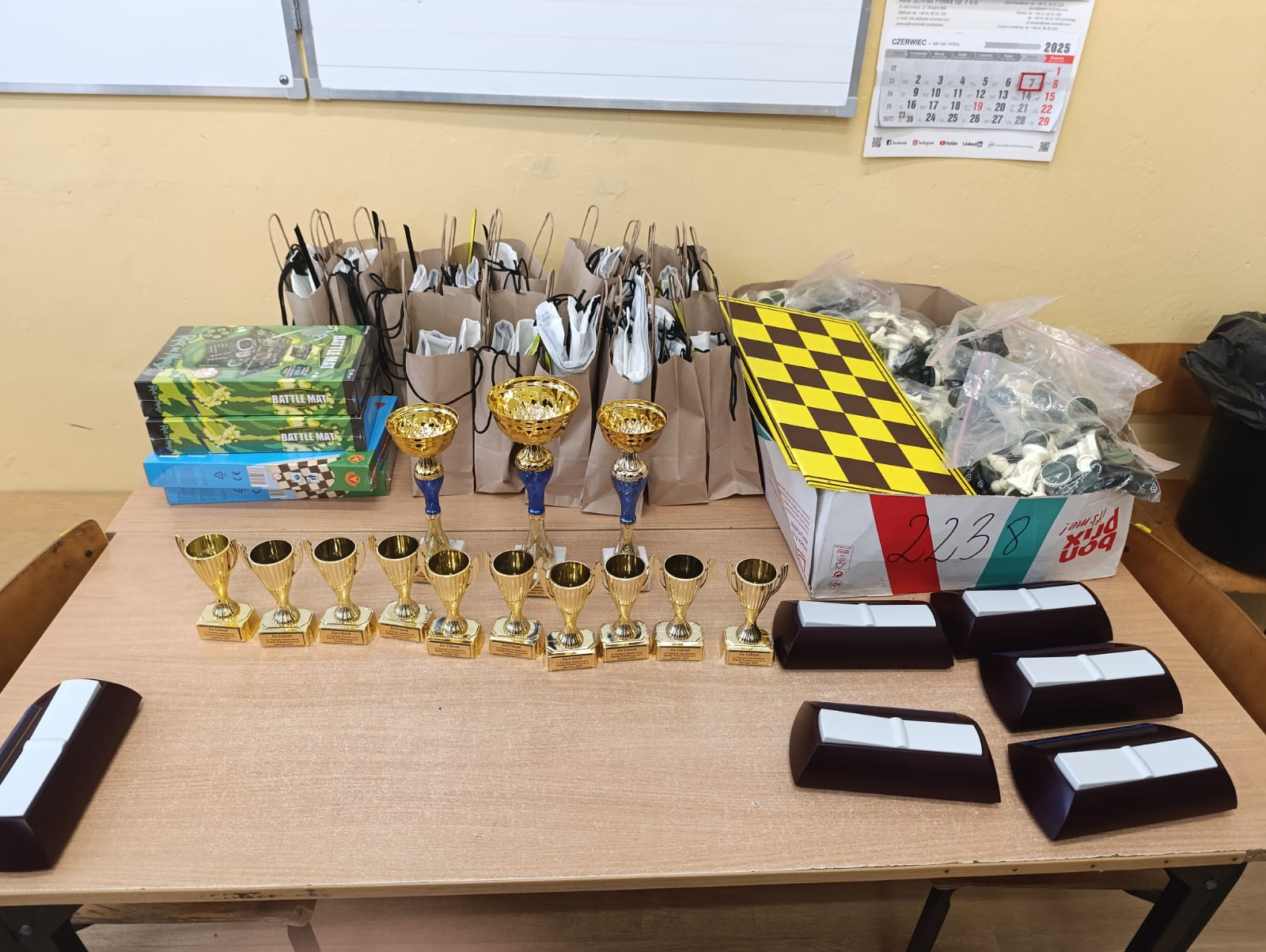 Sędzią zawodów był p. Mirosław Cieślik, który też udzielał cennych rad podczas rund. W turniejowych zaciętych zmaganiach nagrody otrzymali uczniowie: I miejsce i puchar główny zdobył uczeń – Alan Lenkiewicz, który pokonał w partii finałowej Franciszka Mattern. Trzecią lokatę w turnieju zajął Marcin Maziarz, po boju z Wojciechem Raulin. Kolejne miejsca zajęli: Katia Kravczenko [5m], Jan Niedlich [6m], Franciszek Wierciński [7m], Damian Szyłobryt [8m], Jan Dworzyński [9m], Jakub Kruczkowski [10m], Rafael Szpejewski [11m], Sebastian Staszyński [12m] i Patryk Gacoń [13m]. Wszyscy uczestnicy otrzymali nagrody rzeczowe, dyplomy a pierwsza szóstka złote pucharki. Organizator oraz uczestnicy Szkolnego Turnieju Szachowego serdecznie dziękują pani Agnieszce B. – fundatorce wspaniałych nagród dla uczestników.