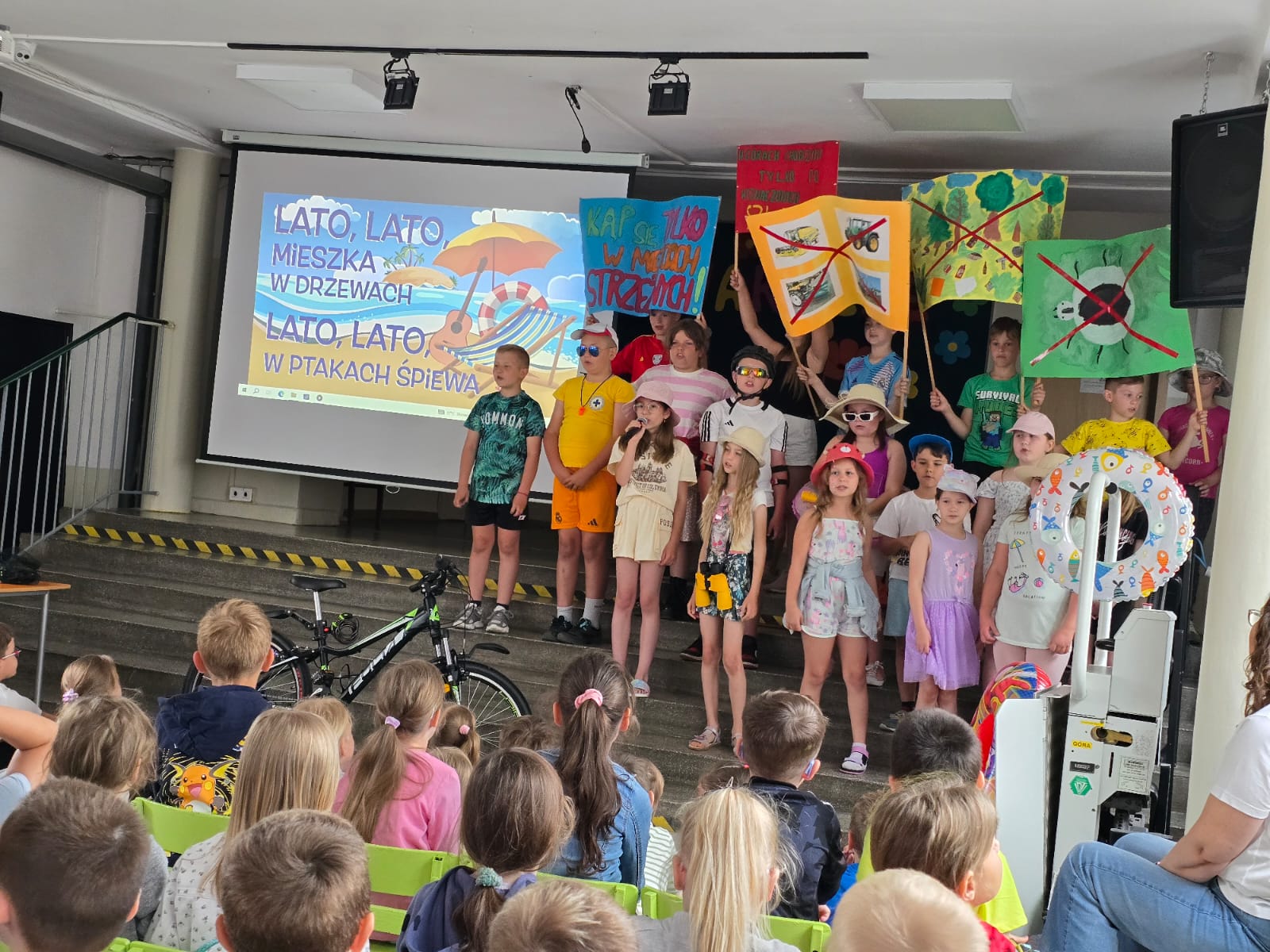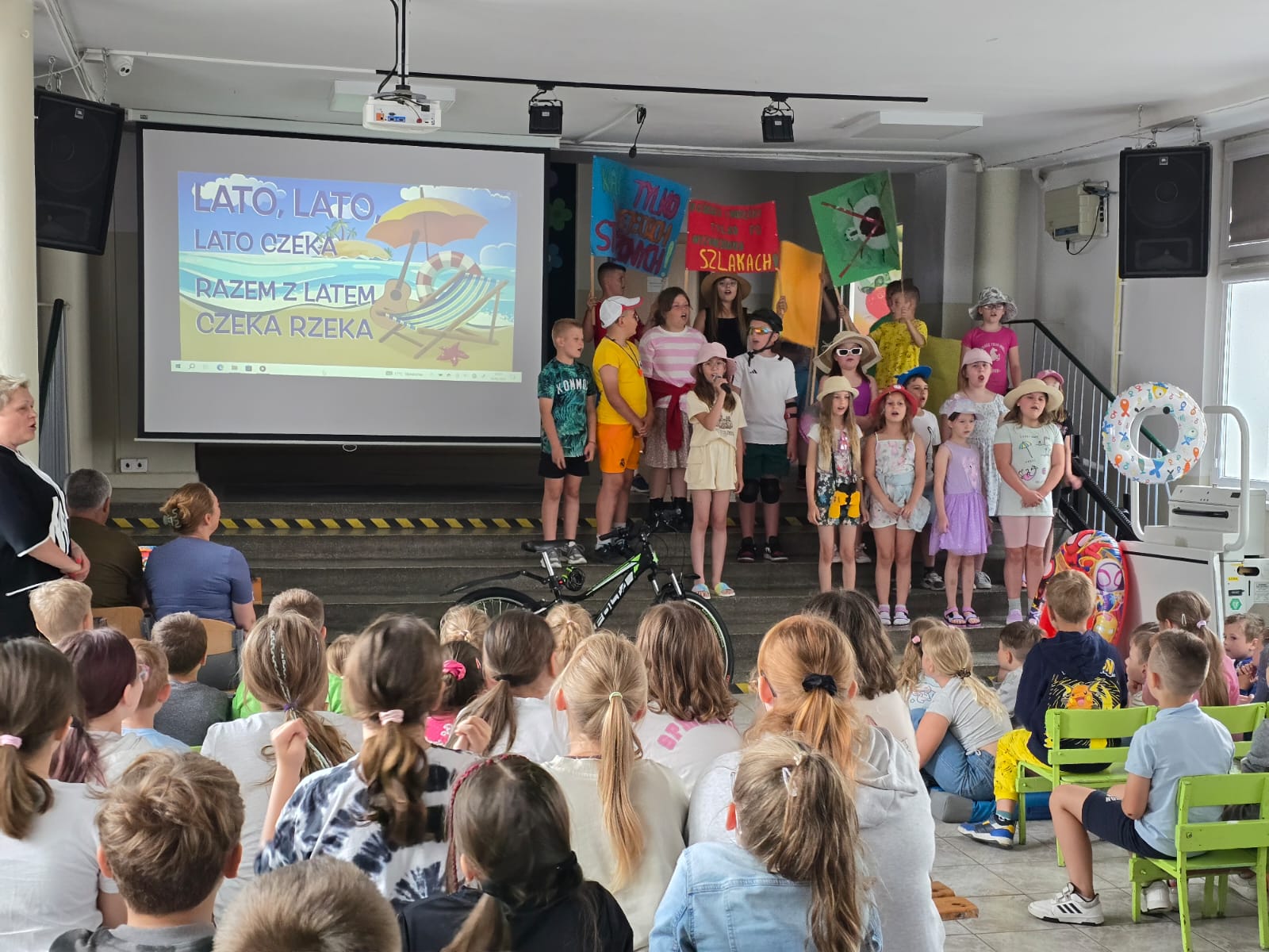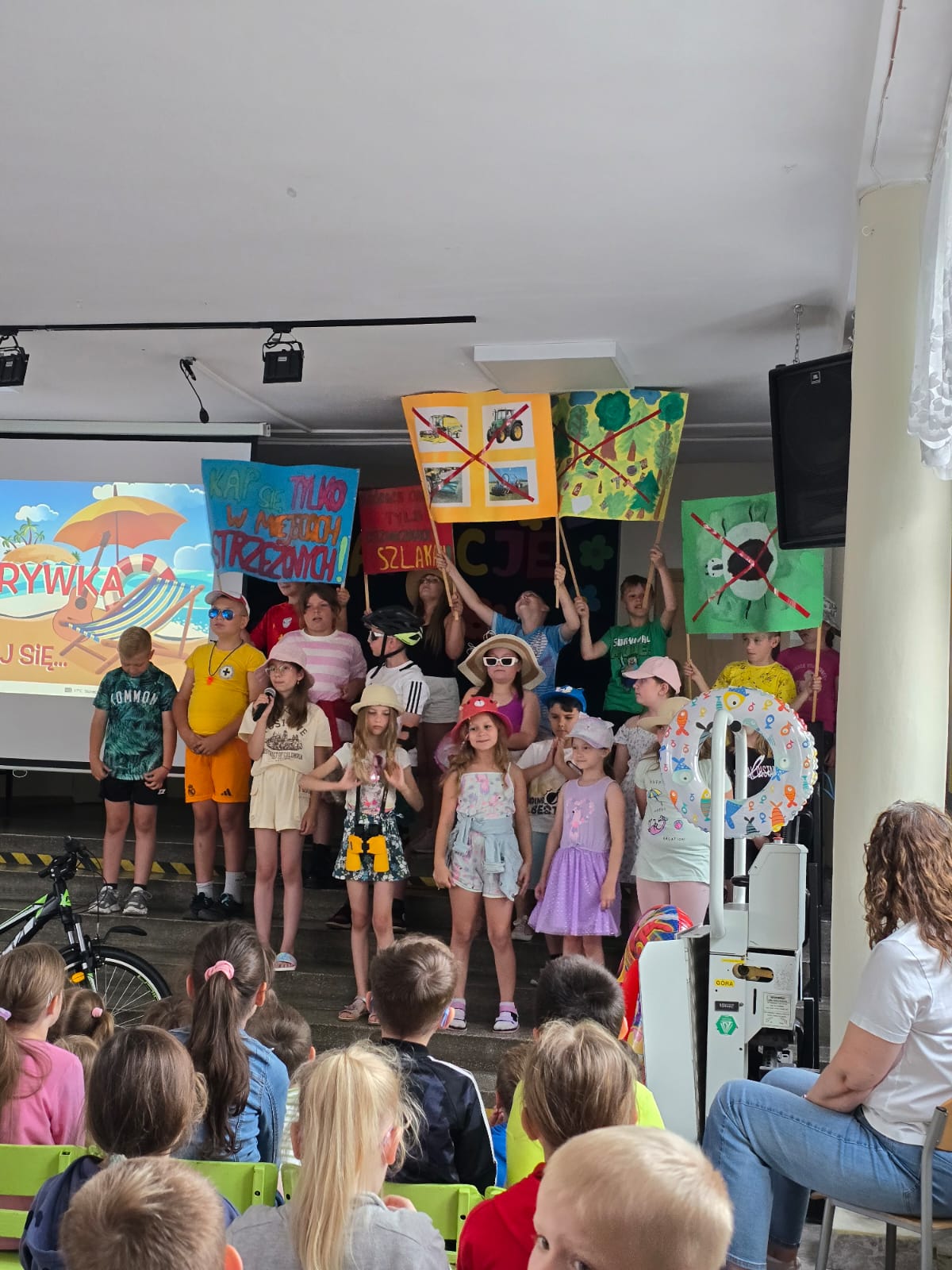 Dzisiaj 24 czerwca na holu szkoły odbyła się akcja skierowana do uczniów klas 0-III pt. ,,Bezpieczne Wakacje’’. Wydarzenie to przygotowała klasa II a pod opieką p. Joanny Szczerbińskiej. Celem spotkania było przypomnienie dzieciom zasad bezpiecznego zachowania w czasie letniego wypoczynku. Klasa II a występując z letnimi rekwizytami na scenie wyśpiewała i przypomniała m.in.: Zasady bezpiecznego zachowana w górach, nad jeziorem, czy w lesie. Nie zabrakło plansz informacyjnych i ostrzegawczych, które zawierały ważne zasady,, w górach chodzimy tylko po szlakach’’ , dzieci radziły też np. unikać silnego słońca w godzinach szczytu, używać kremów z filtrem UV, nosić nakrycie głowy i okulary itp. Nie zabrakło letnich rekwizytów – roweru, pontonu, koła wodnego etc. To było niezwykle pouczające spotkanie, które z pewnością pomoże naszym uczniom spędzić wakacje bezpiecznie i świadomie.