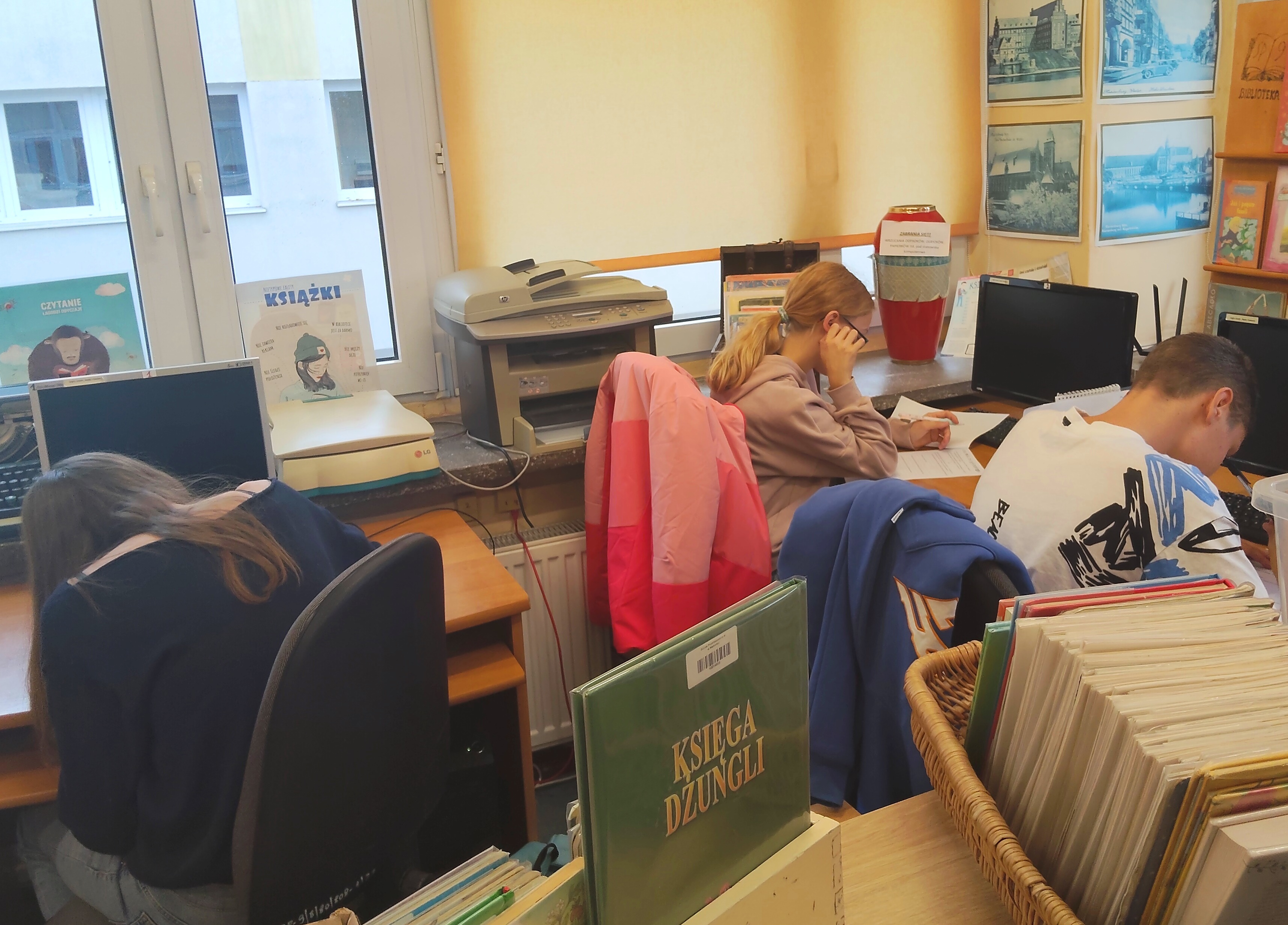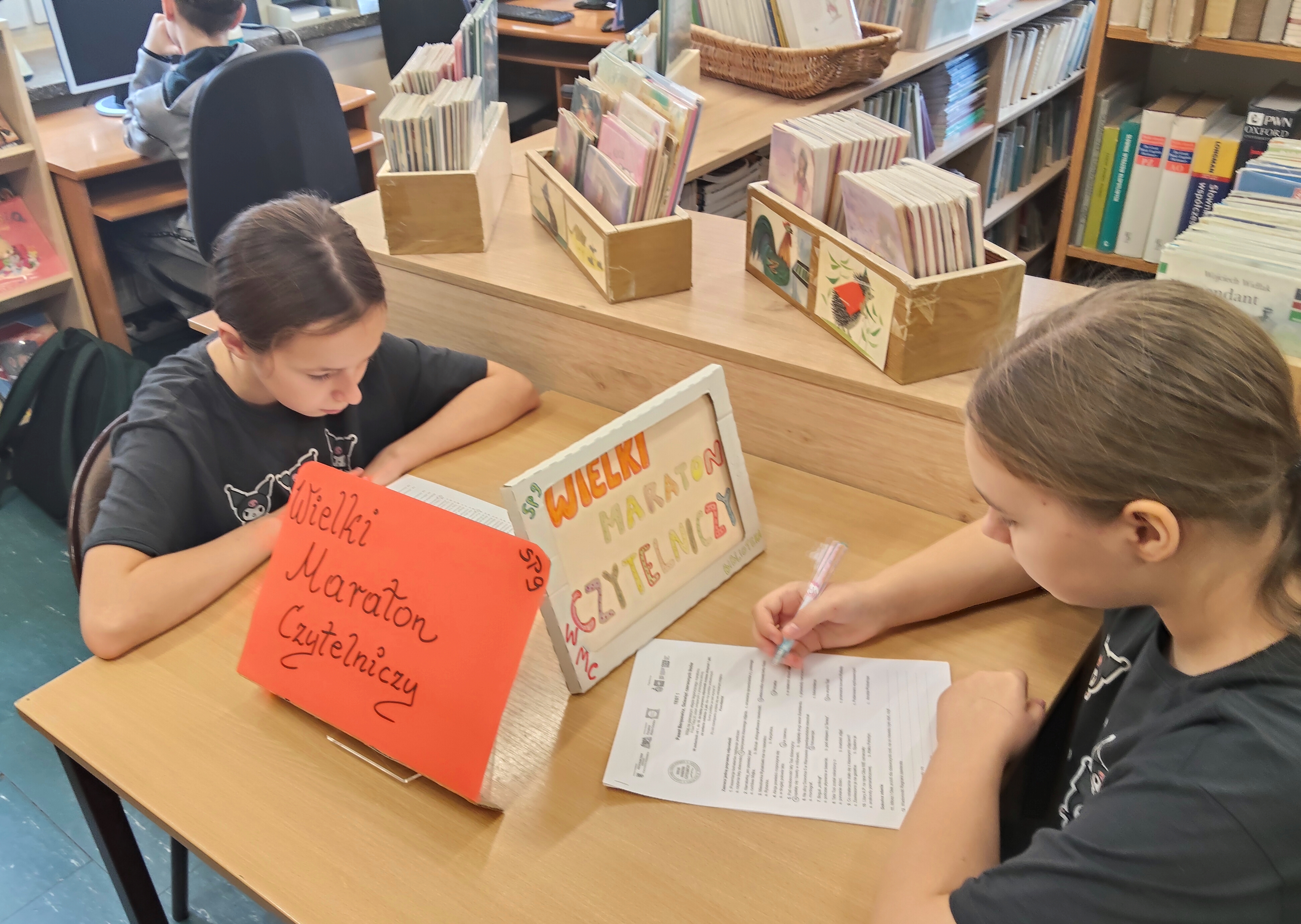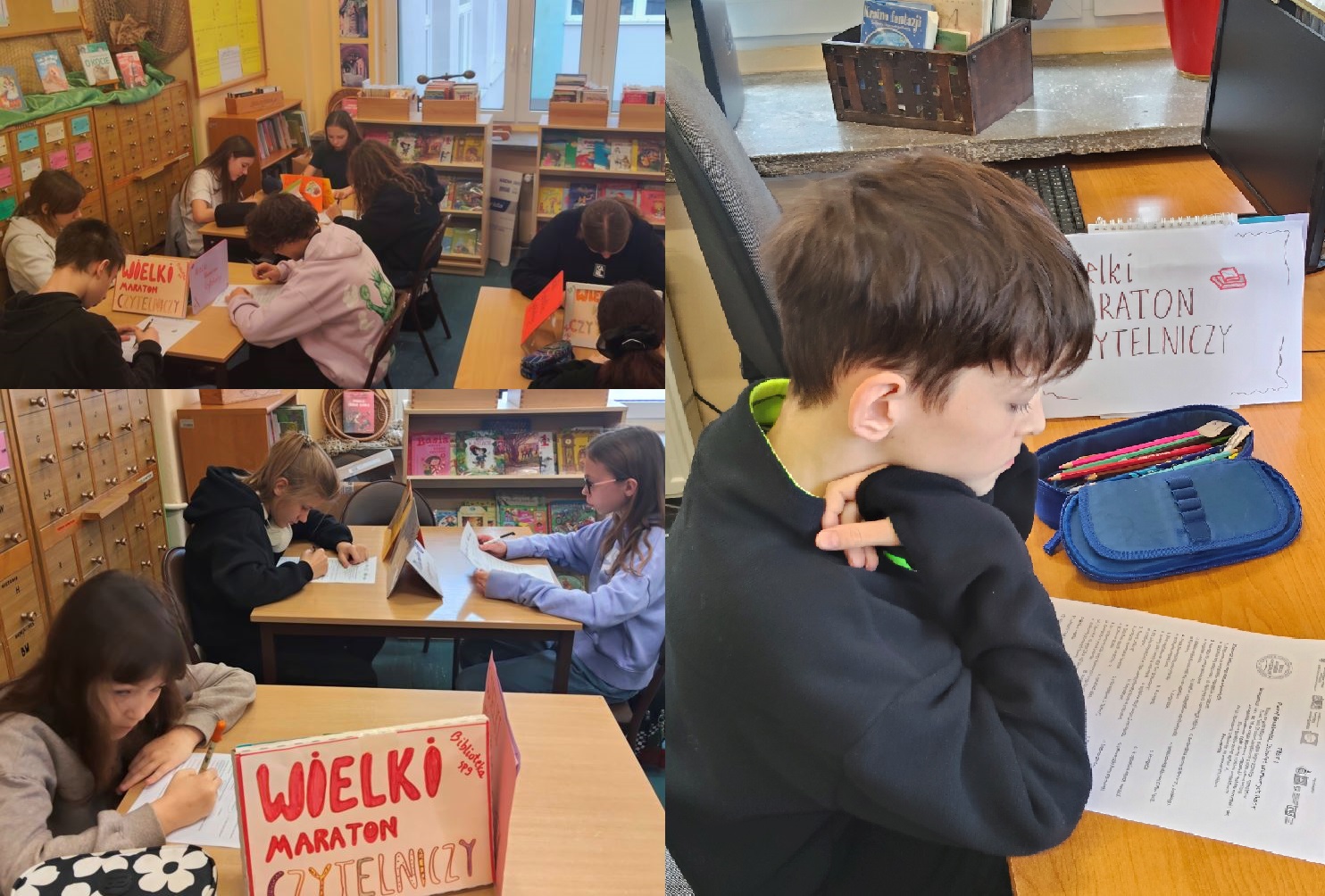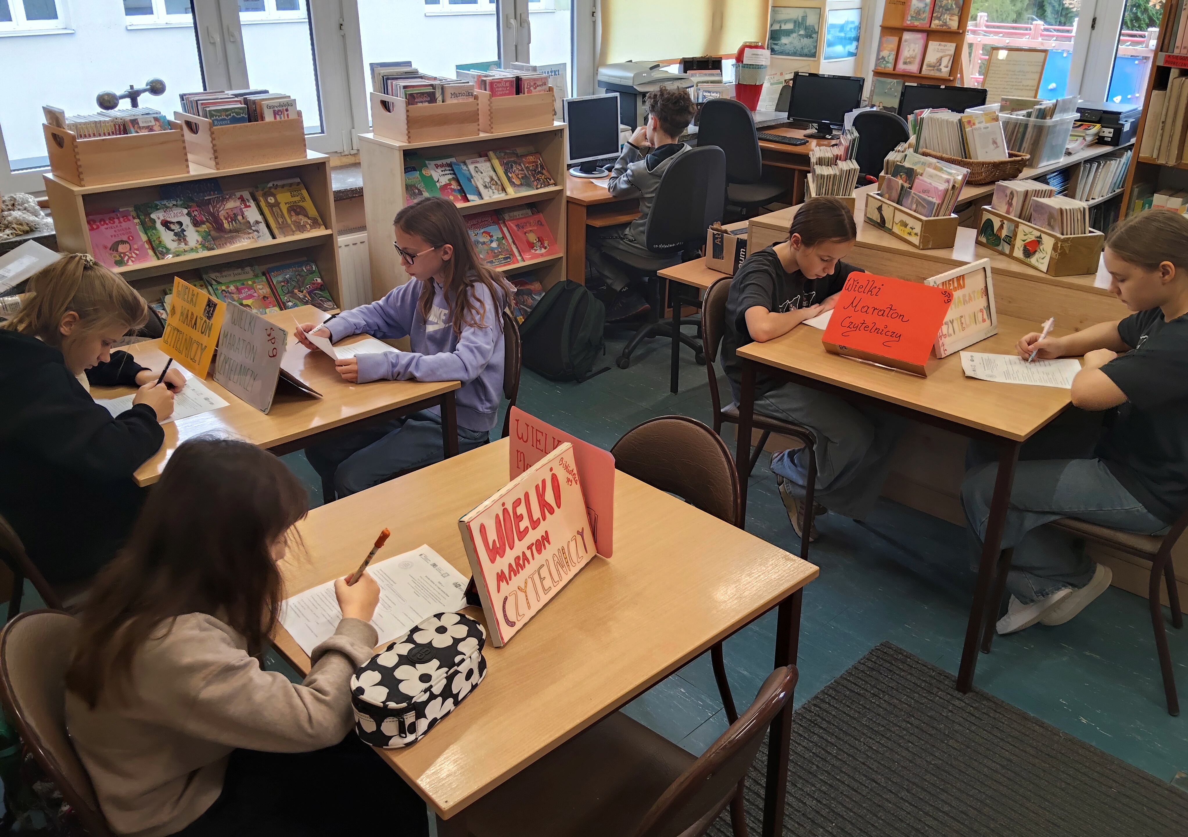 W środę i czwartek /29-30 X b.r./ w szkolnej bibliotece odbył się pierwszy etap ogólnopolskiego Wielkiego Maratonu Czytelniczego organizowanego przez Wojewódzką i Miejską Bibliotekę Publiczną w Gdańsku. Tenże siedemnastoletni konkurs ma na celu popularyzowanie czytelnictwa wśród dzieci i młodzieży, oraz rozwijanie umiejętności czytania ze zrozumieniem treści lektur. Po raz pierwszy u nas do czytelniczych zmagań przystąpili i uczniowie klas drugich i trzecich, a także ,,tradycyjnie’’ uczniowie z klas IV-VIII. Musieli oni zmierzyć się z dwudziestoma zadaniami dotyczącymi tekstu autorów – Pawła Beręseicza, Dymitiera Inkowa i Anne Goscinny. Nasi czytelnicy - Butryn Helena, Radzymińska Joanna, Borzechowska Julia, Giza Maria, Rydzyńska Natasza, Szpejewski Rafael, Wierzchowski Wojciech, Wiśniewska Zuzanna, Wolak Amelia, Bączek Dawid, Kowalska Michalina, Kurinnyi Makar, Lipińska Oliwia, Oreshina Aleksandra, Pufal Hanna, Reksa Martyna, Stateczna Nina, Tomaszkiewicz Weronika, Urbańska Lena, Warchhold Lena, Wojszel Zuzanna - dość dobrze poradzili sobie z testowymi wyzwaniami. Obecnie w niecierpliwości czekamy na kolejny test, już za miesiąc. Opiekunami czytelników ,,dziewiątki’’ są p. Janina Łańko i p. Adam Liszewski.