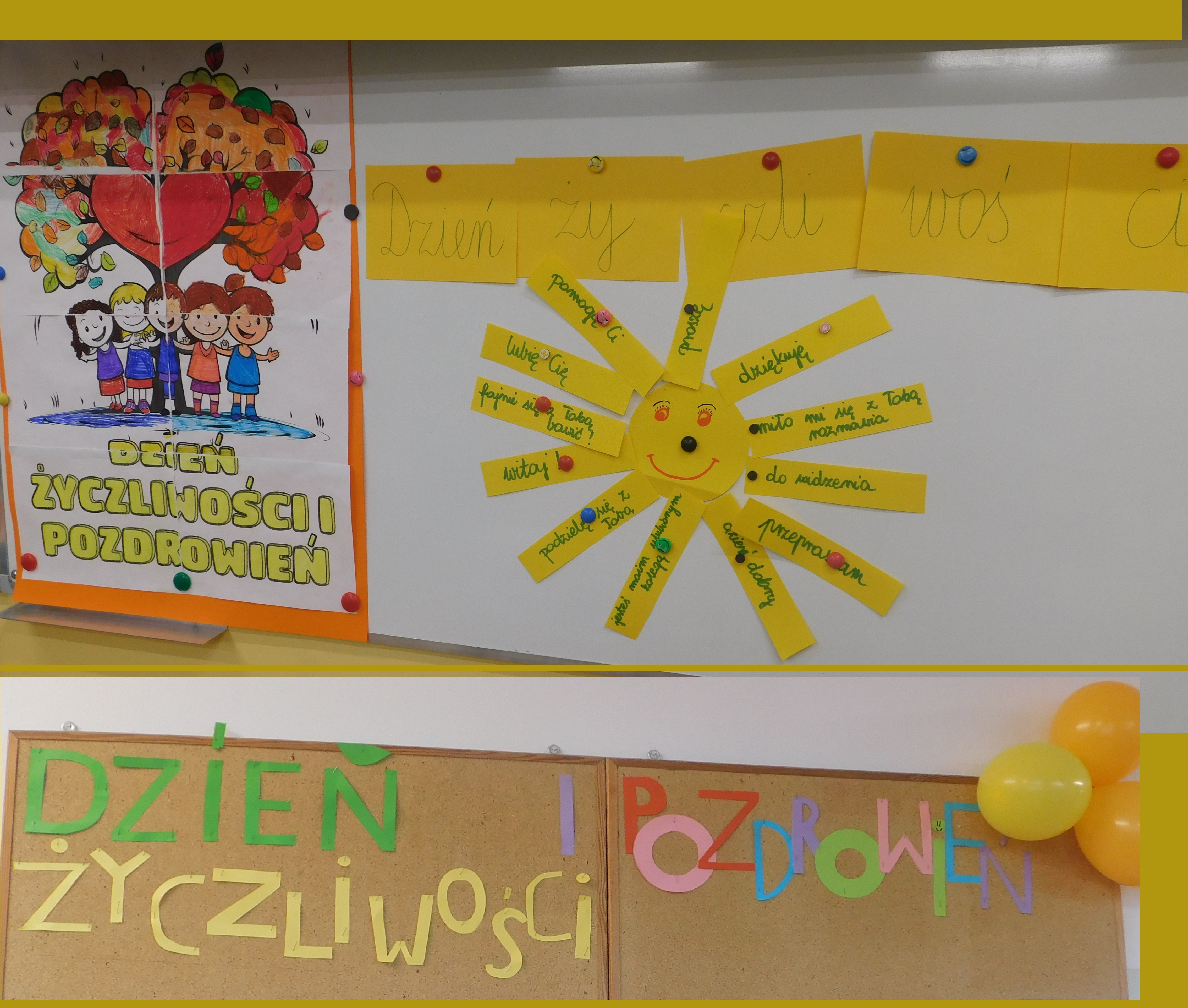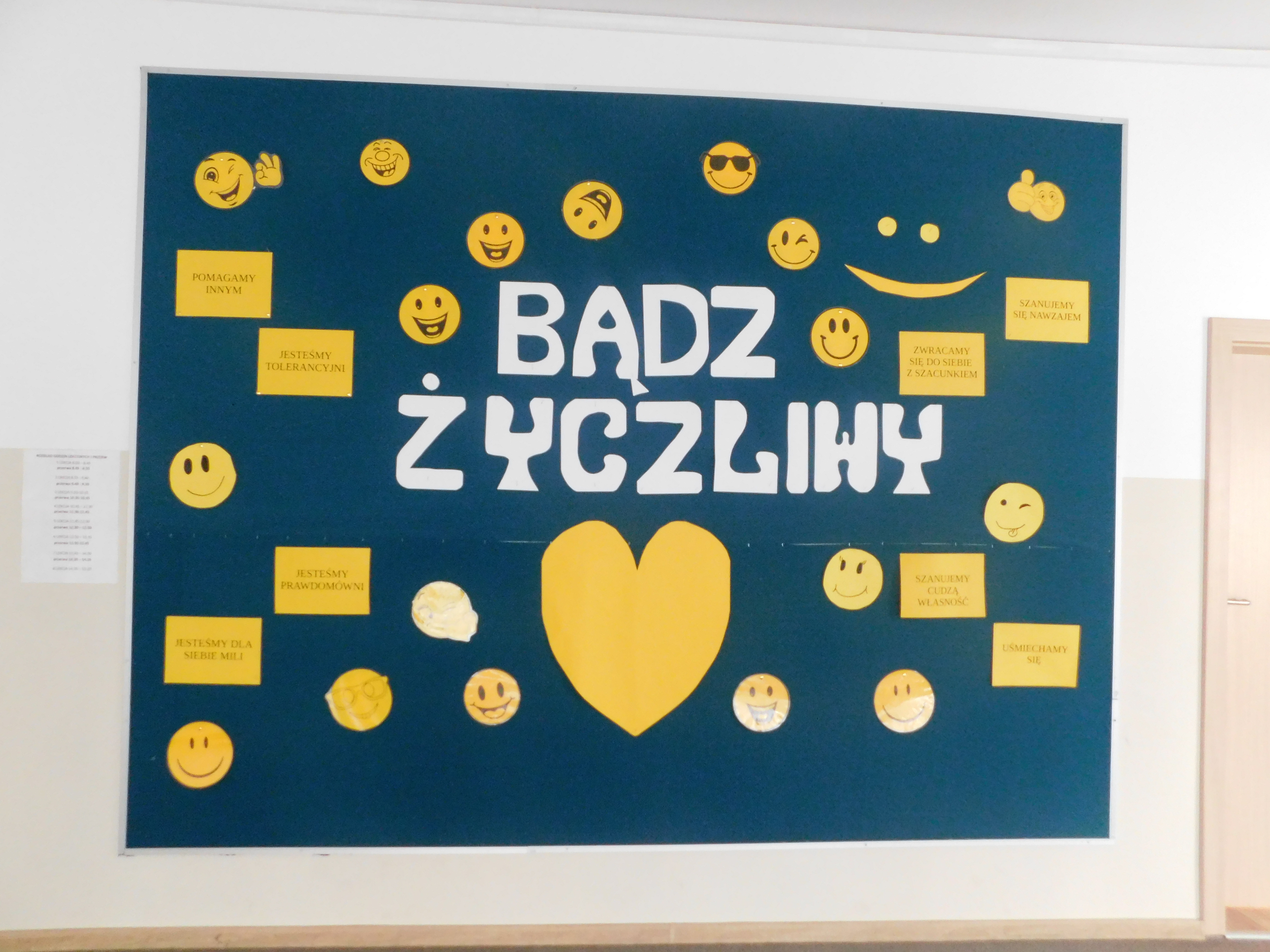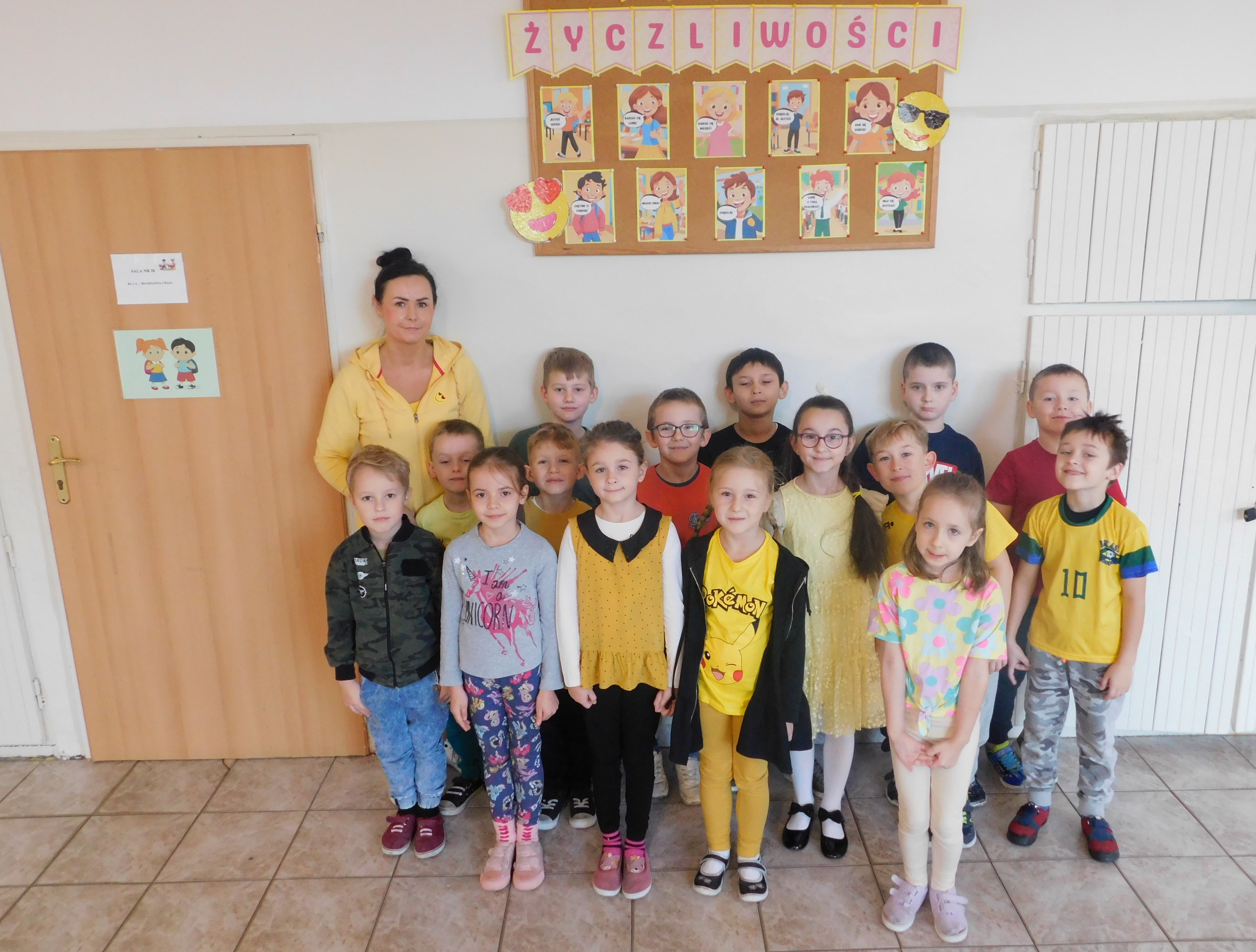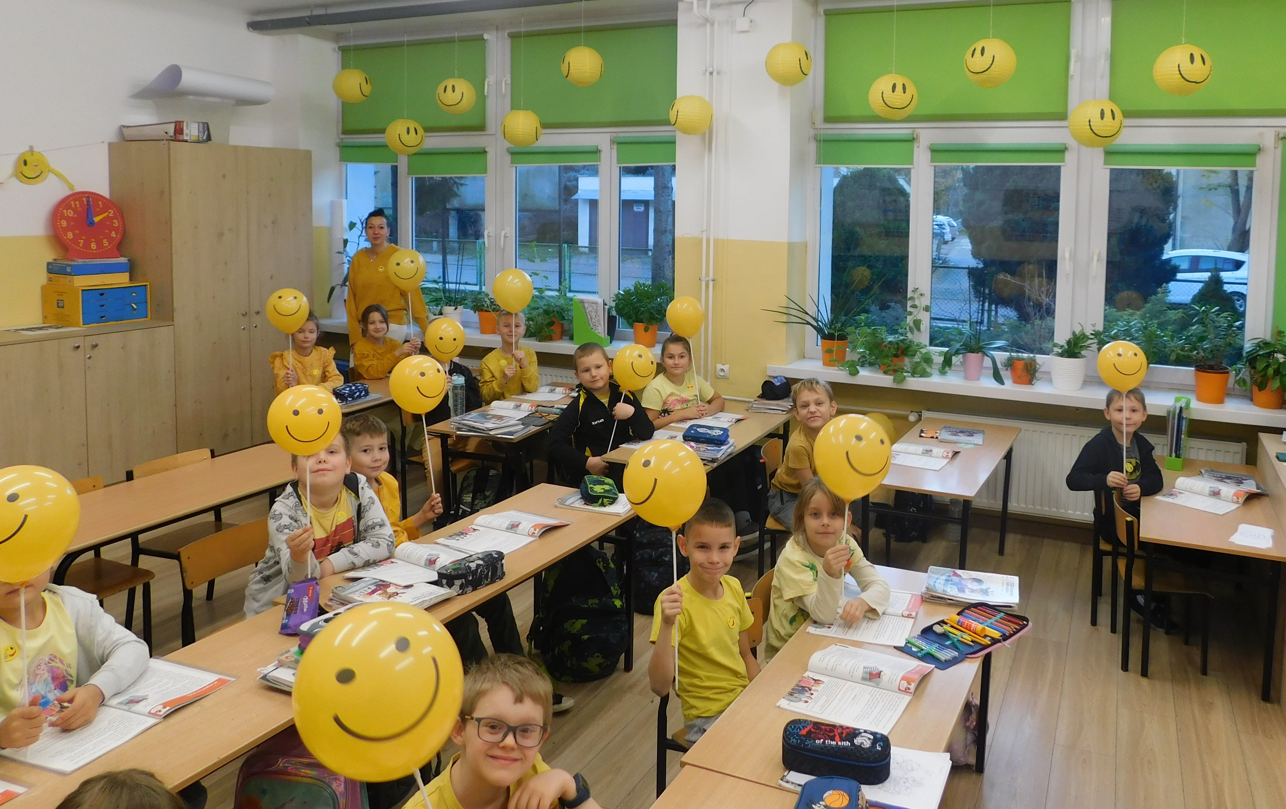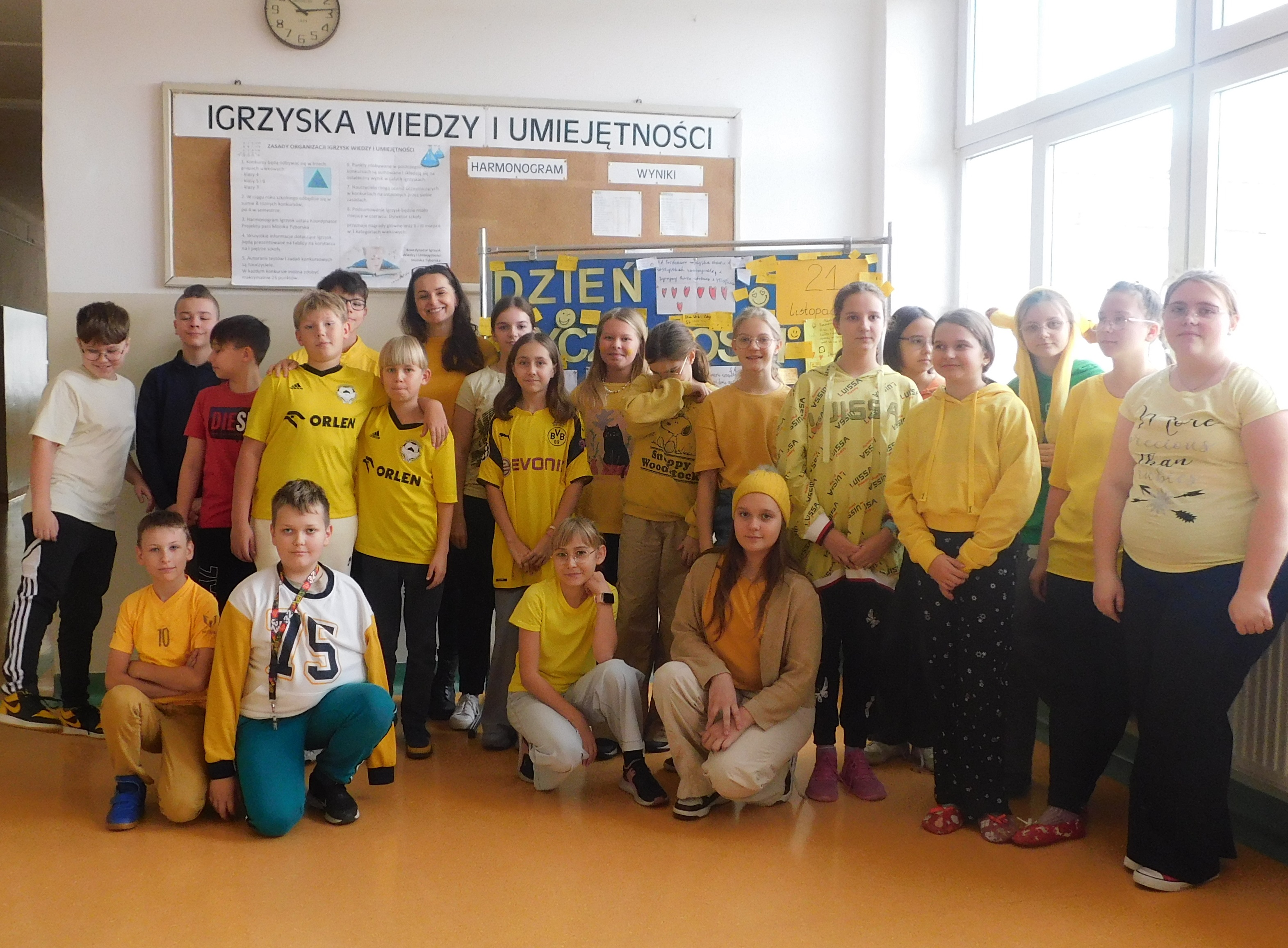 W dniach 21-22 listopada 2024 roku w naszej szkole odbywał się ,,Dzień Życzliwości’’, czyli na korytarzach i klasach zagościł żółty kolor. Ten kolor symbolizuje to, co daje nam wszystkim wzajemna życzliwość - poczucie radości i uśmiechu. Na stroju – chyba- każdego ucznia i nie tylko, pojawiły się uśmiechnięte żółte buźki. Samorząd Uczniowski pod opieką p. Oliwii Duszyńskiej, przygotował dla każdego słoneczka i żółte taśmy z ,,życzliwkami’’. Poza tym, na drzwiach klas i w samych klasach zostały umieszczone radosne sentencje oraz gazetka tematyczna. Jak się okazałao najlepiej przygotowaną klasą do tych sympatycznych dni, była 5 a, która zajęła I lokatę - i otrzymała ... żólte cukierki, II lokatę zajęła klasa 6a, a III miejsce 6b /dzień bez stresu/. Były to wyjątkowe 2 dni, pełen uśmiechów, miłych słów, pozytywnych emocji. Oby tak było codziennie :)