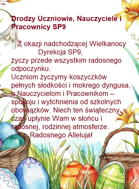 Z okazji nadchodzącej Wielkanocy Dyrekcja SP9, życzy przede wszystkim radosnego odpoczynku.