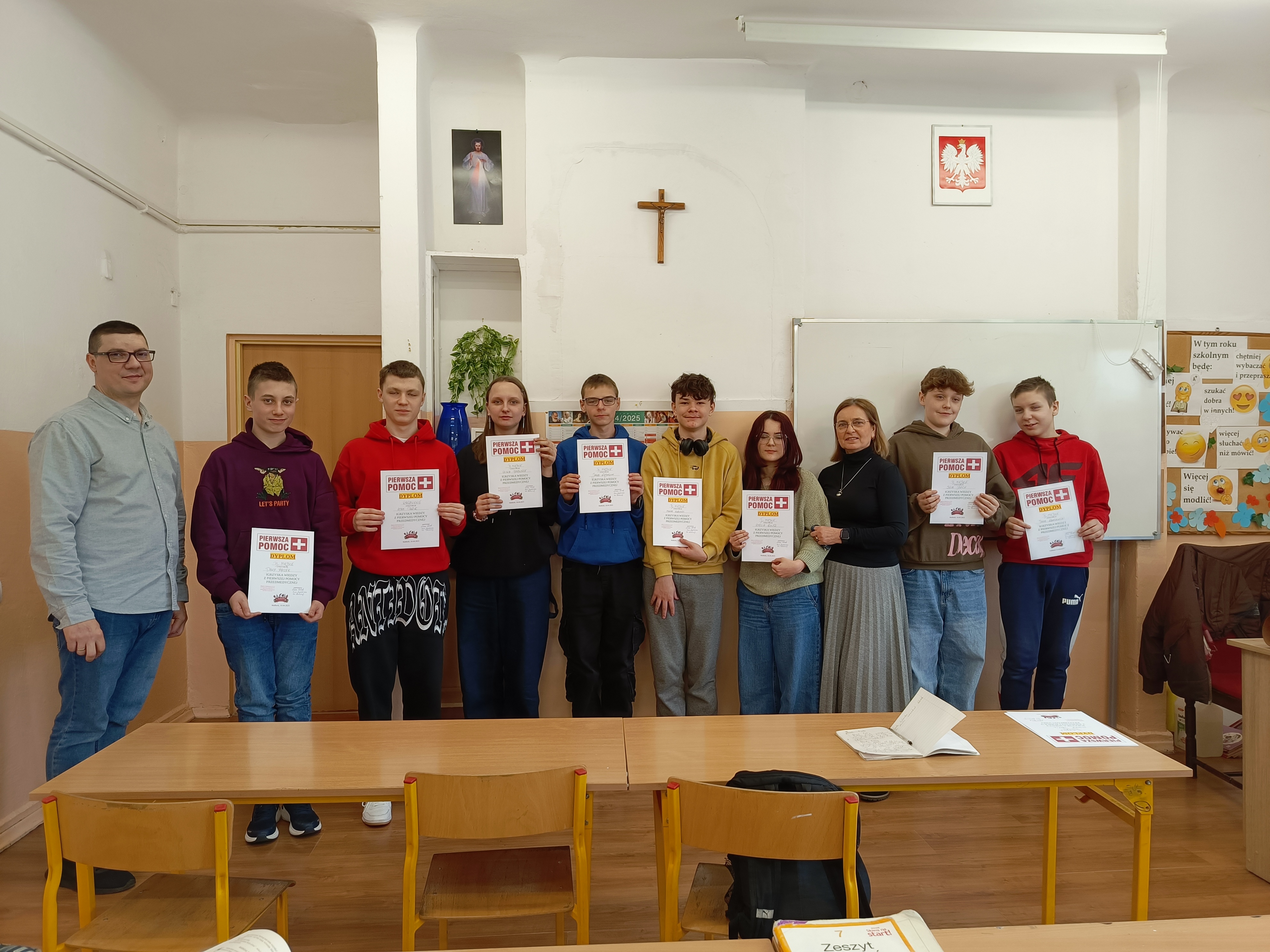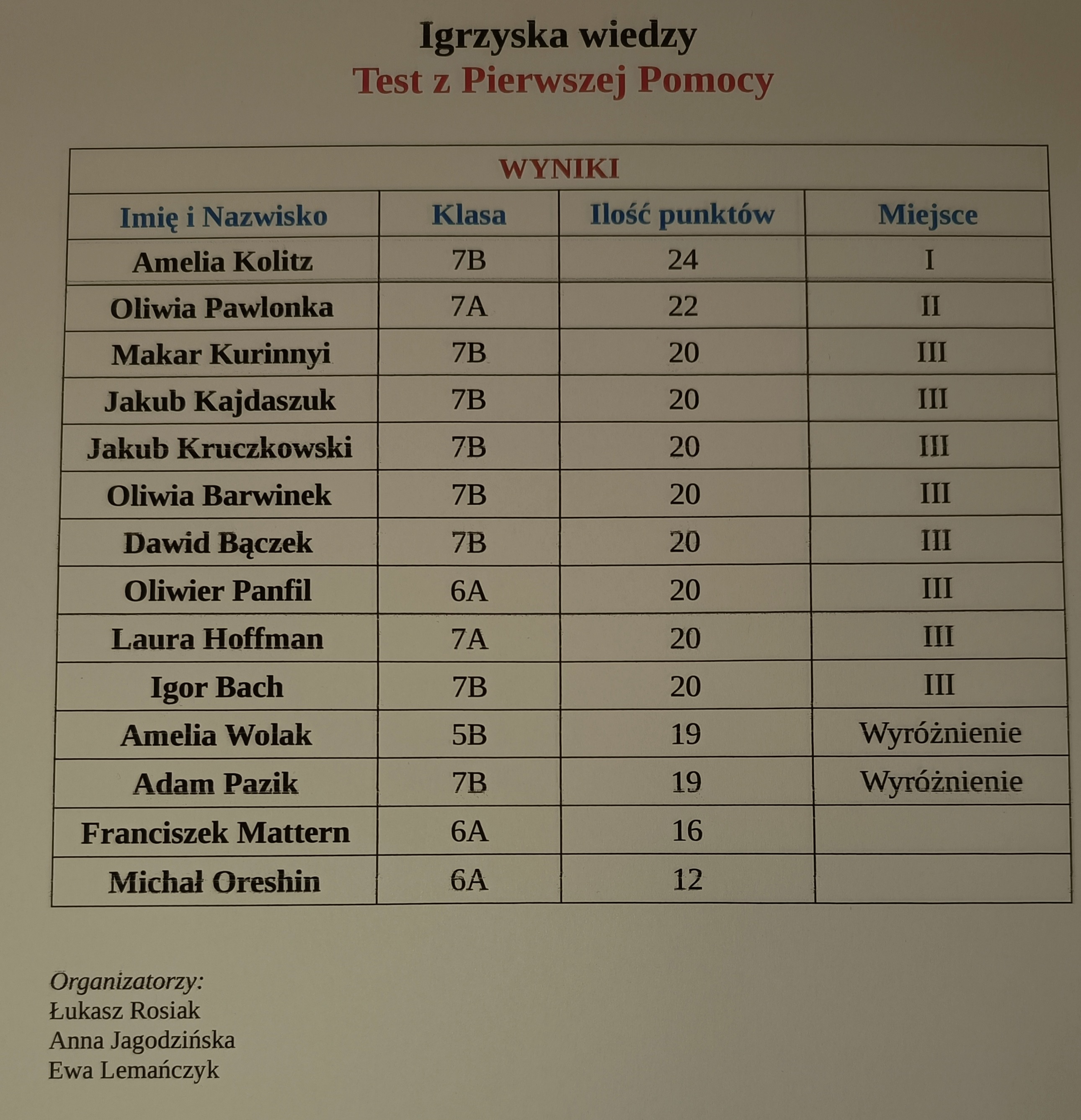 W dniu 10.04.2025 odbył się w naszej szkole konkurs w ramach Igrzysk Wiedzy z zakresu Pierwszej Pomocy Przedmedycznej. Chętni uczniowie przygotowywali się do testu przez miesiąc. Gratulujemy zwycięzcom! Konkurs zorganizowali: nauczyciel EDB - Łukasz Rosiak, nauczyciel biologii- Ewa Lemanczyk, nauczyciel wspomagający -Anna Jagodzińska.