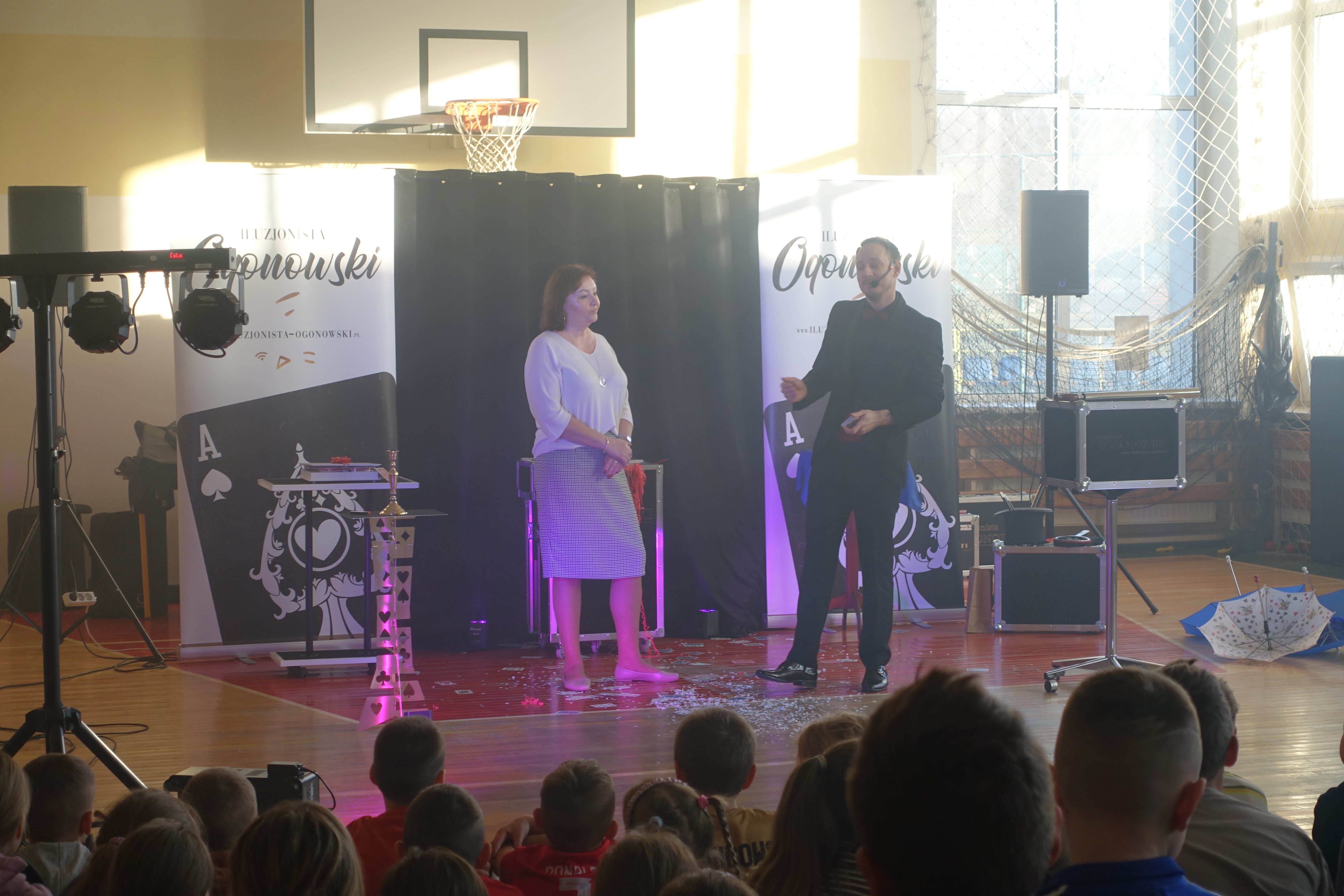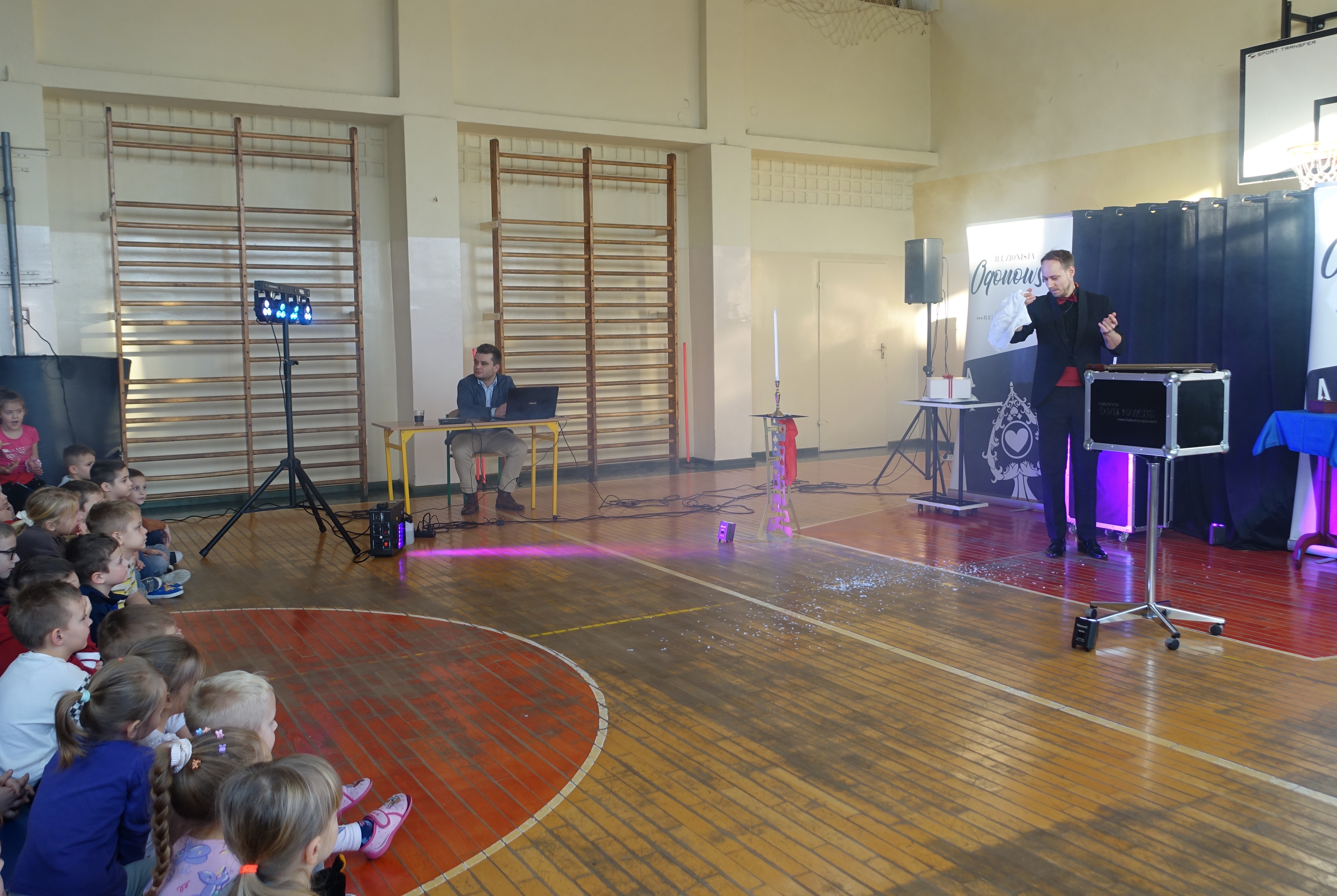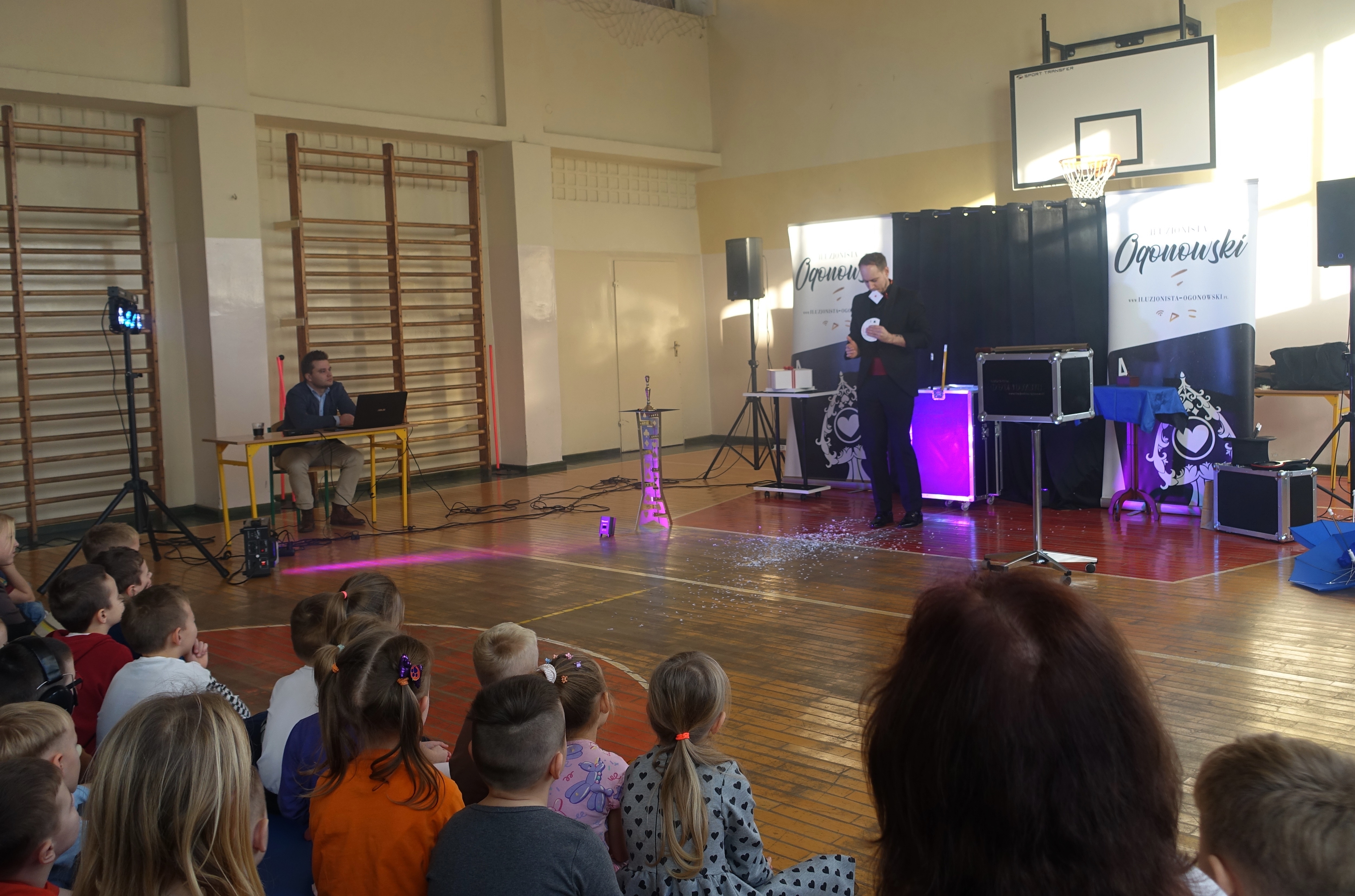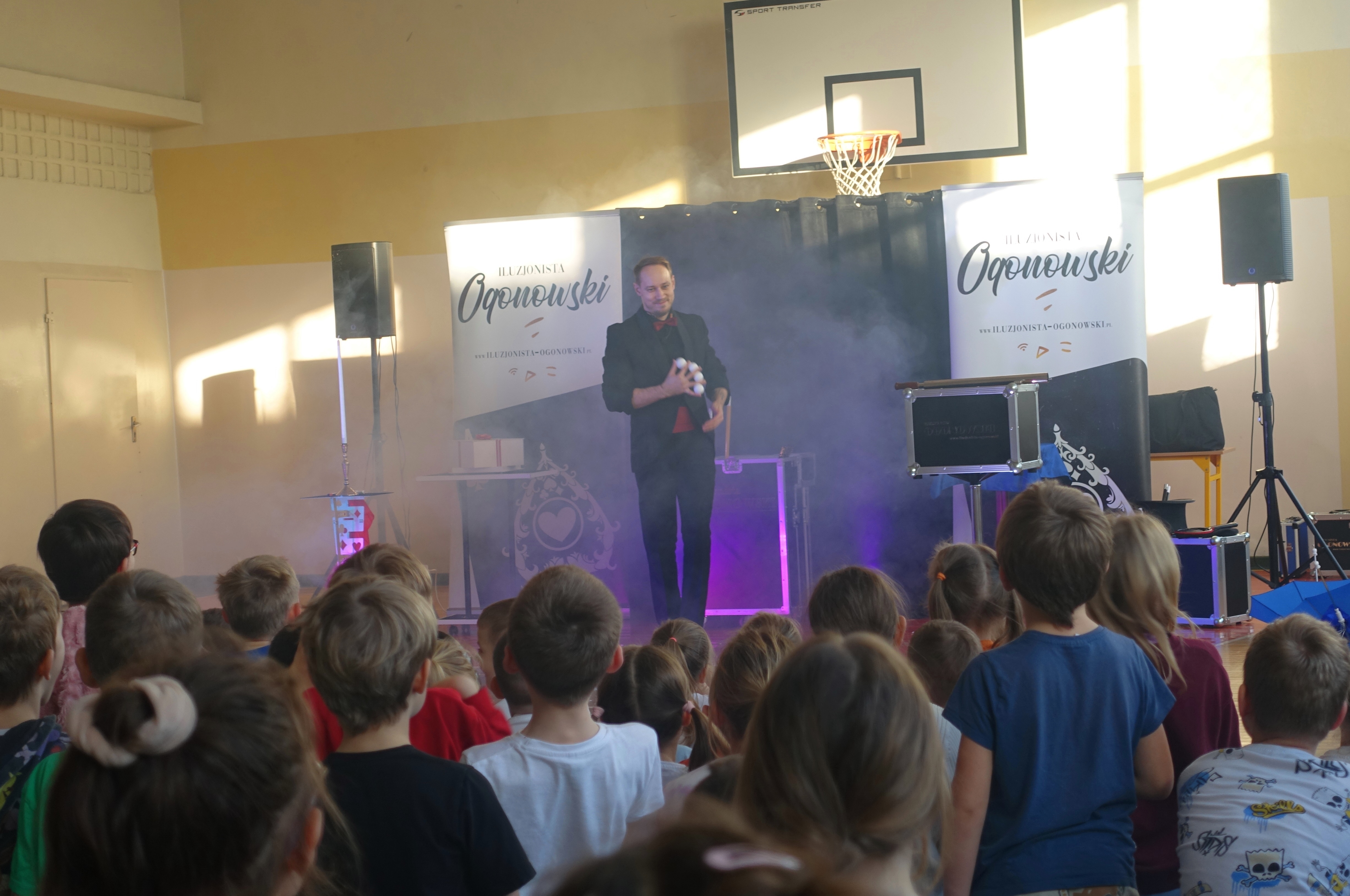 Dzisiaj w naszej szkole odbyło się niecodzienne spotkanie z iluzjonistą, który przeniósł uczniów w magiczny świat pełen niespodziewanych trików oraz znakomitej zabawy czyli ,, tam gdzie nierealne i niemożliwe staje się rzeczywiste i bliskie’’. W tę podróż zabrał wszystkich Łukasz Ogonowski - nowoczesny iluzjonista, uczestnik VII edycji programu "Mam Talent". Członek najsłynniejszej grupy Champions of Illusion, twórca "Spektaklu Iluzji" wystawianego na deskach teatrów w całej Polsce. Występ, pełen humoru i zaskakujących zwrotów akcji, od samego początku wzbudził ogromne emocje. Dzieci z zapartym tchem obserwowały, jak znikają i pojawiają się przedmioty, karty, taśmy, lewitują rekwizyty, a z pozoru niemożliwe sztuczki stają się rzeczywistością. Dzisiaj na sali gimnastycznej nie zabrakło śmiechu i niezwykłych chwil, które na długo pozostaną w pamięci uczniów. Serdecznie dziękujemy iluzjoniście za tę pełną magii wizytę.