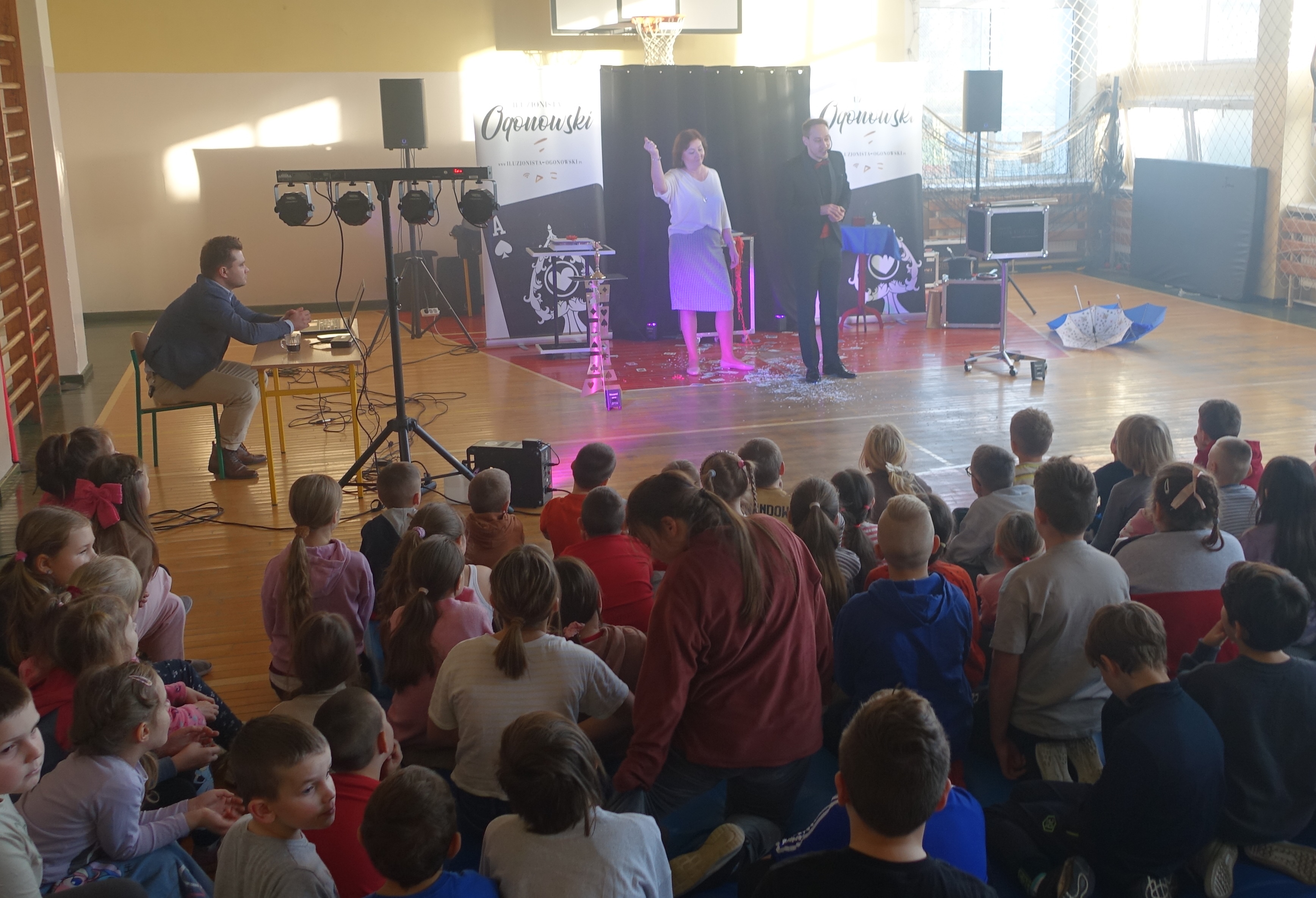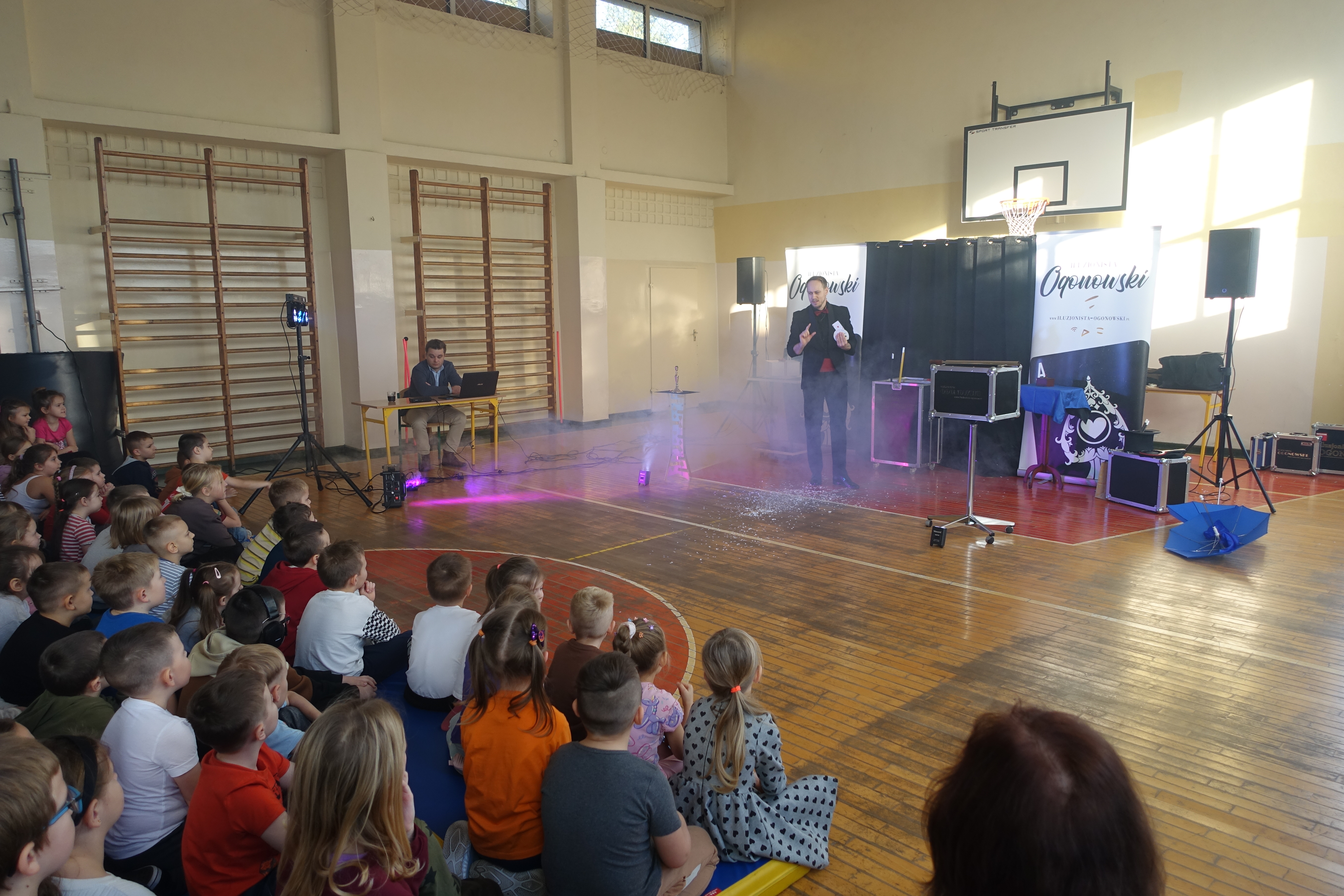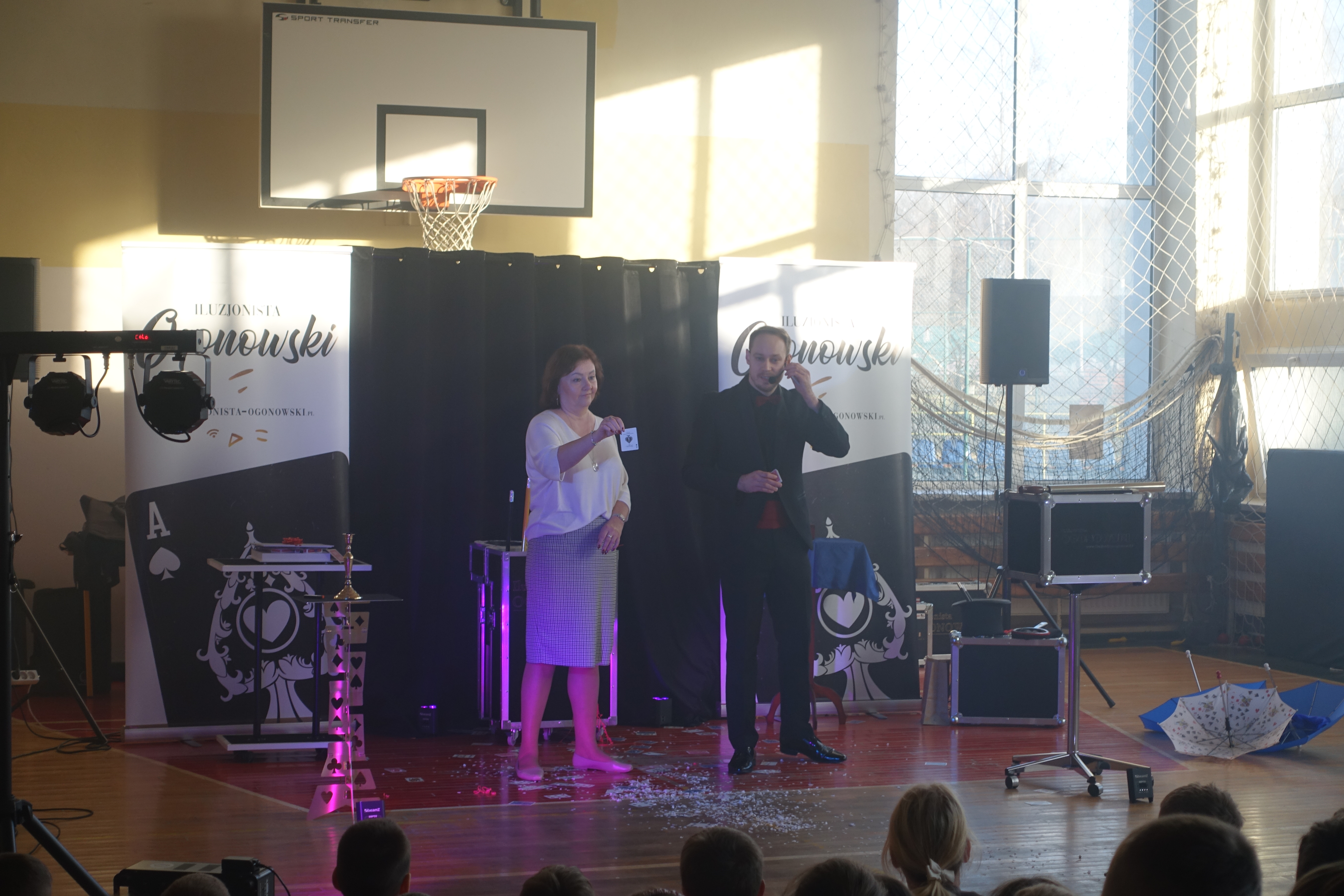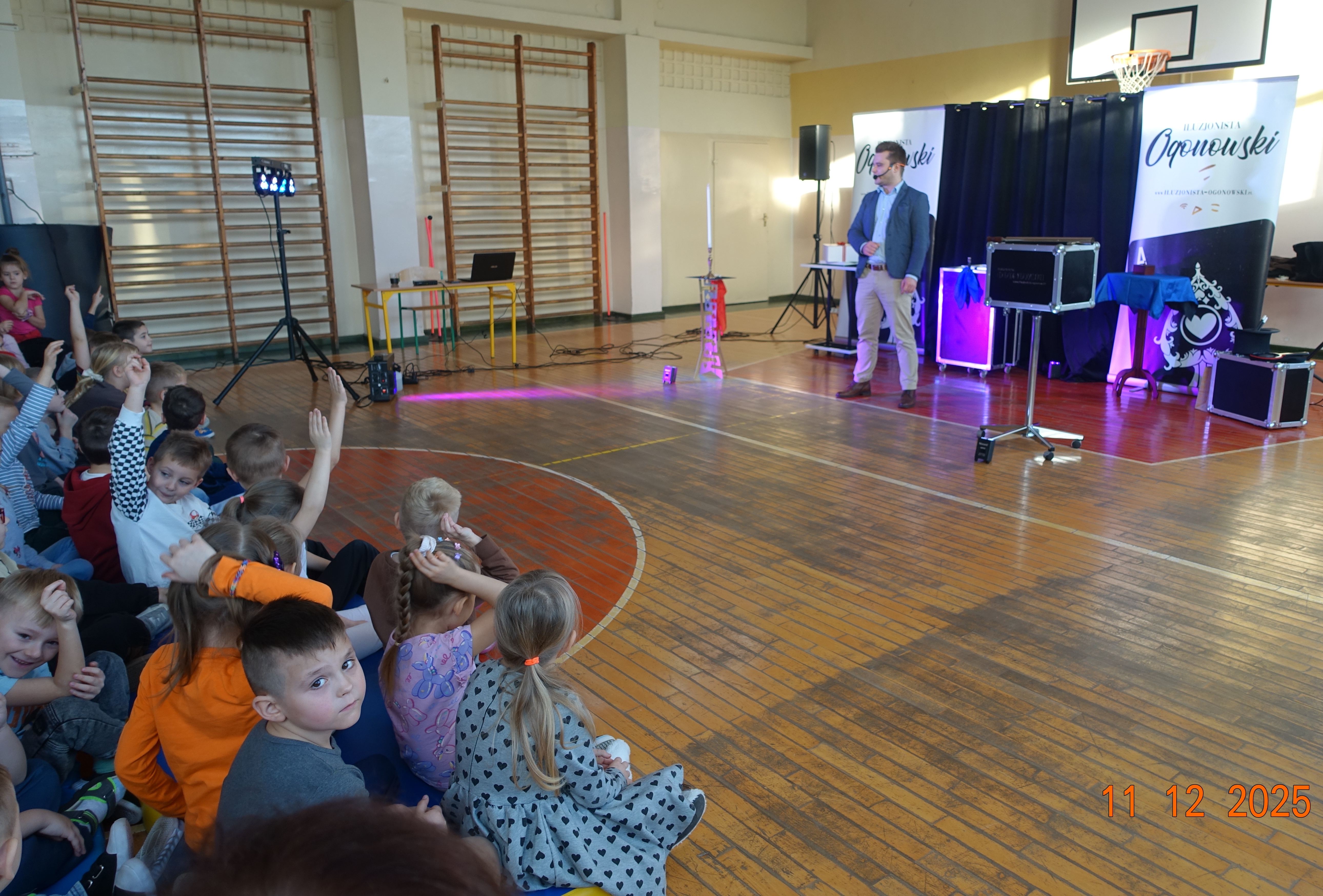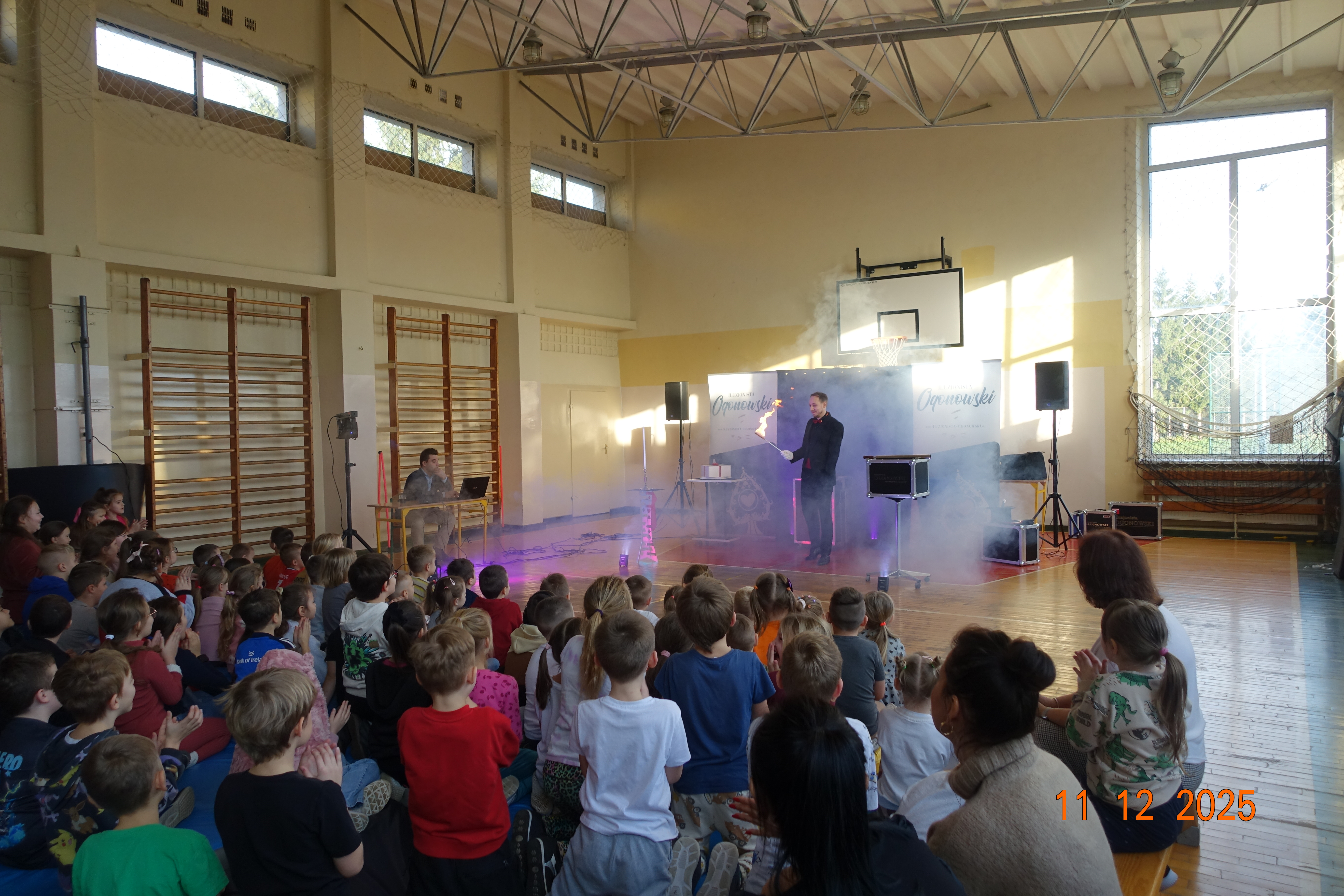 Dzisiaj w naszej szkole odbyło się niecodzienne spotkanie z iluzjonistą, który przeniósł uczniów w magiczny świat pełen niespodziewanych trików oraz znakomitej zabawy czyli ,, tam gdzie nierealne i niemożliwe staje się rzeczywiste i bliskie’’. W tę podróż zabrał wszystkich Łukasz Ogonowski - nowoczesny iluzjonista, uczestnik VII edycji programu "Mam Talent". Członek najsłynniejszej grupy Champions of Illusion, twórca "Spektaklu Iluzji" wystawianego na deskach teatrów w całej Polsce. Występ, pełen humoru i zaskakujących zwrotów akcji, od samego początku wzbudził ogromne emocje. Dzieci z zapartym tchem obserwowały, jak znikają i pojawiają się przedmioty, karty, taśmy, lewitują rekwizyty, a z pozoru niemożliwe sztuczki stają się rzeczywistością. Dzisiaj na sali gimnastycznej nie zabrakło śmiechu i niezwykłych chwil, które na długo pozostaną w pamięci uczniów. Serdecznie dziękujemy iluzjoniście za tę pełną magii wizytę.