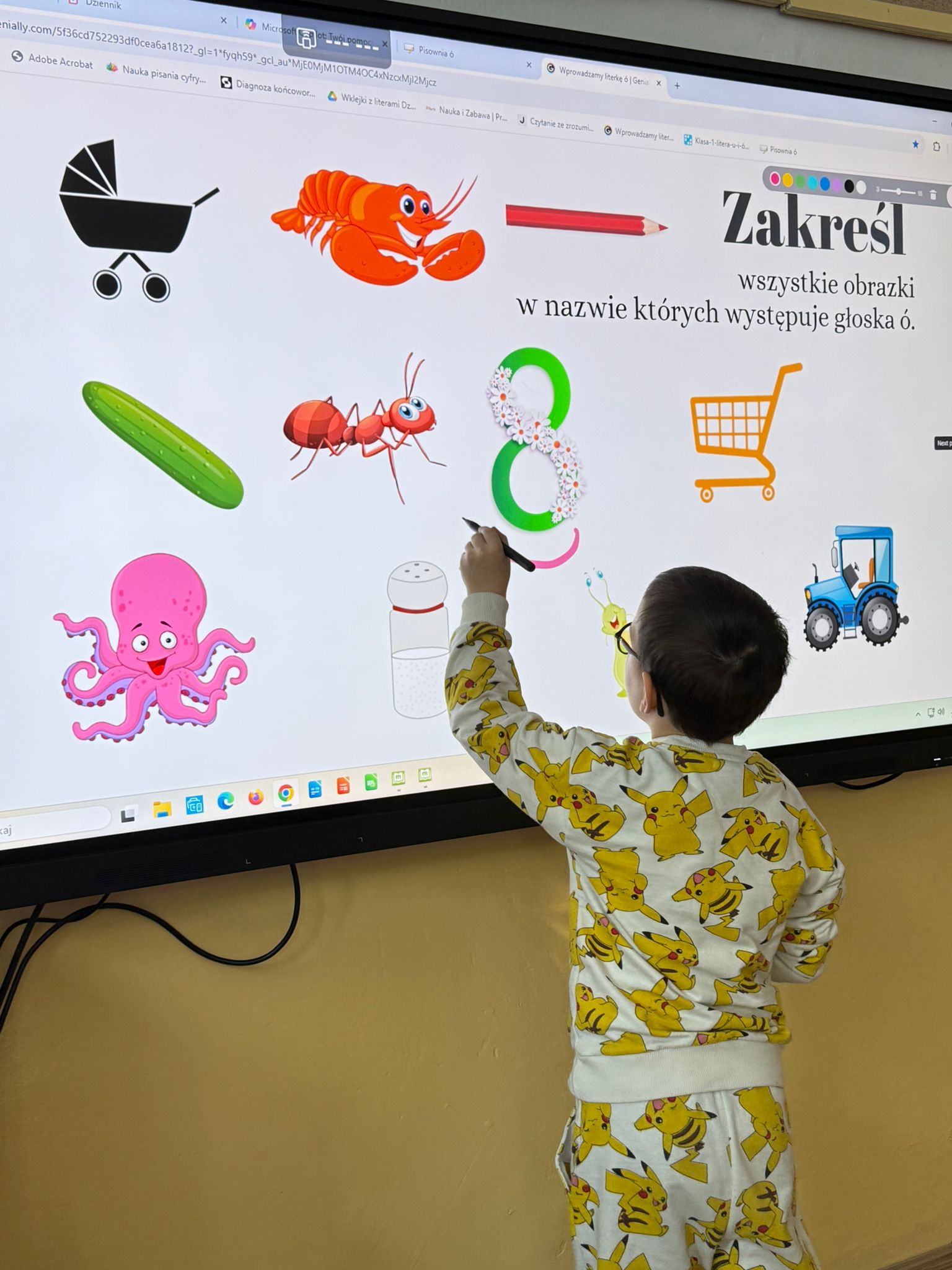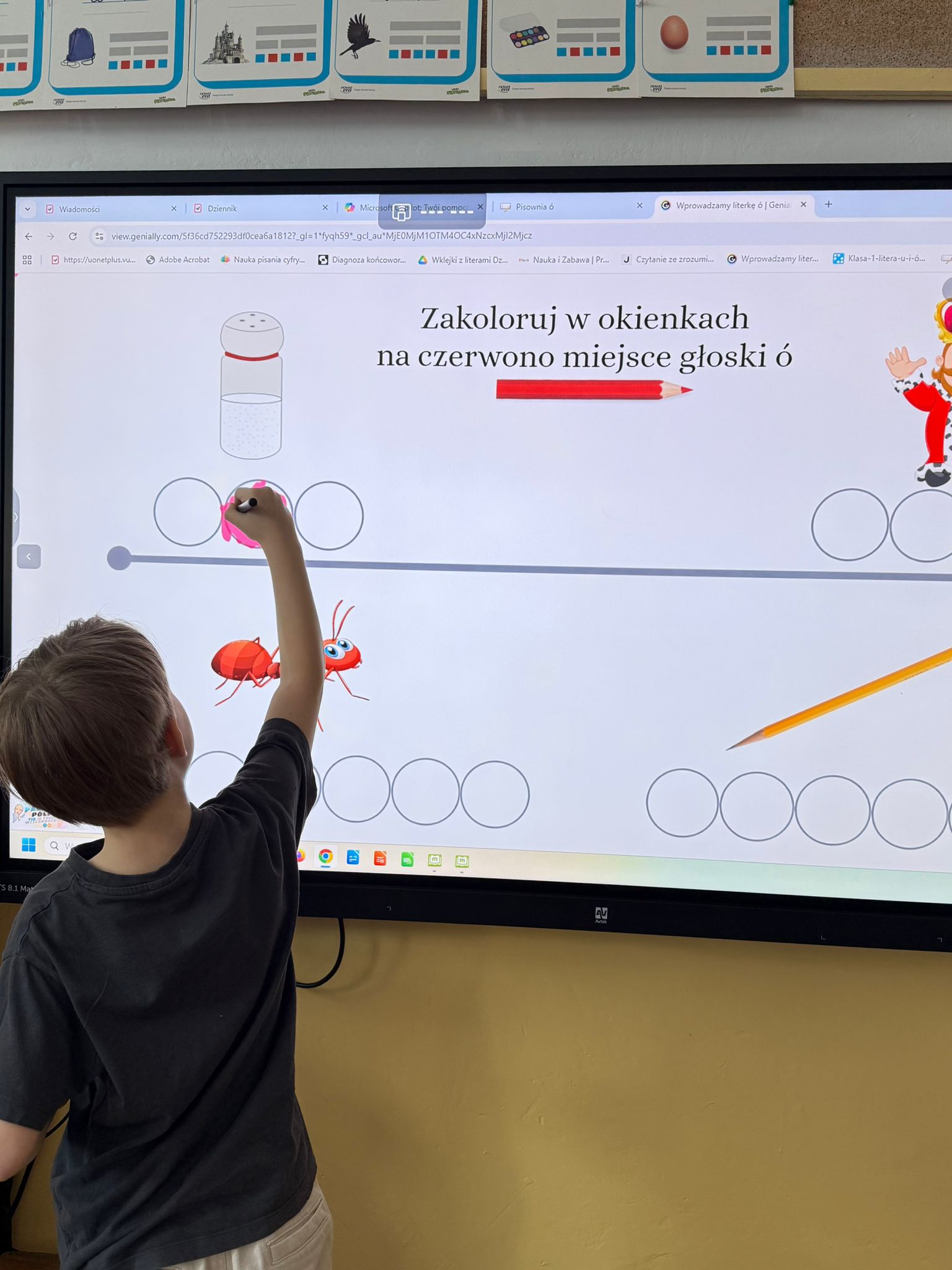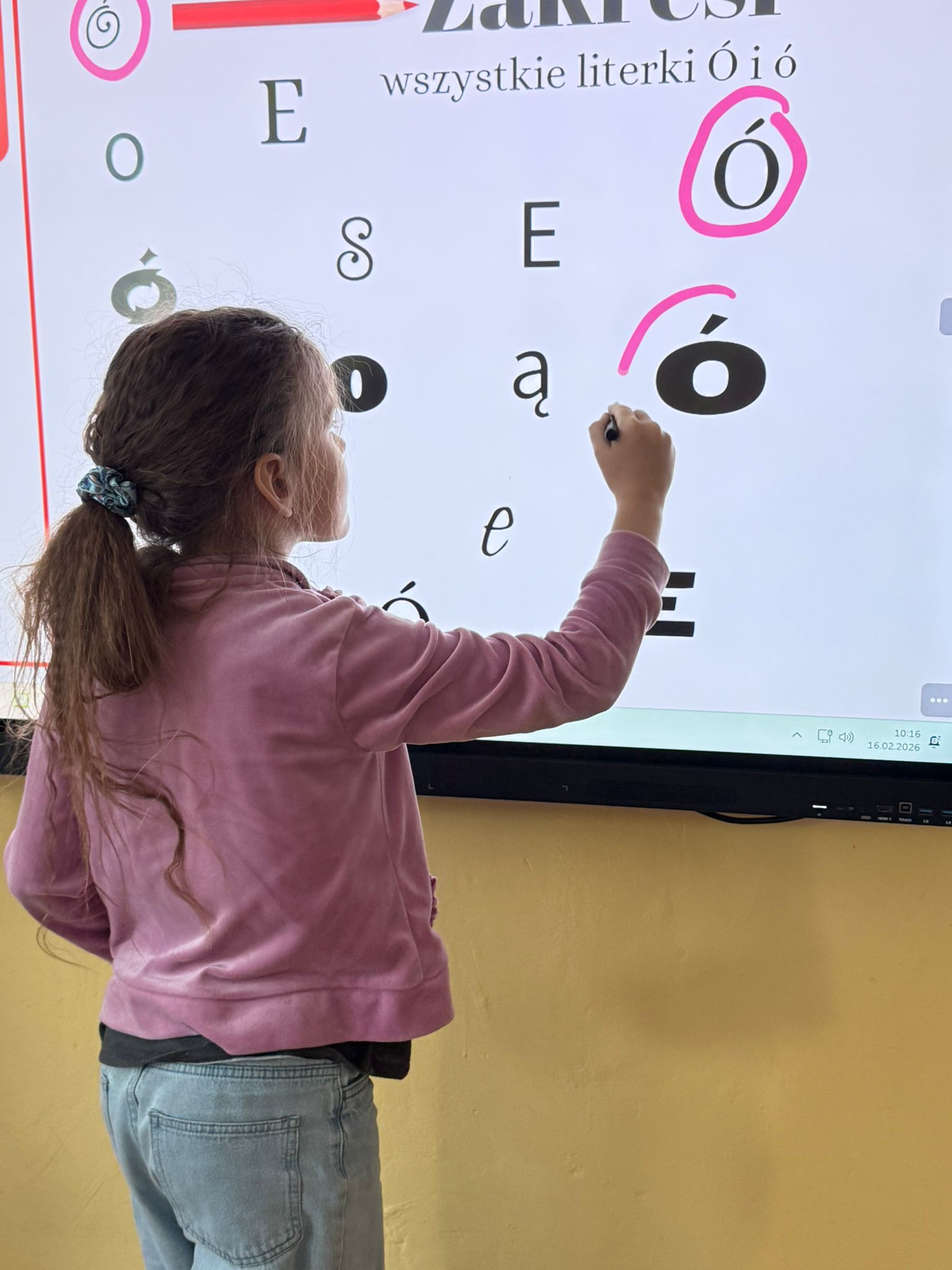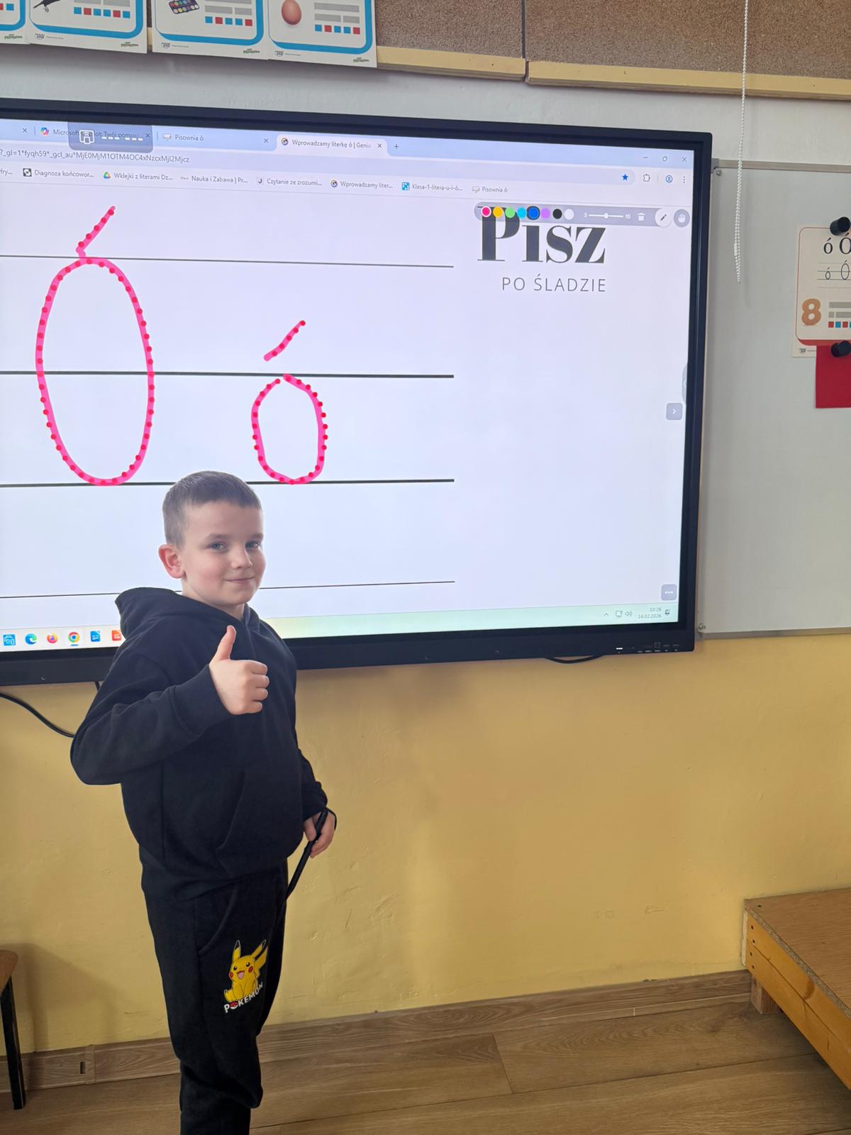 W klasie 1b pod opieką p. Magdaleny Sobotka, odbyły się zajęcia poświęcone wprowadzeniu litery ó, Ó. Uczniowie poznawali jej wygląd, brzmienie oraz sposób zapisu, a następnie wspólnie wyszukiwali wyrazy, w których ta litera występuje. Dzieci aktywnie uczestniczyły w rozmowie i chętnie dzieliły się własnymi przykładami. W trakcie zajęć wykorzystano także tablicę interaktywną, która stanowiła urozmaicenie pracy i pozwoliła pierwszakom w atrakcyjny sposób utrwalić nowo poznaną literę. Dzieci wykonywały interaktywne zadania, reagowały na polecenia wyświetlane na kolorowym ekranie oraz ćwiczyły pisanie litery po śladzie paluszkami i/lub rysikiem. Całe zajęcia przebiegły w atmosferze zabawy i ciekawości, a uczniowie w naturalny sposób przyswoili samogłoskę ó, łącząc naukę z aktywnością, zabawą i technologią.