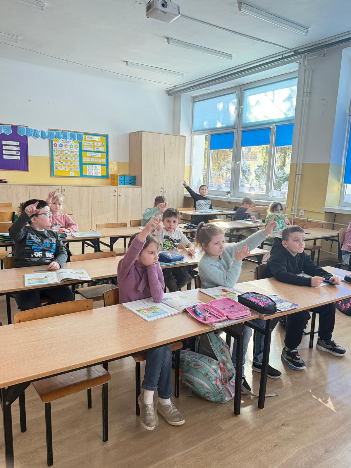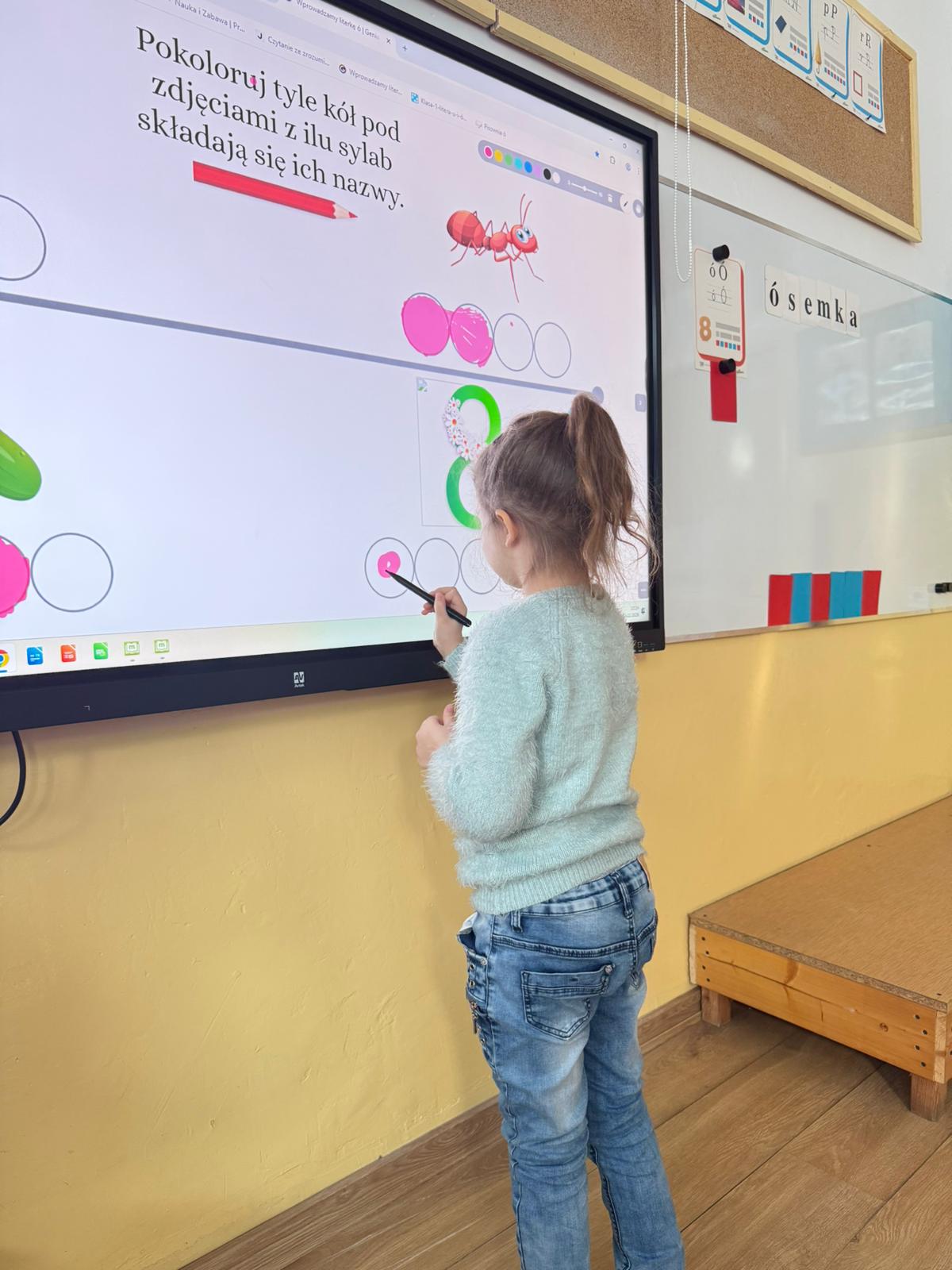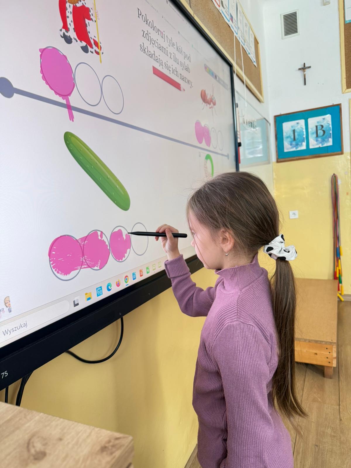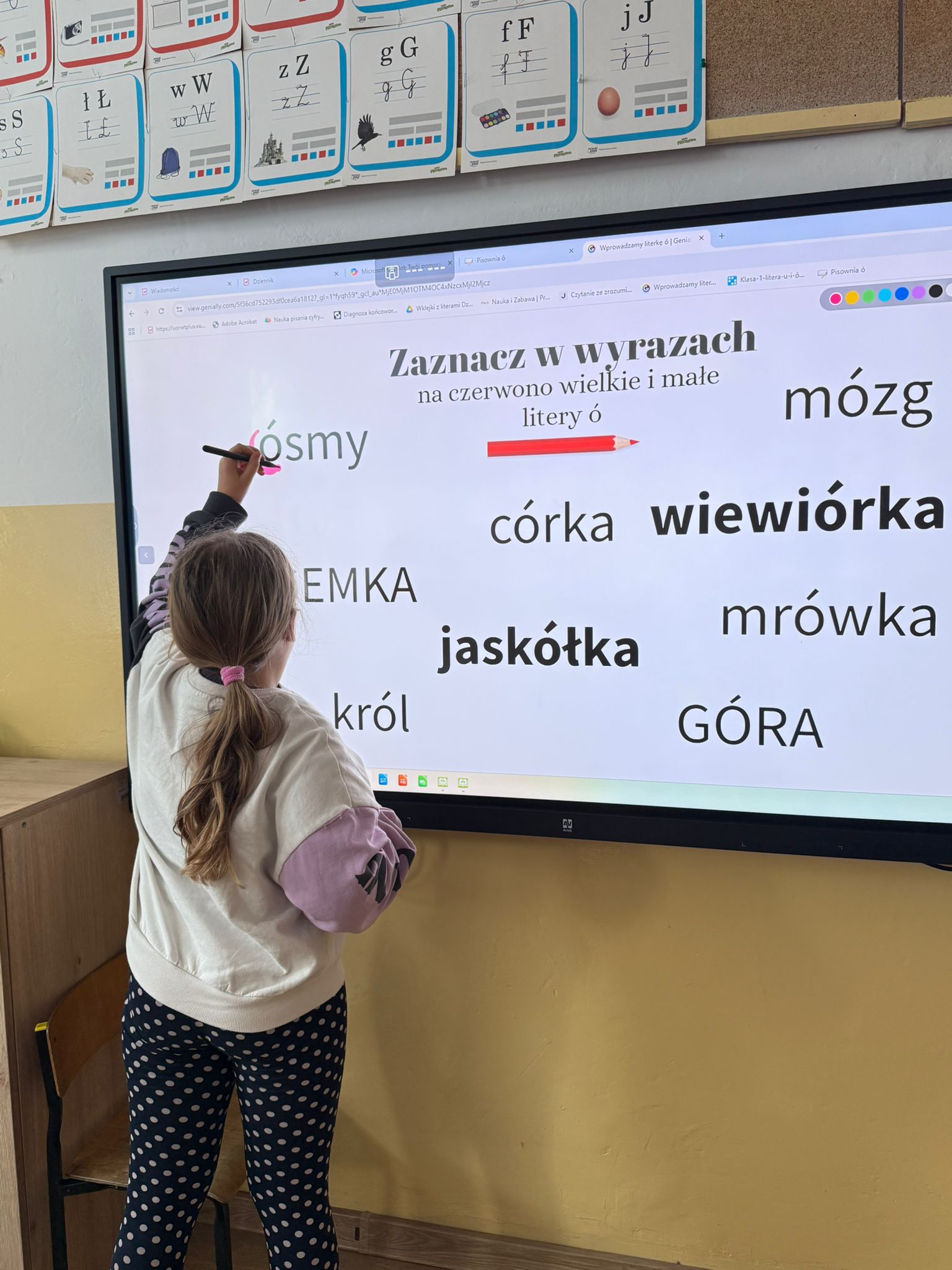 W klasie 1b pod opieką p. Magdaleny Sobotka, odbyły się zajęcia poświęcone wprowadzeniu litery ó, Ó. Uczniowie poznawali jej wygląd, brzmienie oraz sposób zapisu, a następnie wspólnie wyszukiwali wyrazy, w których ta litera występuje. Dzieci aktywnie uczestniczyły w rozmowie i chętnie dzieliły się własnymi przykładami. W trakcie zajęć wykorzystano także tablicę interaktywną, która stanowiła urozmaicenie pracy i pozwoliła pierwszakom w atrakcyjny sposób utrwalić nowo poznaną literę. Dzieci wykonywały interaktywne zadania, reagowały na polecenia wyświetlane na kolorowym ekranie oraz ćwiczyły pisanie litery po śladzie paluszkami i/lub rysikiem. Całe zajęcia przebiegły w atmosferze zabawy i ciekawości, a uczniowie w naturalny sposób przyswoili samogłoskę ó, łącząc naukę z aktywnością, zabawą i technologią.