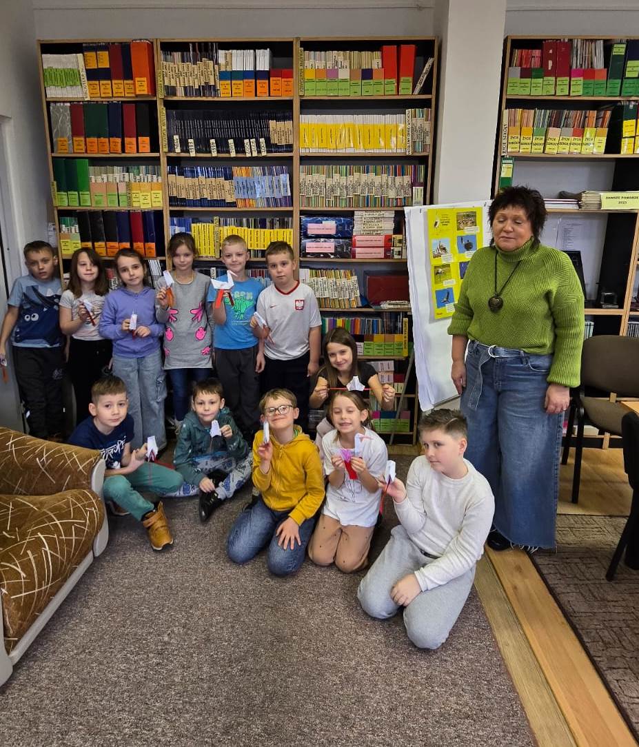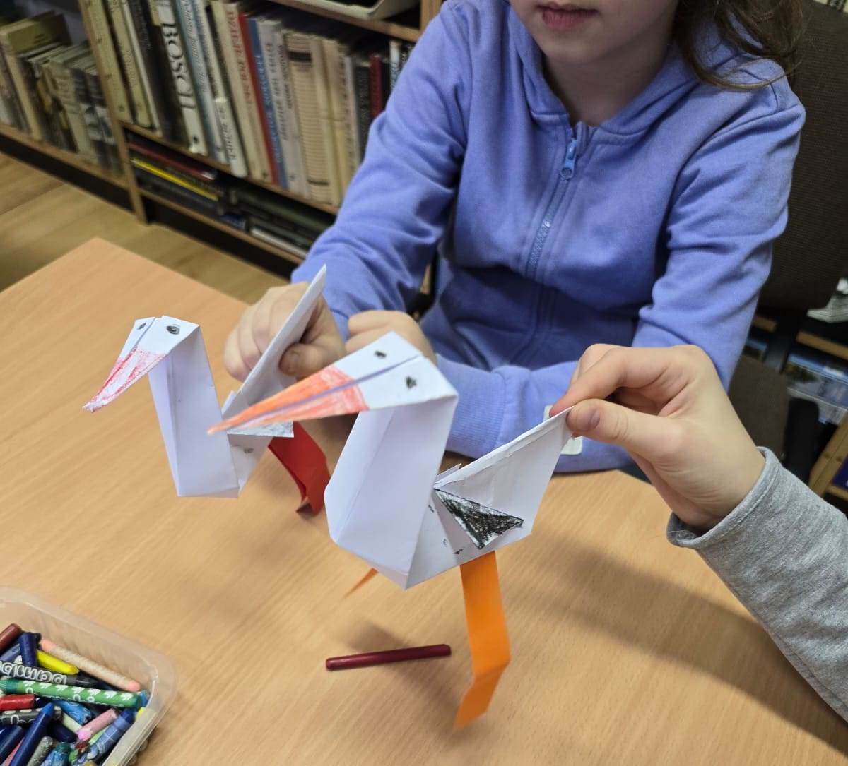 Dzisiaj klasa 2a z p. Magdaleną Pawłowską, uczestniczyła w zajęciach w Bibliotece Pedagogicznej. Zajęcia rozpoczęły się od ćwiczeń jogi, które pozwoliły nam wyrzucić złe emocje a otworzyć się na szczęście. Dzieci wysłuchały ciekawostek o życiu bocianów, następnie opowieści pt "Wierna miłość Klepetana i Maleny, która nie może latac". Na zakończenie zajęć uczniowie wykonali bociana origami.