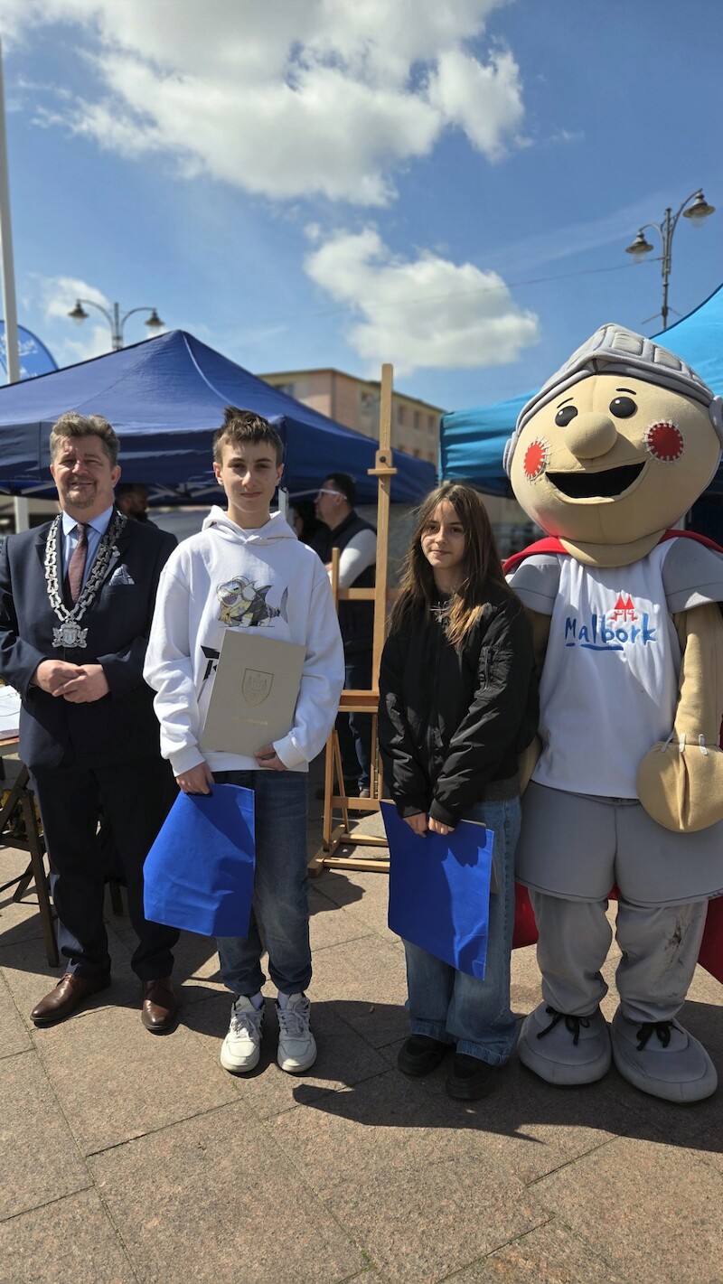 Punktualnie w sobotnie południe burmistrz Malborka Marek Charzewski wraz z Mariankiem wręczyli nagrody laureatom konkursu plastycznego „Marianek świętuje 740. rocznicę urodzin miasta Malborka”. Z ogromną dumą informujemy, że uczniowie naszej szkoły: Dawid Bączek /laureat II m./, Zosia Kowalska i Ola Oreshina /wyróżnione/ zostali nagrodzeni w miejskim konkursie plastycznym. Ich prace zachwyciły jury kreatywnym spojrzeniem na historię i współczesne oblicze naszej małej ojczyzny- Malborka. Wszystkim laureatowi i wyróżnionym serdecznie gratulujemy i życzymy dalszych sukcesów na drodze artystycznej. Uczniów wspierała szkolna nauczycielka plastyki – p.Marzena Kratewicz.