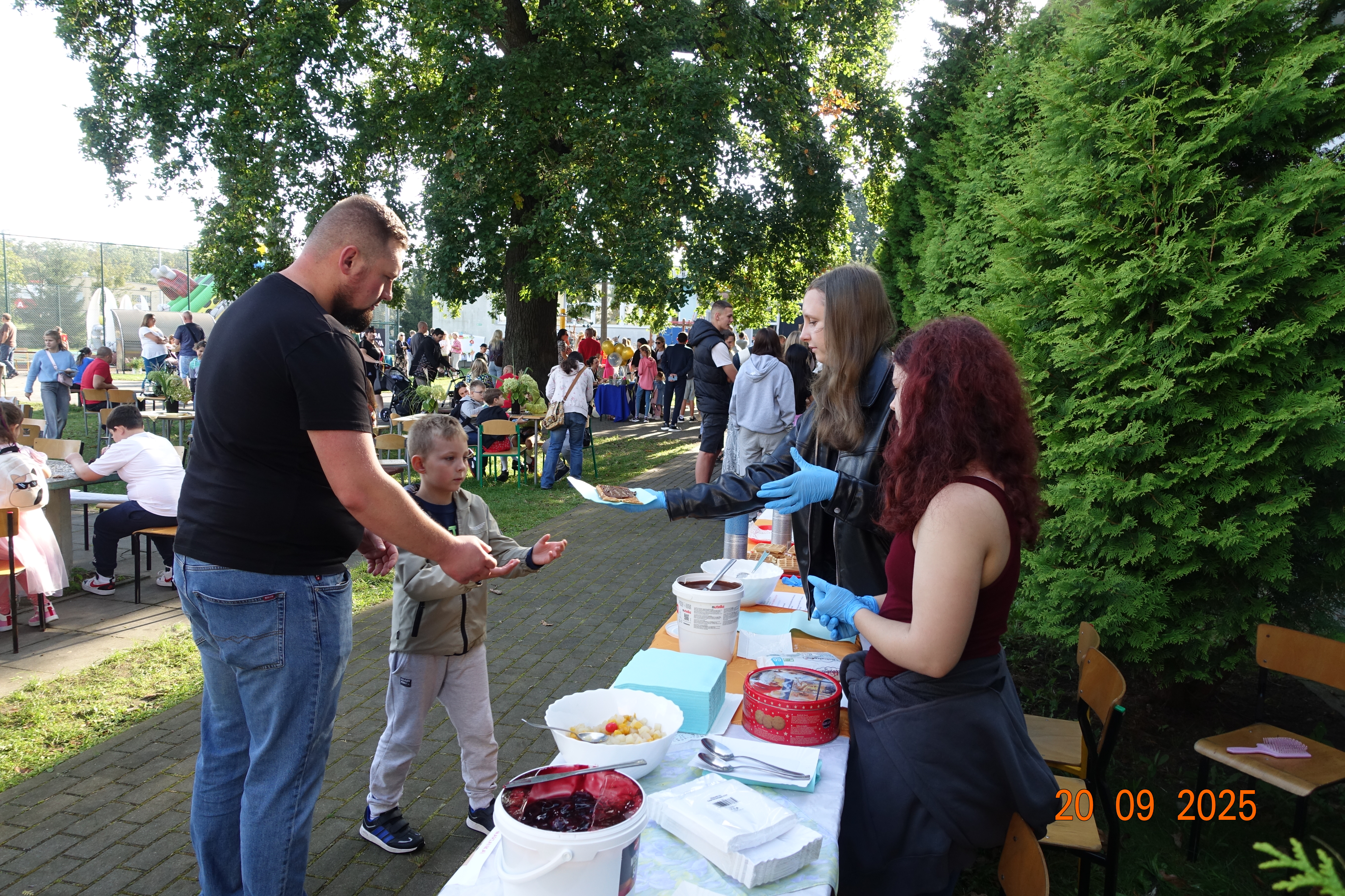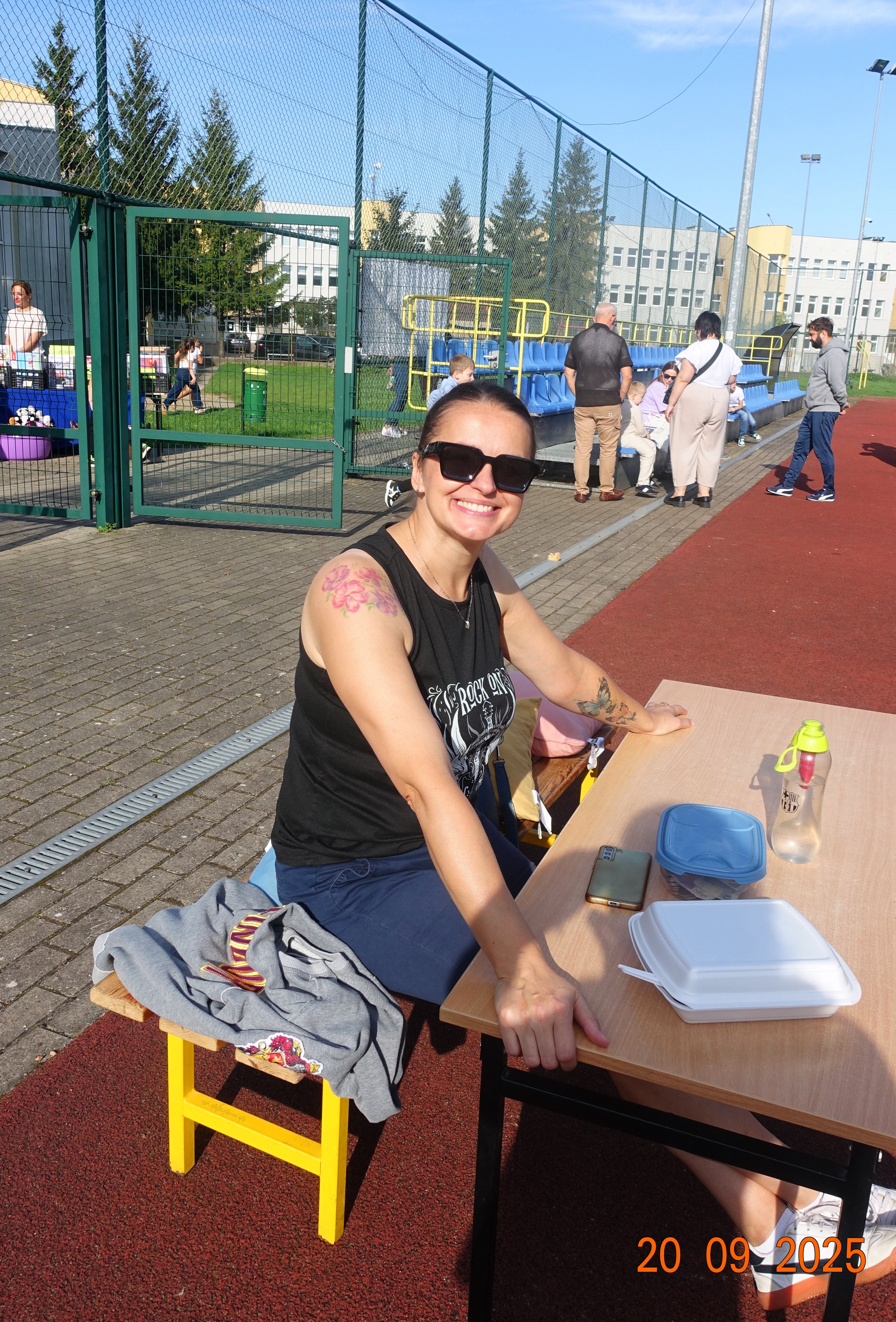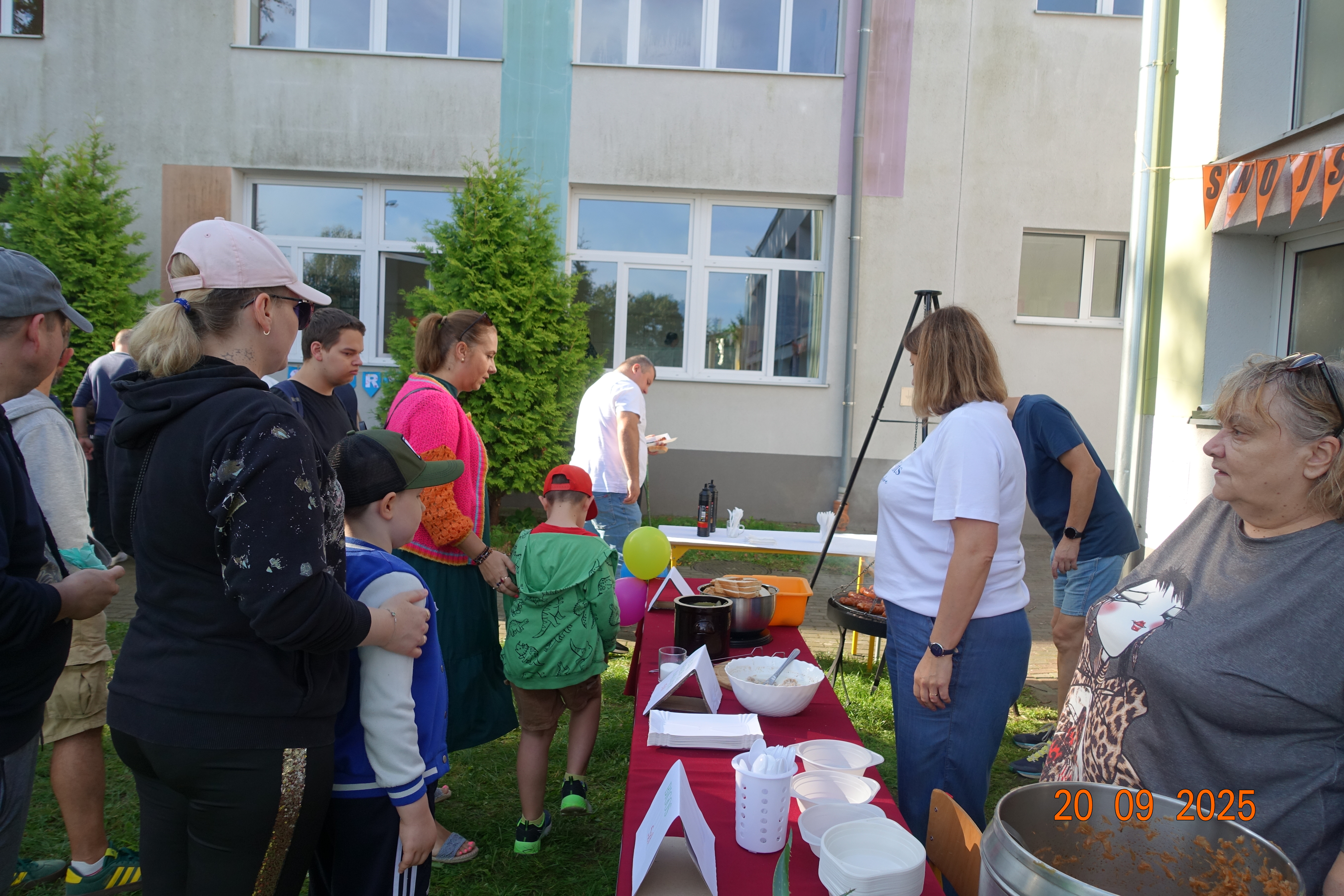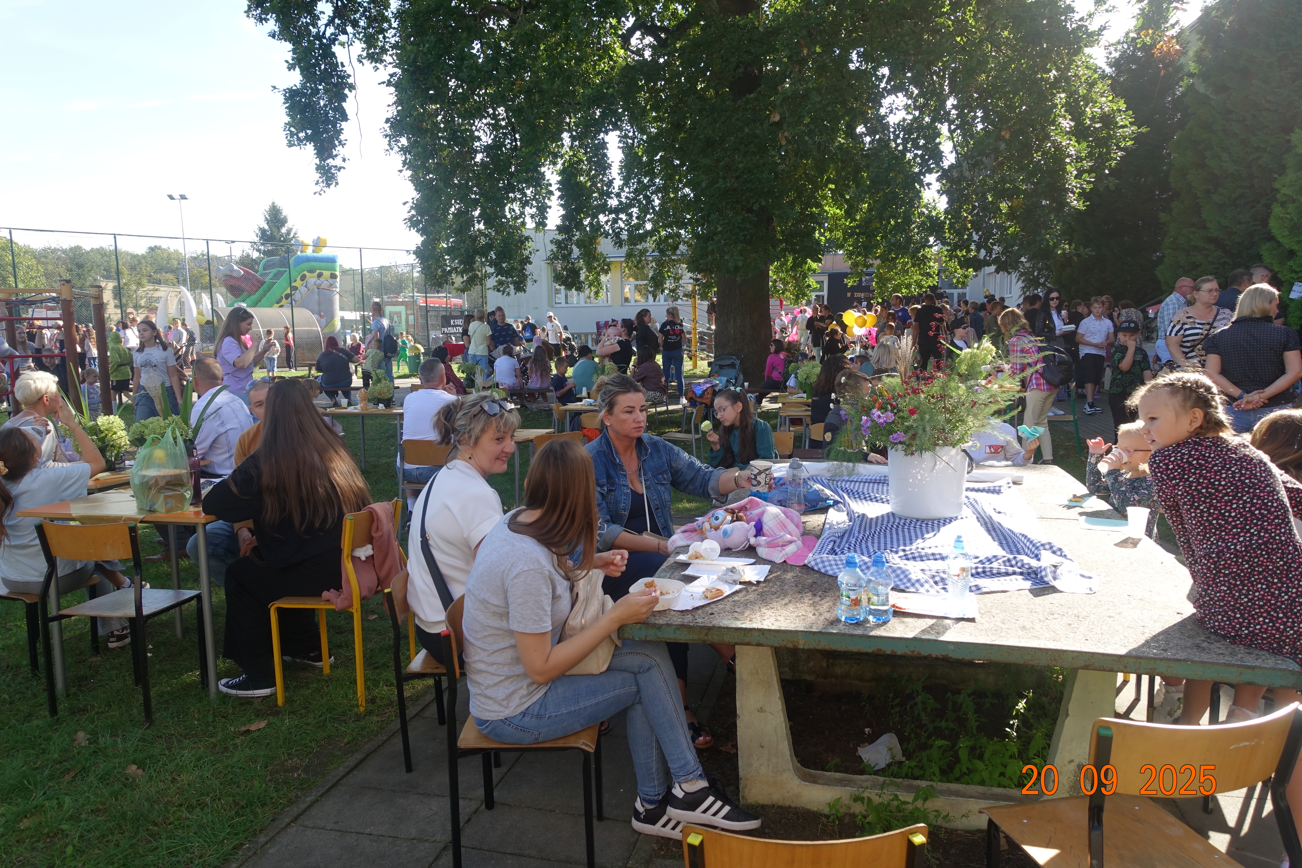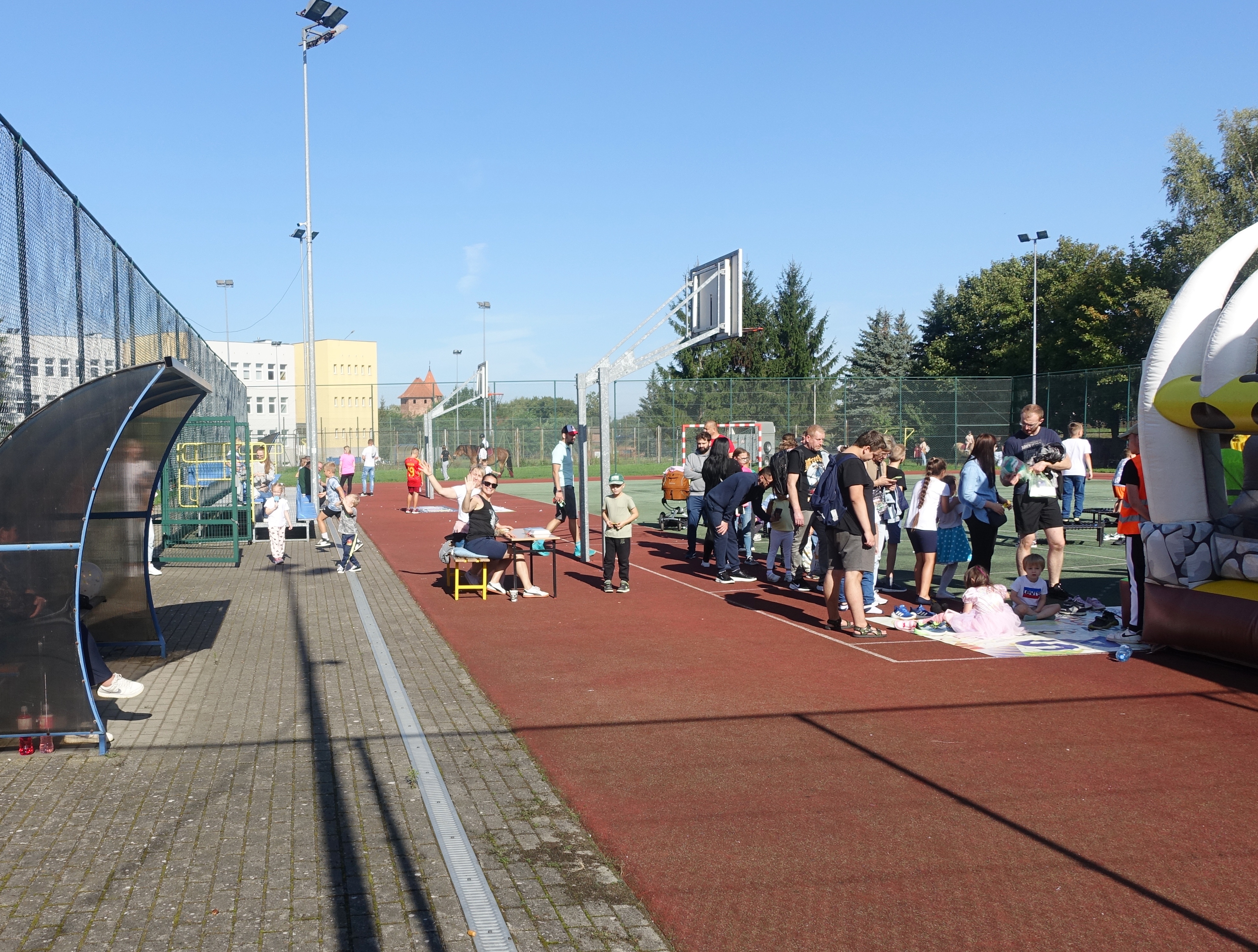 W między czasie rozpoczęły się towarzyskie spotkania na korytarzach i ,,przy dębie’’. Dla zgłodniałych na pikniku czekały różnorodne stoiska, począwszy od kiełbaski z grilla, gofrów, popcornu, lodów, a skończywszy na pajdzie ze smalczykiem. Dla smakoszy słodkości – były do wyboru przepyszne domowe ciasta i inne wypieki. Nie zabrakło i malborskich służb mundurowych /policji oraz straży pożarnej/, za kilka złociszy chętni mogli dosiąść wierzchowca albo poturlać się na ,,dmuchańcach’’ czy pobawić się na boisku wielkimi, kolorowymi klockami. Do kolejnych atrakcji należała na pewno fotobudka i możliwość zaplatania warkoczyków. Chętni mogli wpisać się do Księgi pamiątkowej. Festyn był też okazją, by wesprzeć zbiórkę na figurkę ,,dziewiątkowego’’ Marianka. A loteria szkolna temu sprzyjała.