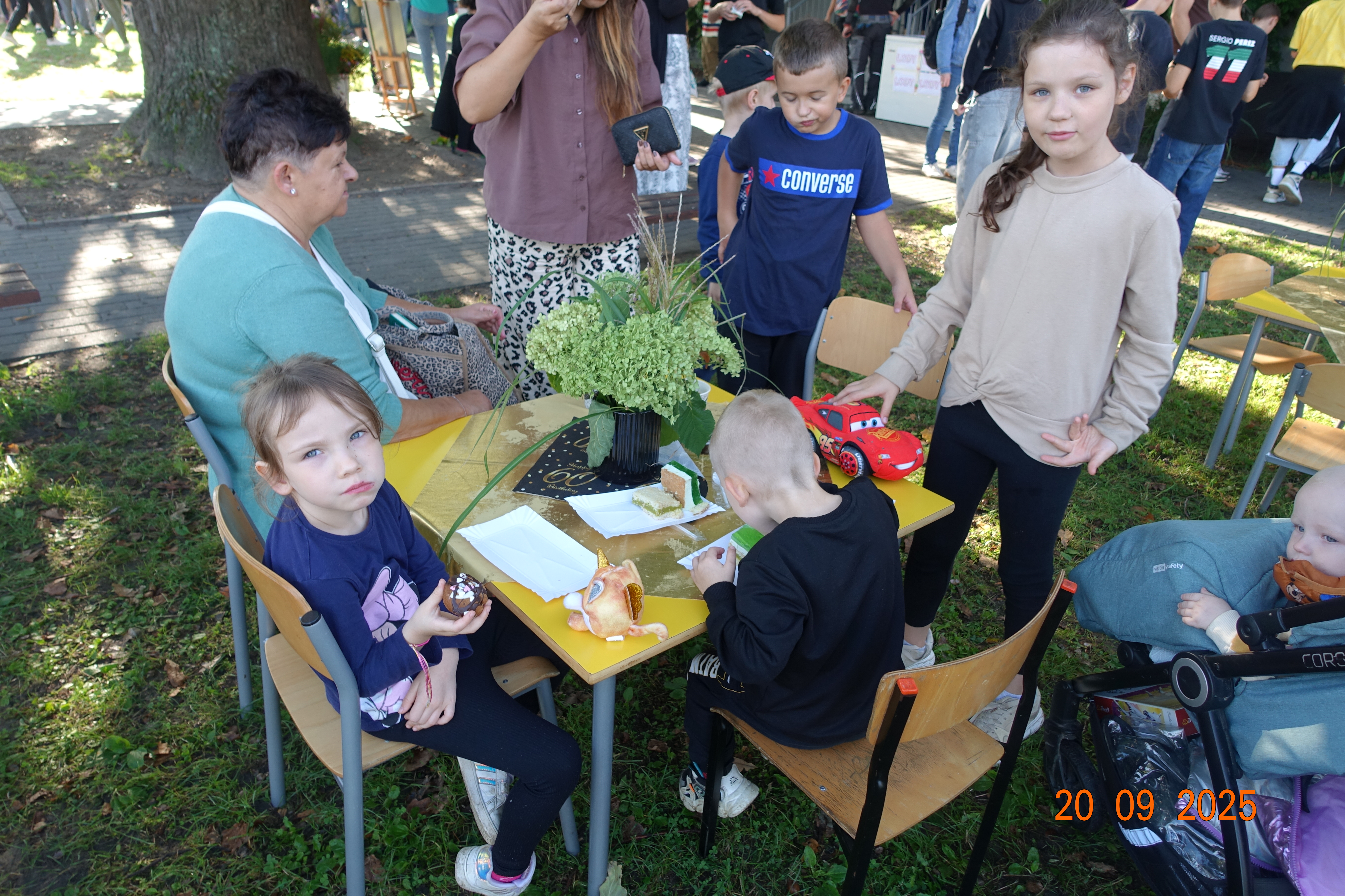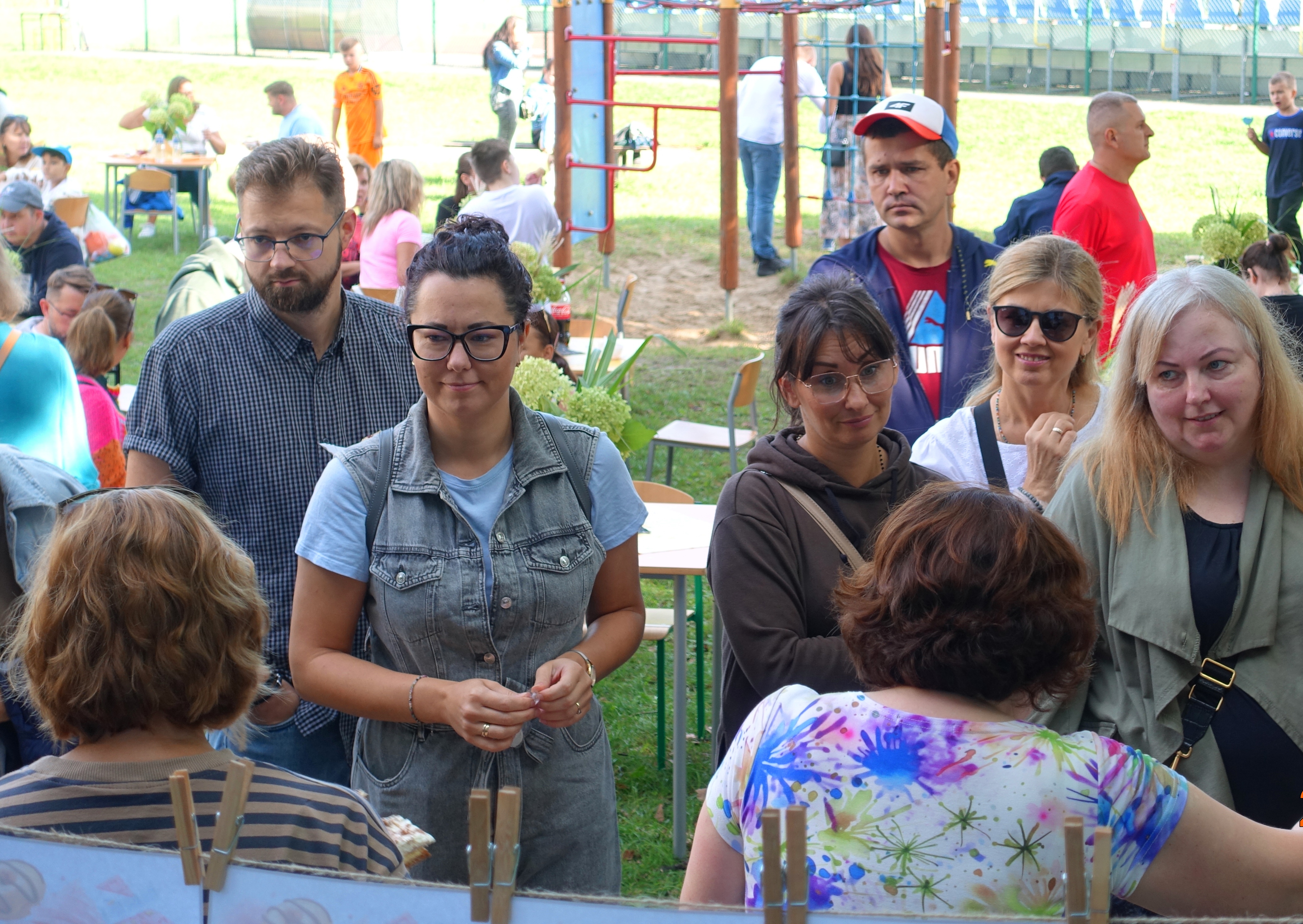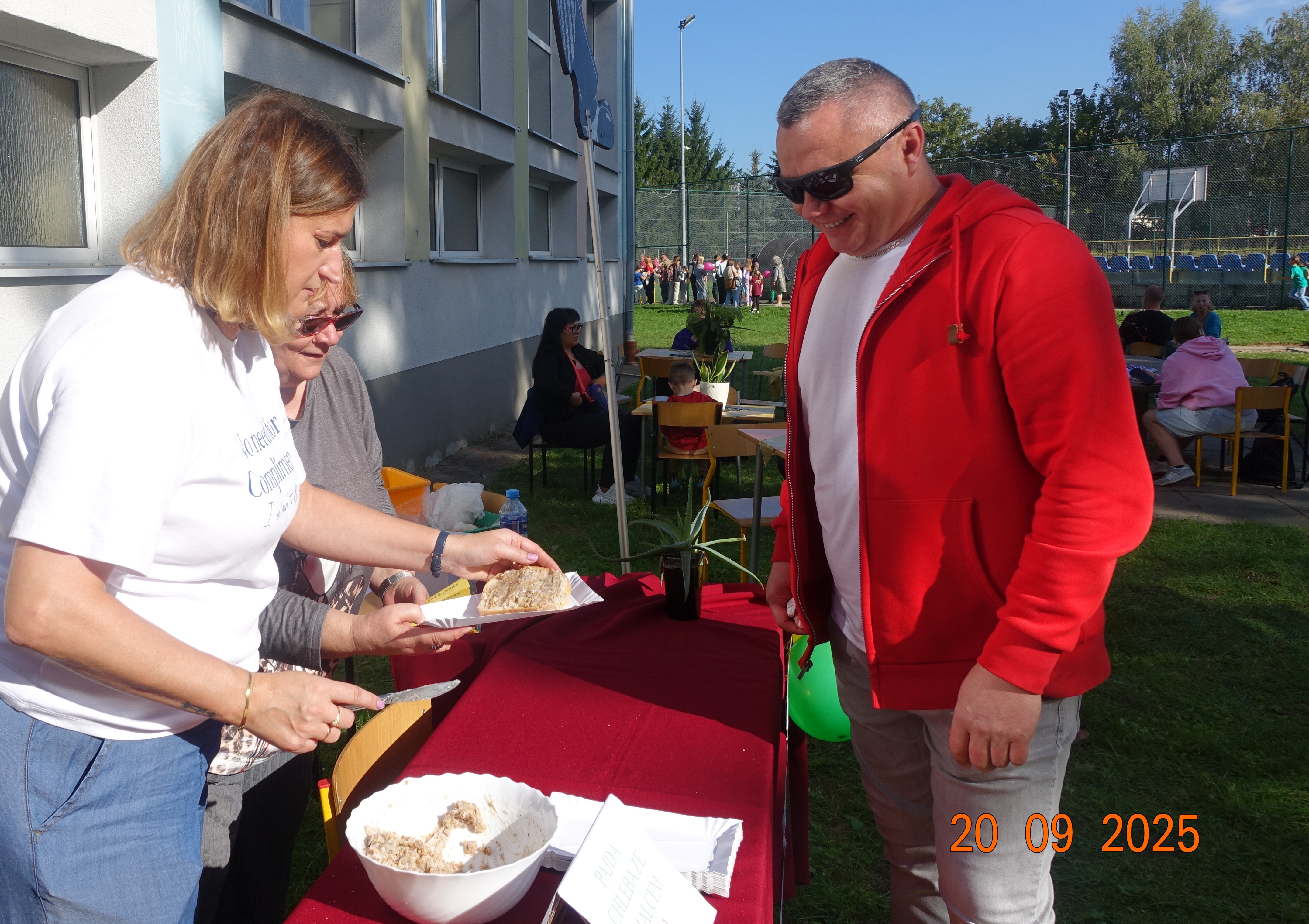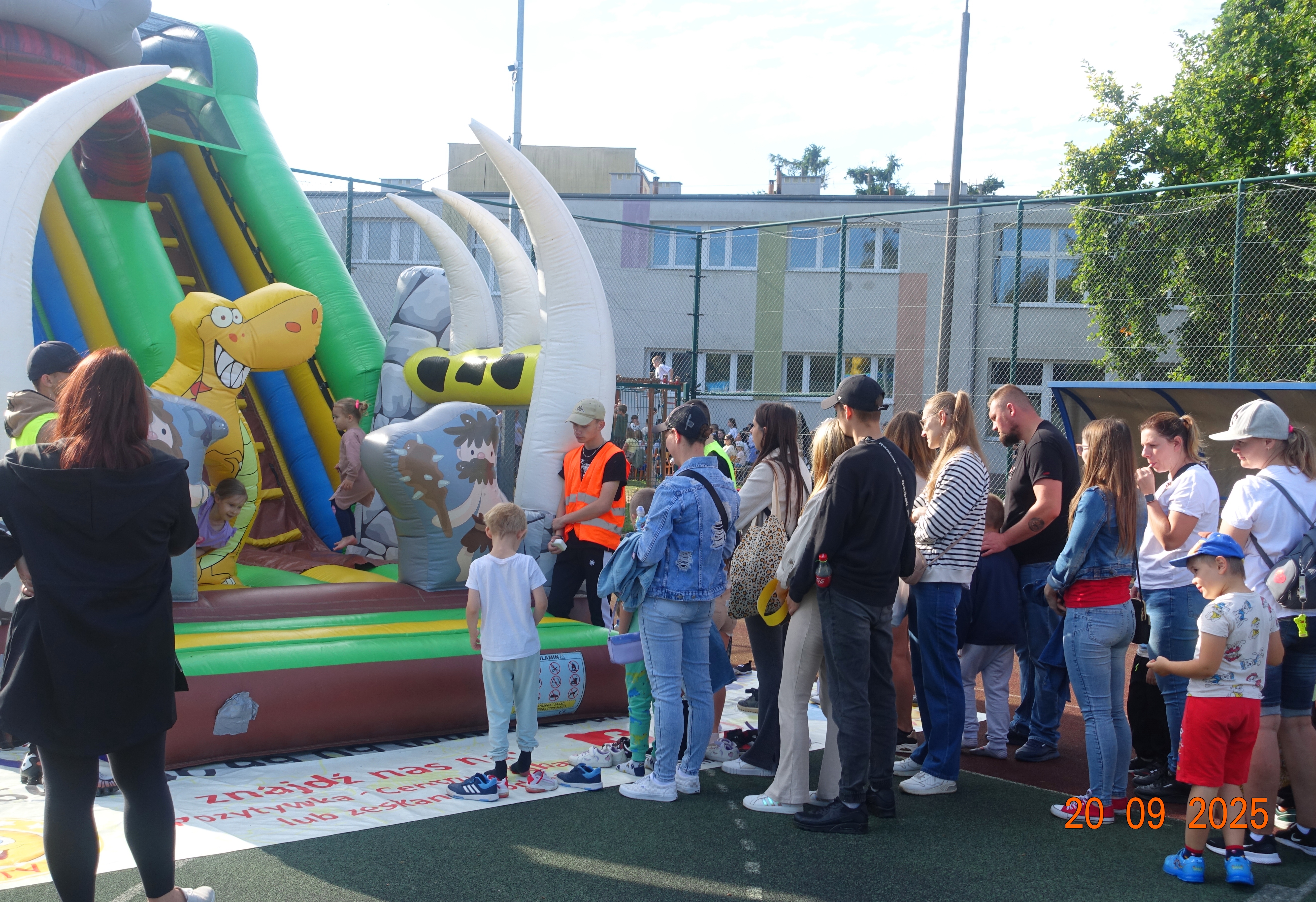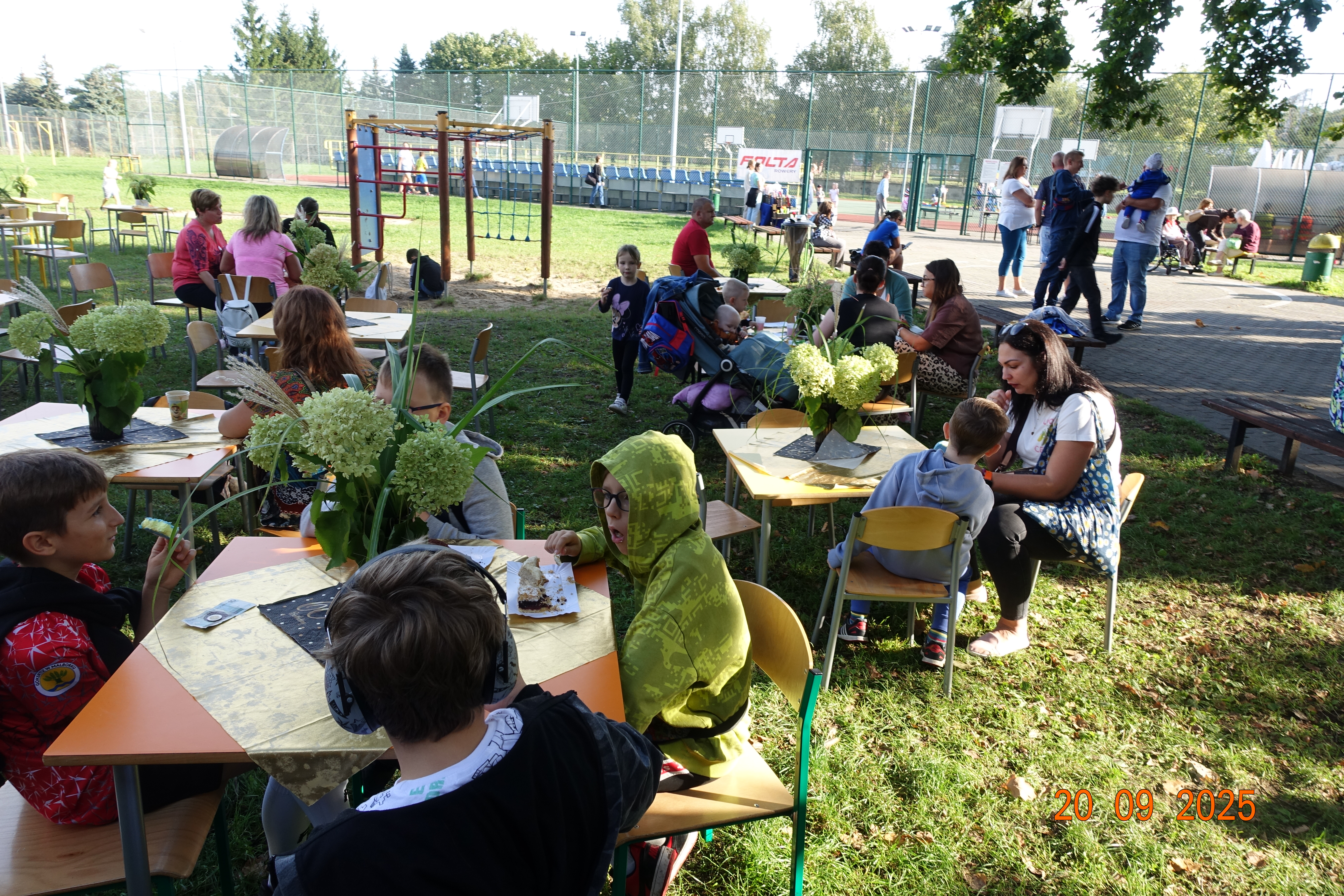 W między czasie rozpoczęły się towarzyskie spotkania na korytarzach i ,,przy dębie’’. Dla zgłodniałych na pikniku czekały różnorodne stoiska, począwszy od kiełbaski z grilla, gofrów, popcornu, lodów, a skończywszy na pajdzie ze smalczykiem. Dla smakoszy słodkości – były do wyboru przepyszne domowe ciasta i inne wypieki. Nie zabrakło i malborskich służb mundurowych /policji oraz straży pożarnej/, za kilka złociszy chętni mogli dosiąść wierzchowca albo poturlać się na ,,dmuchańcach’’ czy pobawić się na boisku wielkimi, kolorowymi klockami. Do kolejnych atrakcji należała na pewno fotobudka i możliwość zaplatania warkoczyków. Chętni mogli wpisać się do Księgi pamiątkowej. Festyn był też okazją, by wesprzeć zbiórkę na figurkę ,,dziewiątkowego’’ Marianka. A loteria szkolna temu sprzyjała.