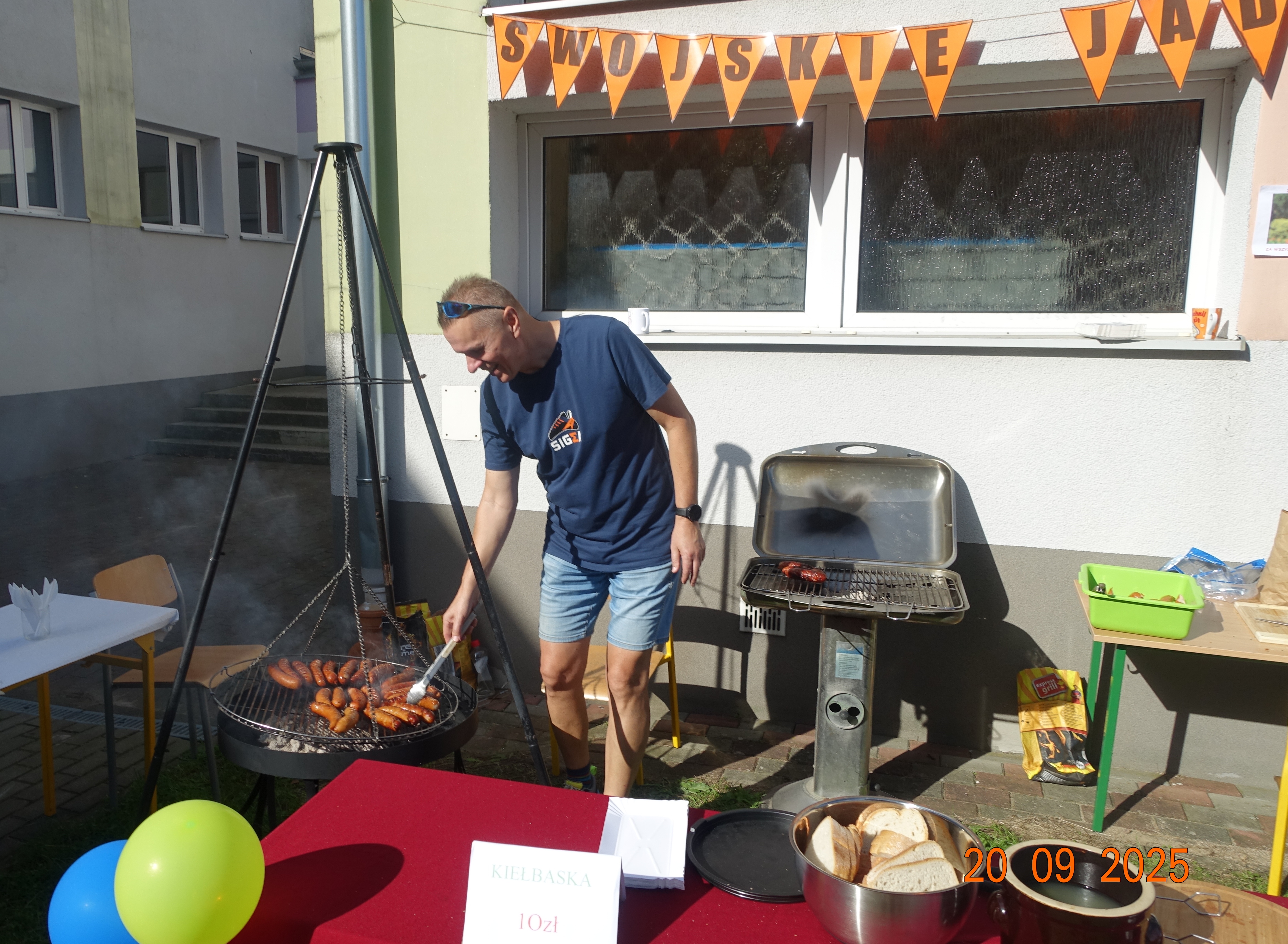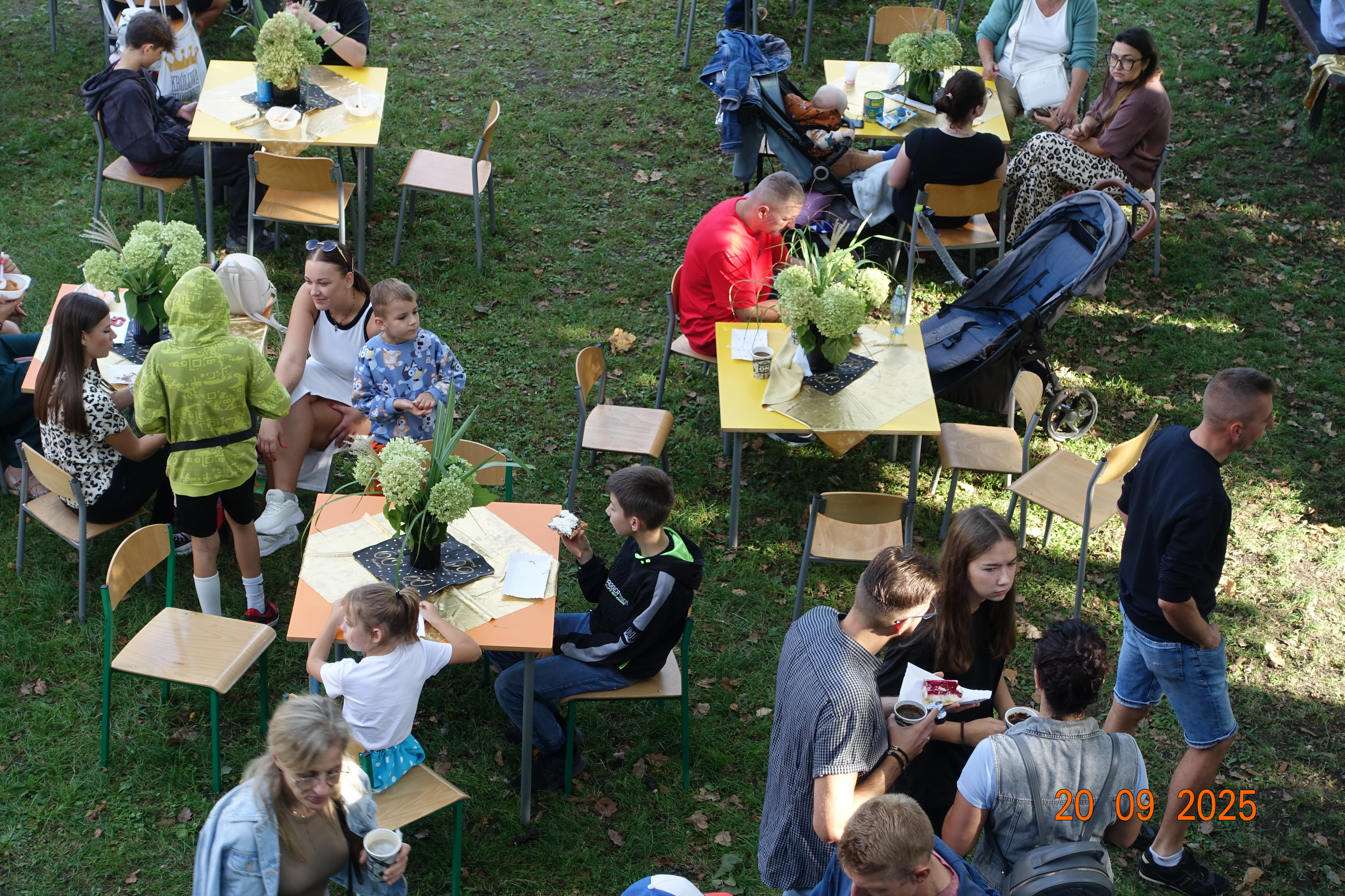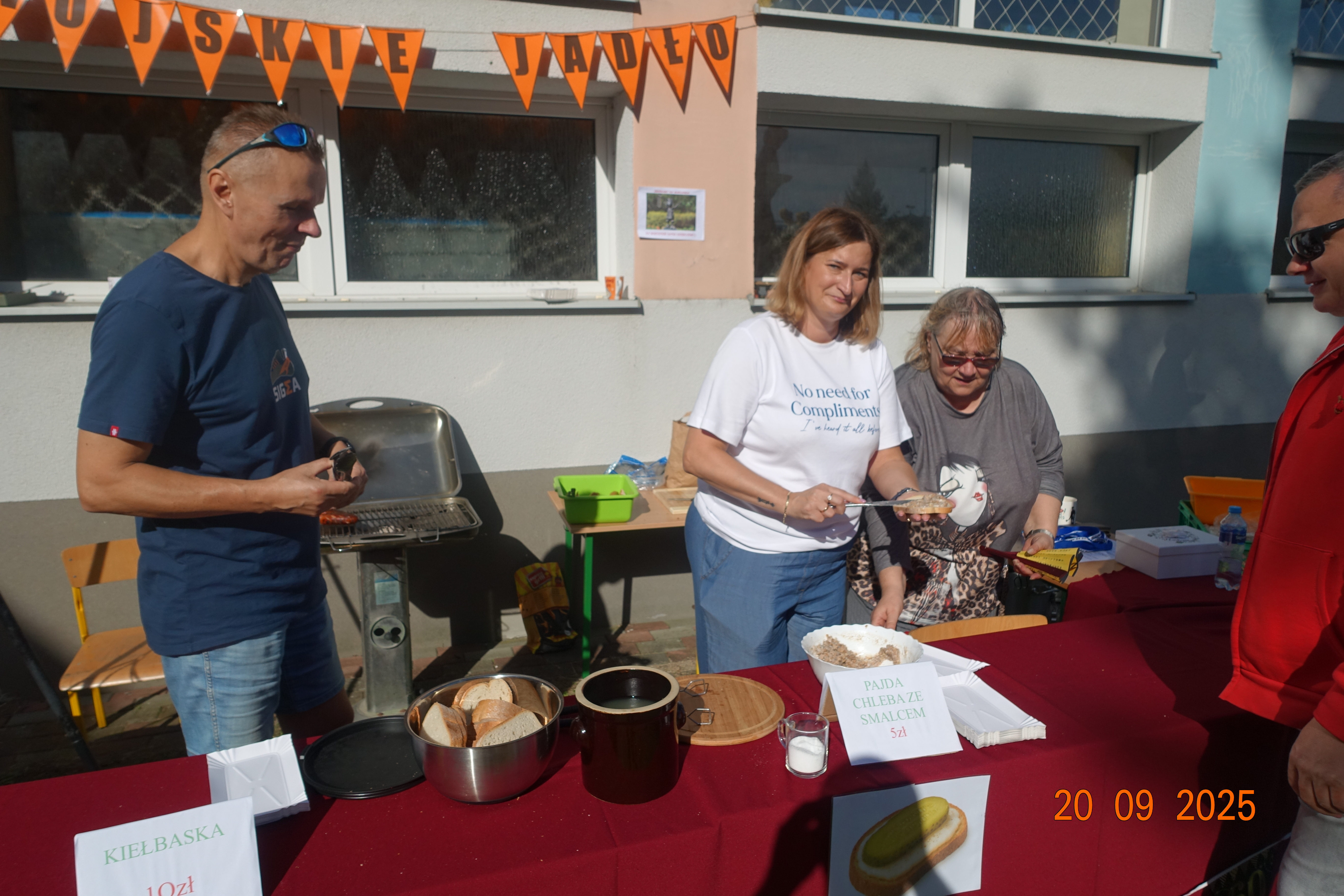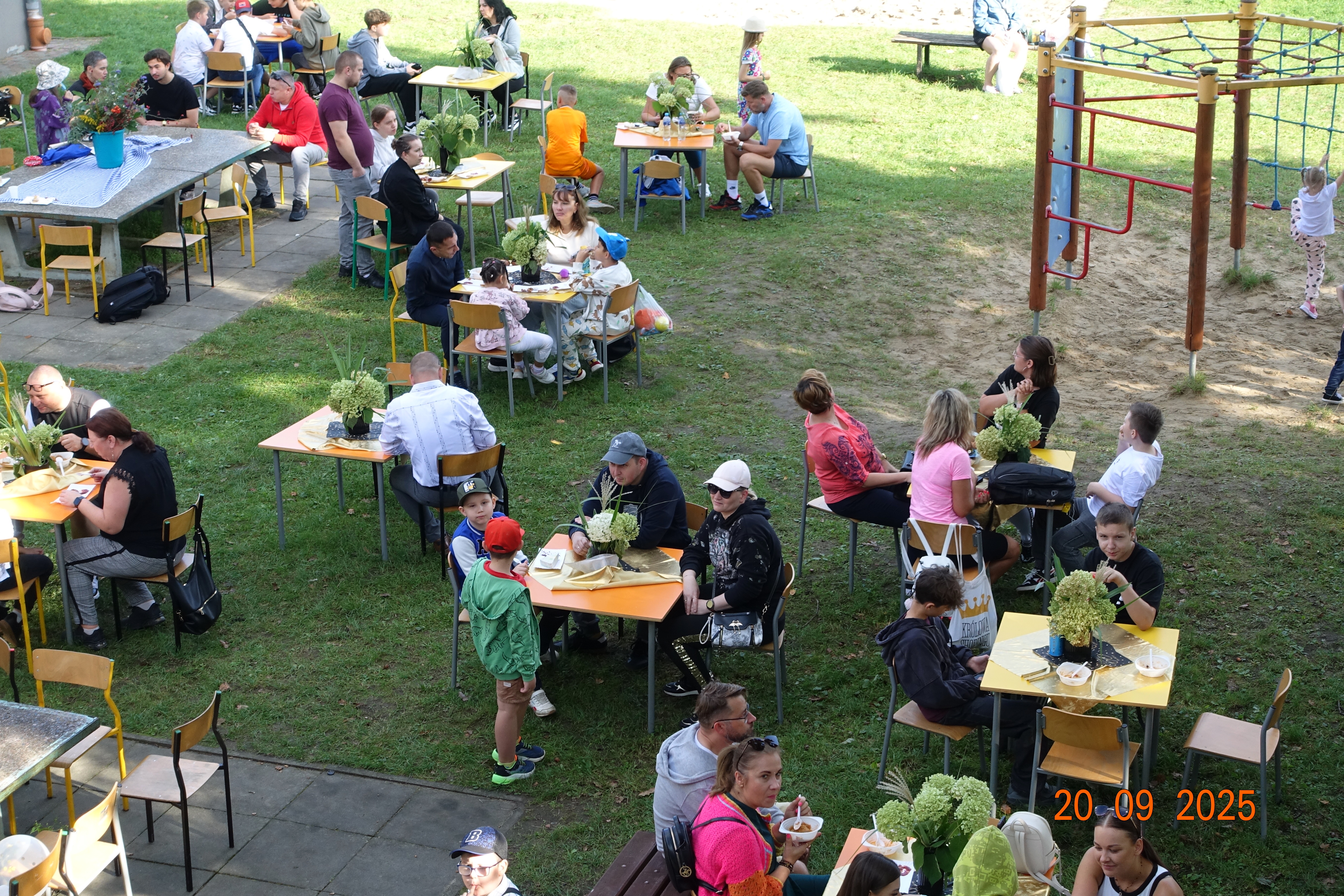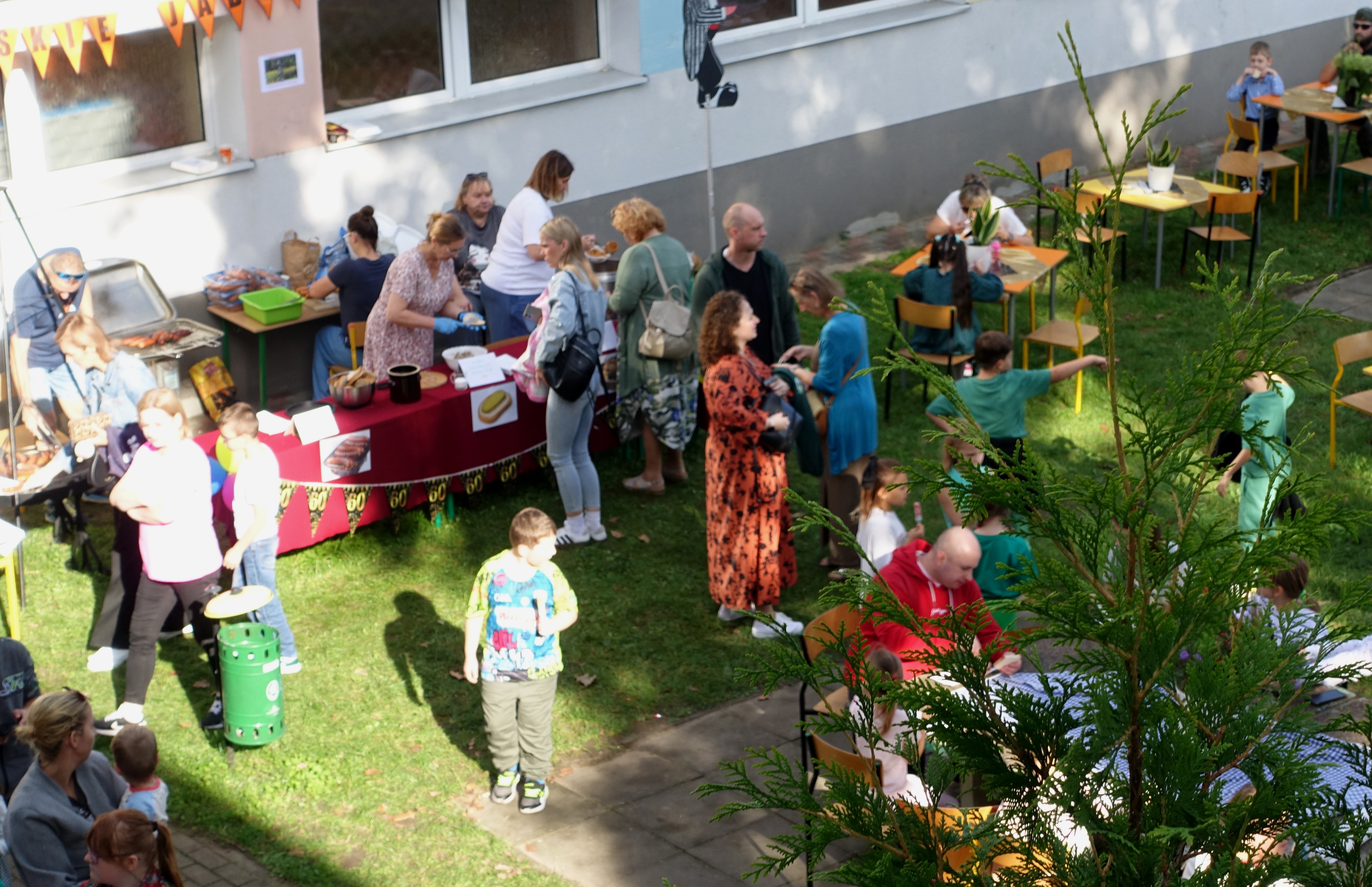 W między czasie rozpoczęły się towarzyskie spotkania na korytarzach i ,,przy dębie’’. Dla zgłodniałych na pikniku czekały różnorodne stoiska, począwszy od kiełbaski z grilla, gofrów, popcornu, lodów, a skończywszy na pajdzie ze smalczykiem. Dla smakoszy słodkości – były do wyboru przepyszne domowe ciasta i inne wypieki. Nie zabrakło i malborskich służb mundurowych /policji oraz straży pożarnej/, za kilka złociszy chętni mogli dosiąść wierzchowca albo poturlać się na ,,dmuchańcach’’ czy pobawić się na boisku wielkimi, kolorowymi klockami. Do kolejnych atrakcji należała na pewno fotobudka i możliwość zaplatania warkoczyków. Chętni mogli wpisać się do Księgi pamiątkowej. Festyn był też okazją, by wesprzeć zbiórkę na figurkę ,,dziewiątkowego’’ Marianka. A loteria szkolna temu sprzyjała.