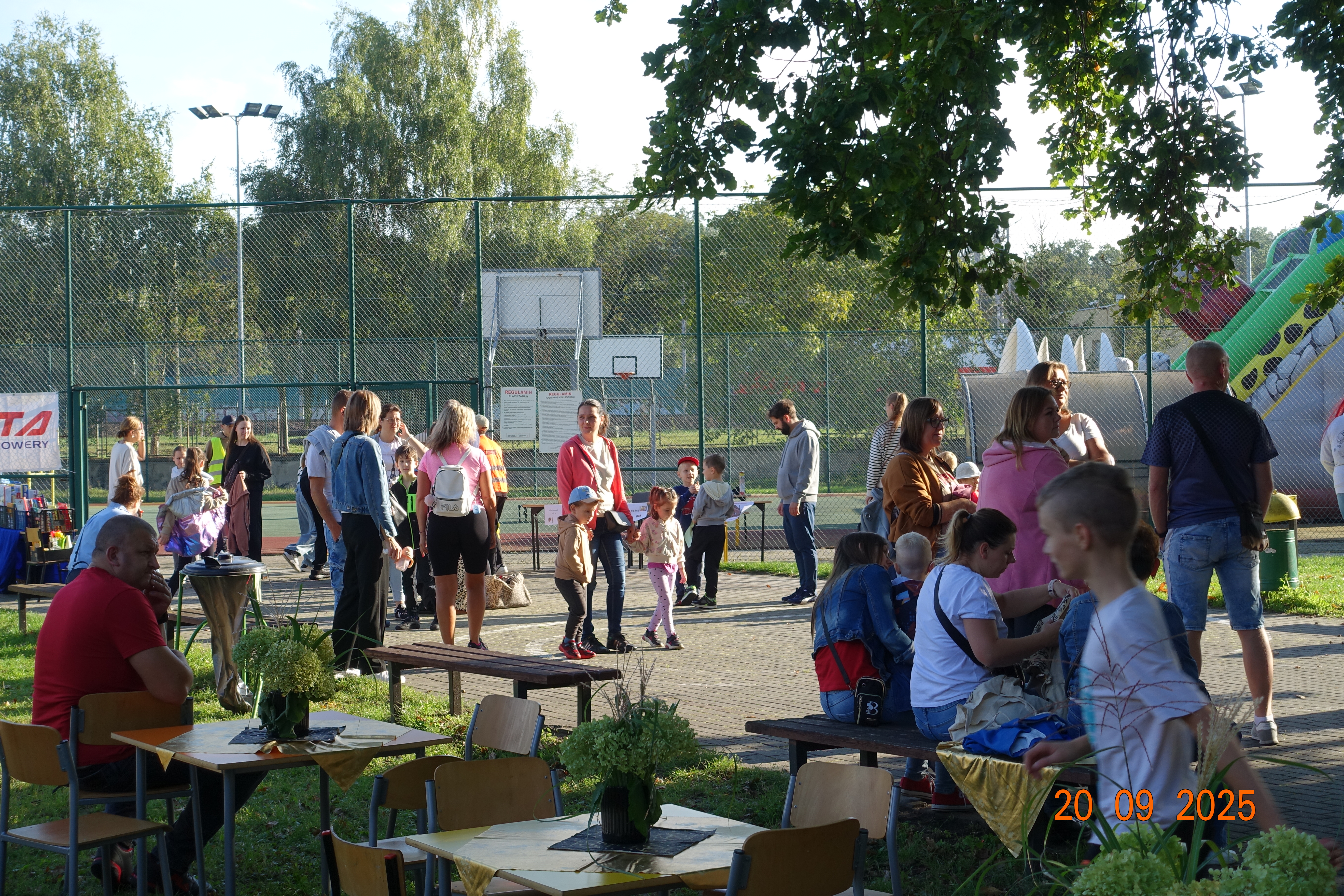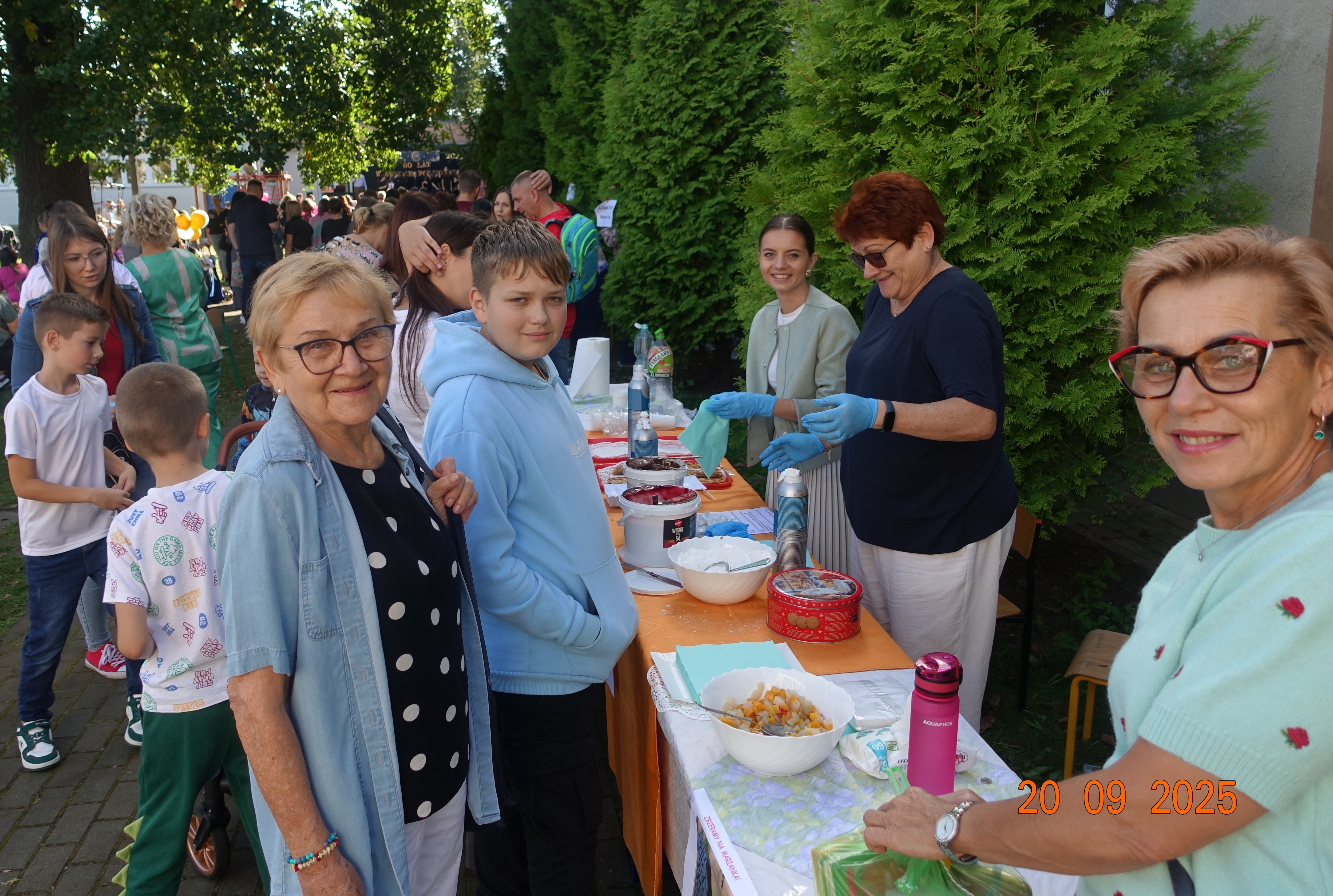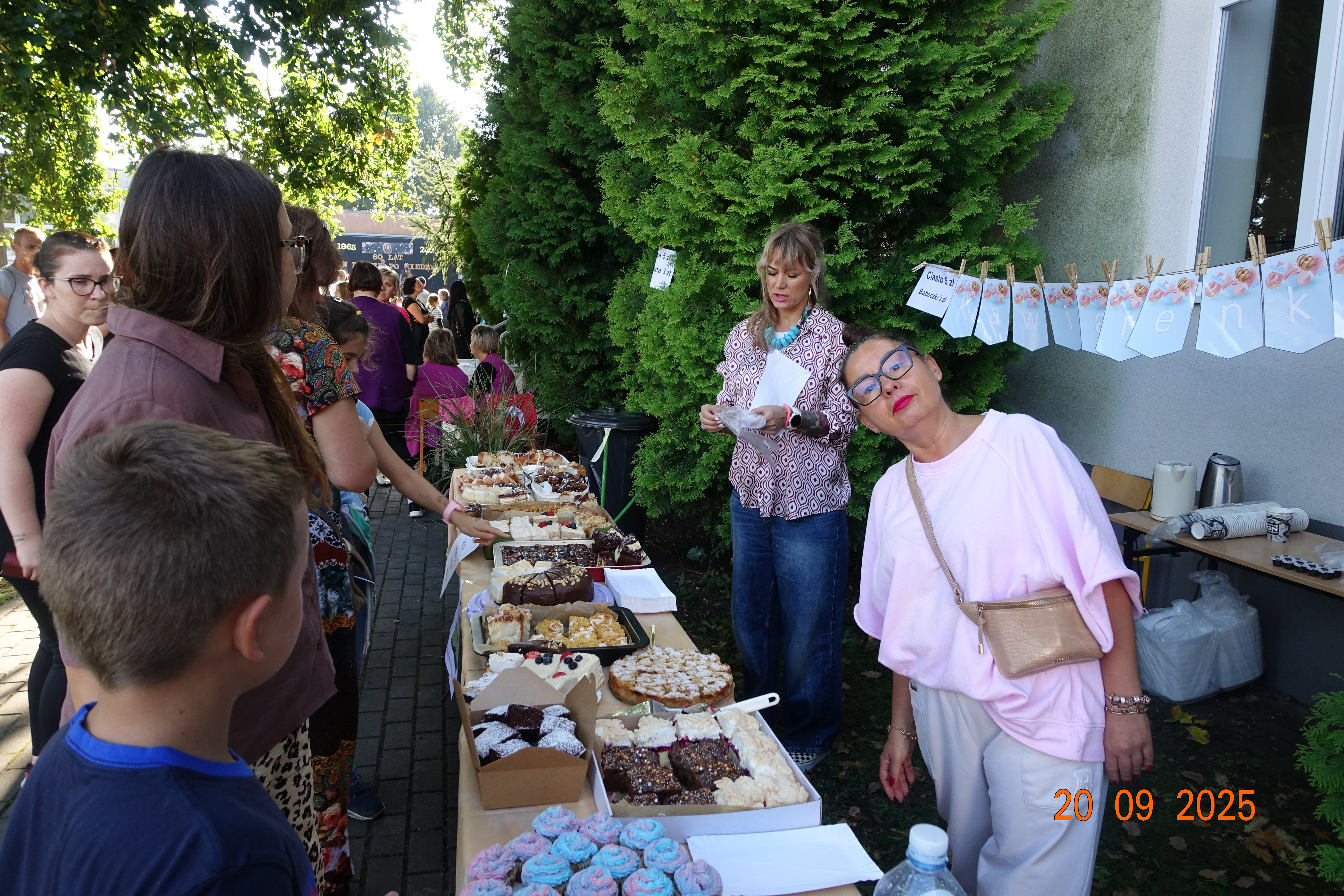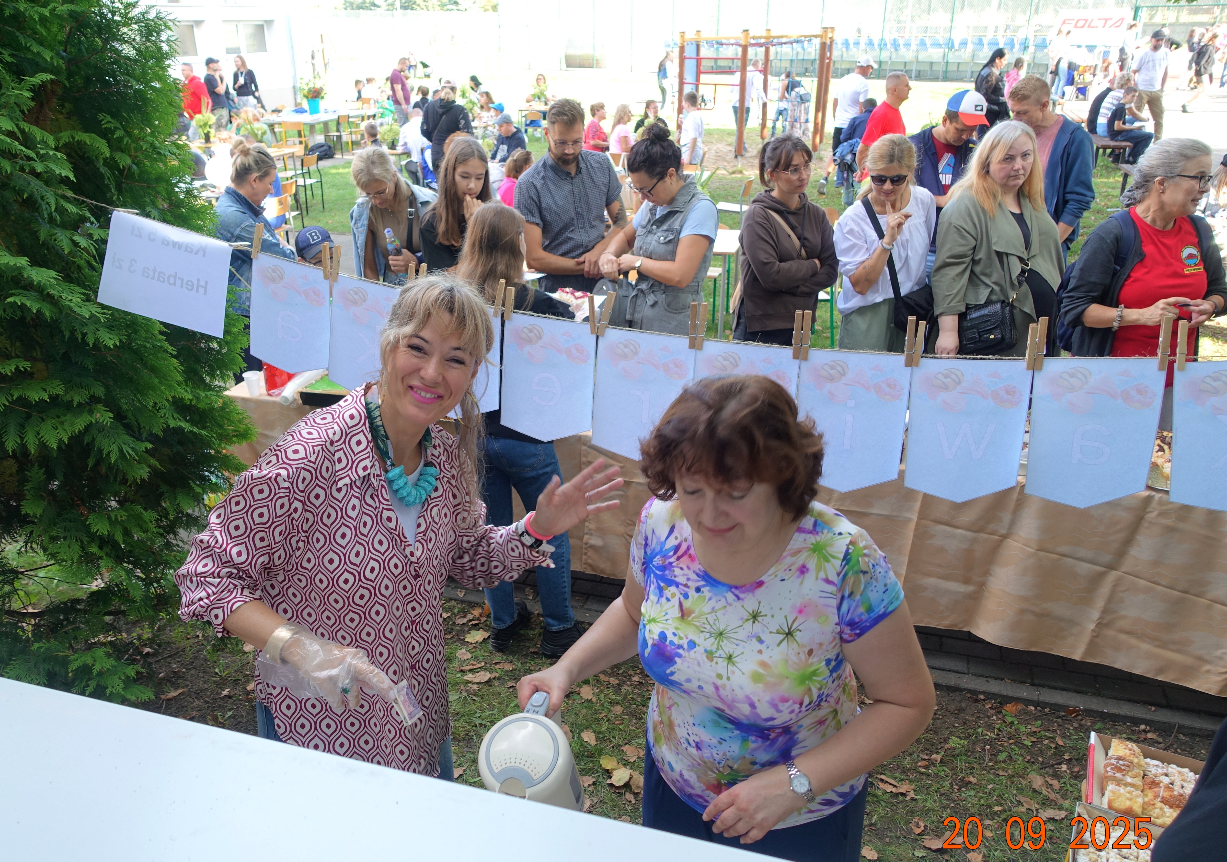 W między czasie rozpoczęły się towarzyskie spotkania na korytarzach i ,,przy dębie’’. Dla zgłodniałych na pikniku czekały różnorodne stoiska, począwszy od kiełbaski z grilla, gofrów, popcornu, lodów, a skończywszy na pajdzie ze smalczykiem. Dla smakoszy słodkości – były do wyboru przepyszne domowe ciasta i inne wypieki. Nie zabrakło i malborskich służb mundurowych /policji oraz straży pożarnej/, za kilka złociszy chętni mogli dosiąść wierzchowca albo poturlać się na ,,dmuchańcach’’ czy pobawić się na boisku wielkimi, kolorowymi klockami. Do kolejnych atrakcji należała na pewno fotobudka i możliwość zaplatania warkoczyków. Chętni mogli wpisać się do Księgi pamiątkowej. Festyn był też okazją, by wesprzeć zbiórkę na figurkę ,,dziewiątkowego’’ Marianka. A loteria szkolna temu sprzyjała.