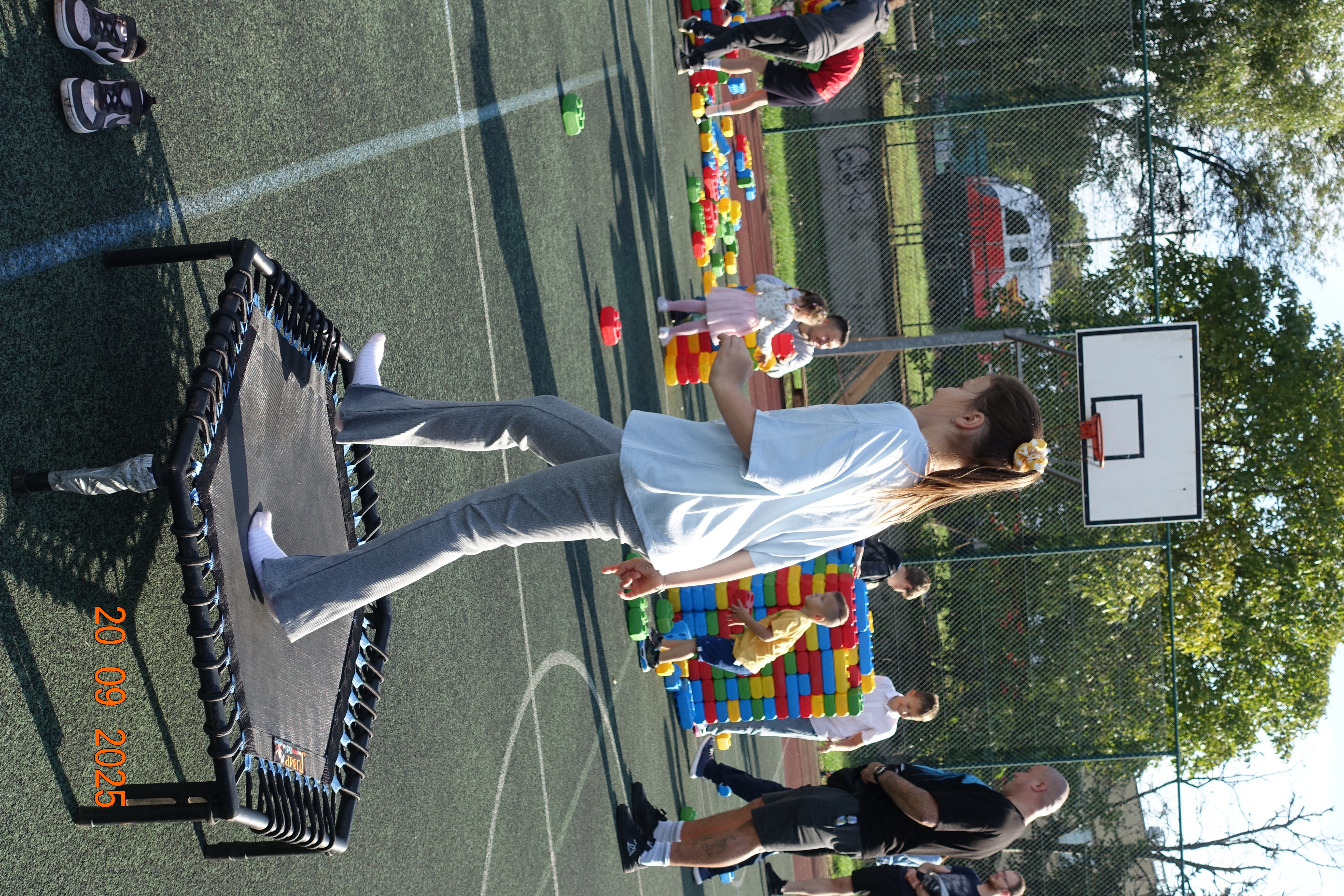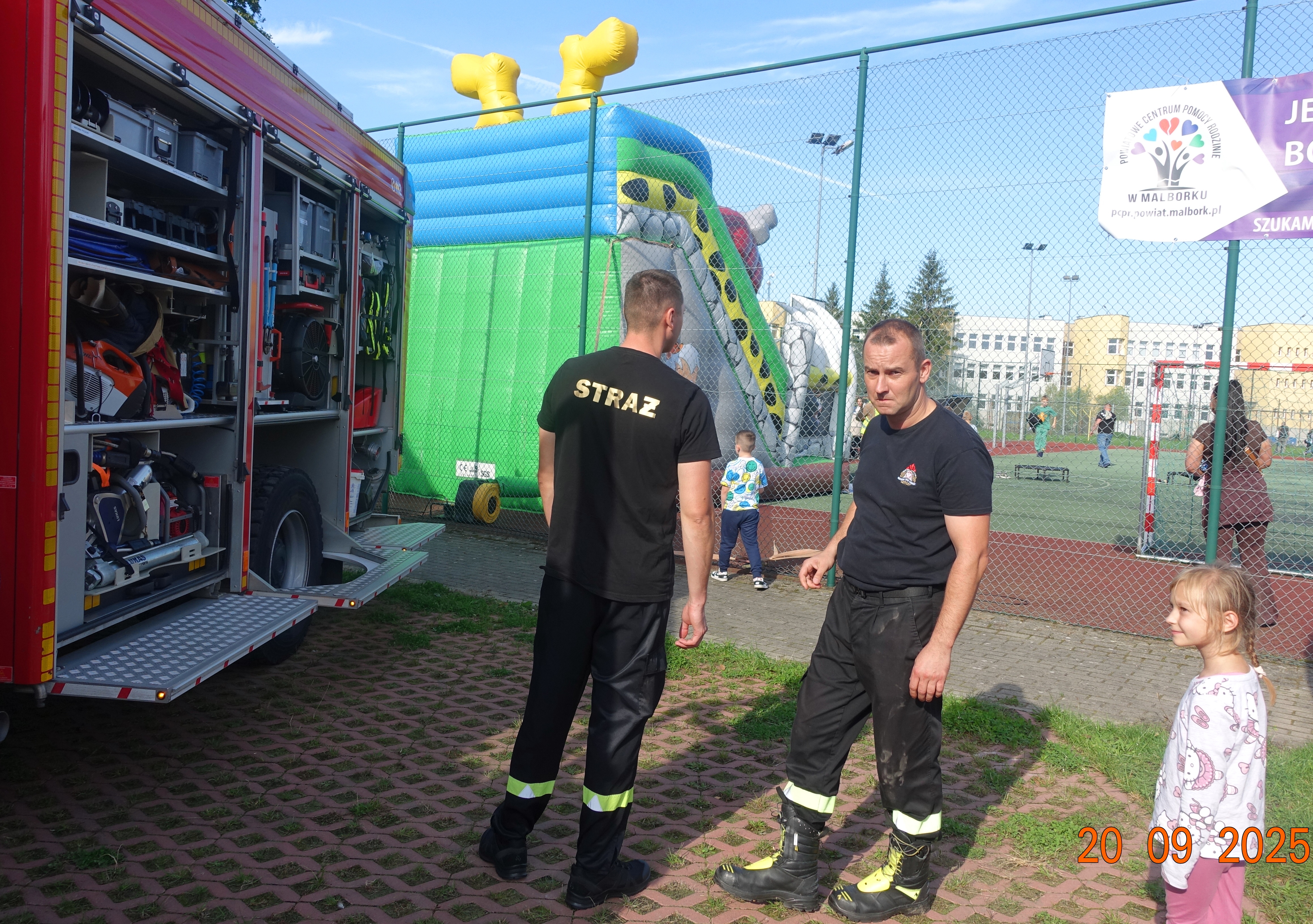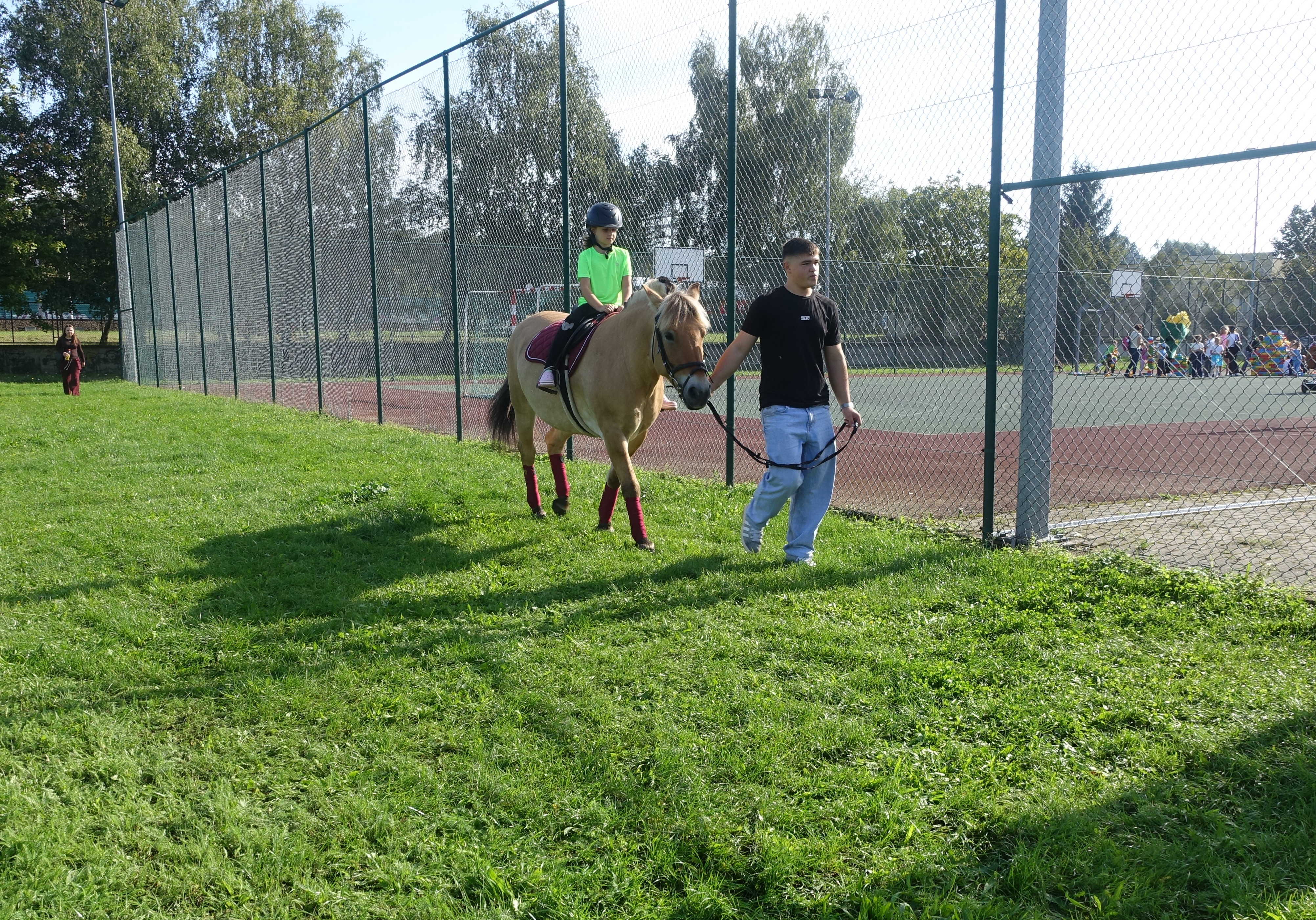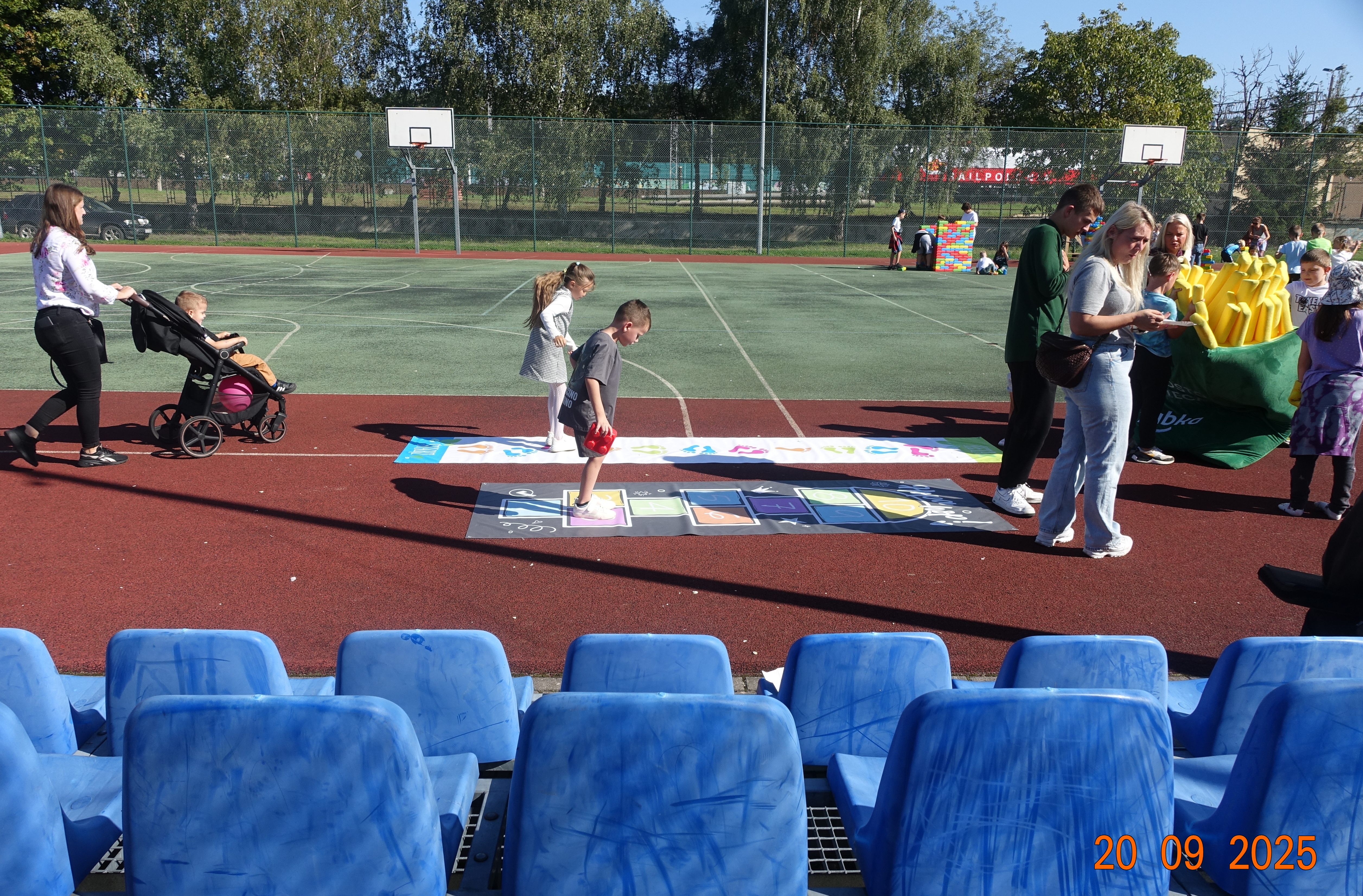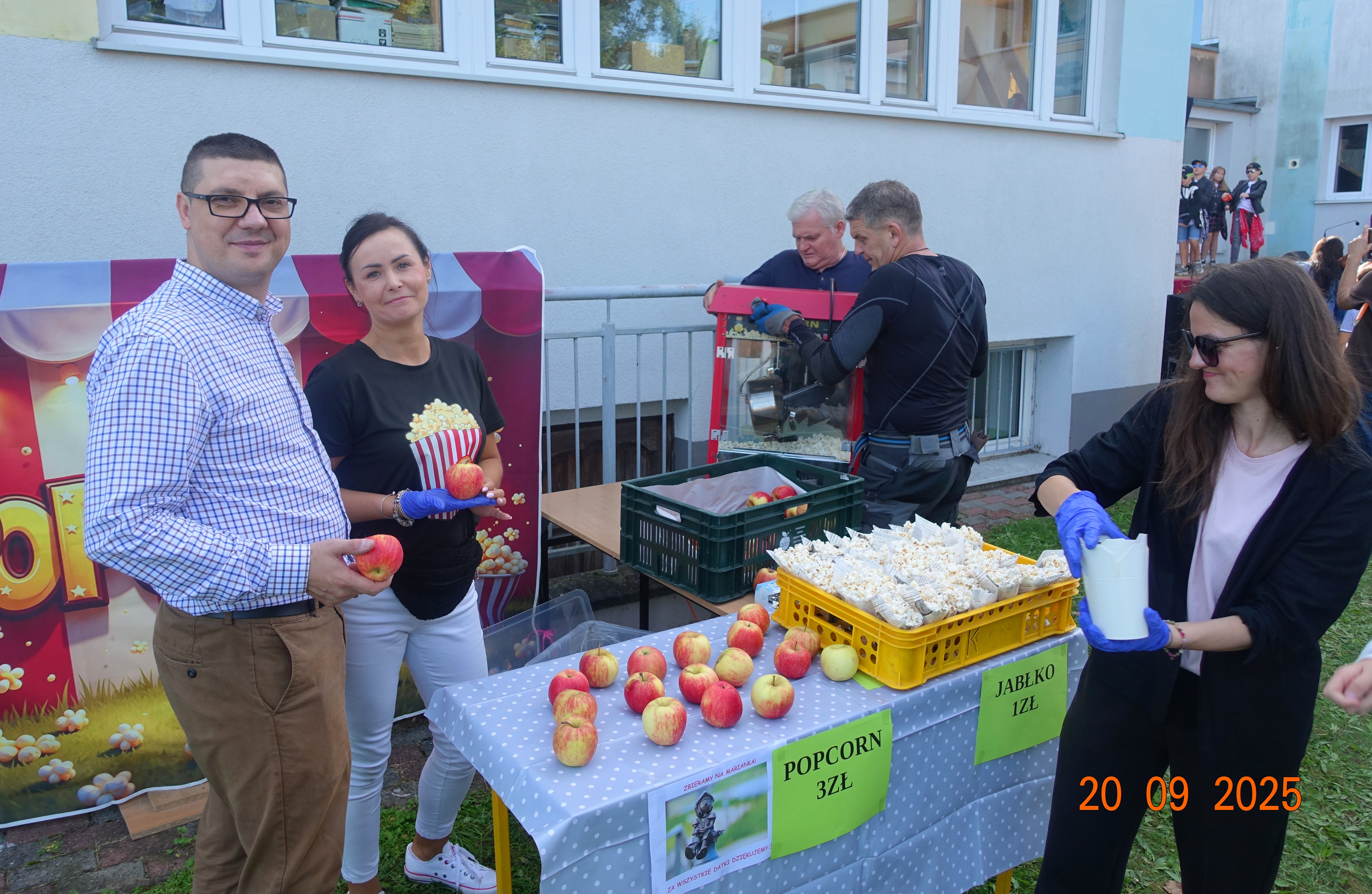 W między czasie rozpoczęły się towarzyskie spotkania na korytarzach i ,,przy dębie’’. Dla zgłodniałych na pikniku czekały różnorodne stoiska, począwszy od kiełbaski z grilla, gofrów, popcornu, lodów, a skończywszy na pajdzie ze smalczykiem. Dla smakoszy słodkości – były do wyboru przepyszne domowe ciasta i inne wypieki. Nie zabrakło i malborskich służb mundurowych /policji oraz straży pożarnej/, za kilka złociszy chętni mogli dosiąść wierzchowca albo poturlać się na ,,dmuchańcach’’ czy pobawić się na boisku wielkimi, kolorowymi klockami. Do kolejnych atrakcji należała na pewno fotobudka i możliwość zaplatania warkoczyków. Chętni mogli wpisać się do Księgi pamiątkowej. Festyn był też okazją, by wesprzeć zbiórkę na figurkę ,,dziewiątkowego’’ Marianka. A loteria szkolna temu sprzyjała.
