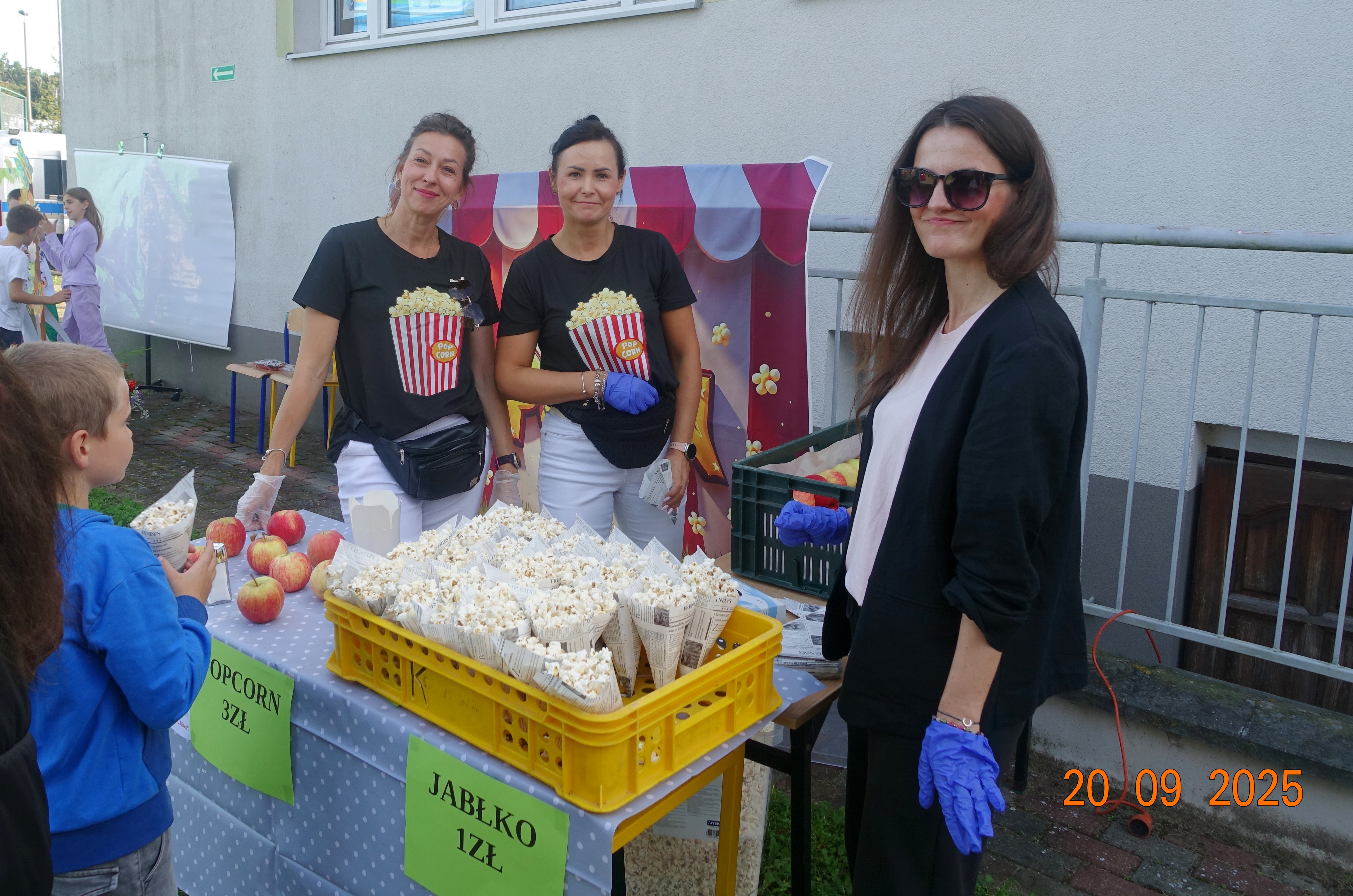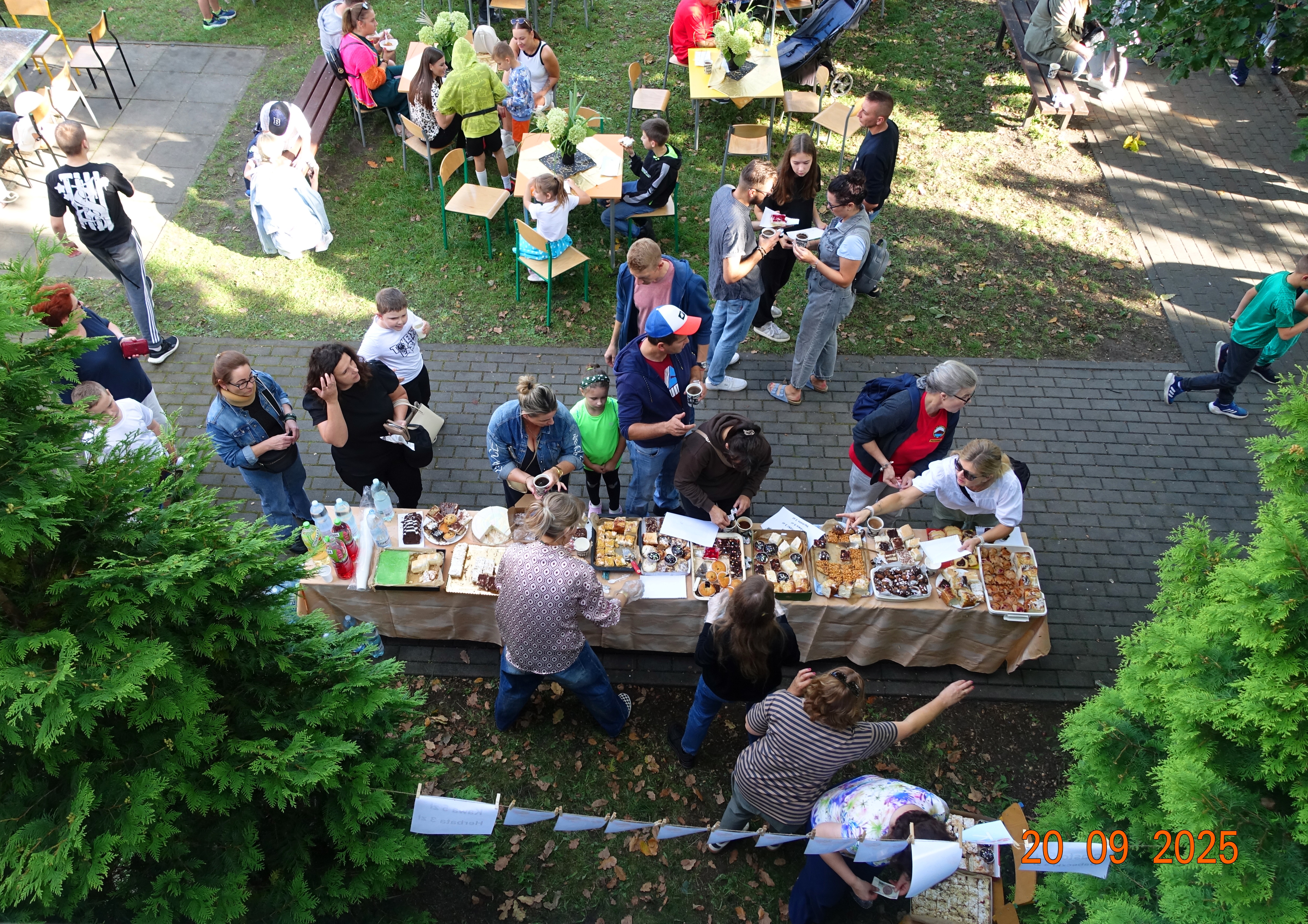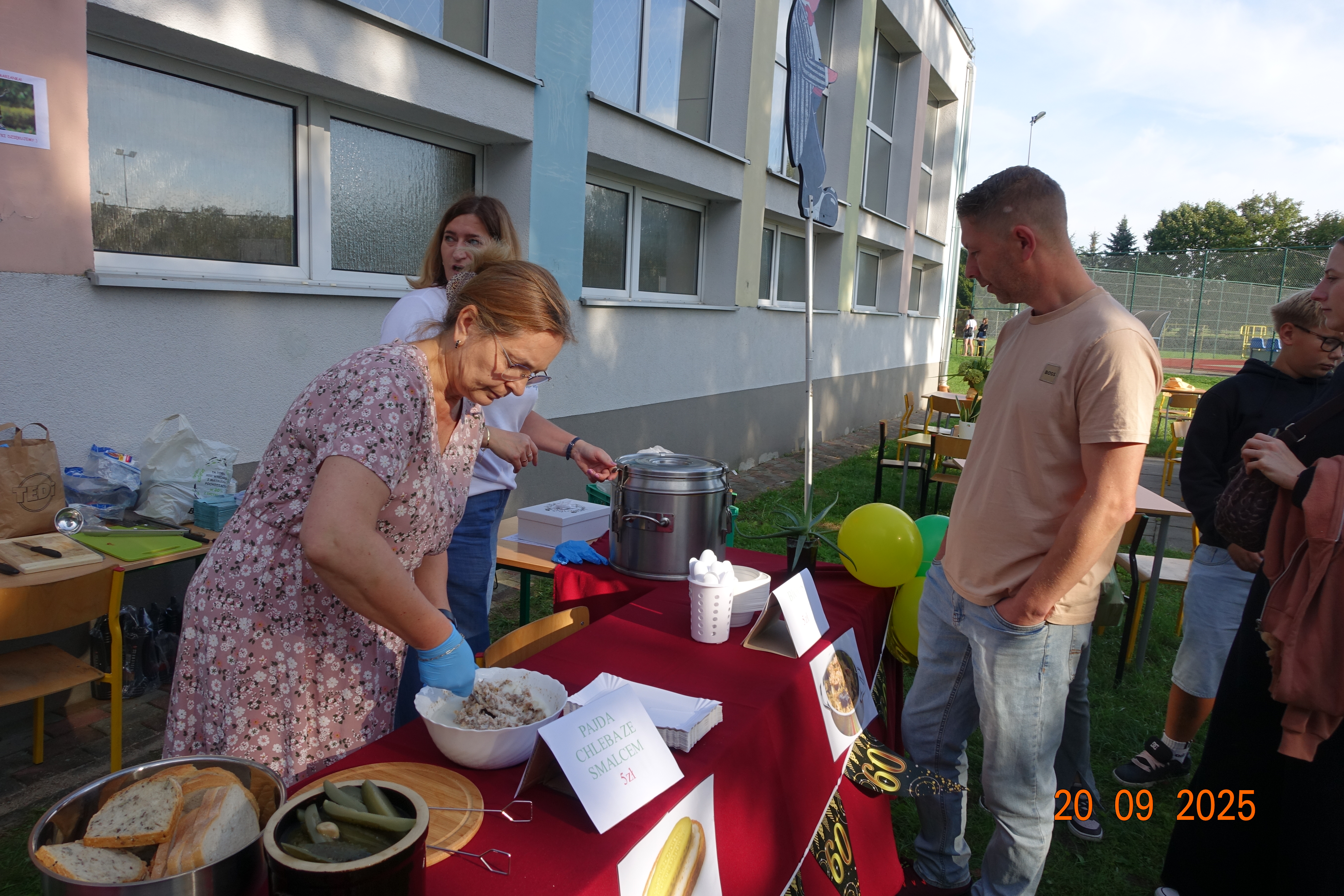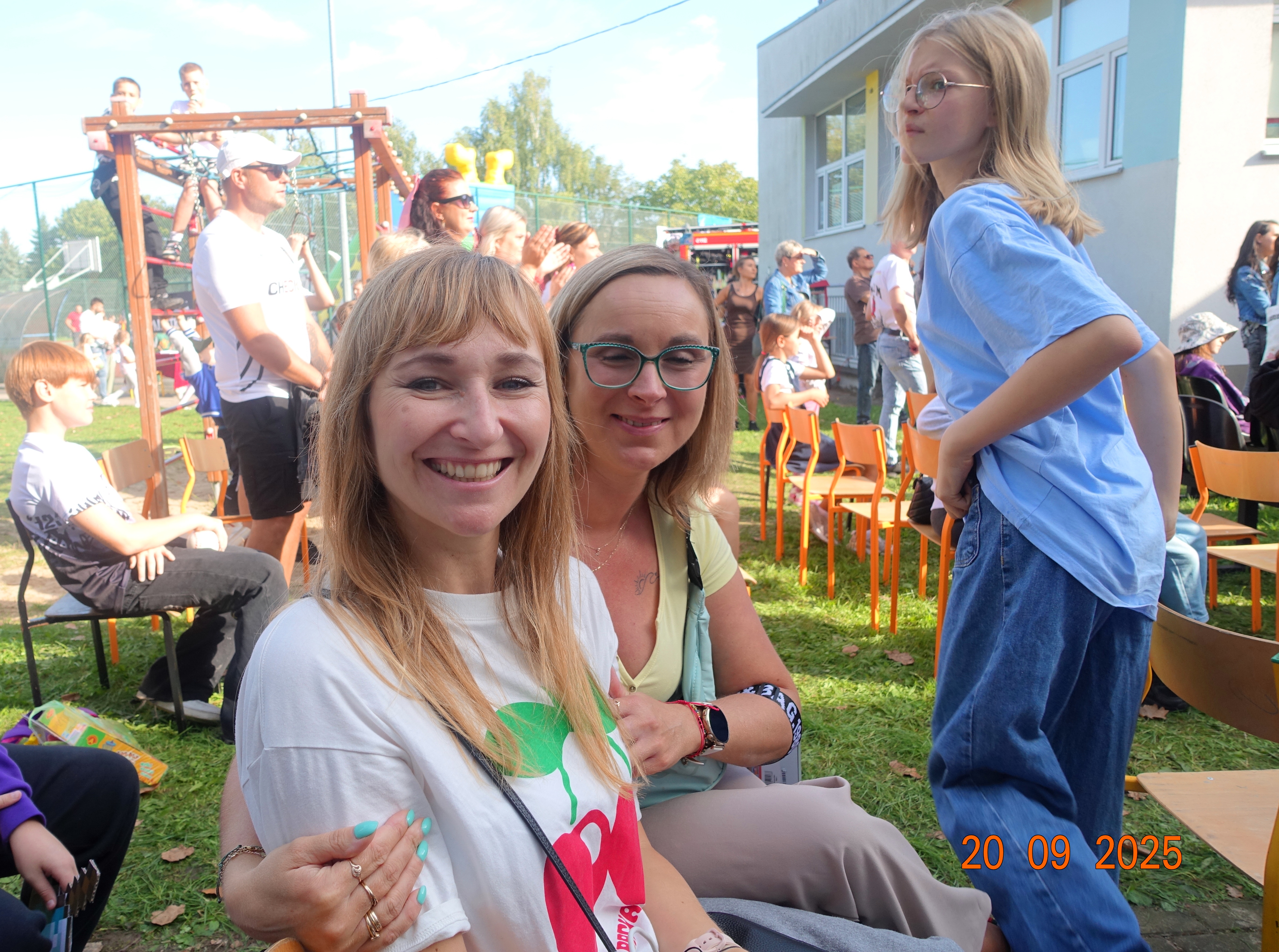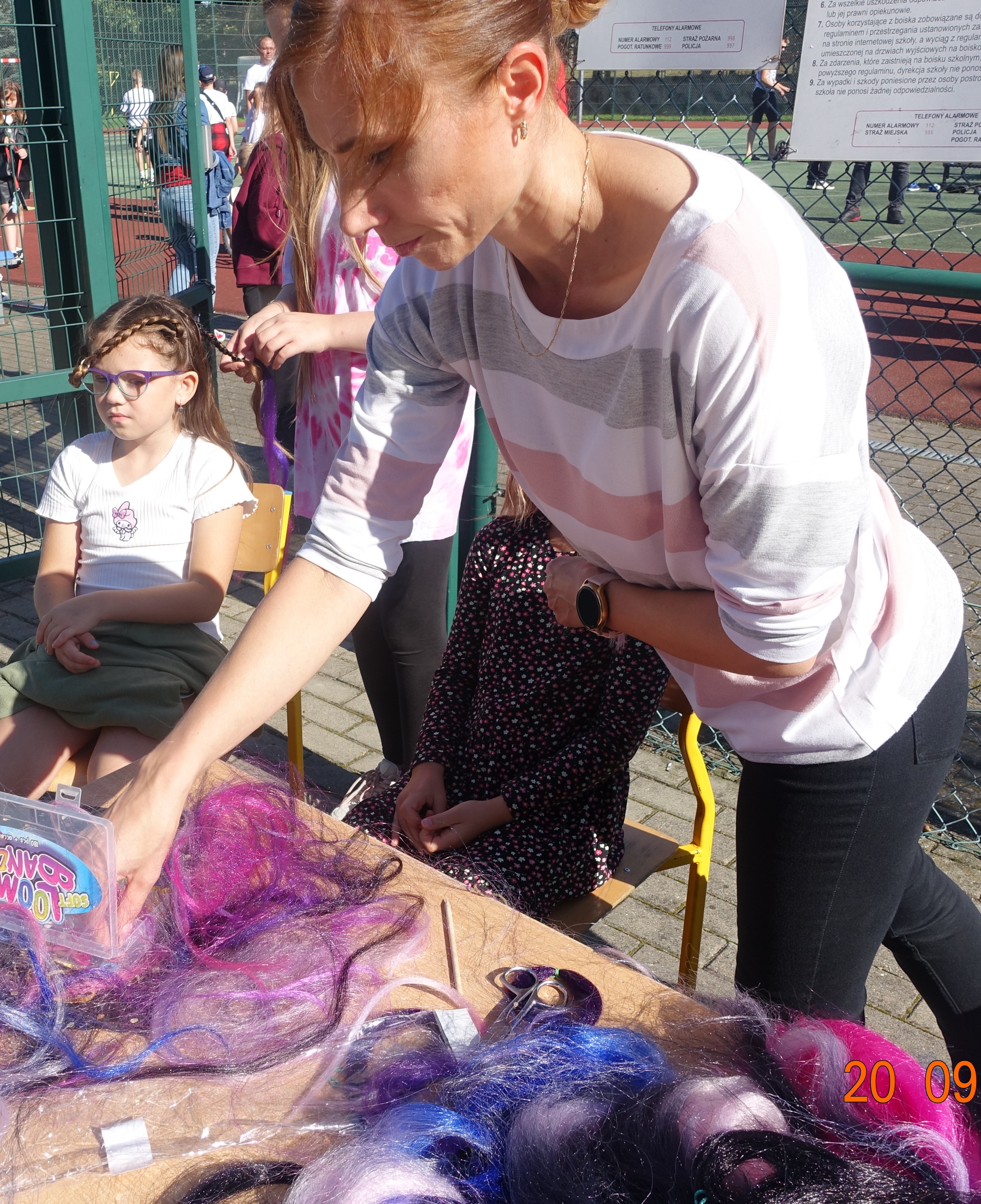 W między czasie rozpoczęły się towarzyskie spotkania na korytarzach i ,,przy dębie’’. Dla zgłodniałych na pikniku czekały różnorodne stoiska, począwszy od kiełbaski z grilla, gofrów, popcornu, lodów, a skończywszy na pajdzie ze smalczykiem. Dla smakoszy słodkości – były do wyboru przepyszne domowe ciasta i inne wypieki. Nie zabrakło i malborskich służb mundurowych /policji oraz straży pożarnej/, za kilka złociszy chętni mogli dosiąść wierzchowca albo poturlać się na ,,dmuchańcach’’ czy pobawić się na boisku wielkimi, kolorowymi klockami. Do kolejnych atrakcji należała na pewno fotobudka i możliwość zaplatania warkoczyków. Chętni mogli wpisać się do Księgi pamiątkowej. Festyn był też okazją, by wesprzeć zbiórkę na figurkę ,,dziewiątkowego’’ Marianka. A loteria szkolna temu sprzyjała.
