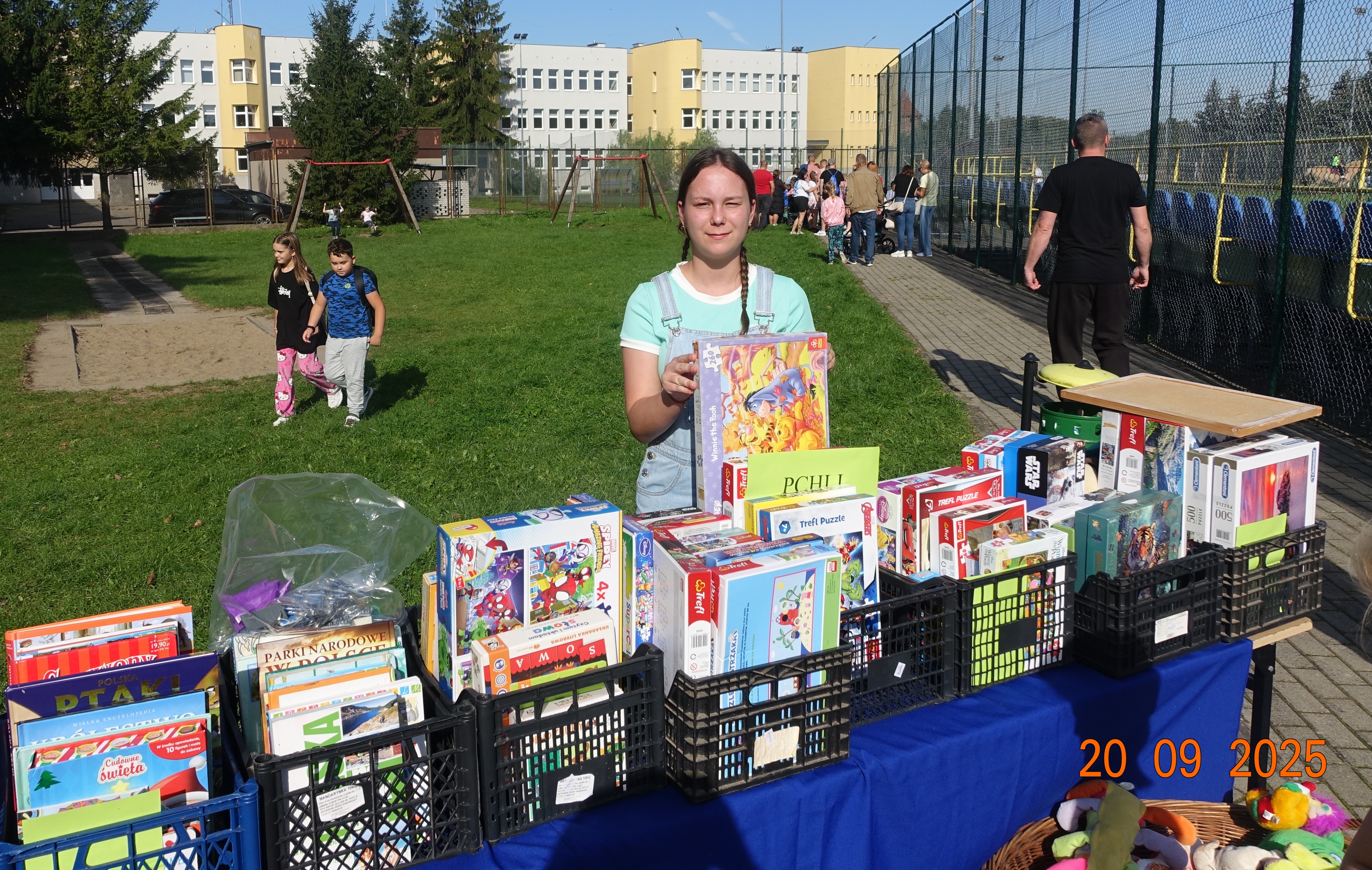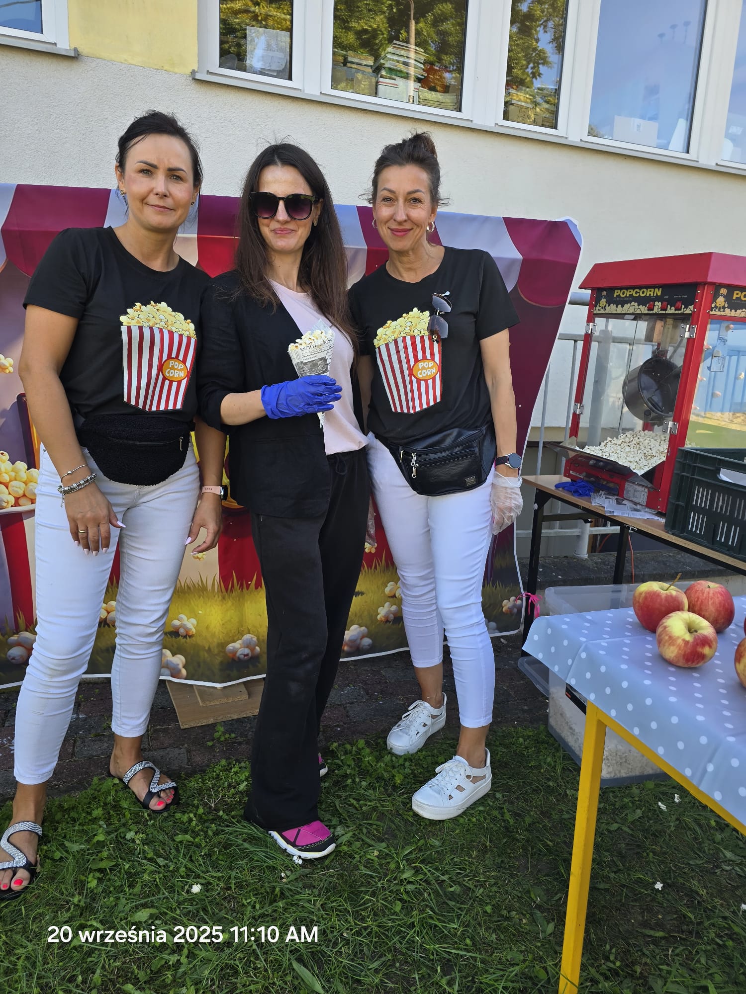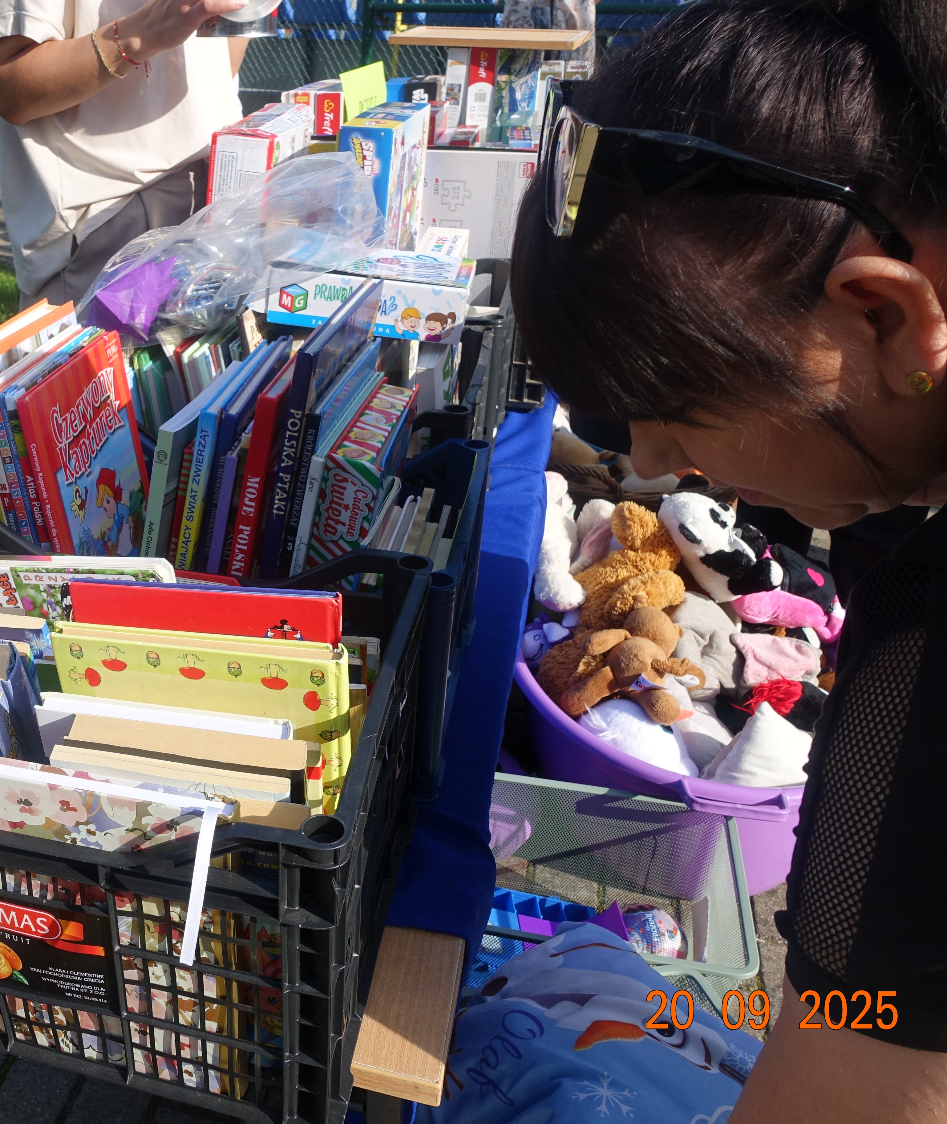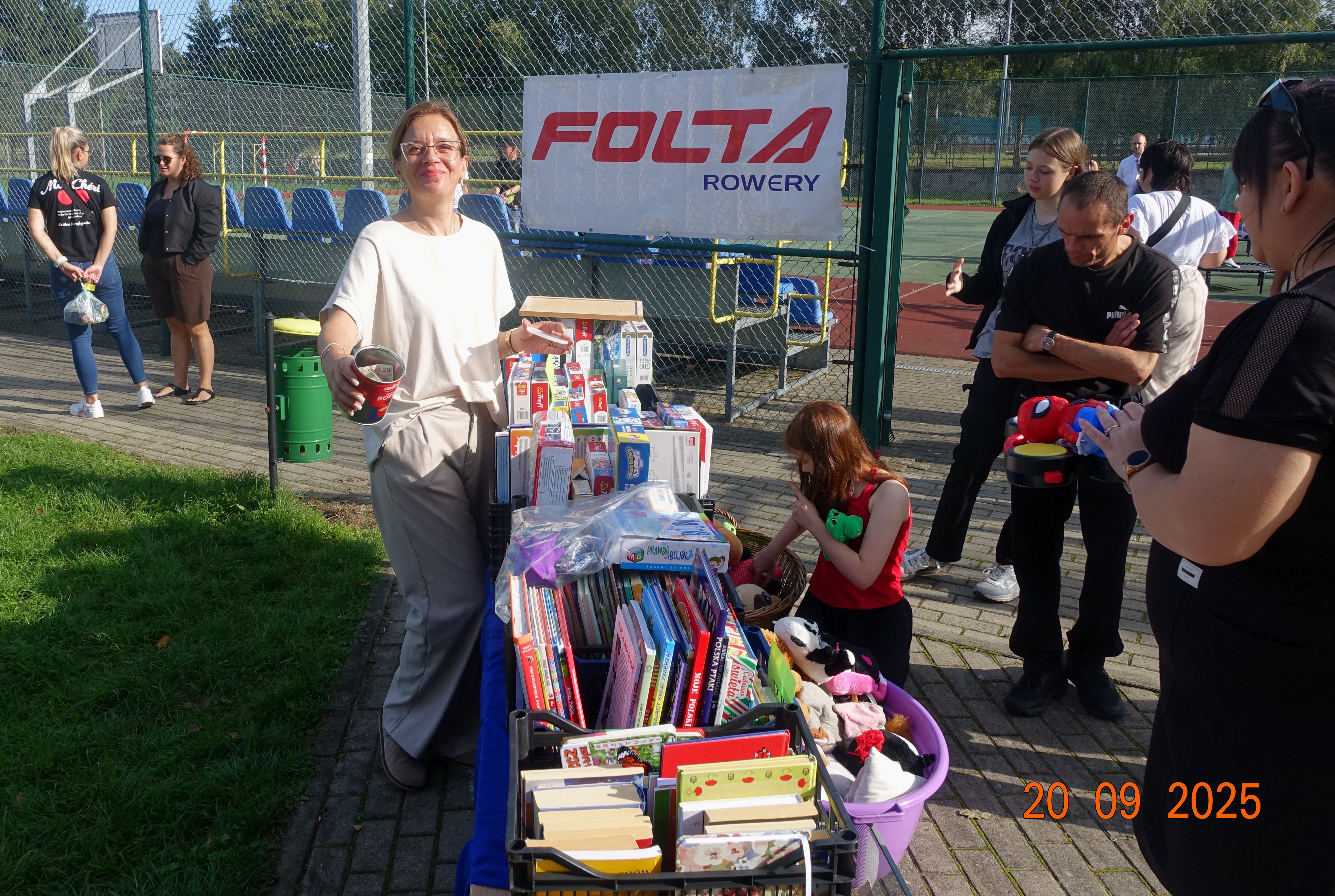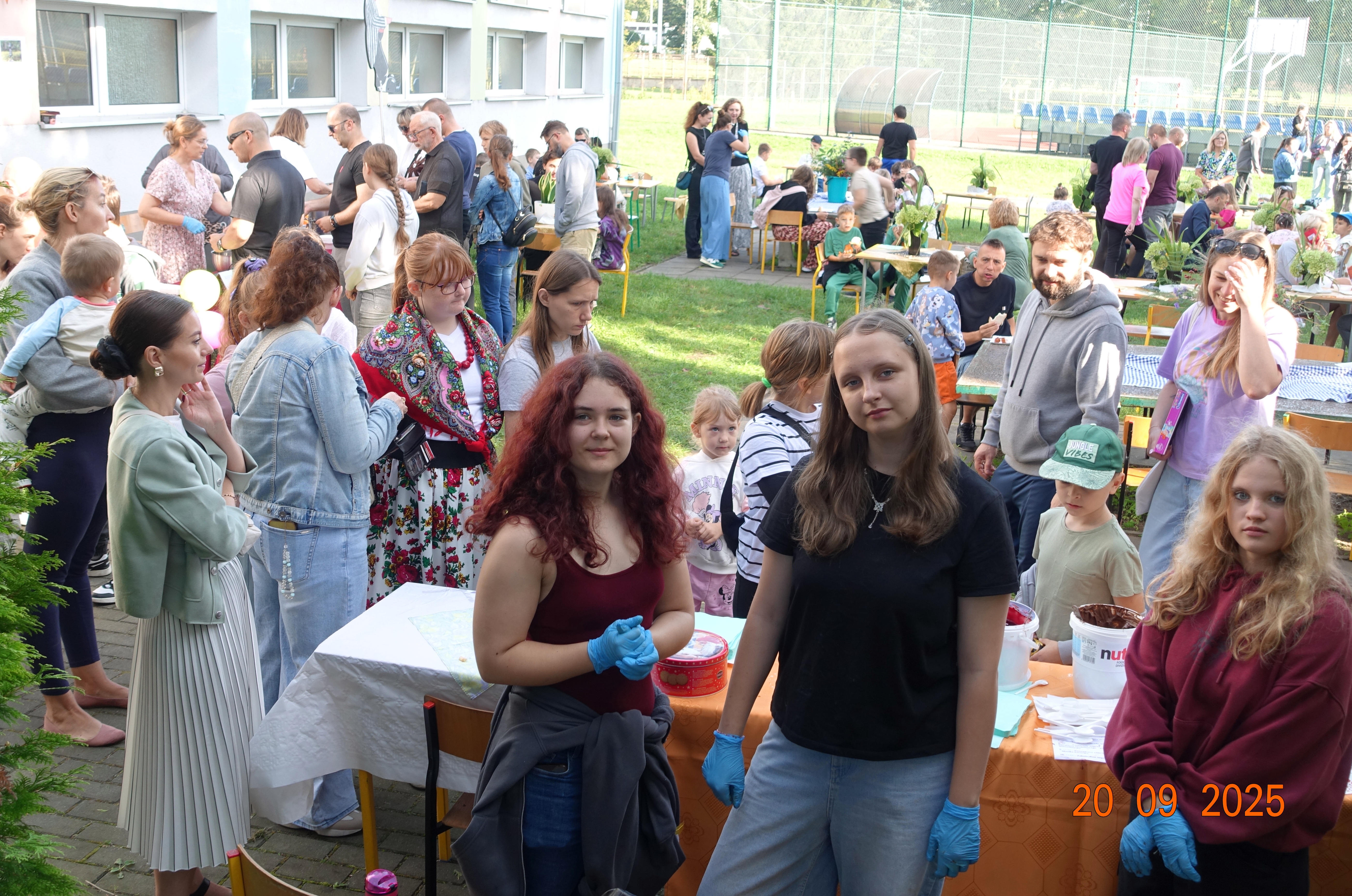 W między czasie rozpoczęły się towarzyskie spotkania na korytarzach i ,,przy dębie’’. Dla zgłodniałych na pikniku czekały różnorodne stoiska, począwszy od kiełbaski z grilla, gofrów, popcornu, lodów, a skończywszy na pajdzie ze smalczykiem. Dla smakoszy słodkości – były do wyboru przepyszne domowe ciasta i inne wypieki. Nie zabrakło i malborskich służb mundurowych /policji oraz straży pożarnej/, za kilka złociszy chętni mogli dosiąść wierzchowca albo poturlać się na ,,dmuchańcach’’ czy pobawić się na boisku wielkimi, kolorowymi klockami. Do kolejnych atrakcji należała na pewno fotobudka i możliwość zaplatania warkoczyków. Chętni mogli wpisać się do Księgi pamiątkowej. Festyn był też okazją, by wesprzeć zbiórkę na figurkę ,,dziewiątkowego’’ Marianka. A loteria szkolna temu sprzyjała.