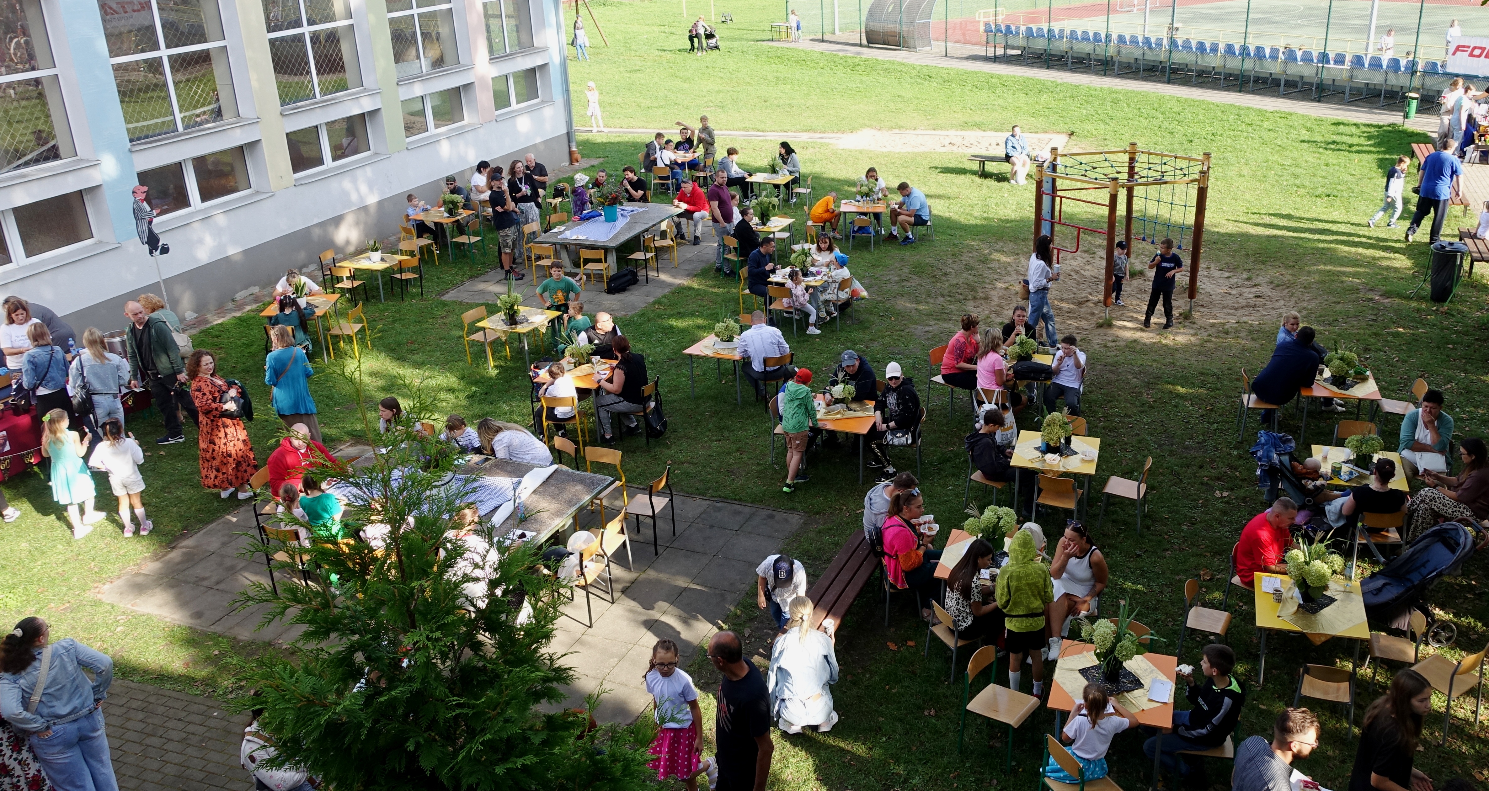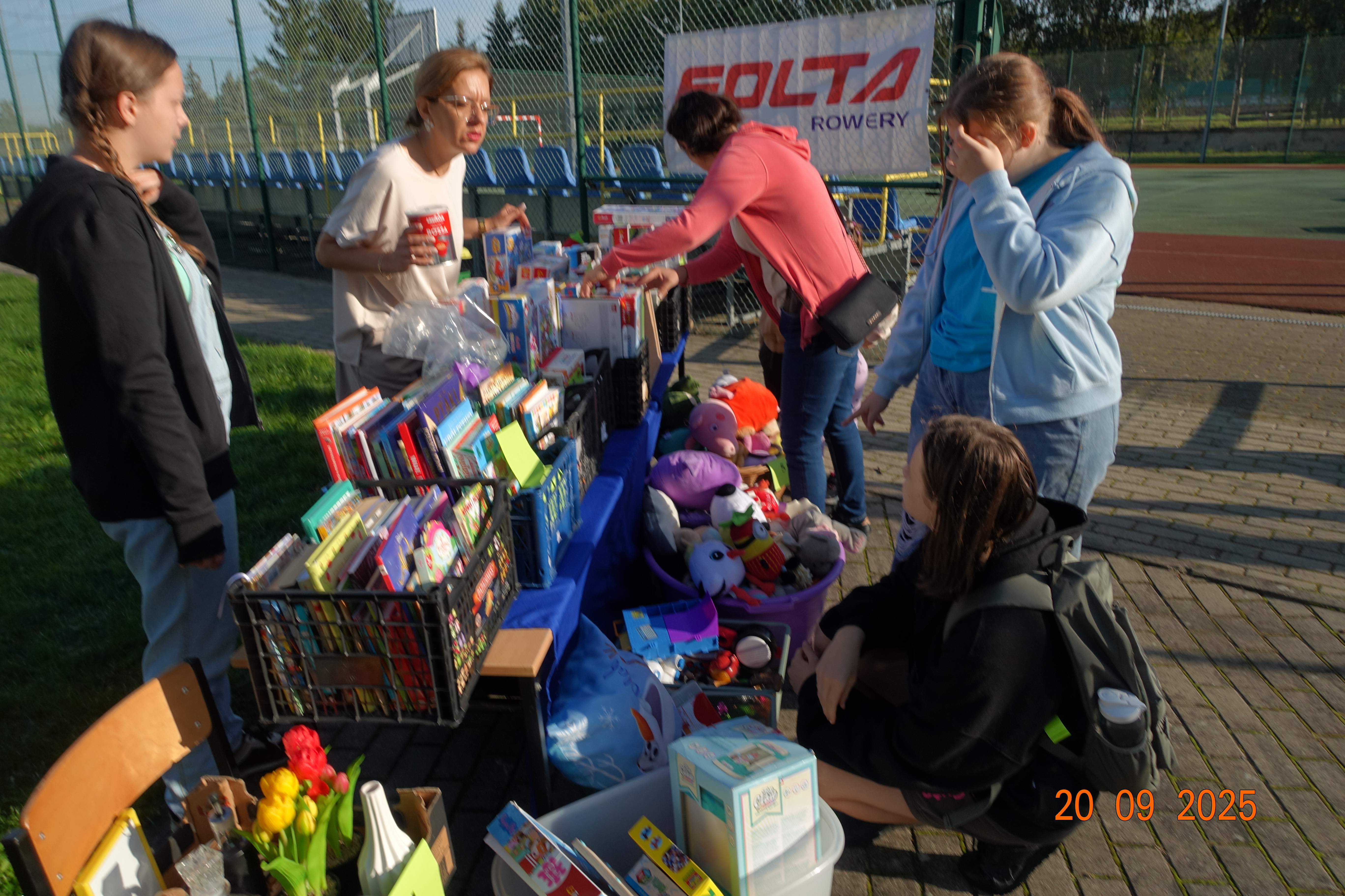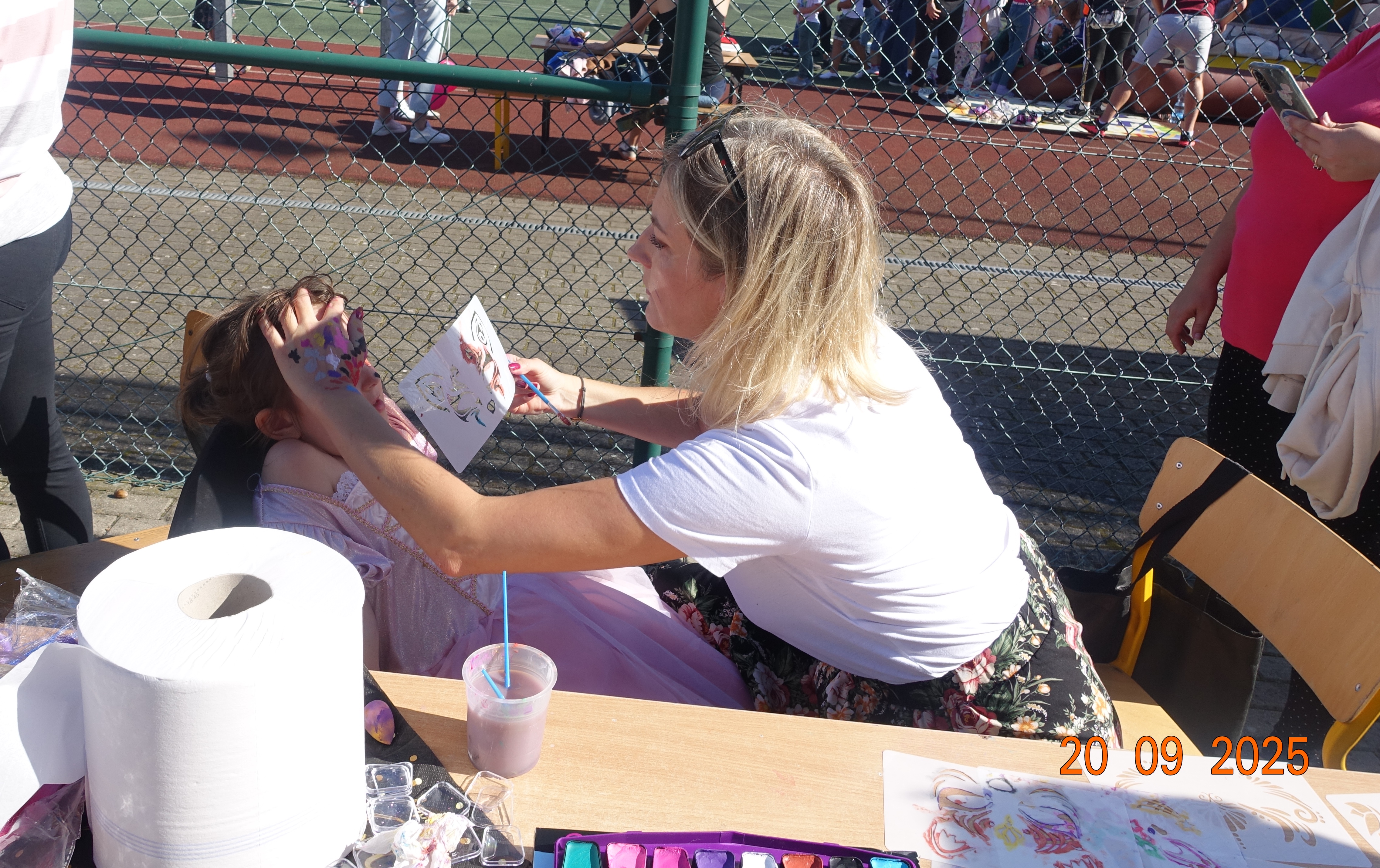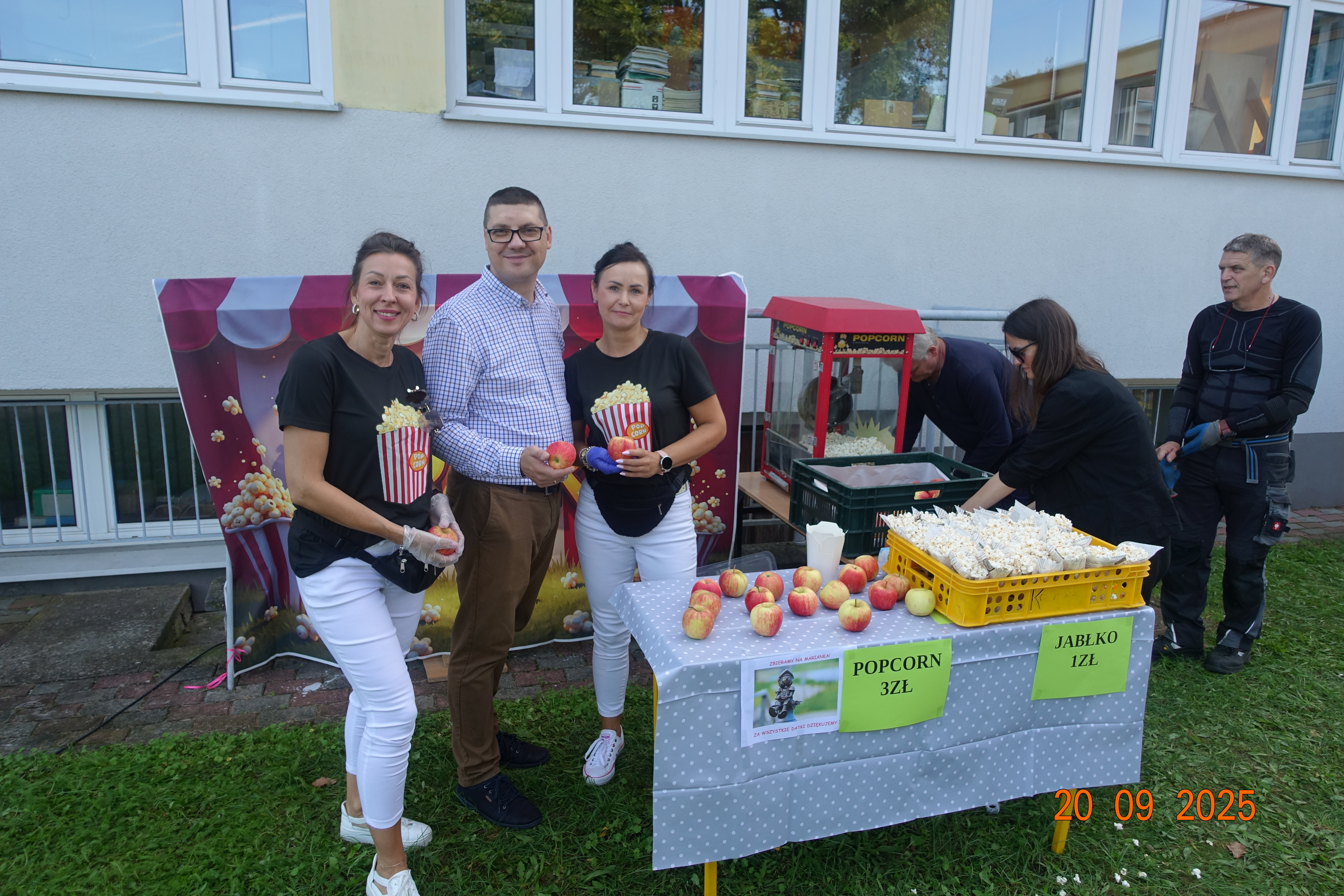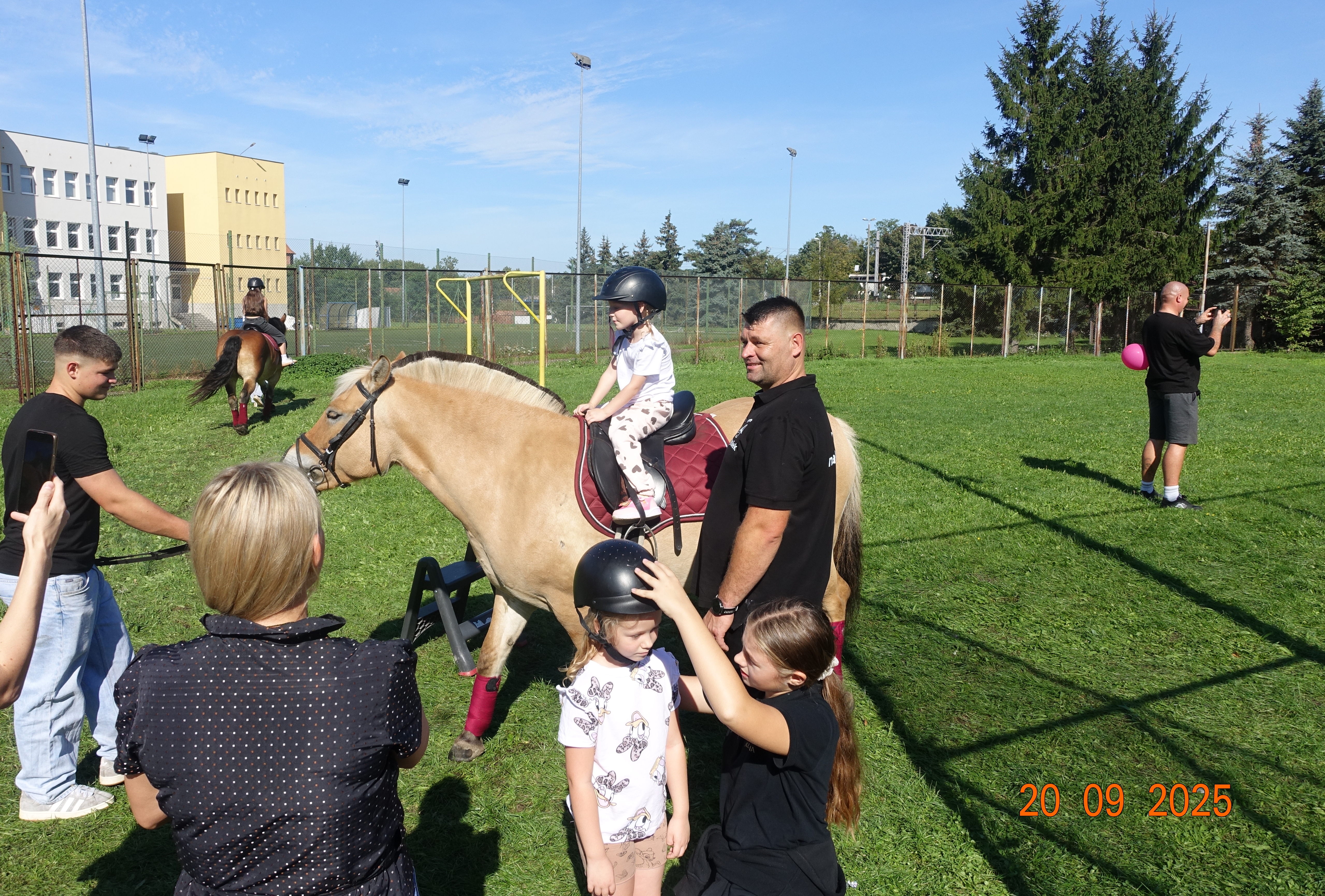 W między czasie rozpoczęły się towarzyskie spotkania na korytarzach i ,,przy dębie’’. Dla zgłodniałych na pikniku czekały różnorodne stoiska, począwszy od kiełbaski z grilla, gofrów, popcornu, lodów, a skończywszy na pajdzie ze smalczykiem. Dla smakoszy słodkości – były do wyboru przepyszne domowe ciasta i inne wypieki. Nie zabrakło i malborskich służb mundurowych /policji oraz straży pożarnej/, za kilka złociszy chętni mogli dosiąść wierzchowca albo poturlać się na ,,dmuchańcach’’ czy pobawić się na boisku wielkimi, kolorowymi klockami. Do kolejnych atrakcji należała na pewno fotobudka i możliwość zaplatania warkoczyków. Chętni mogli wpisać się do Księgi pamiątkowej. Festyn był też okazją, by wesprzeć zbiórkę na figurkę ,,dziewiątkowego’’ Marianka. A loteria szkolna temu sprzyjała.