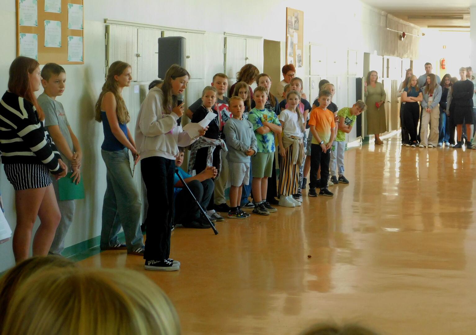 Dzisiaj na korytarzu górnym odbył się apel porządkowy. Podczas apelu pani wicedyrektor - Bożena Wereszczyńska, zwróciła uczniom uwagę na hałas i niewłaściwe zachowanie się uczniów na przerwach międzylekcyjnych, a także o szkolnym novum, zbliżający się czas bez dzwonków /27 września/.