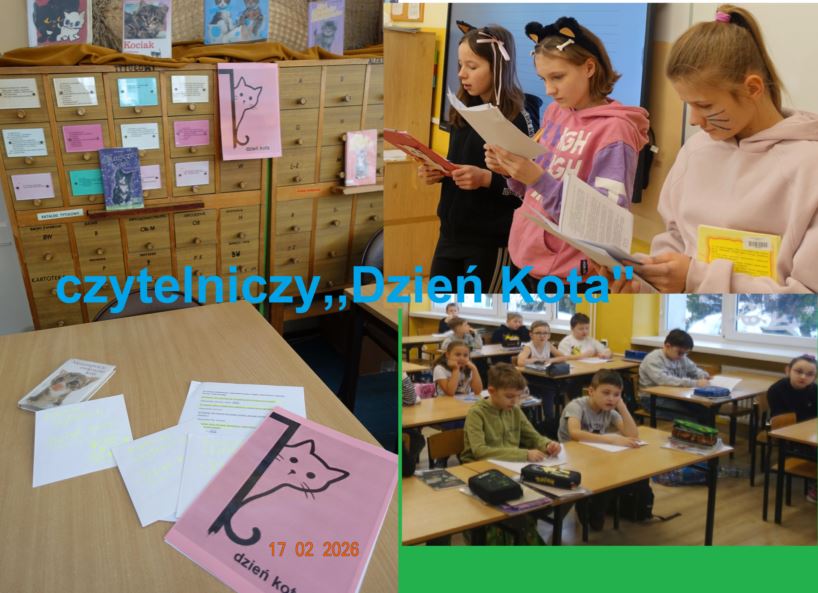 W Polsce Światowy Dzień Kota obchodzimy 17 lutego. To święto ma na celu podkreślenie znaczenia kotków w życiu człowieka. W szkolnej bibliotece odbył się wyjątkowy konkurs czytelniczy z okazji,, Dnia Kota’’, który przyciągnął szkolnych miłośników tych czworonogów. Centralnym punktem wydarzenia było wspólne czytanie zabawnych i pouczających "Kocich historii", w które dzieci w klasach II i III wsłuchiwały się z ogromnym przejęciem i skupieniem. Lektury najmłodszym czytały – Zuzia Wiśniewska, Julka Pyrzyńska i Amelka Wolak /6b/. Po lekturze chętni uczniowie mieli okazję wykazać się wiedzą w quizie o kotkach, odpowiadając na pytania dotyczące kocich obyczajów oraz bohaterów książki. Ostatnim zadaniem było ułożenie puzzli na czas. Atmosfera w bibliotece była pełna zaangażowania uczestników co pokazało, że połączenie czytania z zabawą to najlepszy sposób na świętowanie nietypowych okazji. Konkurs i czytanie opowiadań, przygotowany przez p. Janinę Łańko i p. Adam Liszewskiego miał na celu doskonalenie umiejętności czytania ze zrozumieniem oraz zachęcanie uczniów do kontaktu z książką.