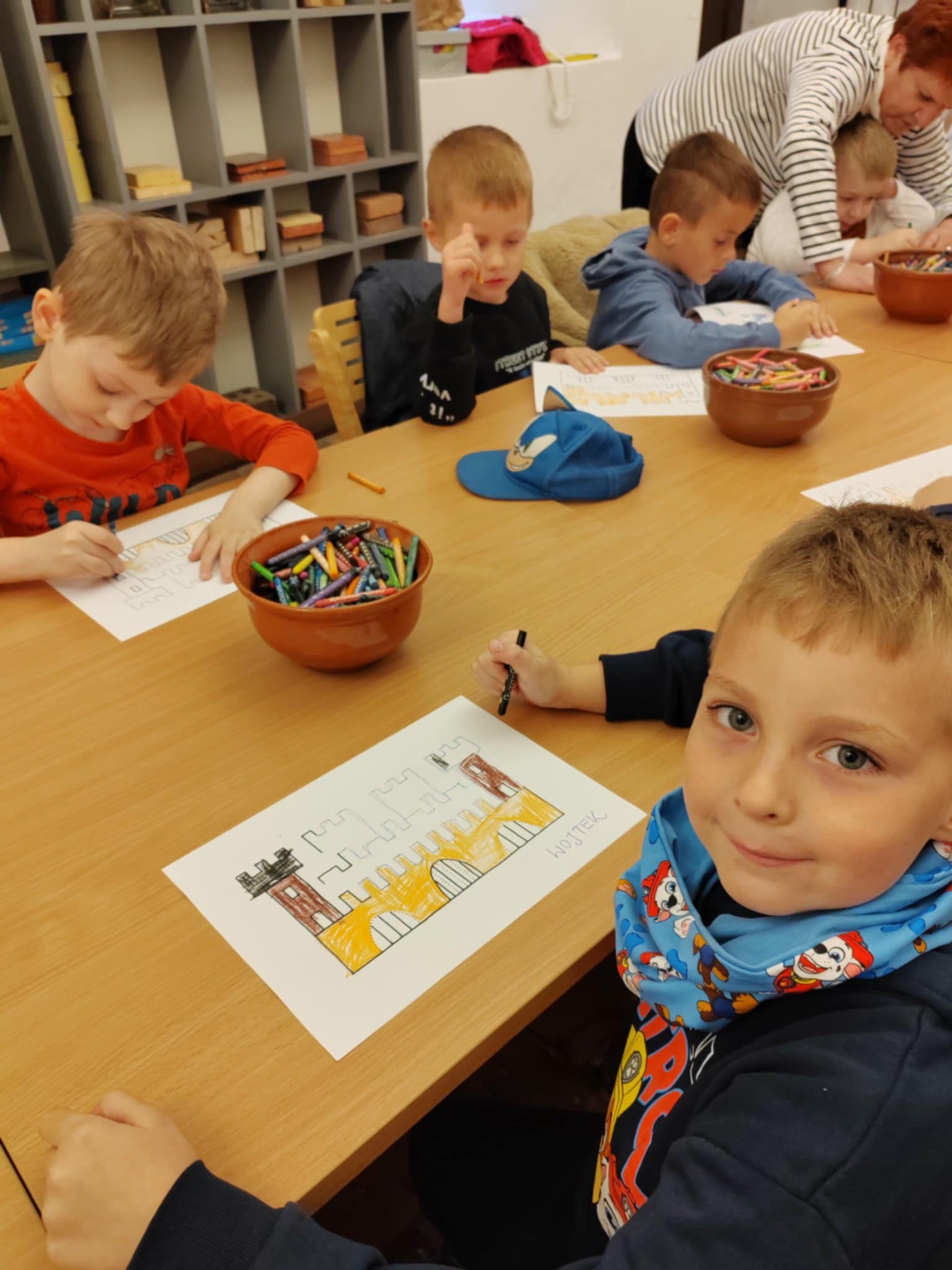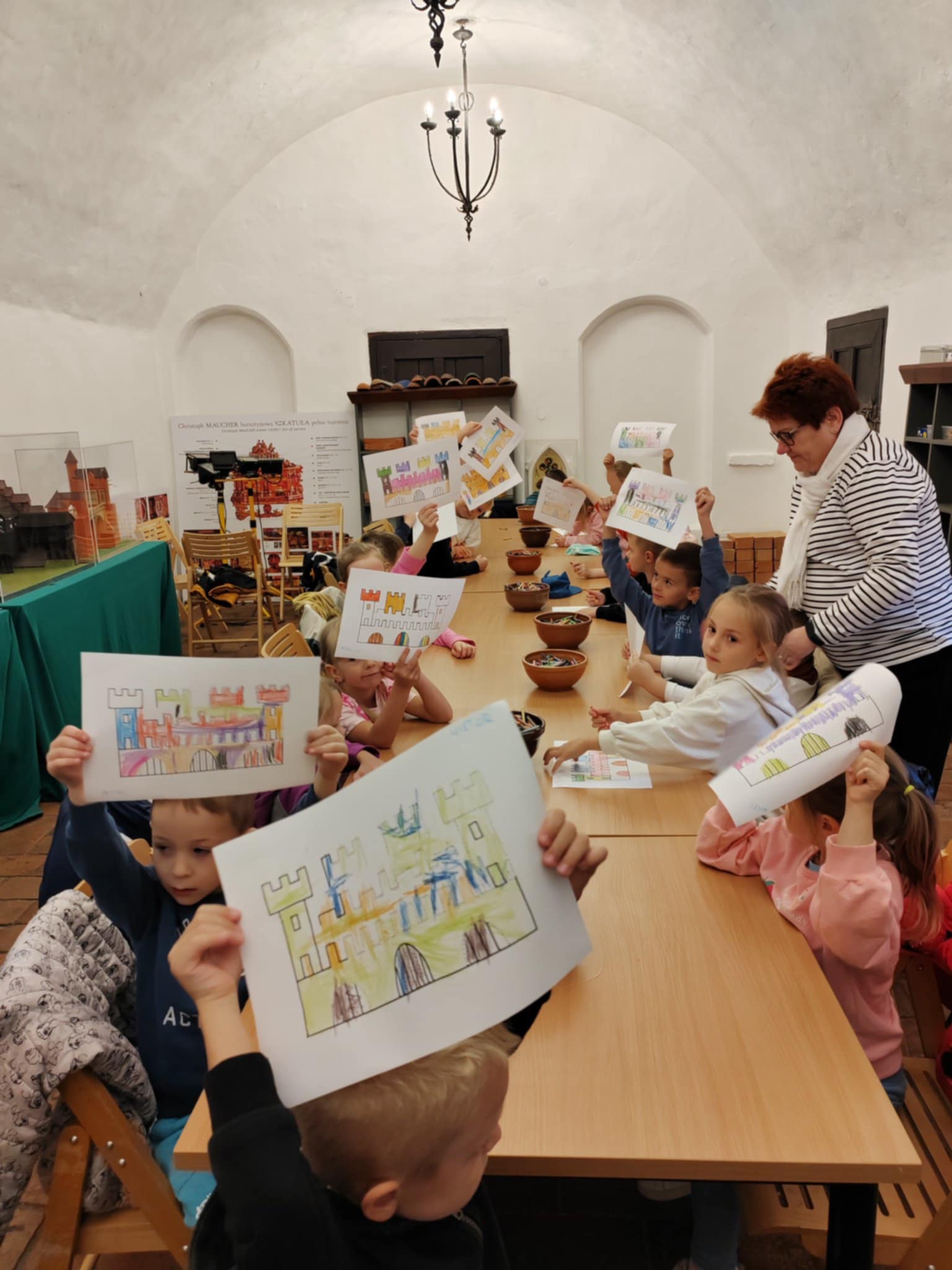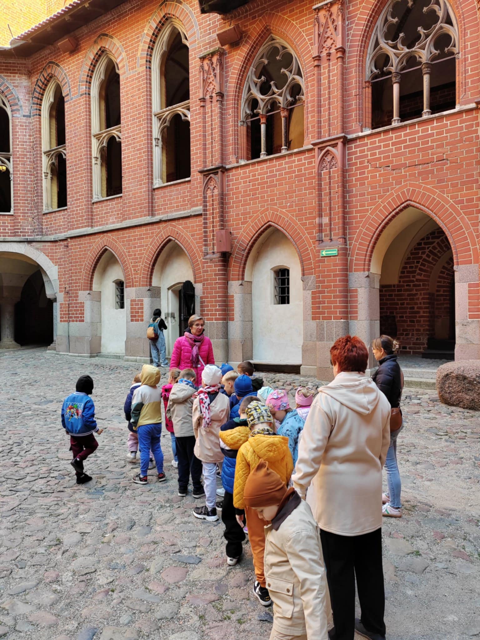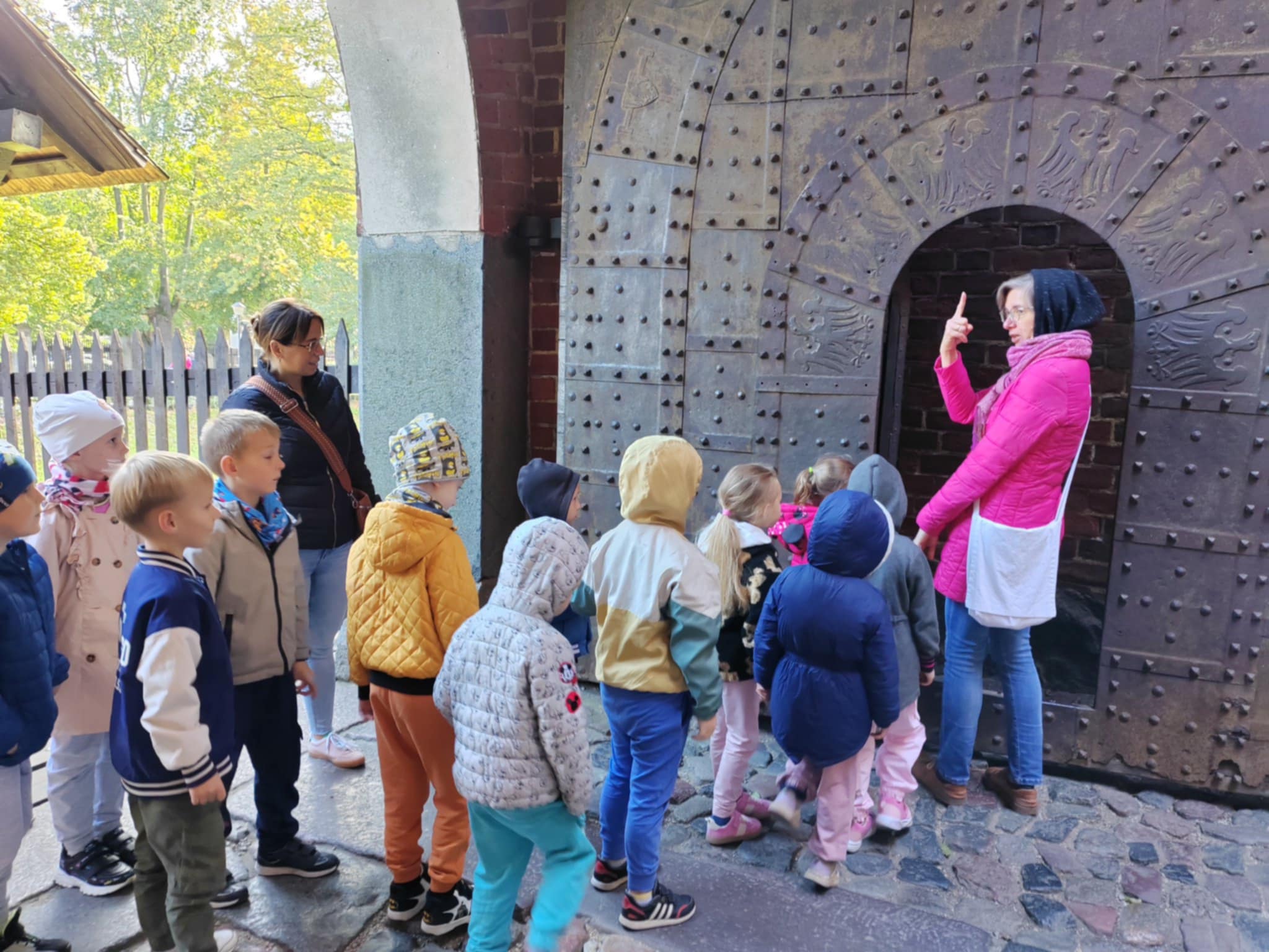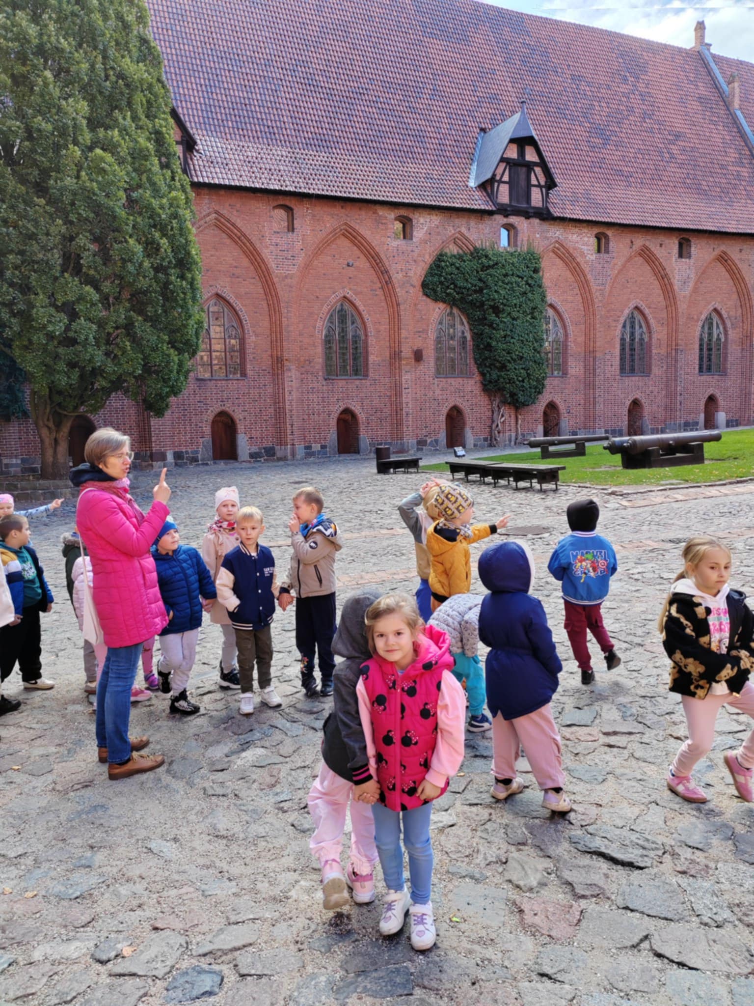 29.09.25 grupa zerowa Sówki odwiedziła zamek. Dzieci usłyszały, że zamek w całości jest zbudowany z cegły. Szukały jej w różnych częściach zamku. Podziwiały wieżę, baszty i mosty. Na zakończenie spotkania wykonały pracę plastyczną.