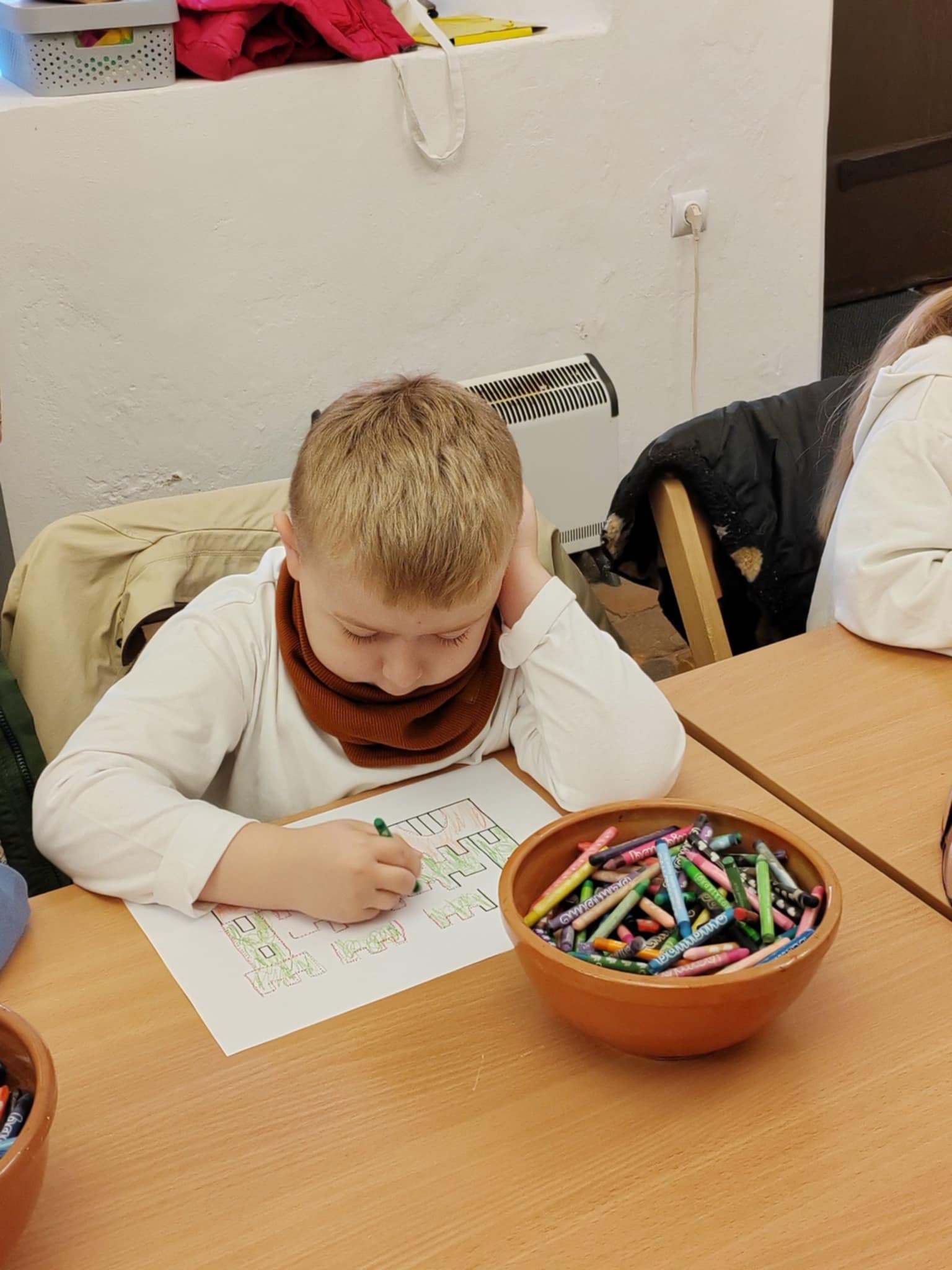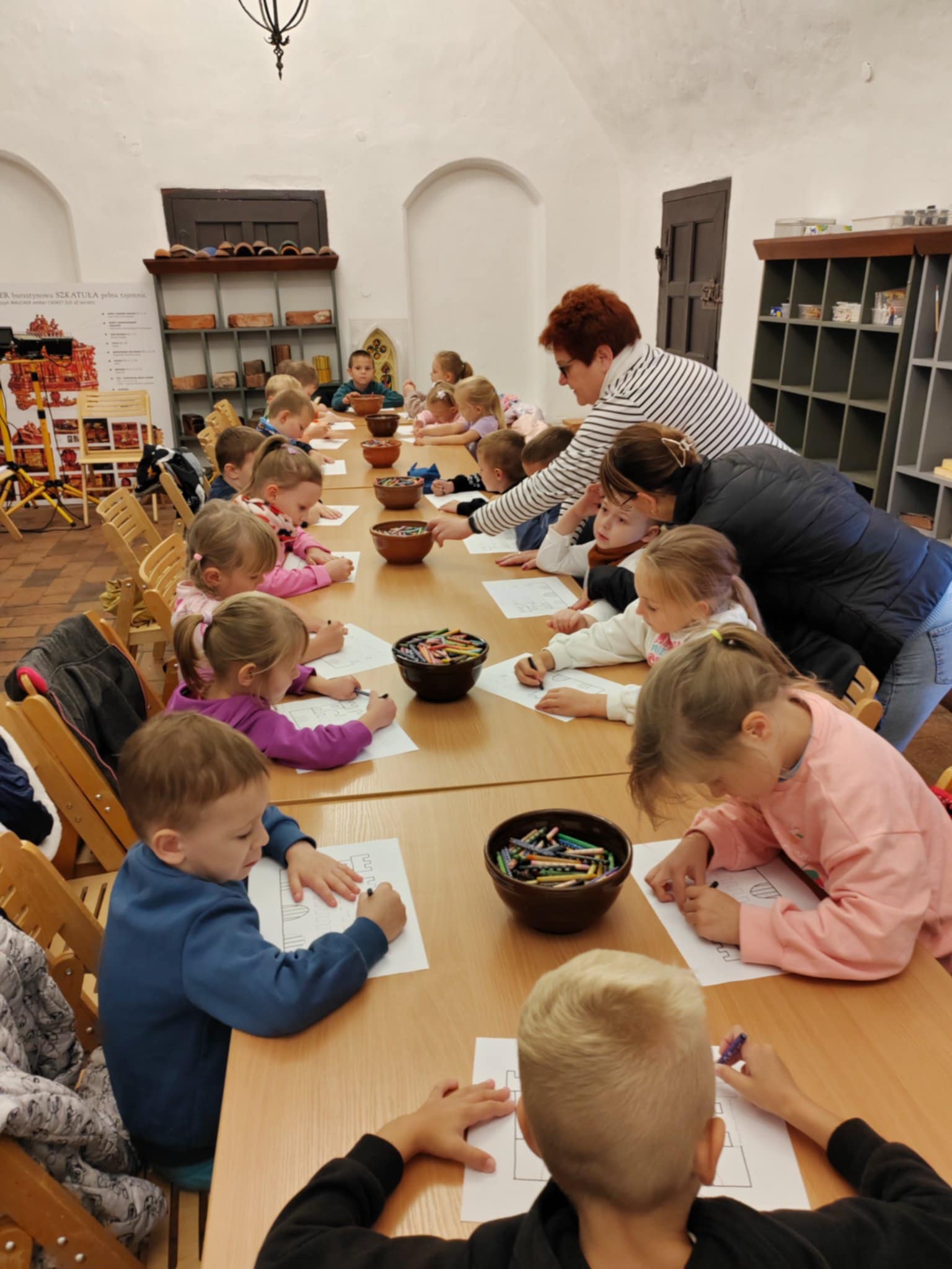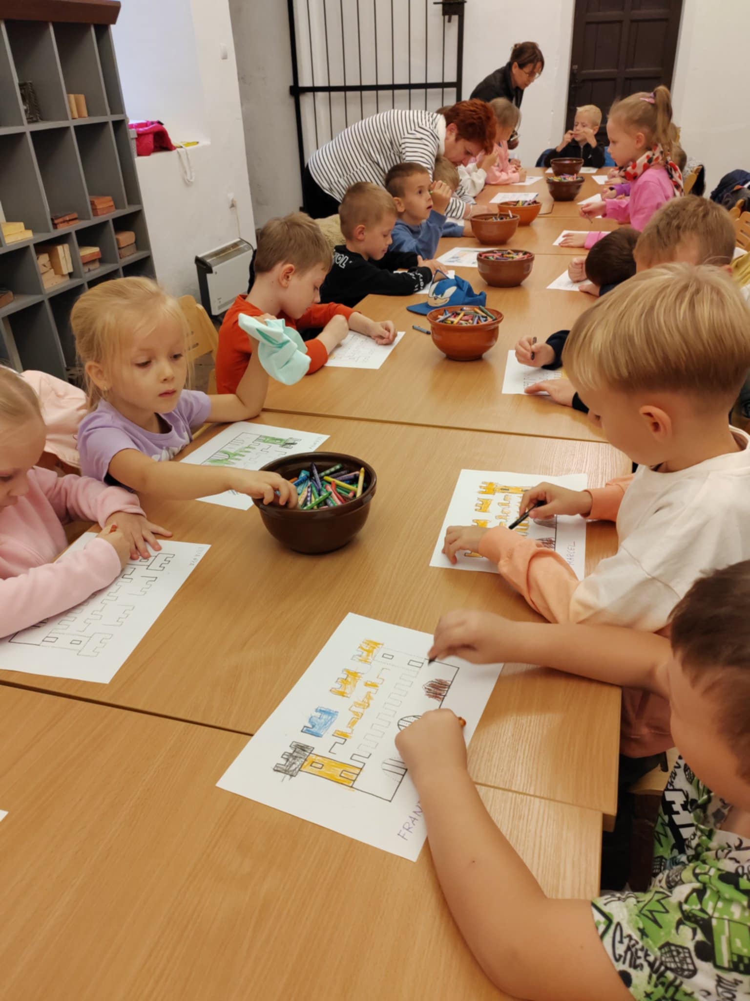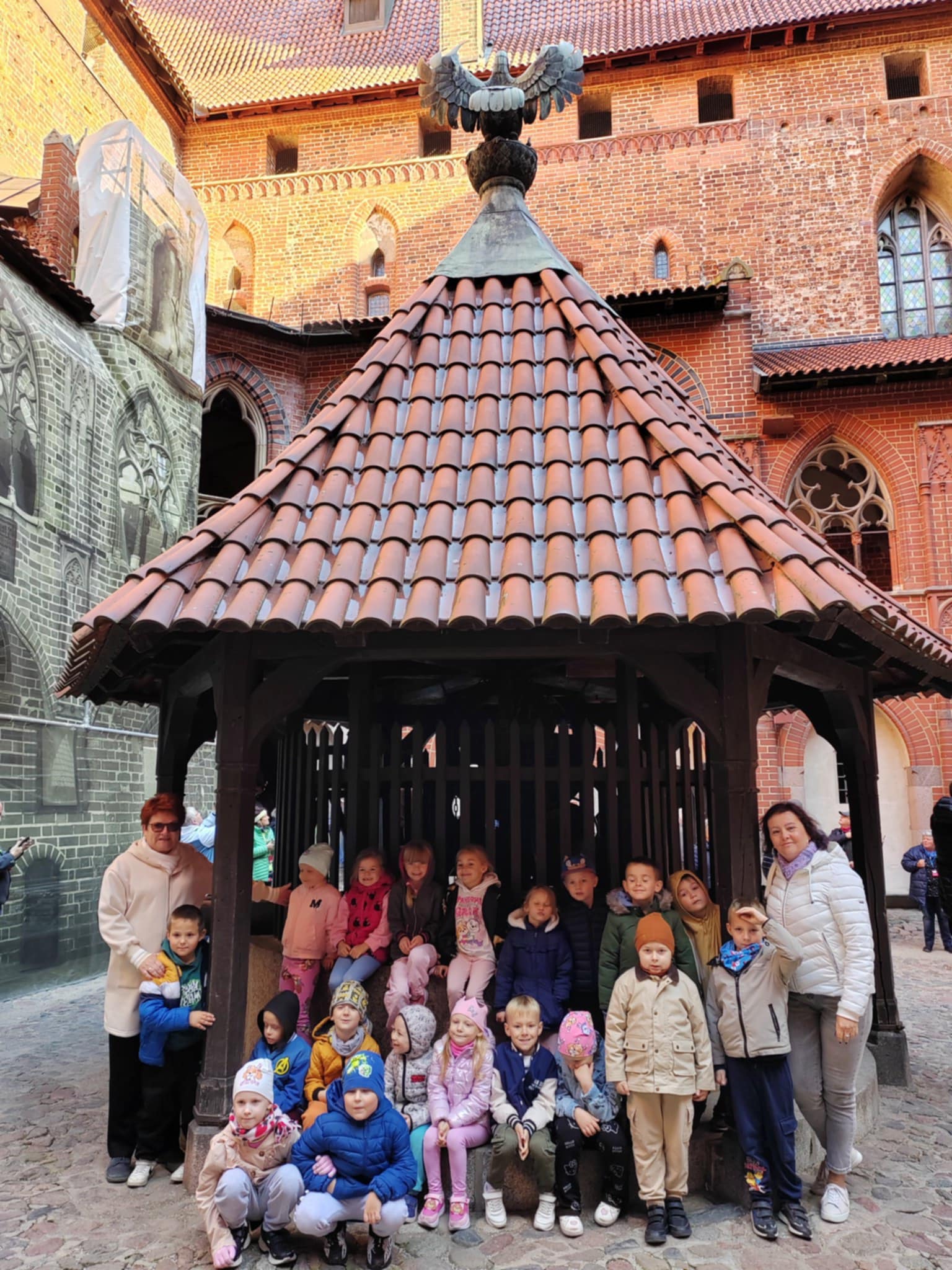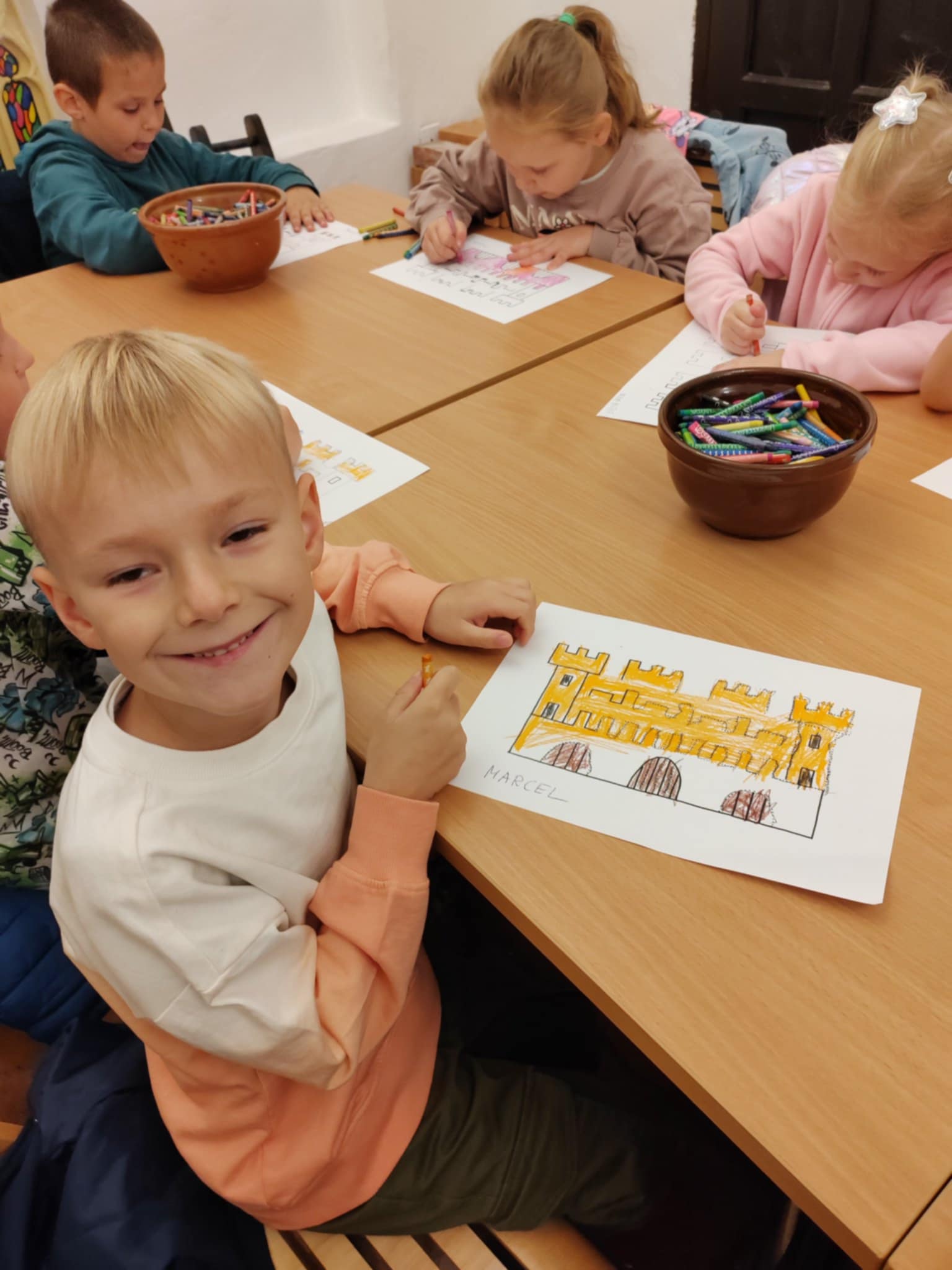 29.09.25 grupa zerowa Sówki odwiedziła zamek. Dzieci usłyszały, że zamek w całości jest zbudowany z cegły. Szukały jej w różnych częściach zamku. Podziwiały wieżę, baszty i mosty. Na zakończenie spotkania wykonały pracę plastyczną.