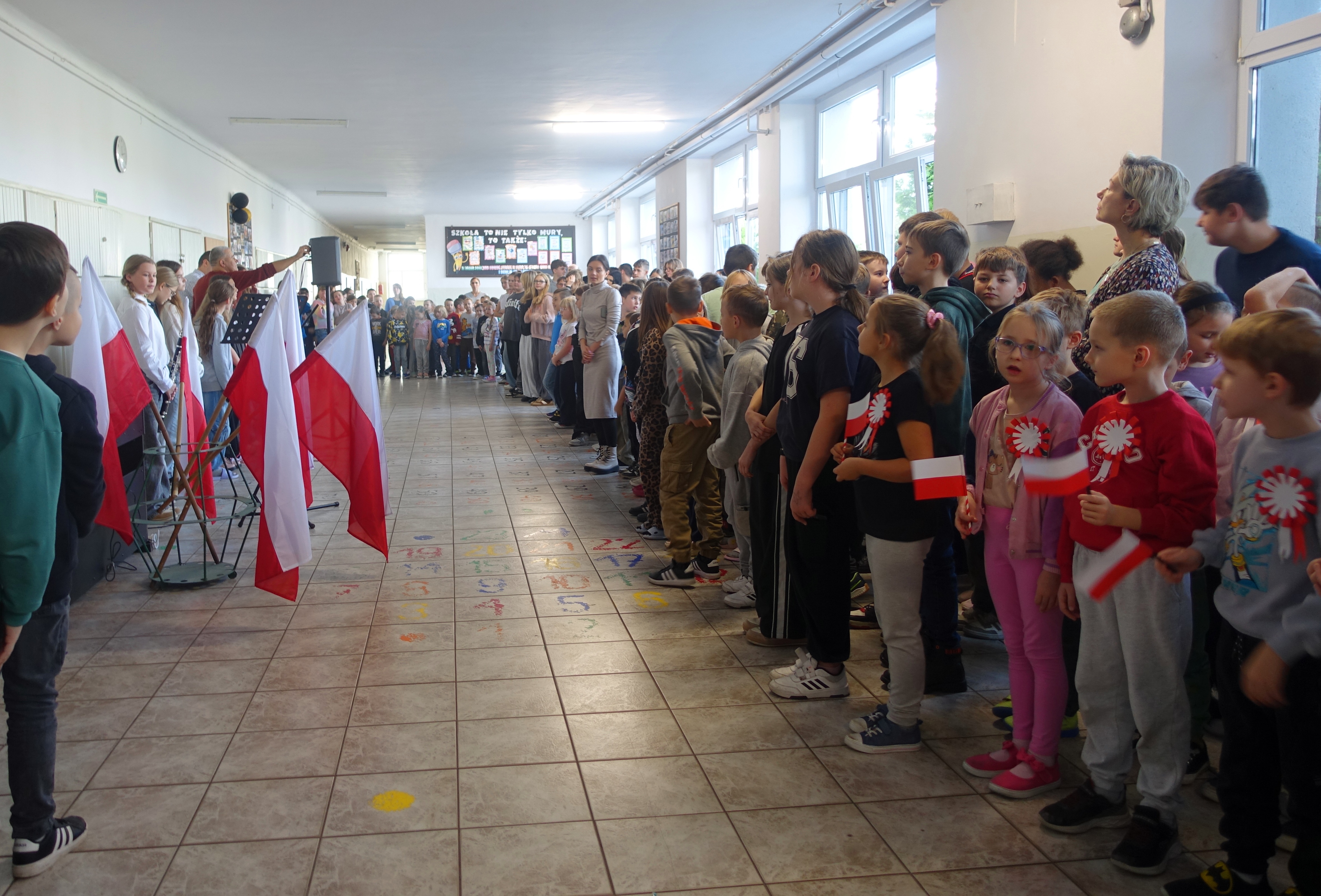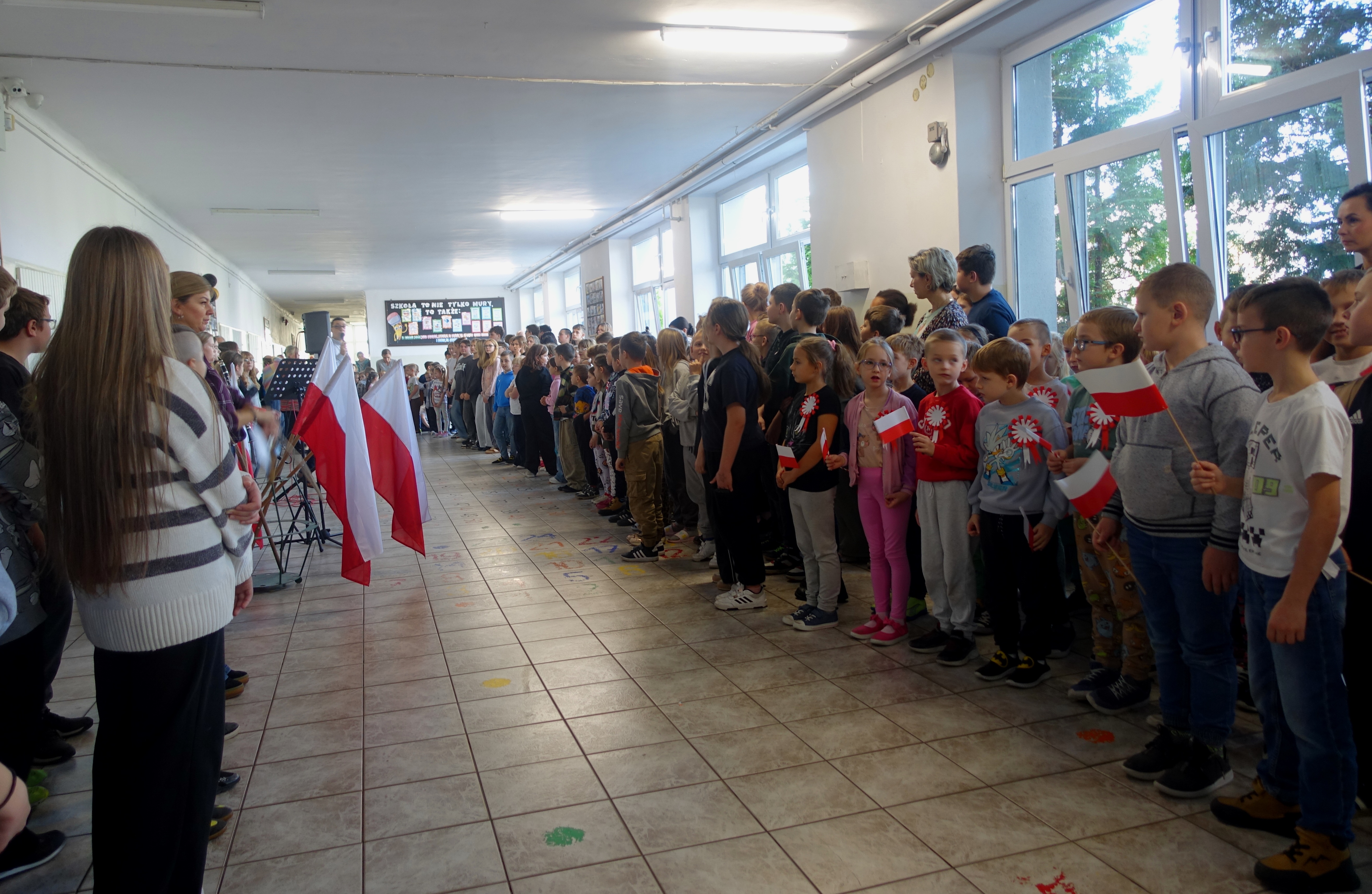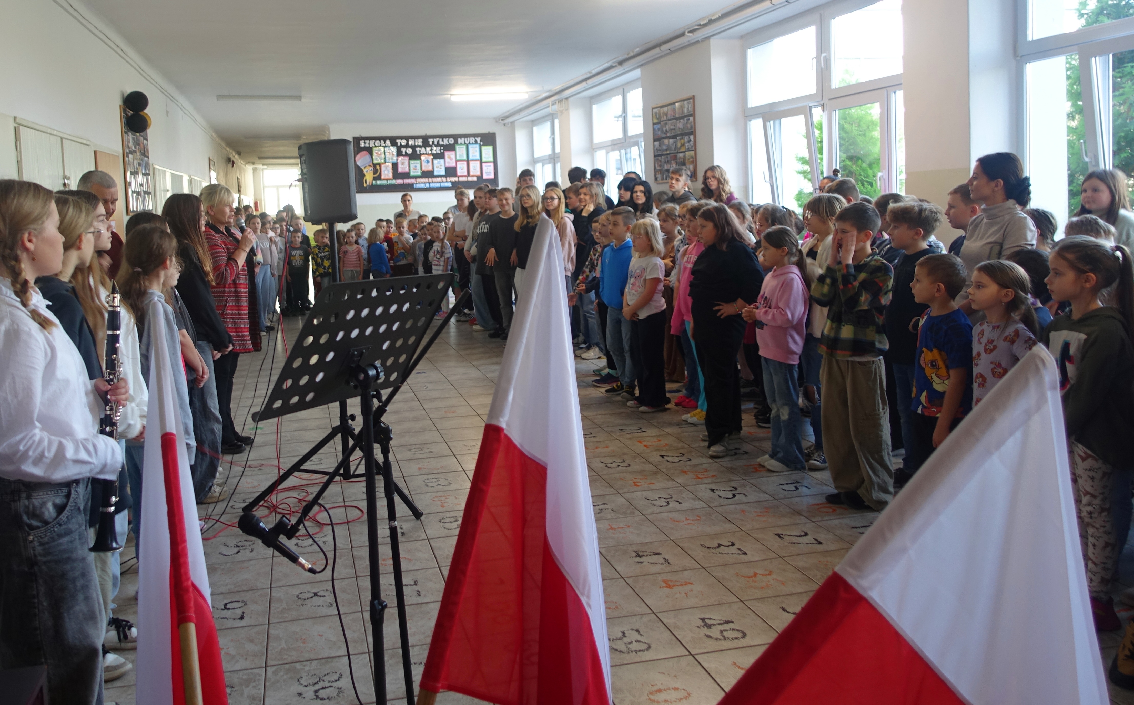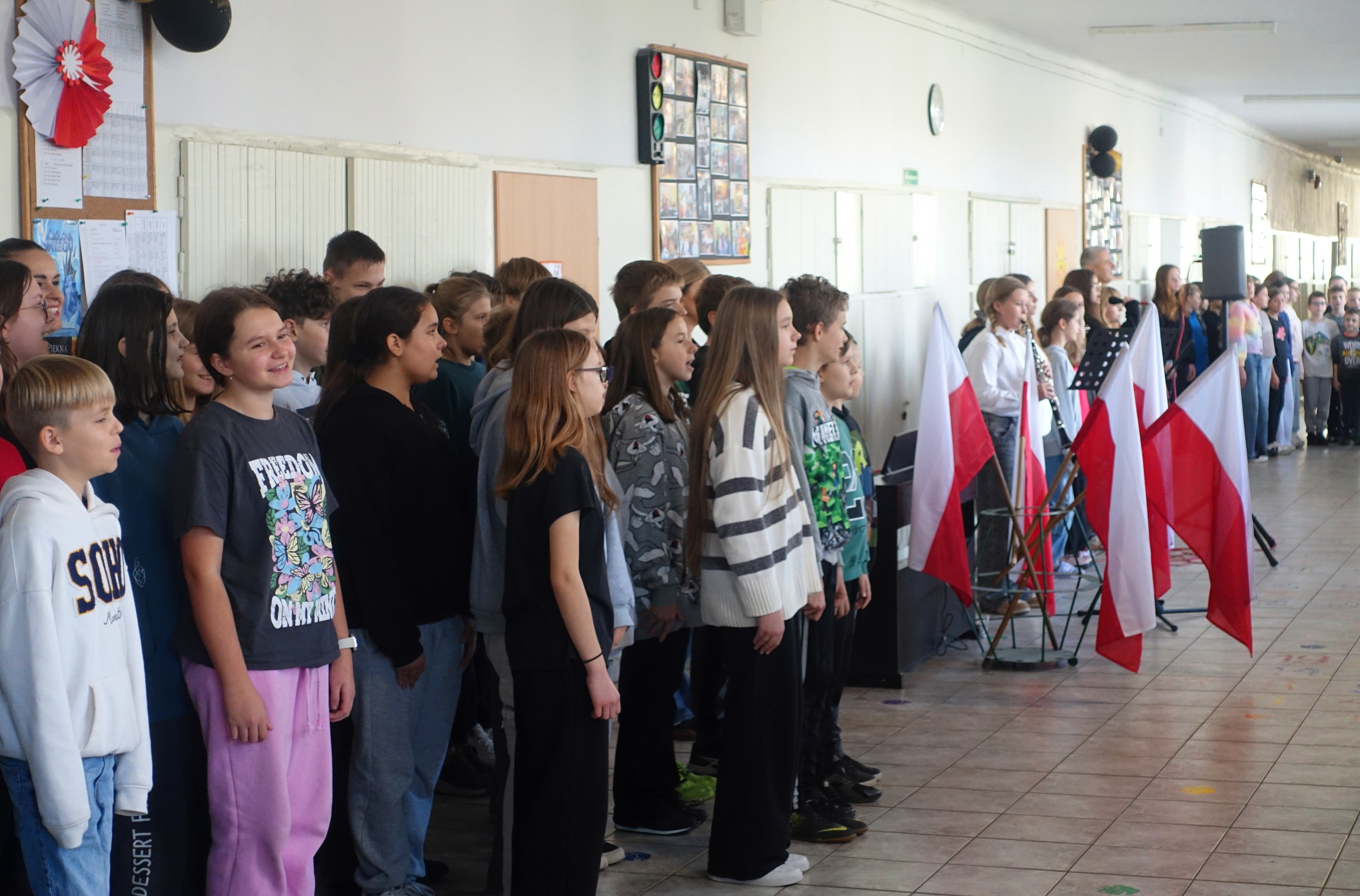 Dzisiaj nasza szkoła wzięła udział w akcji „Szkoła do hymnu” zainicjowanej przez Ministerstwo Edukacji Narodowej, zgodnie z tradycją obchodów Narodowego Święta Niepodległości. W ramach tej inicjatywy, w piątek 7 listopada 2025 roku, o symbolicznej godzinie 11:11, wszyscy uczniowie klas IV-VIII wraz z nauczycielami na korytarzu dolnym ,,dziewiątki’’ wspólnie odśpiewali hymn narodowy „Mazurek Dąbrowskiego”, aby uczcić 107 rocznicę odzyskania niepodległości przez Polskę. Akcję koordynował p. Łukasz Rosiak, akompaniujący na pianinie, w towarzystwie uczennicy grającej na klarnecie. Śpiewowowi wszystkich uczestników wydarzenia towarzyszył zespół ,,Canto''.