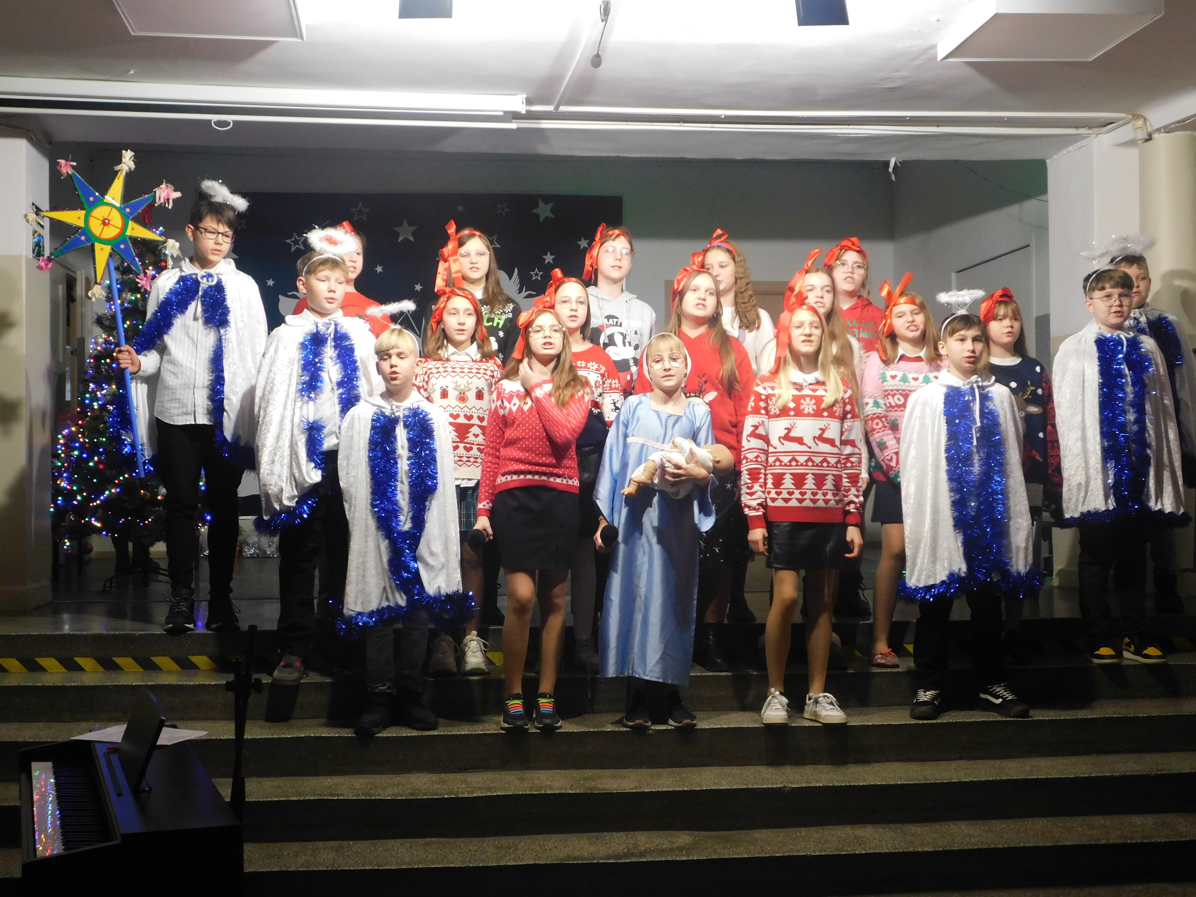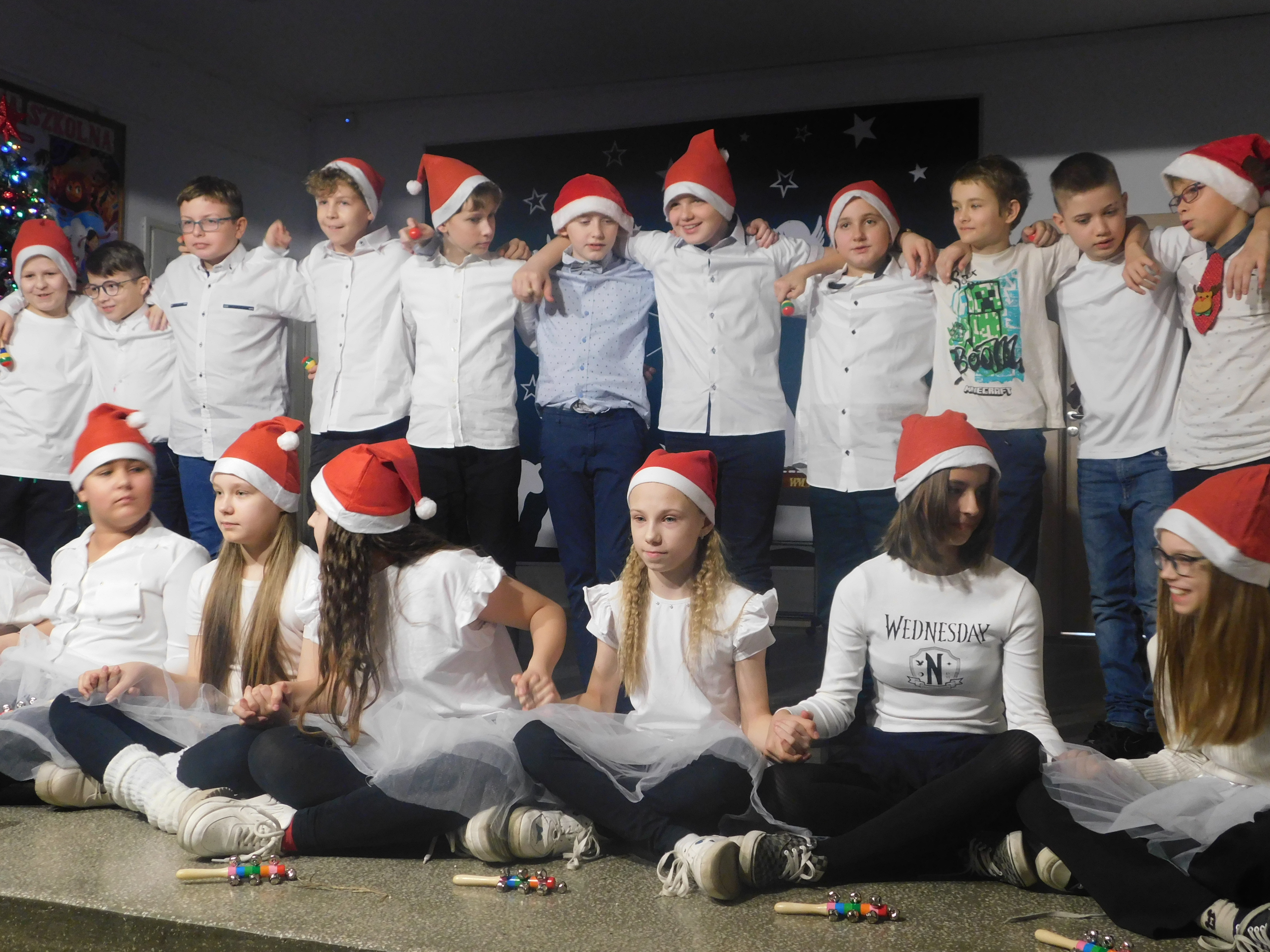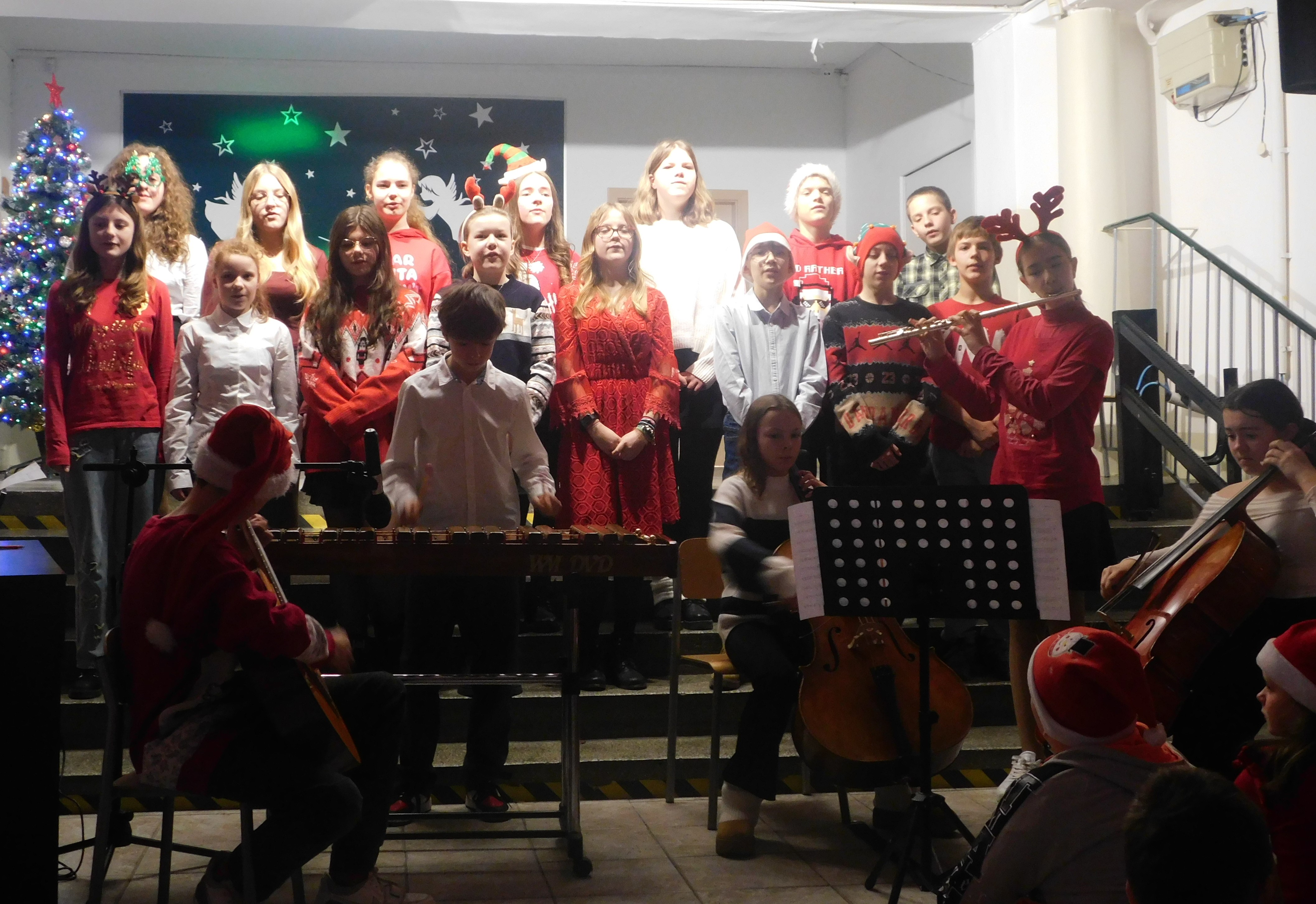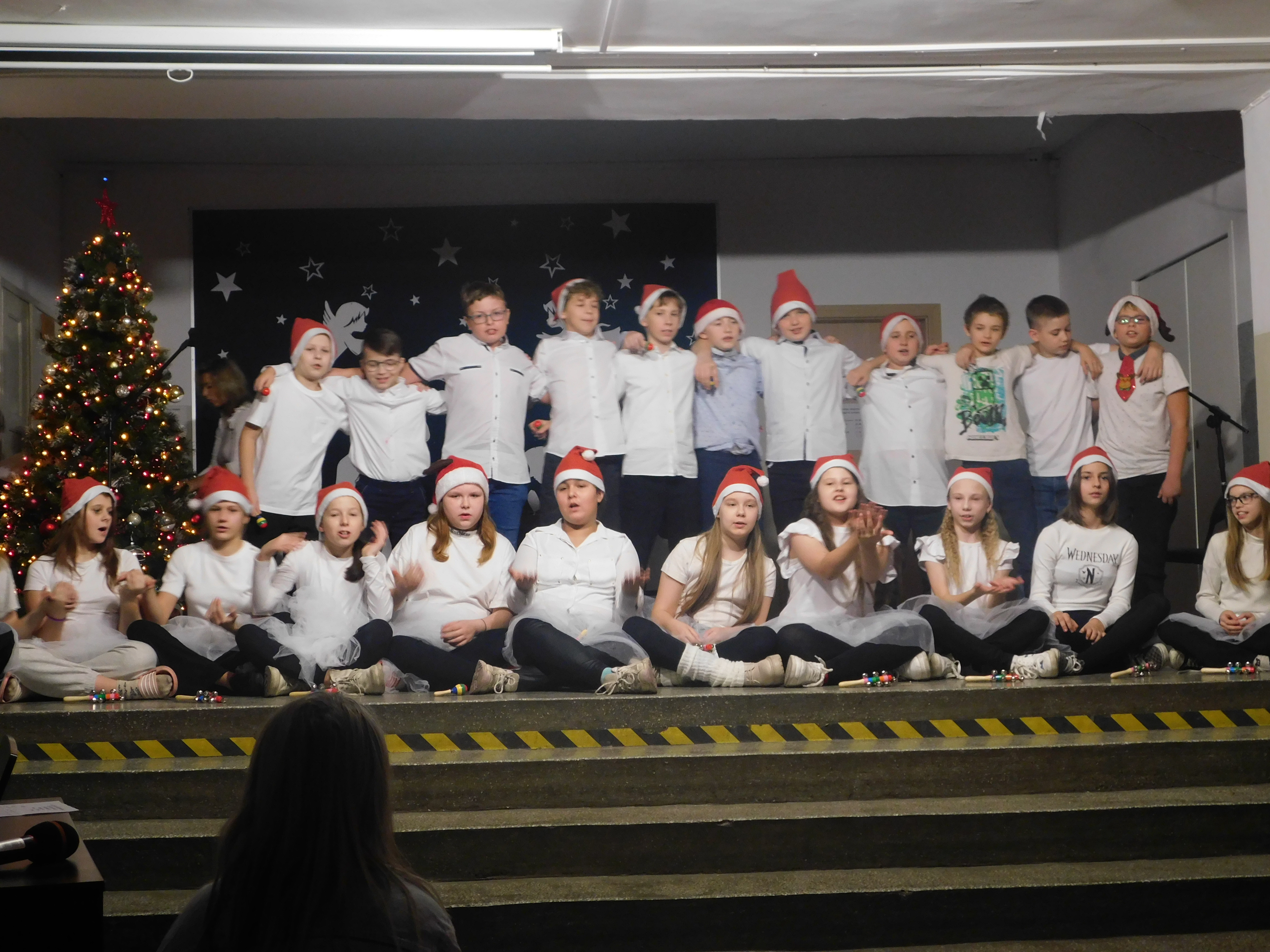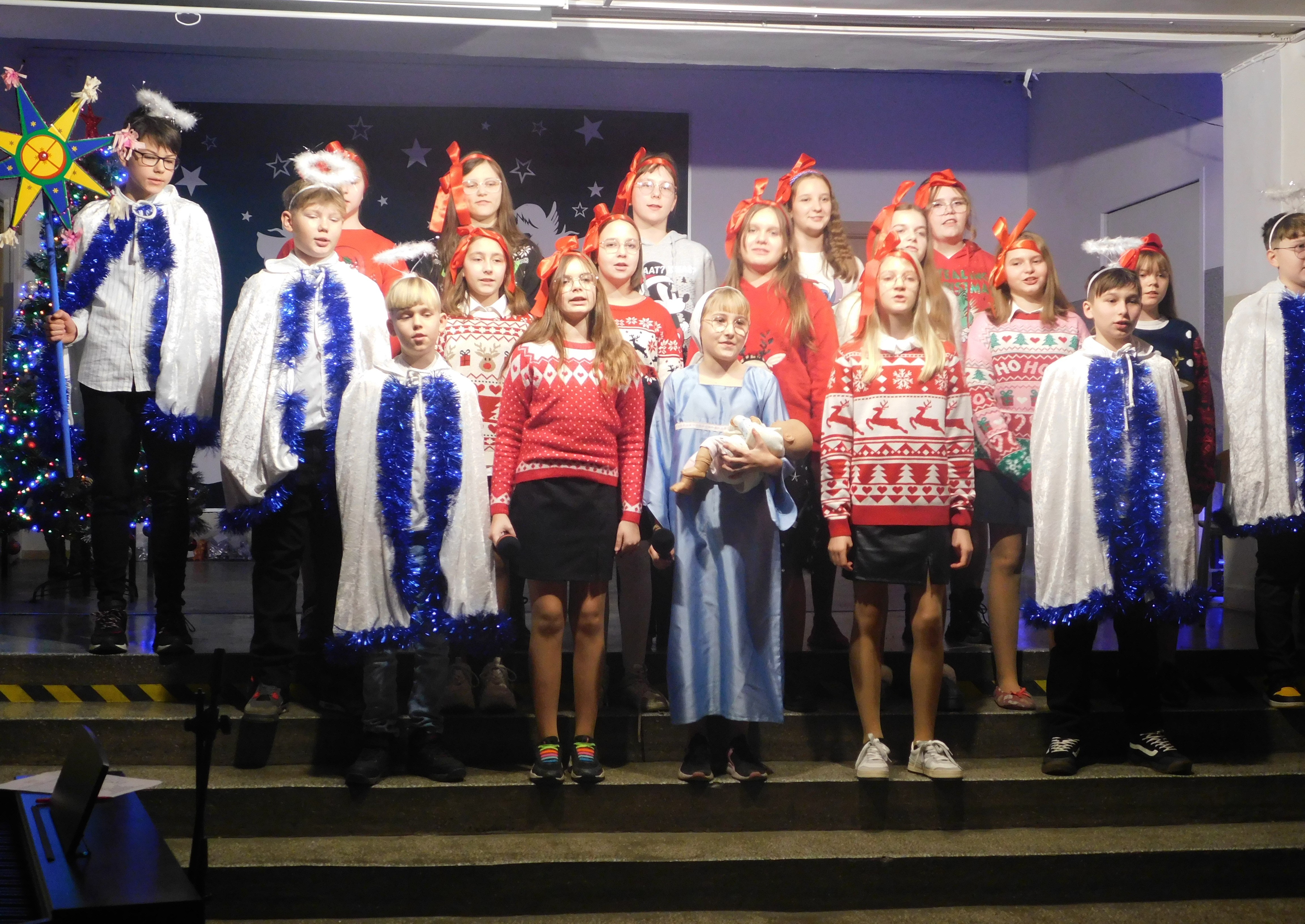 Od godziny 09:10 odbywał sie na holu głównym naszej szkoły koncert kolęd i pastorałek dla klas IV-VI, a następnie w kategorii klas VII-VIII prowadzony przez p. Łukasza Rosiak. Jury konkursu stanowili nauczyciele: p. Grażyna Leśniewska-Długokęcka, p. Mirosław Cieślik i p. Andrzej Pokora. Wydarzenie te i kolejne cieszyło się ogromnym zainteresowaniem klas starszych, które zaprezentowały swoje własne aranżacje znanych kolęd jak np. ,,Dzisiaj w Betlejem’’, ,, Gdy się Chrystus rodzi’’, ,,Jingle Bells’’, Święta w nas’’, ,,Gore Gwiazda’’, ,,Jest taki dzień’’, ,,Przybieżeli do Betlejem’’ i inne. I tak Grand Prix w kategorii klas IV-VI uzyskała klasa 6a, I miejsce 5a, II miejsce 5b i 6b, III miejsce ex aequo klasy 4a i 4b. W klasach VII-VIII, Grand Prix zdobyła klasa 8a, I miejsce zaś – 7b, na drugiej lokacie stanęła klasa 7a, a na najniższym stopniu podium klasa 8b. Wszyscy wykonawcy otrzymali pamiątkowe dyplomyz rąk p. wicedyr. - Bożeny Wereszczyńskiej. /opr.AL/