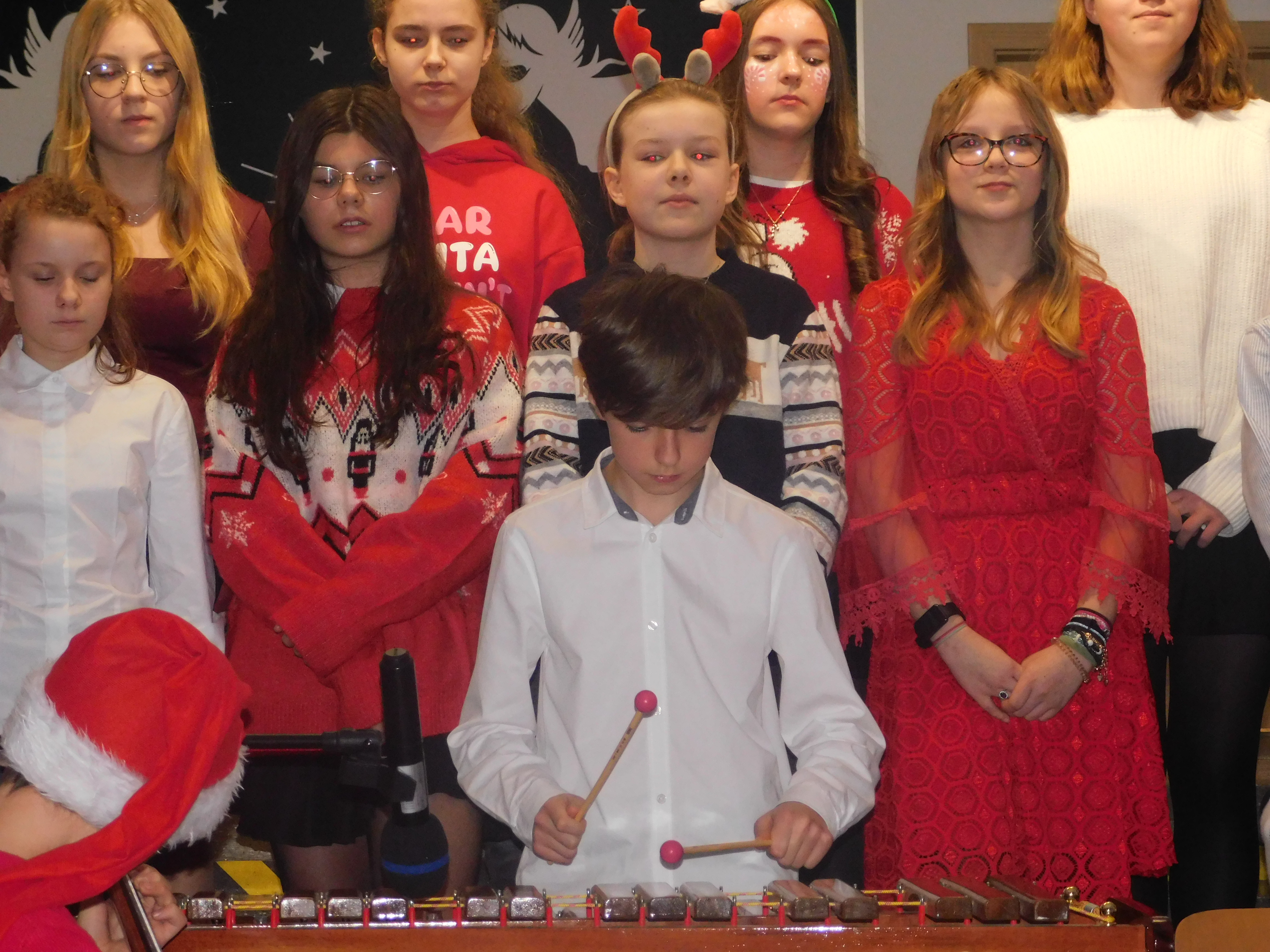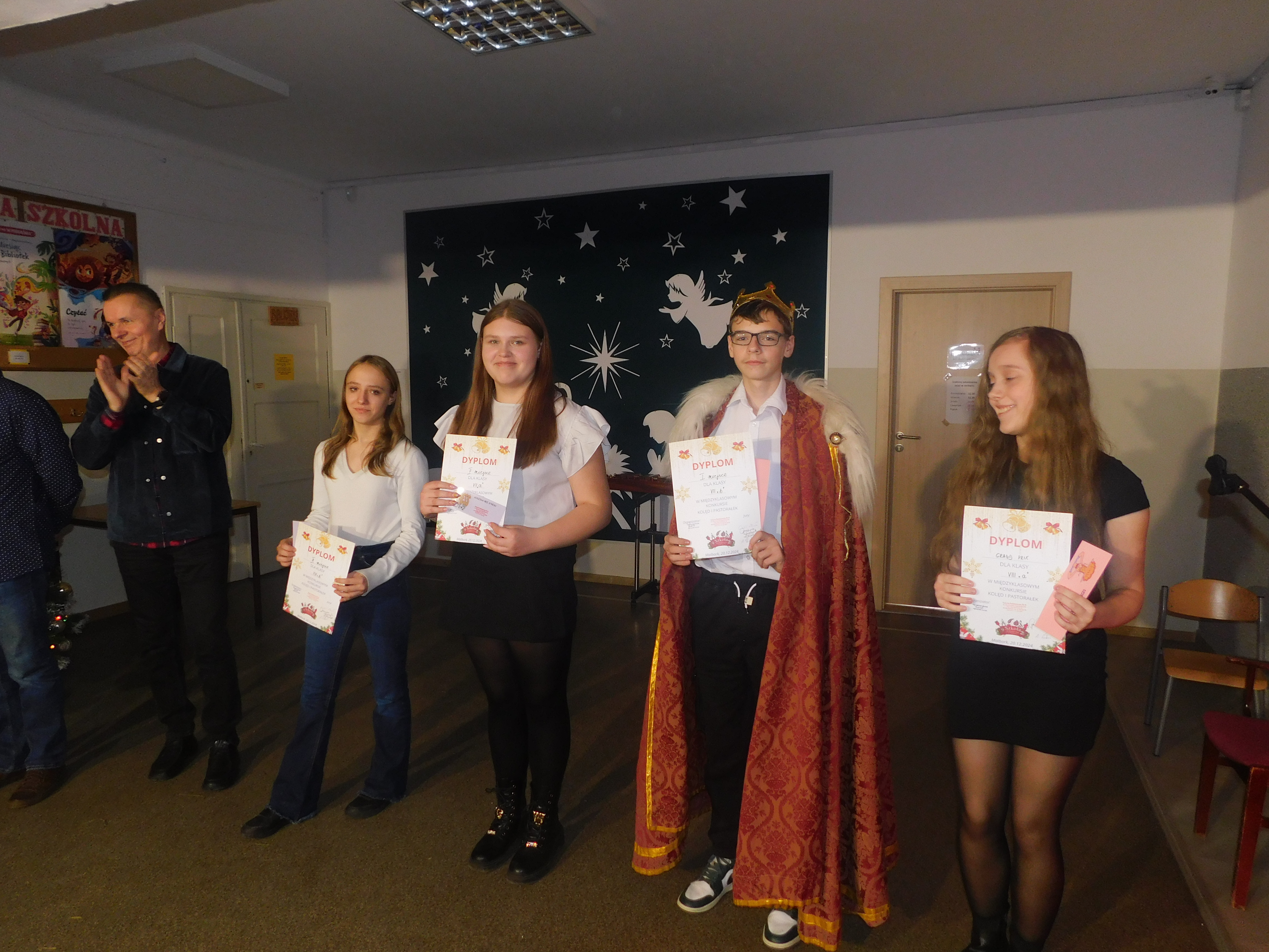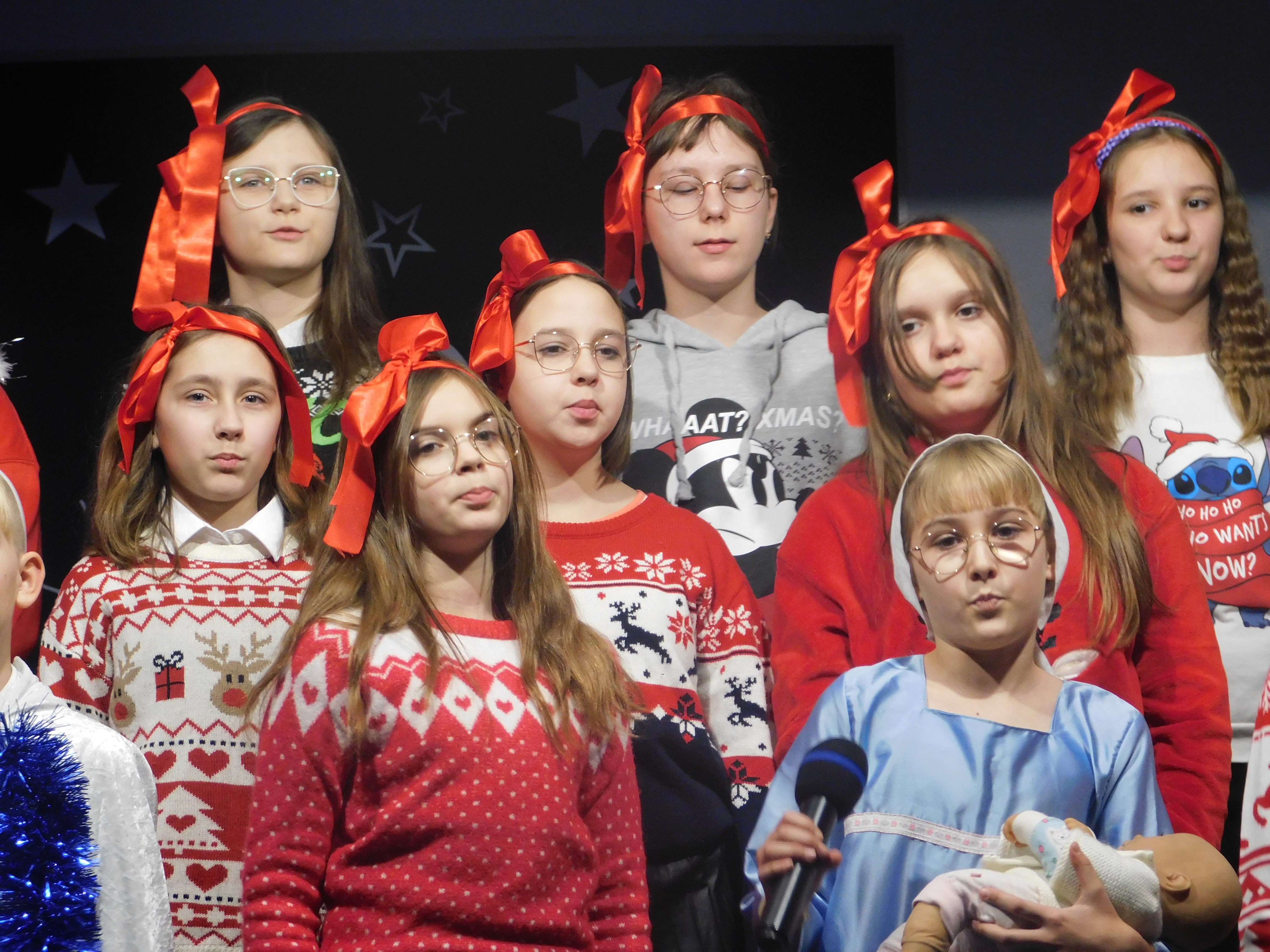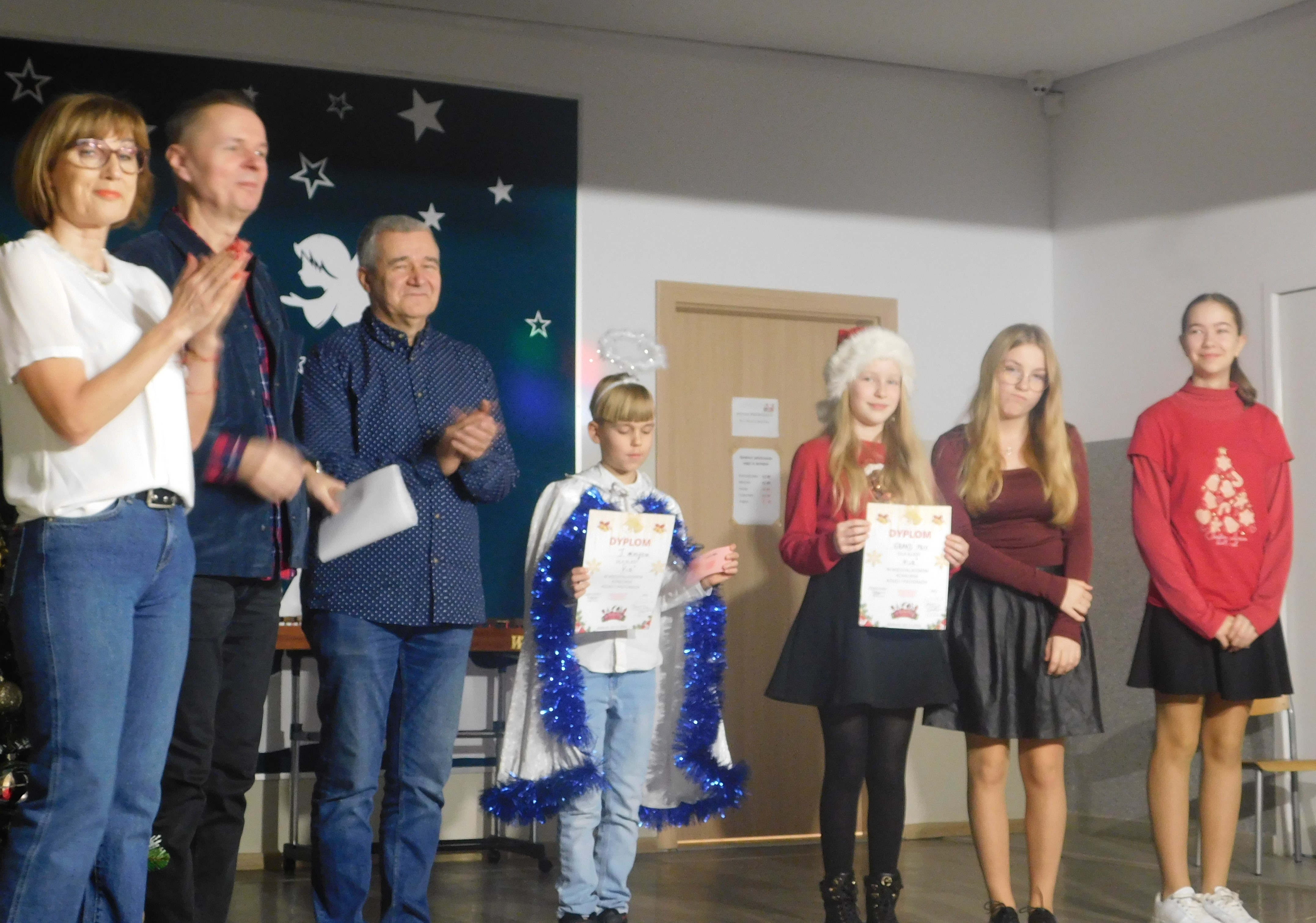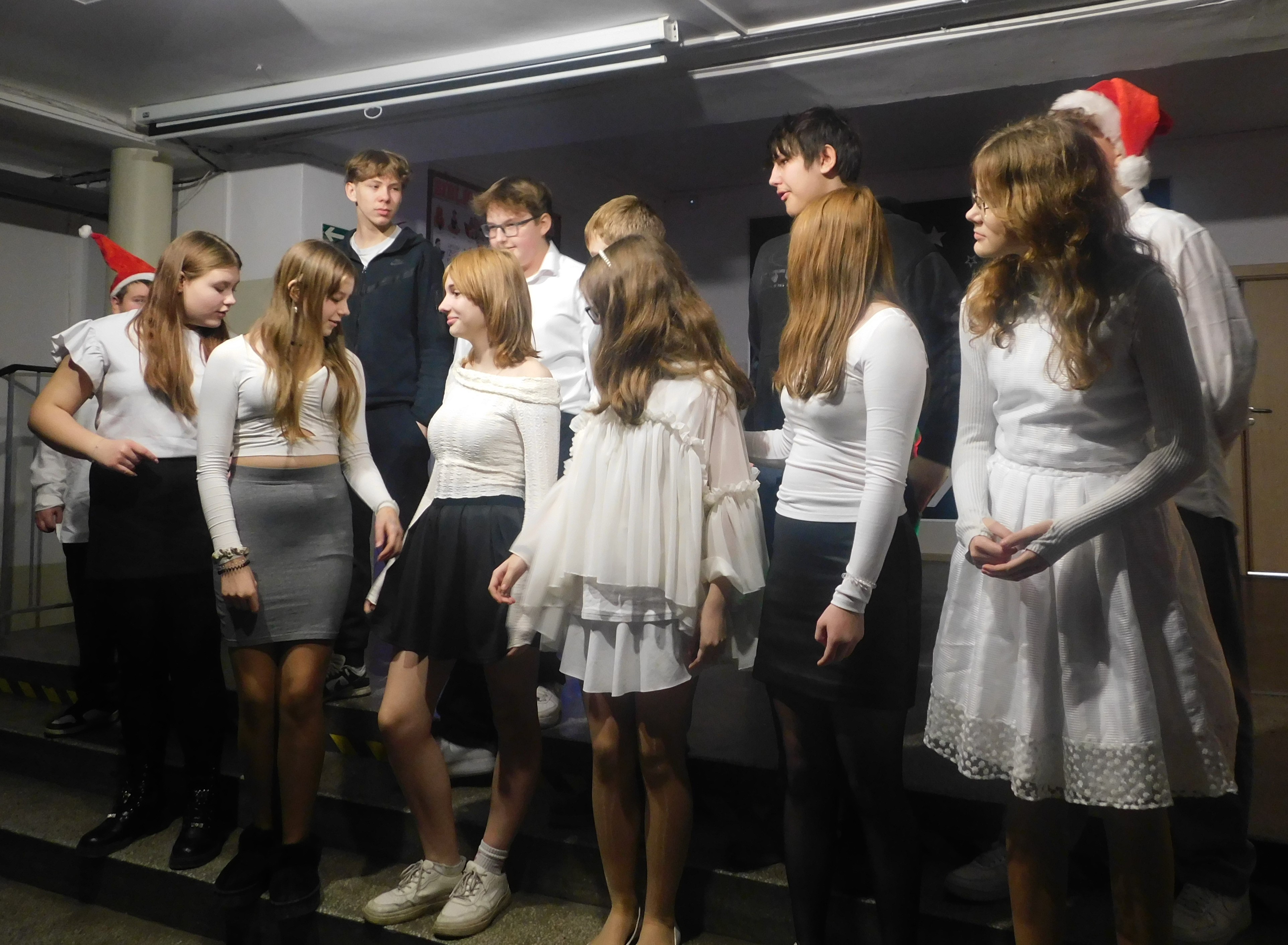 Od godziny 09:10 odbywał sie na holu głównym naszej szkoły koncert kolęd i pastorałek dla klas IV-VI, a następnie w kategorii klas VII-VIII prowadzony przez p. Łukasza Rosiak. Jury konkursu stanowili nauczyciele: p. Grażyna Leśniewska-Długokęcka, p. Mirosław Cieślik i p. Andrzej Pokora. Wydarzenie te i kolejne cieszyło się ogromnym zainteresowaniem klas starszych, które zaprezentowały swoje własne aranżacje znanych kolęd jak np. ,,Dzisiaj w Betlejem’’, ,, Gdy się Chrystus rodzi’’, ,,Jingle Bells’’, Święta w nas’’, ,,Gore Gwiazda’’, ,,Jest taki dzień’’, ,,Przybieżeli do Betlejem’’ i inne. I tak Grand Prix w kategorii klas IV-VI uzyskała klasa 6a, I miejsce 5a, II miejsce 5b i 6b, III miejsce ex aequo klasy 4a i 4b. W klasach VII-VIII, Grand Prix zdobyła klasa 8a, I miejsce zaś – 7b, na drugiej lokacie stanęła klasa 7a, a na najniższym stopniu podium klasa 8b. Wszyscy wykonawcy otrzymali pamiątkowe dyplomyz rąk p. wicedyr. - Bożeny Wereszczyńskiej. /opr.AL/