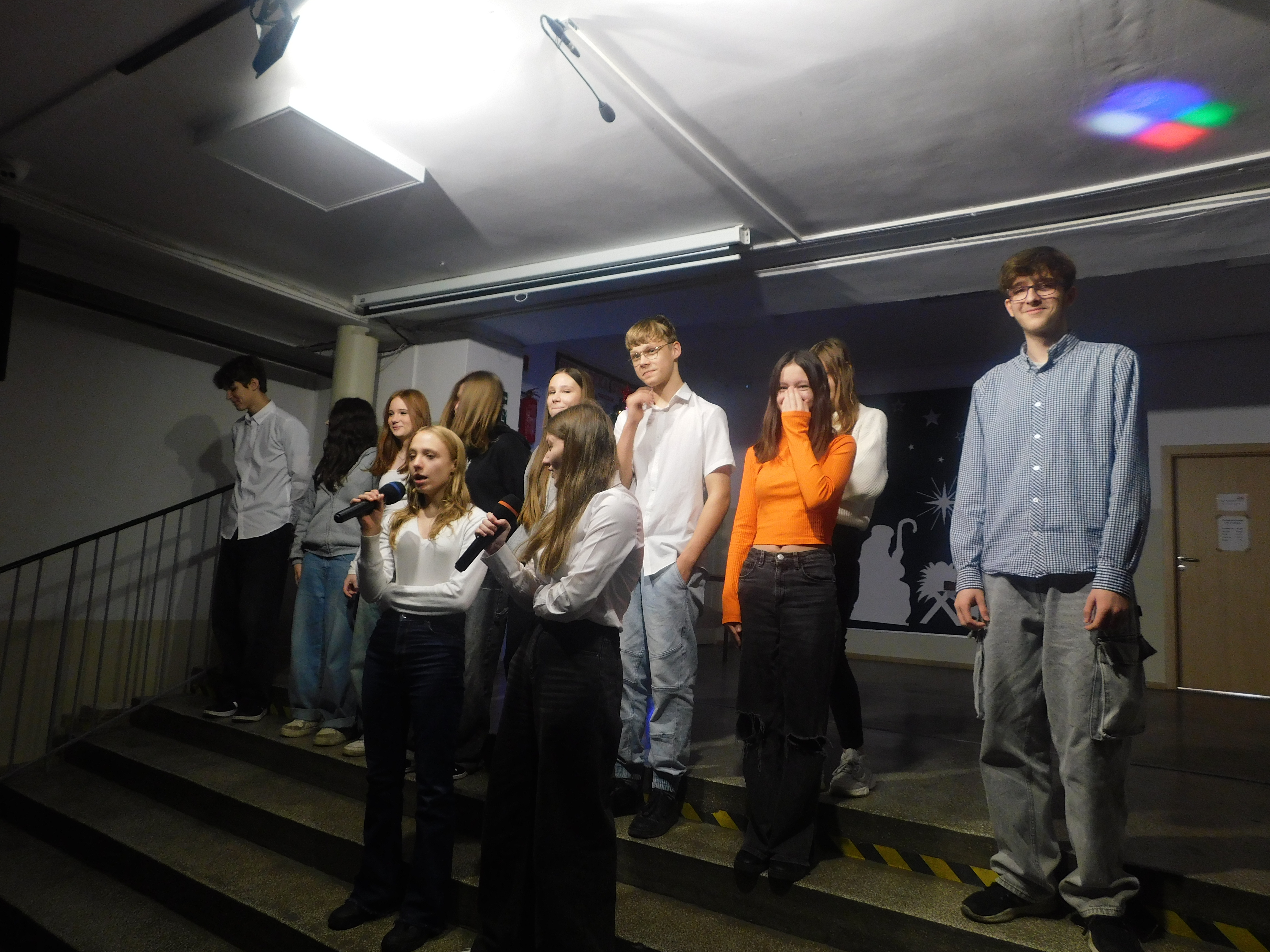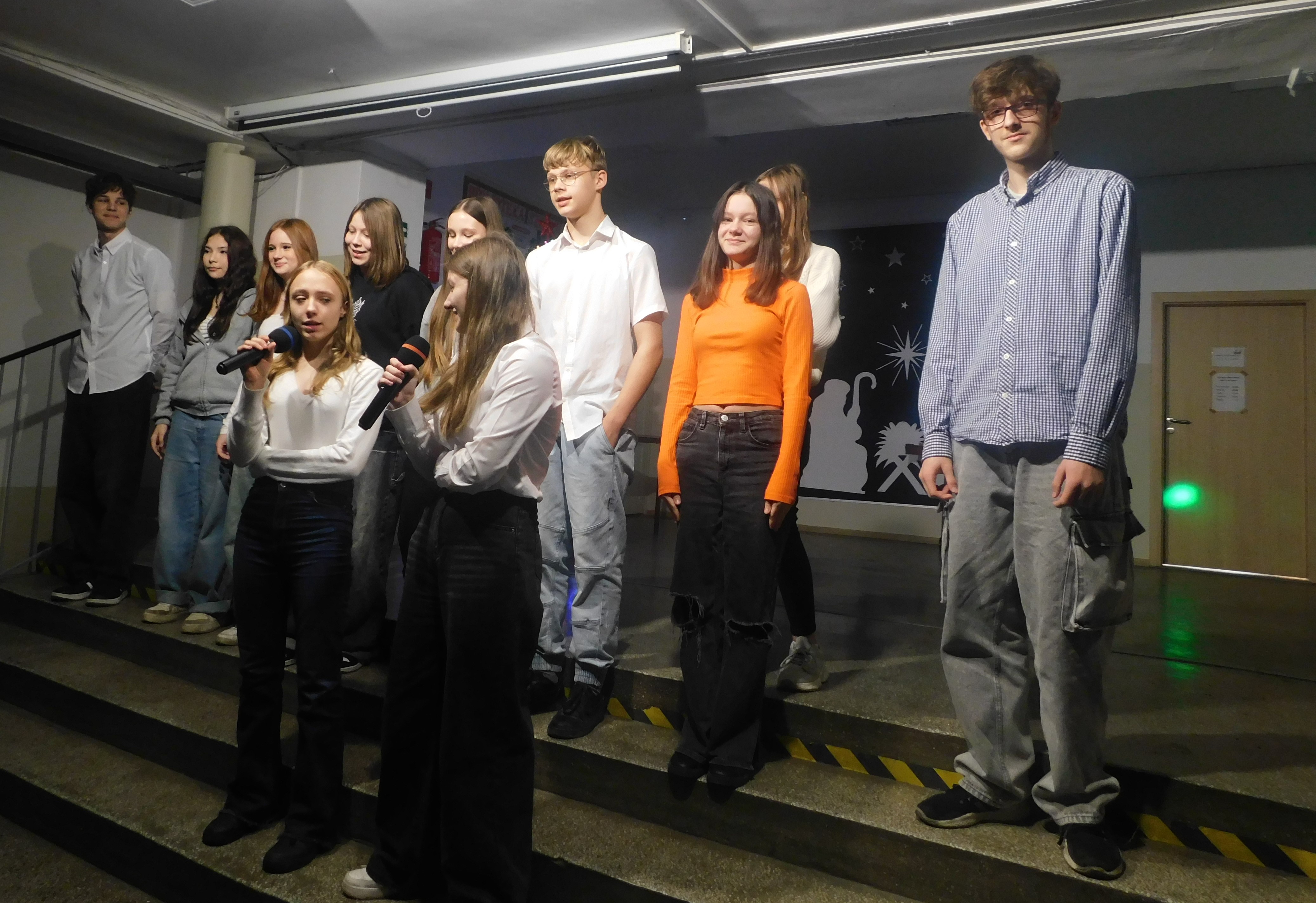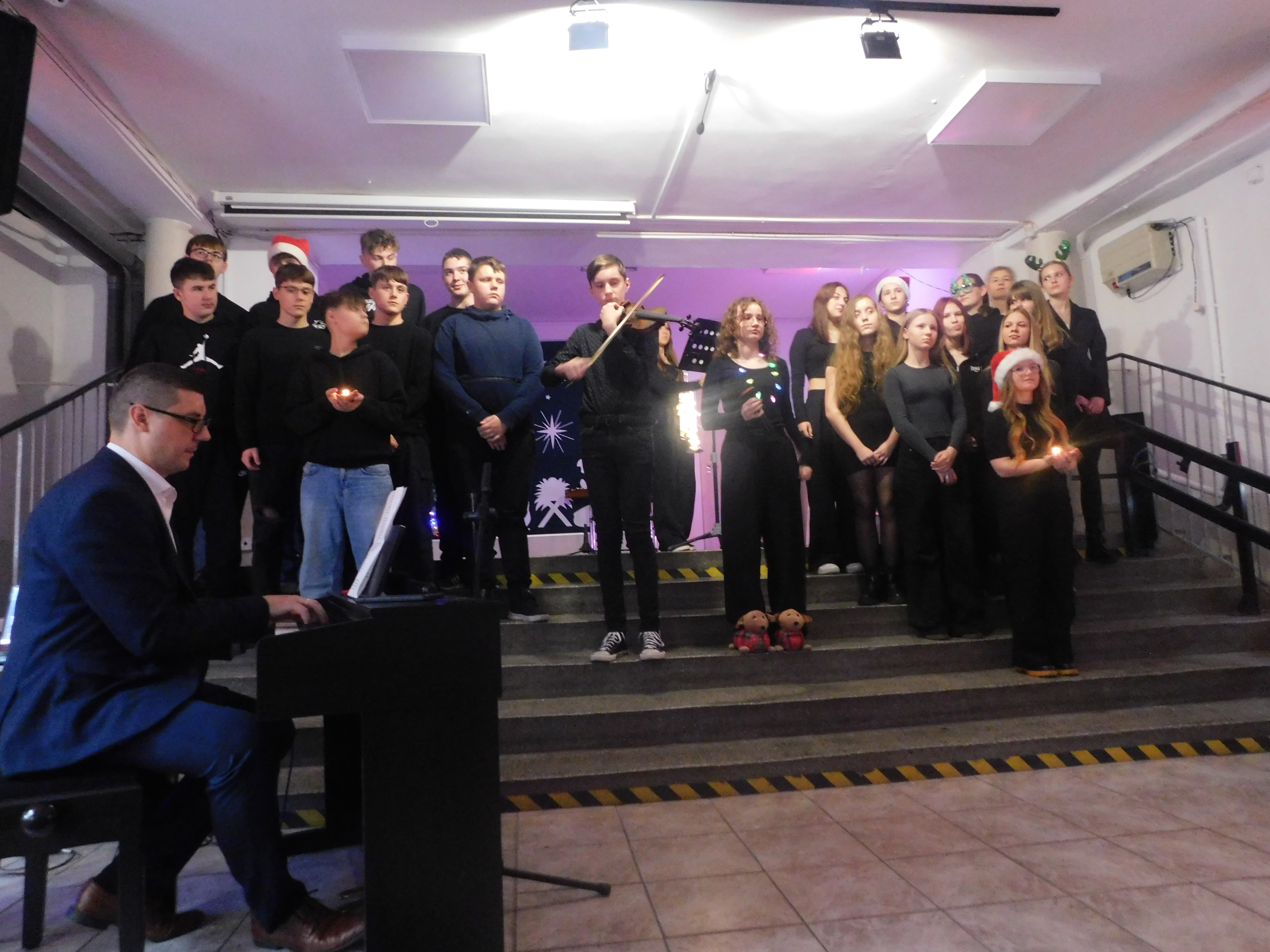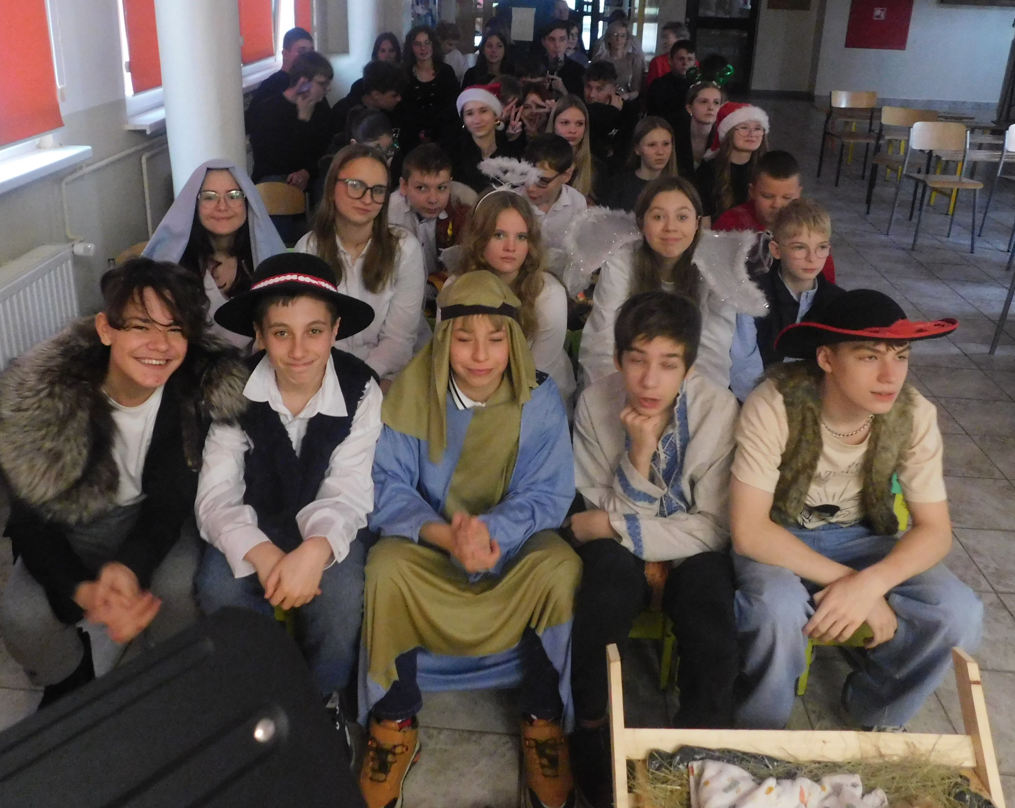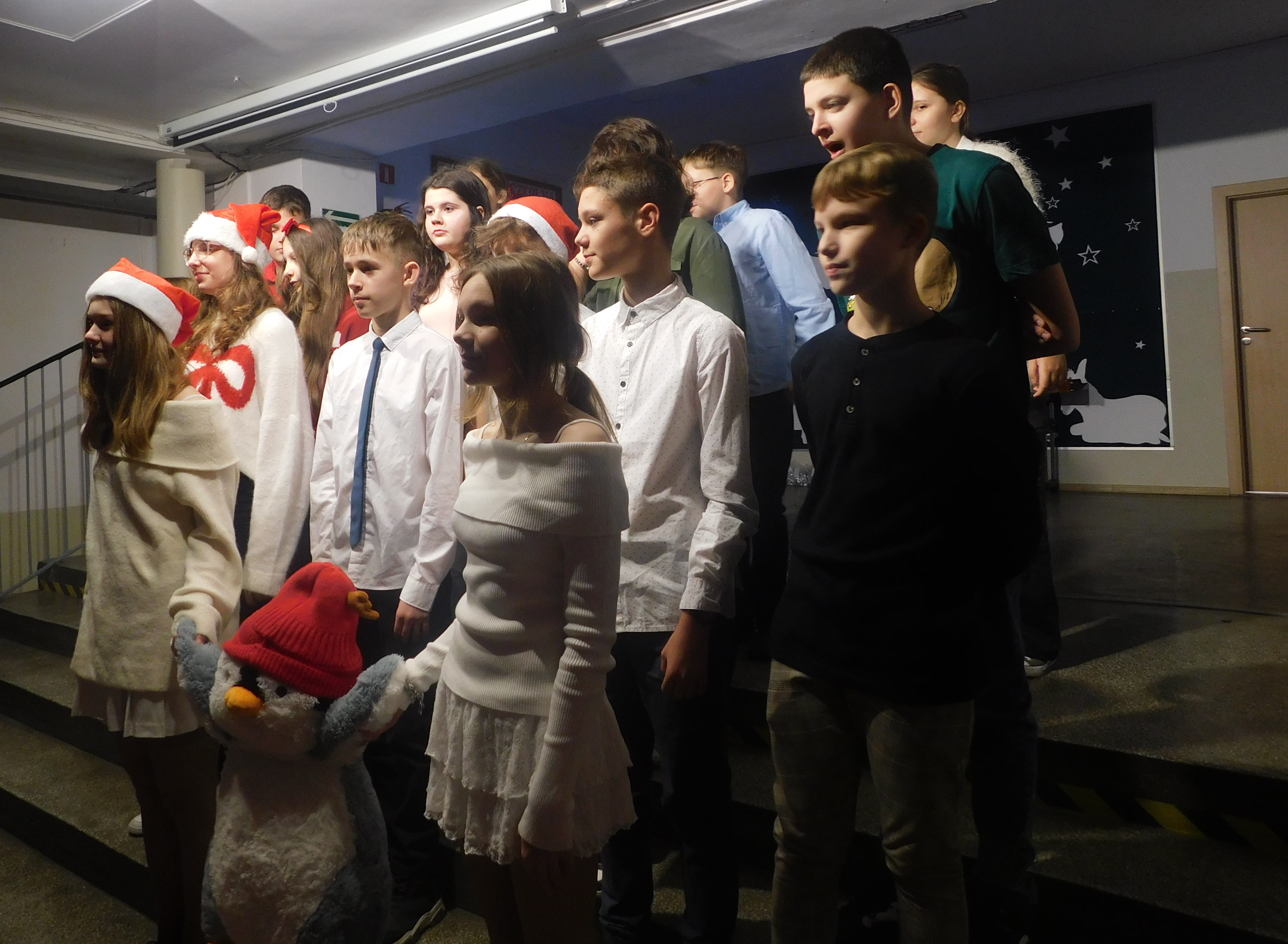 Od godziny 09:10 odbywał sie na holu głównym naszej szkoły koncert kolęd i pastorałek dla klas IV-VI, a następnie w kategorii klas VII-VIII prowadzony przez p. Łukasza Rosiak. Jury konkursu stanowili nauczyciele: p. Grażyna Leśniewska-Długokęcka, p. Mirosław Cieślik i p. Andrzej Pokora. Wydarzenie te i kolejne cieszyło się ogromnym zainteresowaniem klas starszych, które zaprezentowały swoje własne aranżacje znanych kolęd jak np. ,,Dzisiaj w Betlejem’’, ,, Gdy się Chrystus rodzi’’, ,,Jingle Bells’’, Święta w nas’’, ,,Gore Gwiazda’’, ,,Jest taki dzień’’, ,,Przybieżeli do Betlejem’’ i inne. I tak Grand Prix w kategorii klas IV-VI uzyskała klasa 6a, I miejsce 5a, II miejsce 5b i 6b, III miejsce ex aequo klasy 4a i 4b. W klasach VII-VIII, Grand Prix zdobyła klasa 8a, I miejsce zaś – 7b, na drugiej lokacie stanęła klasa 7a, a na najniższym stopniu podium klasa 8b. Wszyscy wykonawcy otrzymali pamiątkowe dyplomyz rąk p. wicedyr. - Bożeny Wereszczyńskiej. /opr.AL/