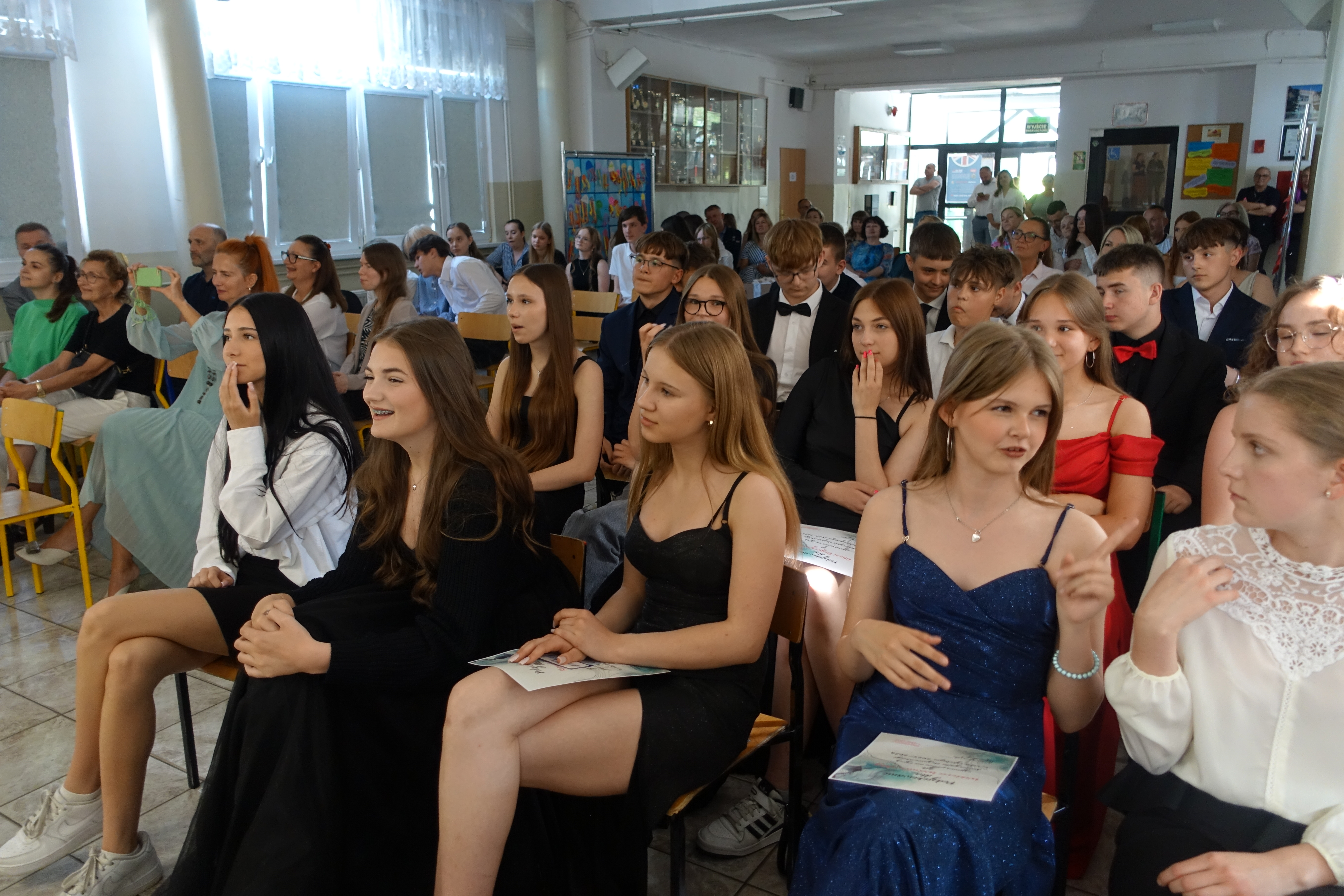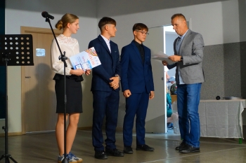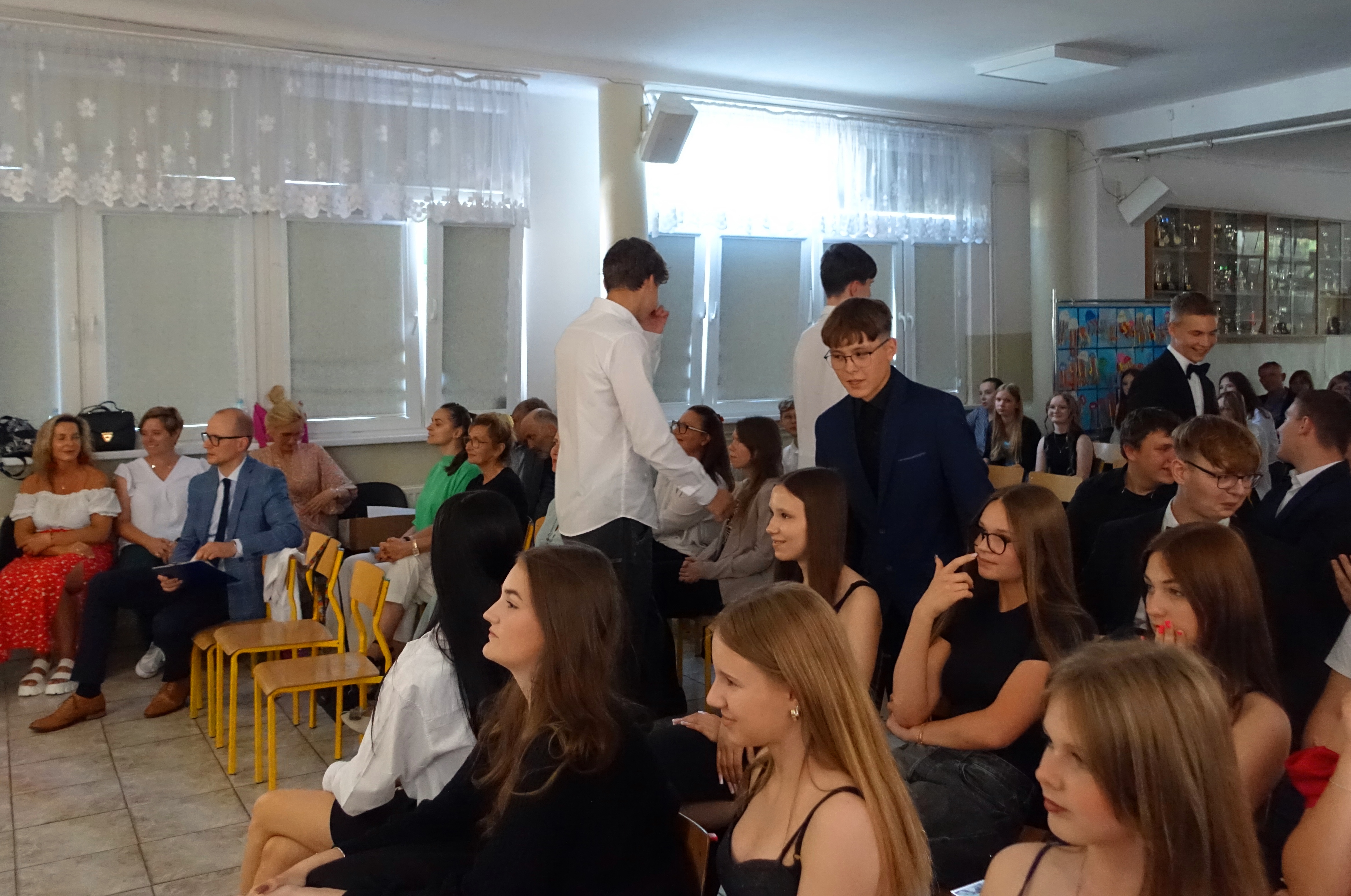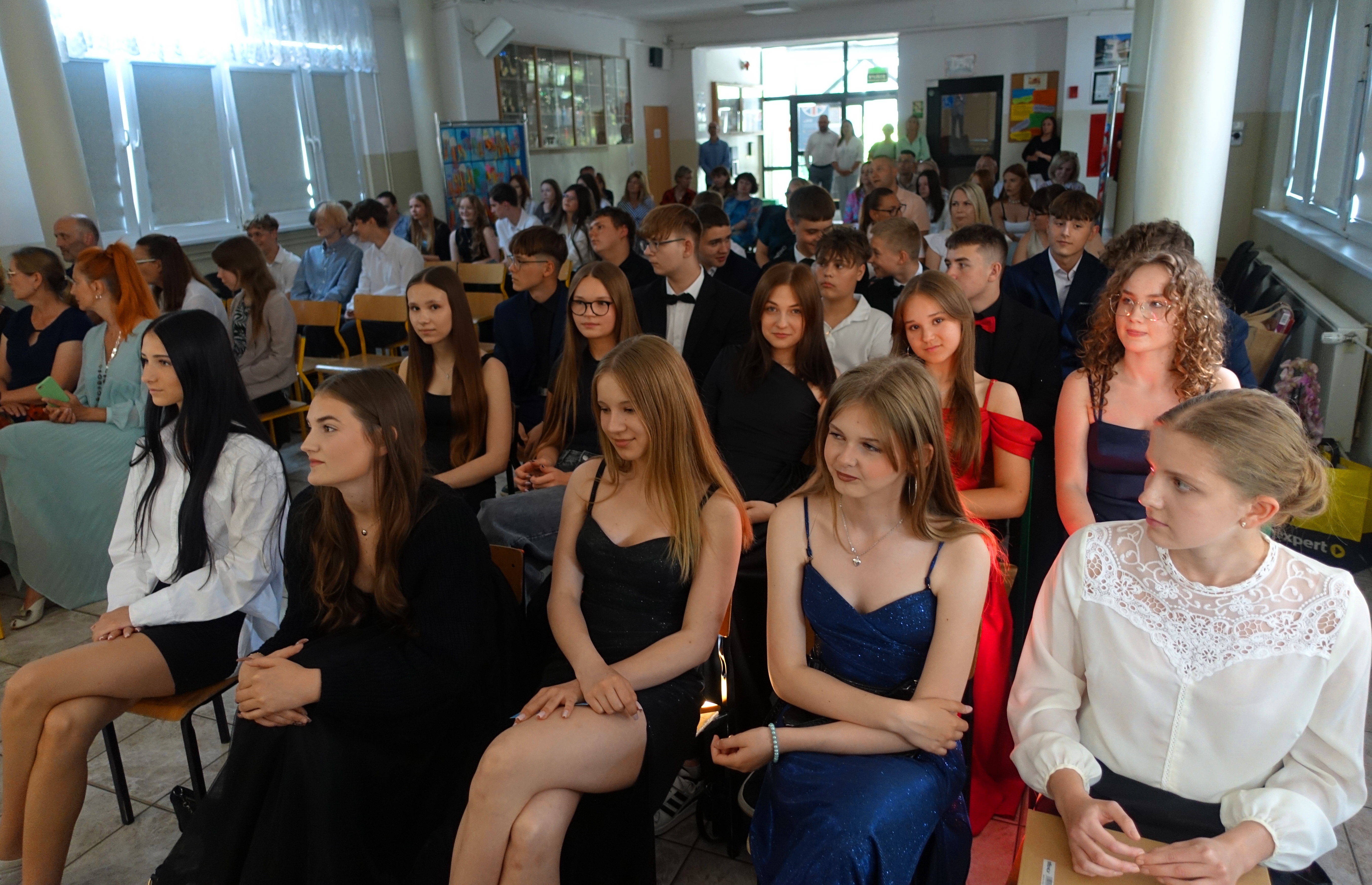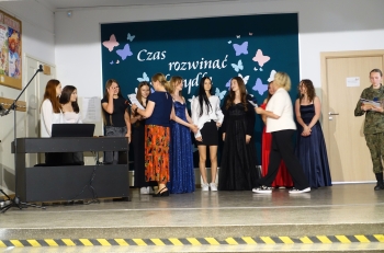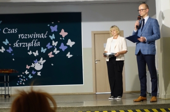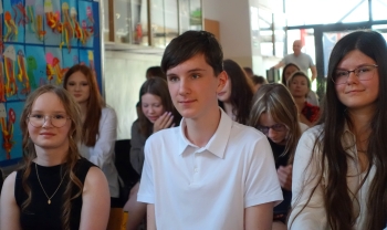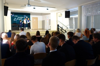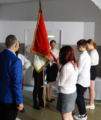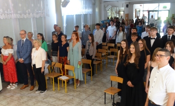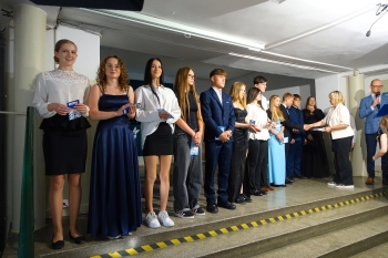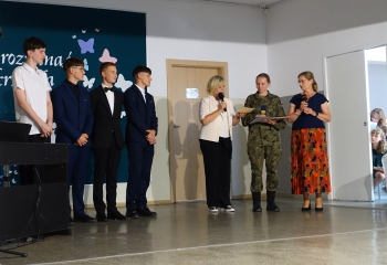W czwartek 26 czerwca 2025r. odbyło się uroczyste pożegnanie uczniów klas VIII na holu głównym szkoły. Szkolna akademia rozpoczęła się przekazaniem pocztu sztandarowego reprezentacji klas VII i odśpiewaniem Mazurka Dąbrowskiego pod okiem p. Andrzeja Pokory i p. Łukasza Rosiak. Po chwili na scenie szkolnej wystąpił Franciszek Mattern, który na ksylofonie zagrał klasycznego ,,Poloneza’’. Następnie odbyła się już właściwa część artystyczna przygotowana przez p. Janinę Łańko i p. Katarzynę Gizę z uczniami - konferansjerami: Franciszkiem, Zuzią i Jakubem. W trakcie akademii dziękowano dość wesoło nauczycielom i pracownikom ,,dziewiątki’. Nasza najlepsza uczennica szkoły Iga Kratewicz z kl. VIII a, podziękowała w imieniu szkolnego SU radzie pedagogicznej i obsłudze szkoły za pracę i trud włożony w wychowanie ósmoklasistów. Nie zabrakło głosu przedstawicieli Rady Rodziców. Tradycyjnie już wręczono uczniom wyróżniającym się w nauce i sporcie nagrody. W tym roku szkolnym prym wiodła nietuzinkowa Iga Kratewicz. Nagrody uczniom wręczali p. Paweł Guzow- dyrektor, p. Bożena Wereszczyńska- wicedyrektor, p. Mirosłąw Cieślik, p. Marzena Kratewicz, p. Ewa Lemańczyk, p. Oliwia Duszyńska oraz specjalny gość szkoły – absolwentka Patrycja Pyrzyńska. Rzecz jasna były i nasze ,,Kaziki’, które przyznano uczniom za ,,specjalne’’ zdolności i osobowości, były to: papużki nierozłączki, sportowcy, chłopaki z klasą, artystyczne dusze, intelektualiści etc. Nie zabrakło zdjęć retrospekcyjnych i całej masy śmiechu. Na sam koniec pan dyrektor Paweł Guzow pogratulował ósmoklasistom ukończenia nauki, życząc sukcesów już w placówkach ponadpodstawowych. I jeszcze tylko rano w dniu 27 czerwca nasi absolwenci odbiorą swoje szkolne świadectwa, żegnając się ostatecznie z SP 9.