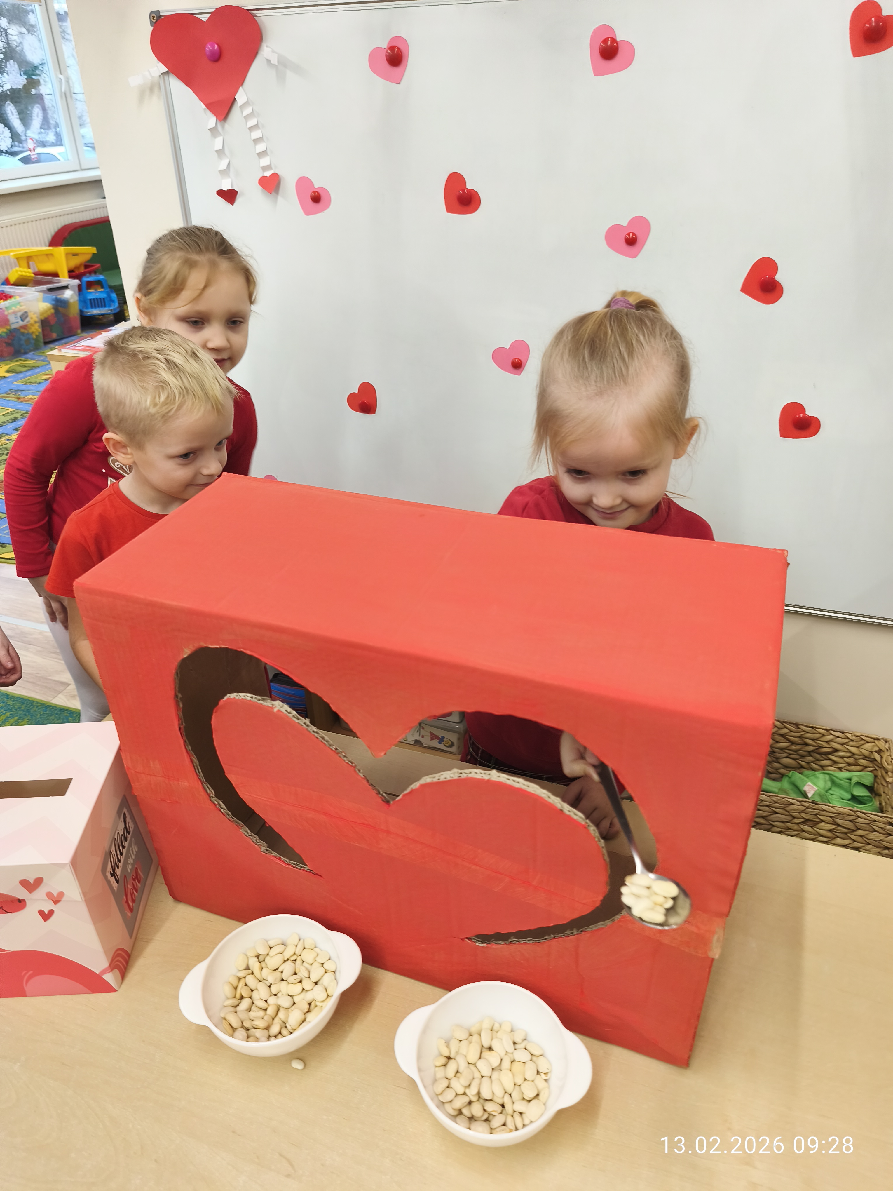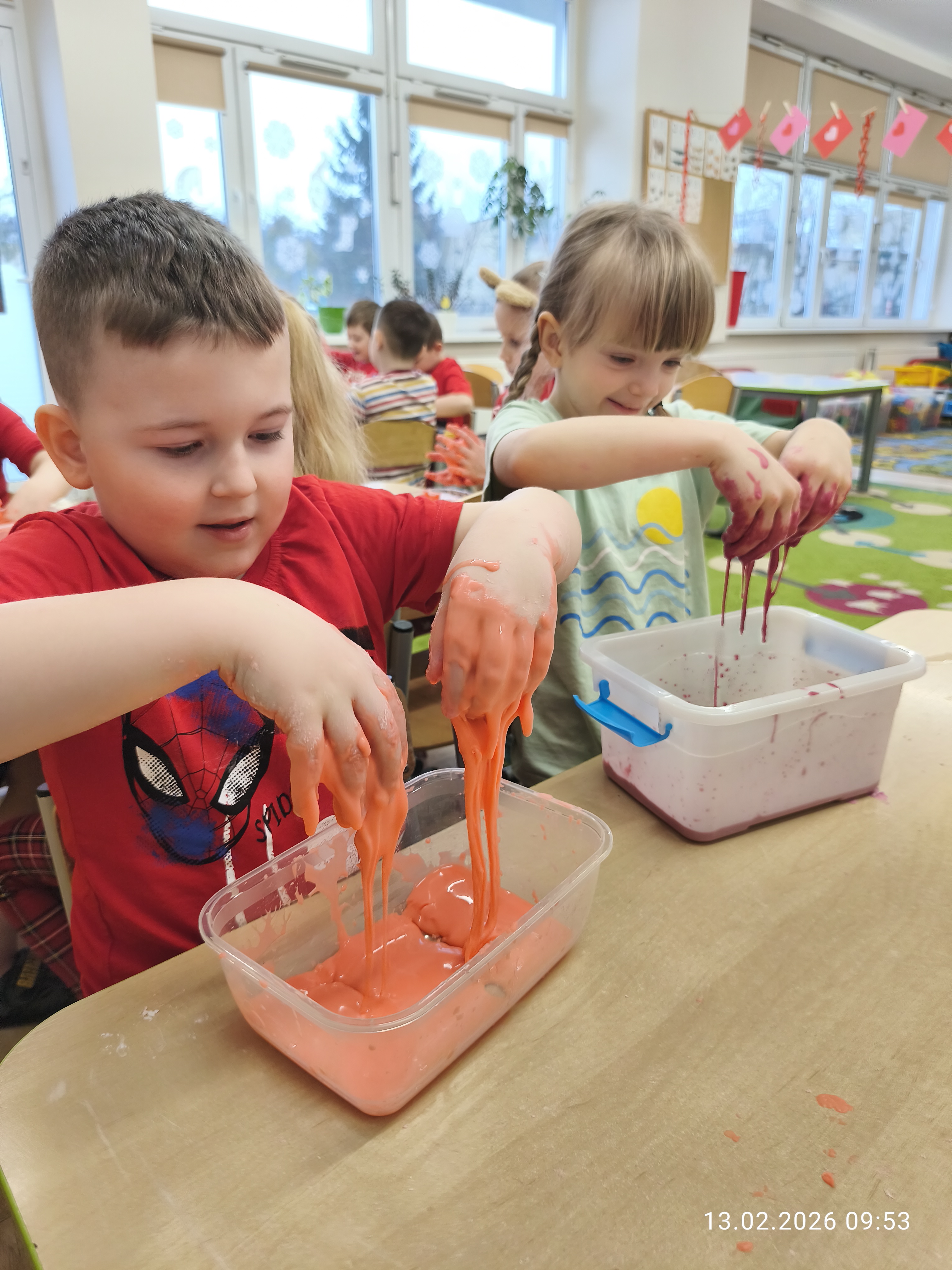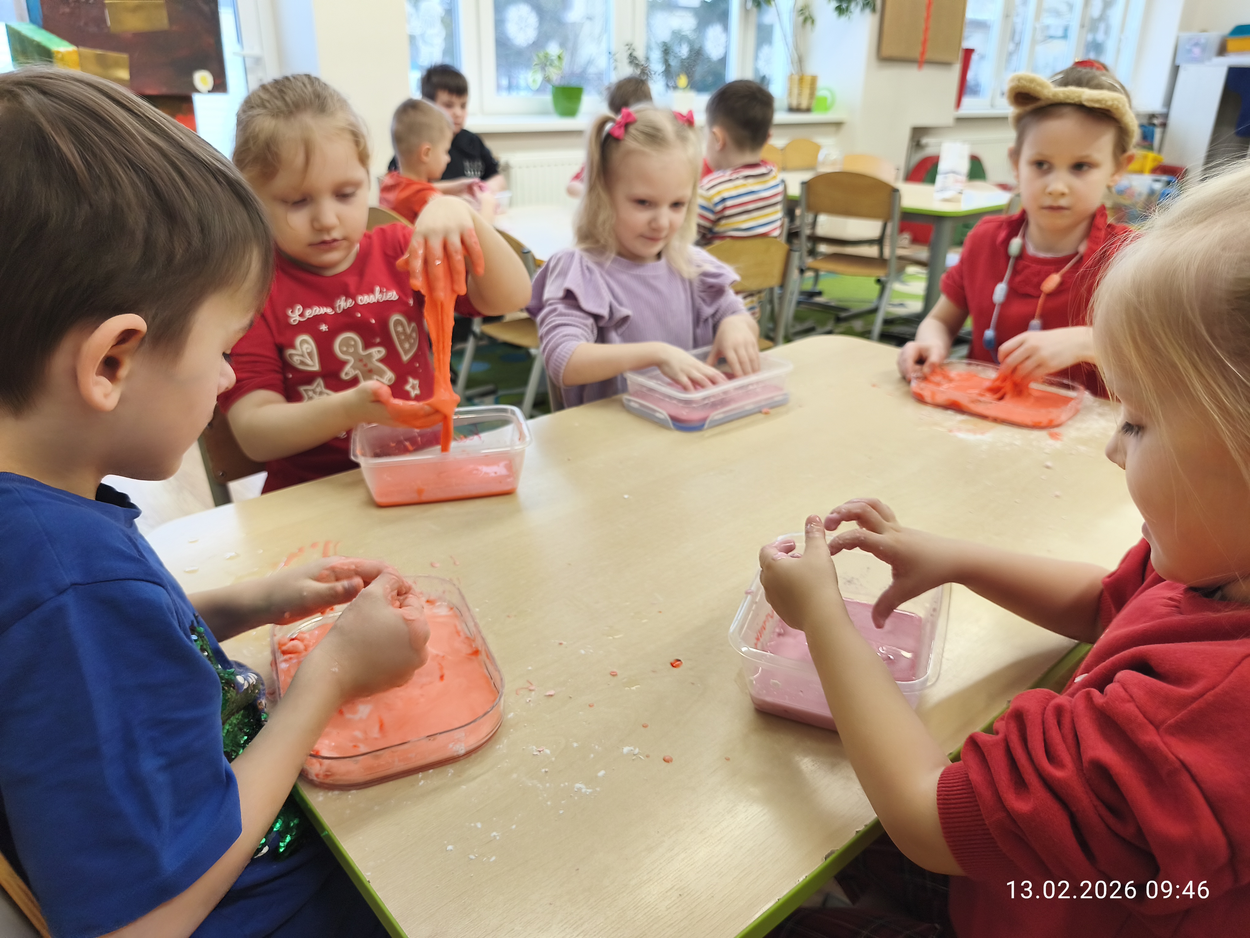 Walentynkowy piątkowy dzień w zerówce, był pełen radości, zabawy i nauki. Dzieci z entuzjazmem uczestniczyły w zabawach sensorycznych z cieczą nienewtonowską. Podczas walentynkowej zabawy ćwiczyły koordynację ruchową oraz sprawność manualną, przesypując fasolę do miseczek. Układały serca z sylab i cyfr, rozwijając umiejętności językowe oraz matematyczne, a także brały udział w emocjonującym wyścigu balonów. Zajęcia sprzyjały integracji grupy, aktywności ruchowej i nauce poprzez zabawę, dostarczając wielu uśmiechów i pozytywnych emocji oraz tworząc wyjątkową, walentynkową atmosferę.