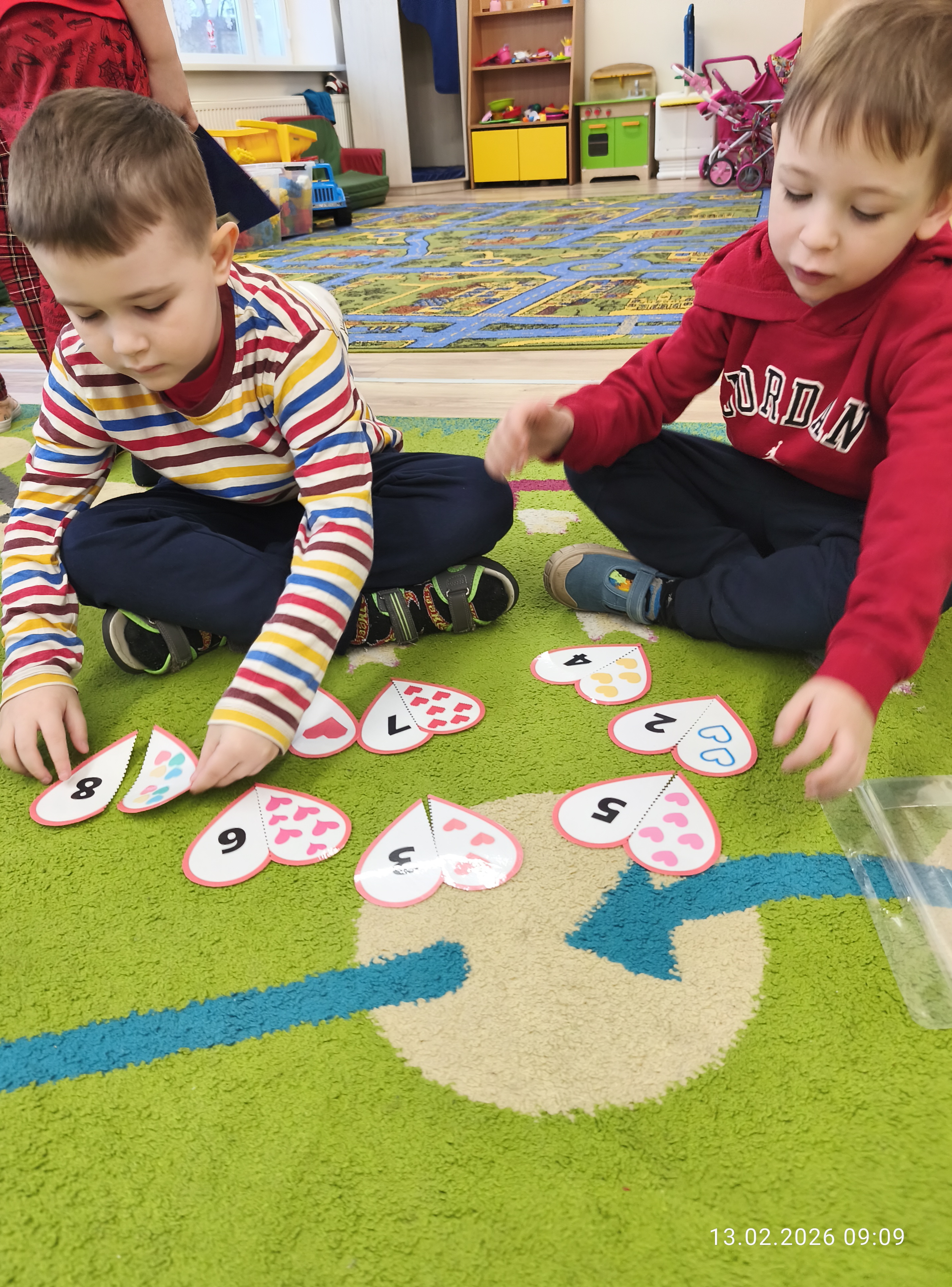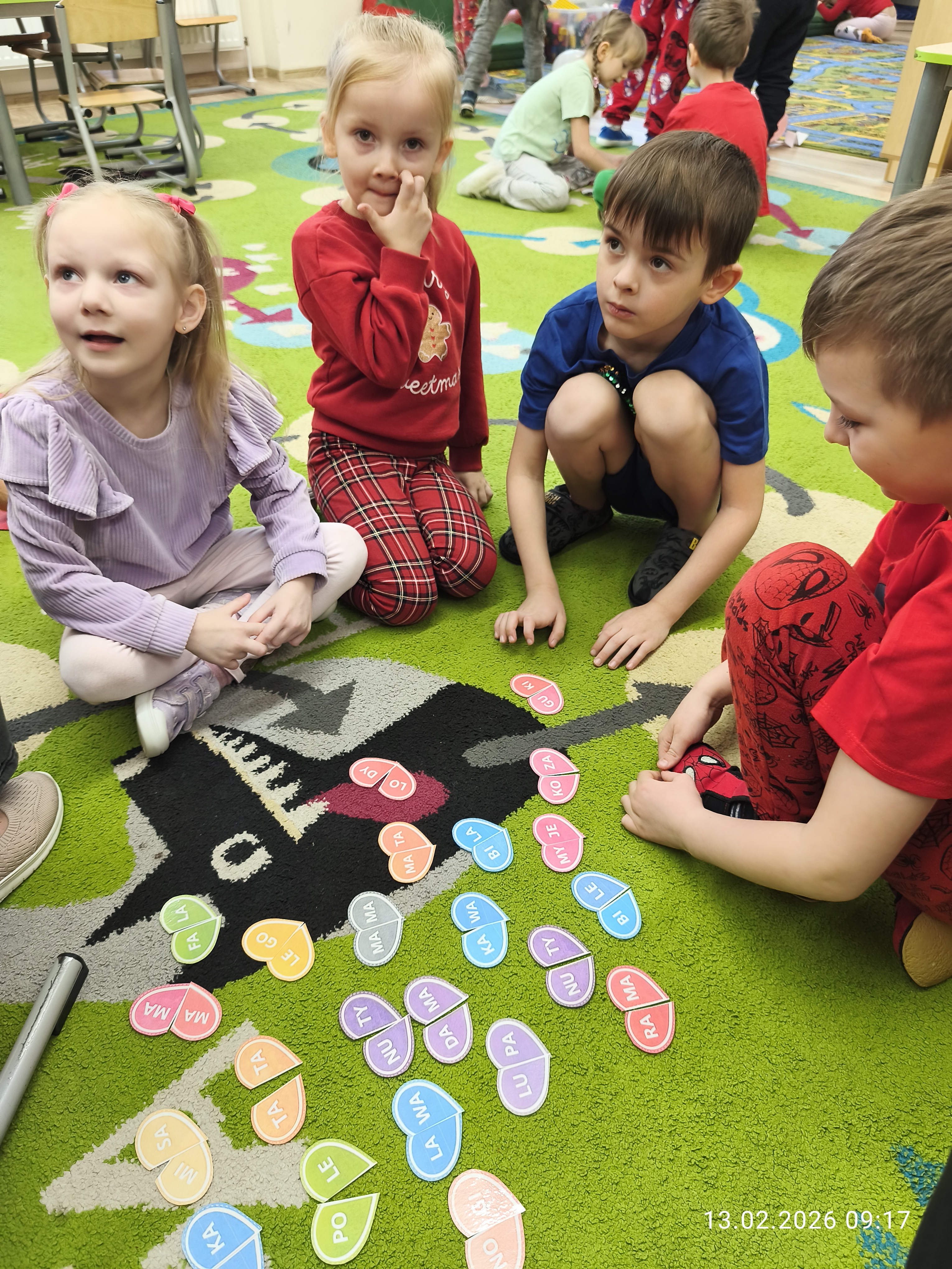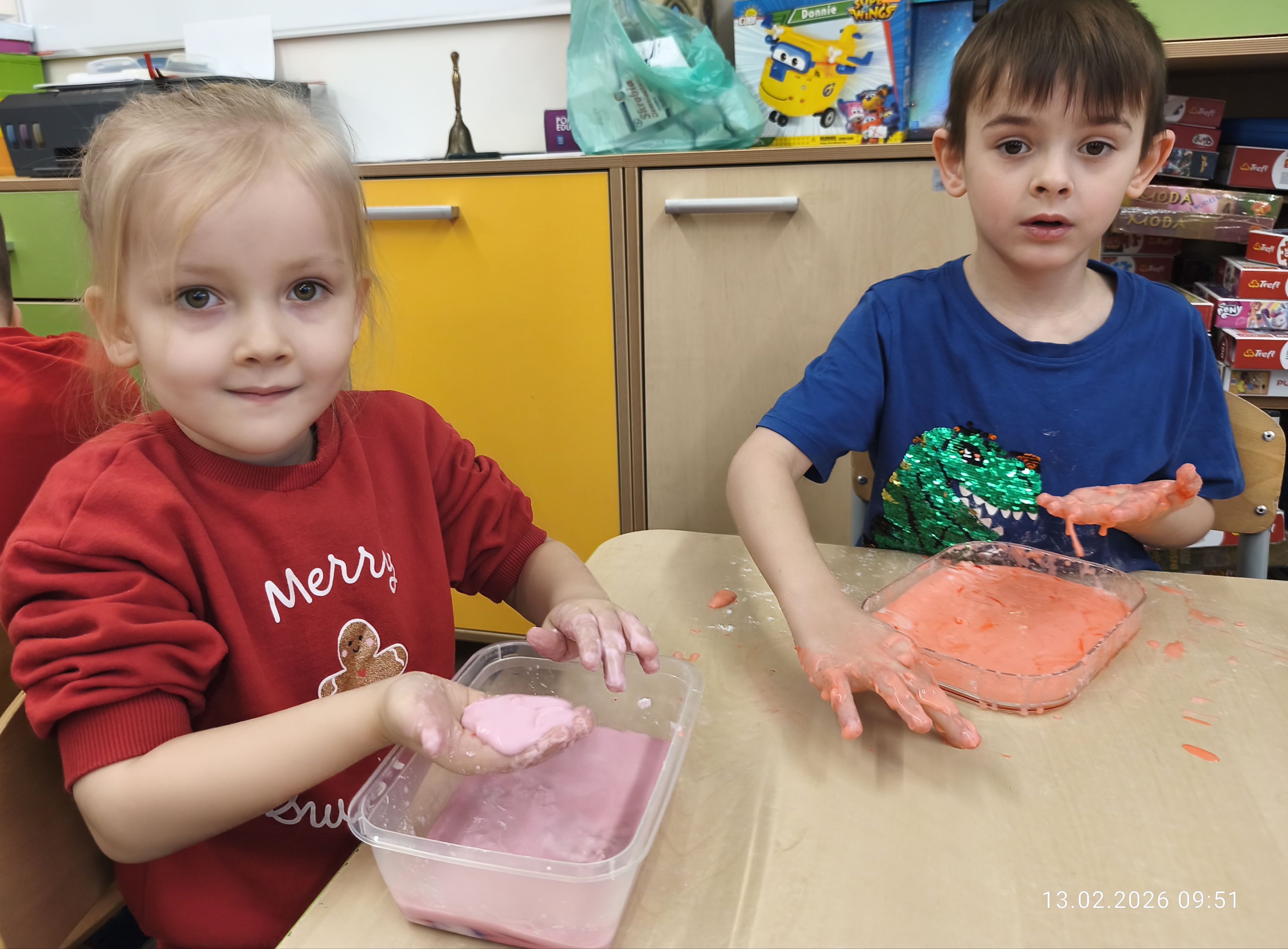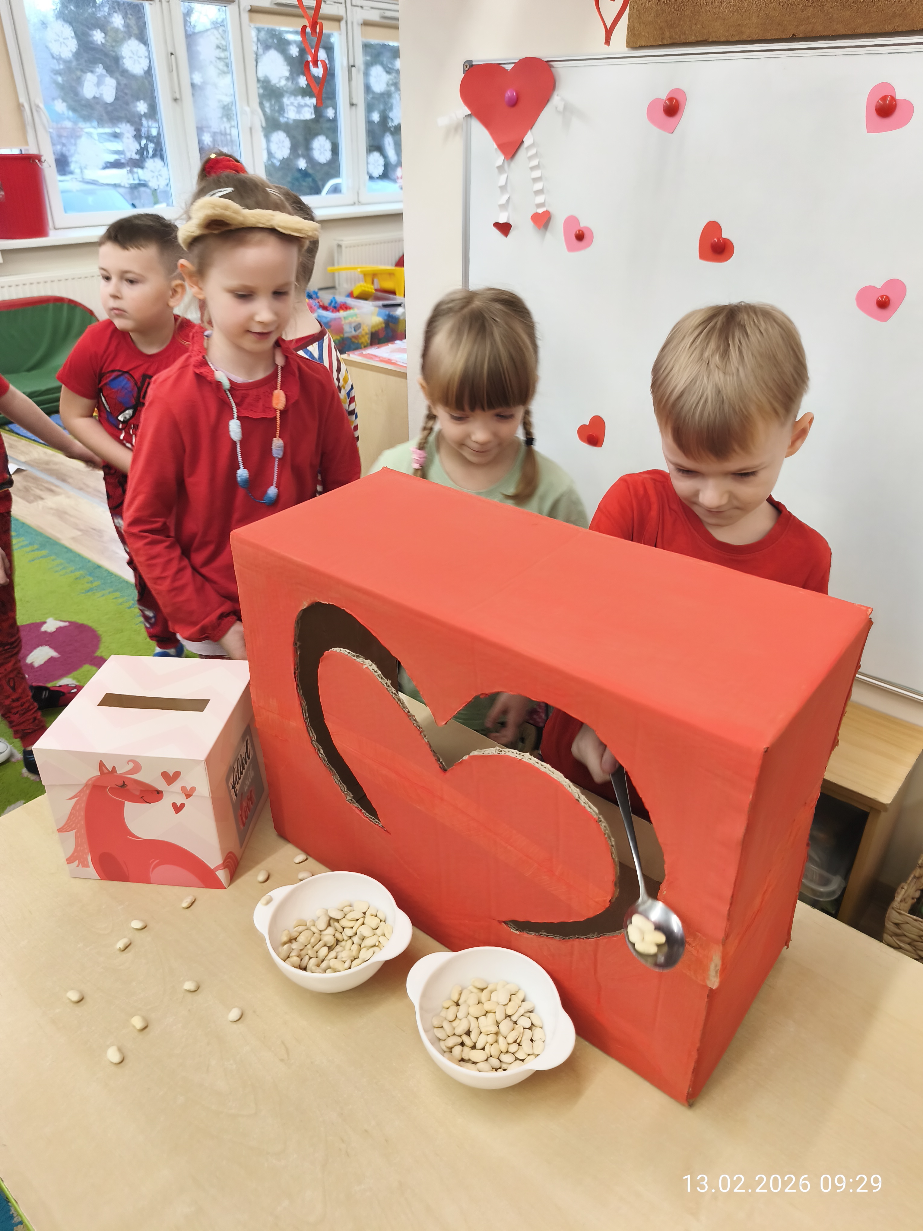 Walentynkowy piątkowy dzień w zerówce, był pełen radości, zabawy i nauki. Dzieci z entuzjazmem uczestniczyły w zabawach sensorycznych z cieczą nienewtonowską. Podczas walentynkowej zabawy ćwiczyły koordynację ruchową oraz sprawność manualną, przesypując fasolę do miseczek. Układały serca z sylab i cyfr, rozwijając umiejętności językowe oraz matematyczne, a także brały udział w emocjonującym wyścigu balonów. Zajęcia sprzyjały integracji grupy, aktywności ruchowej i nauce poprzez zabawę, dostarczając wielu uśmiechów i pozytywnych emocji oraz tworząc wyjątkową, walentynkową atmosferę.