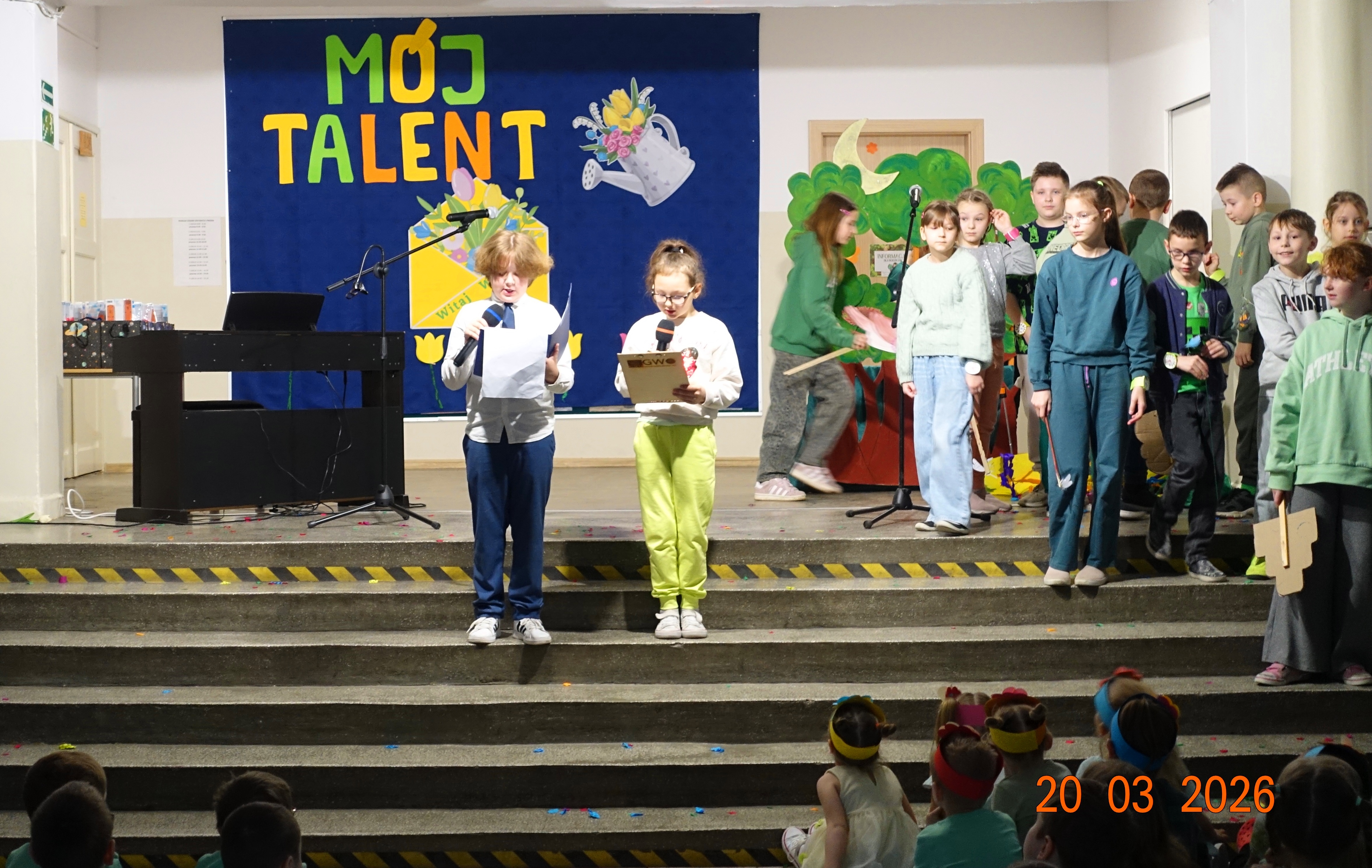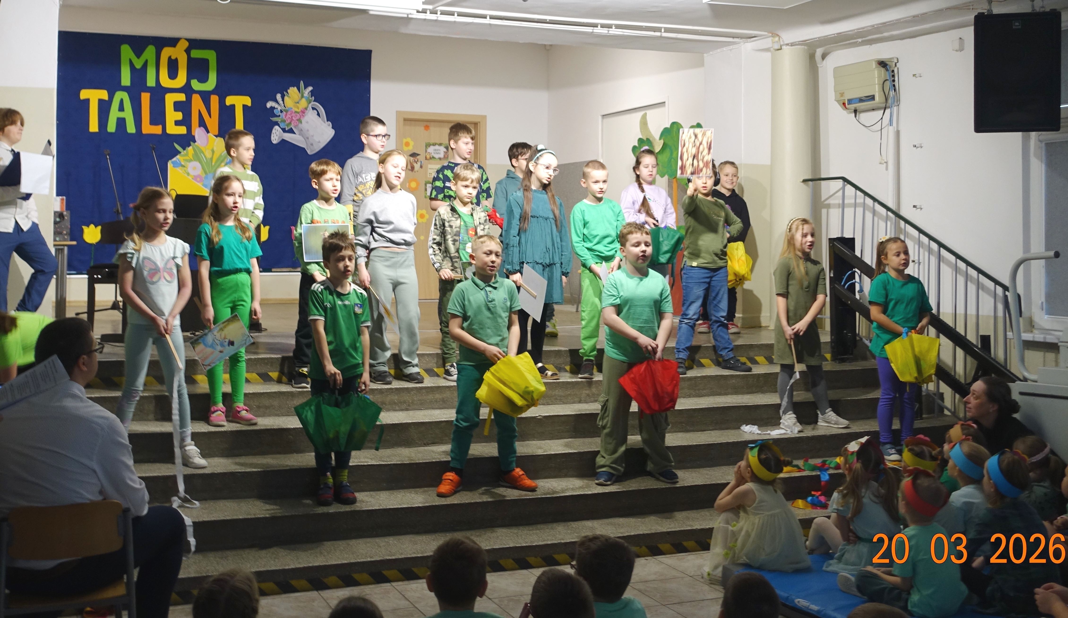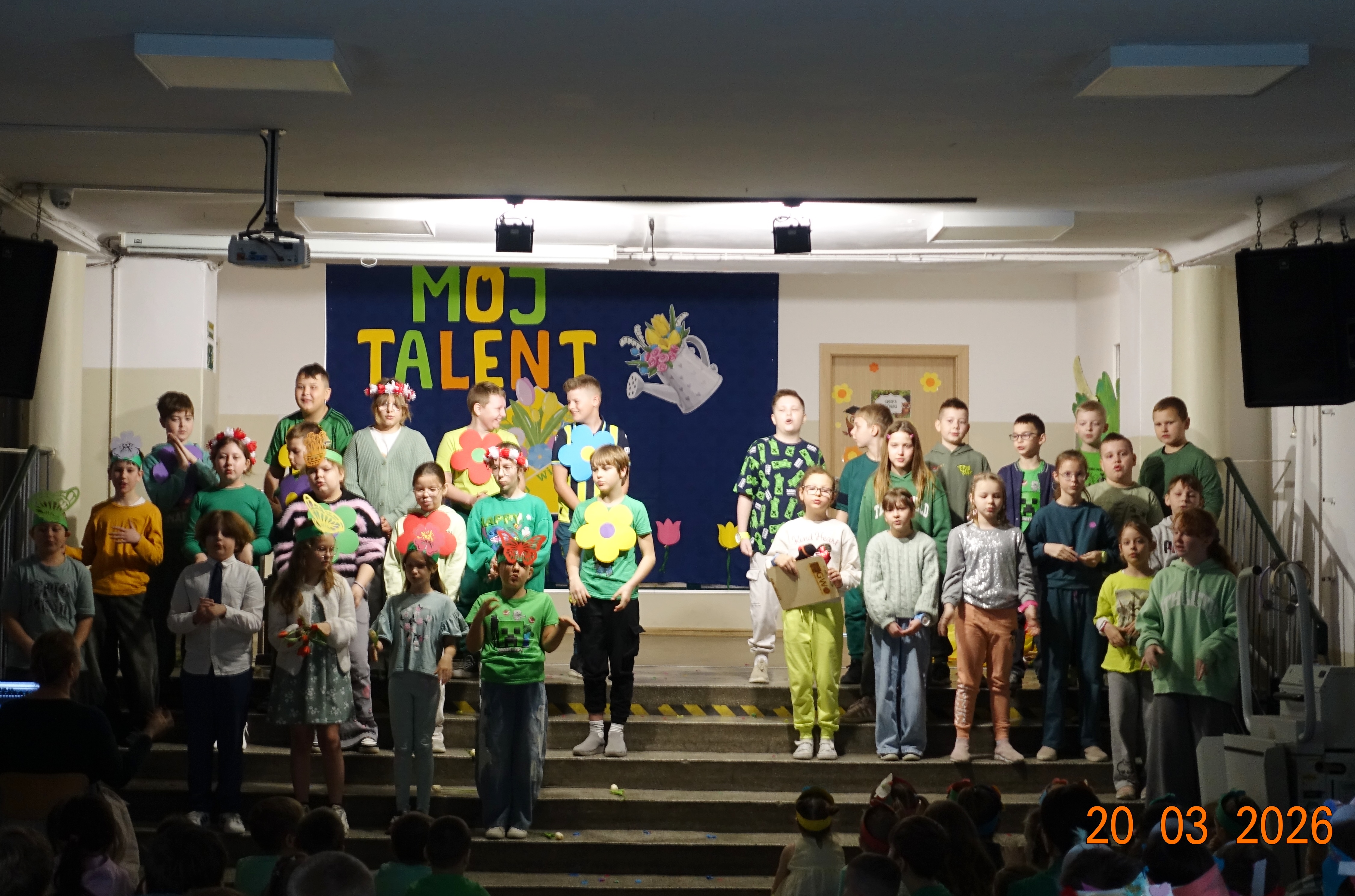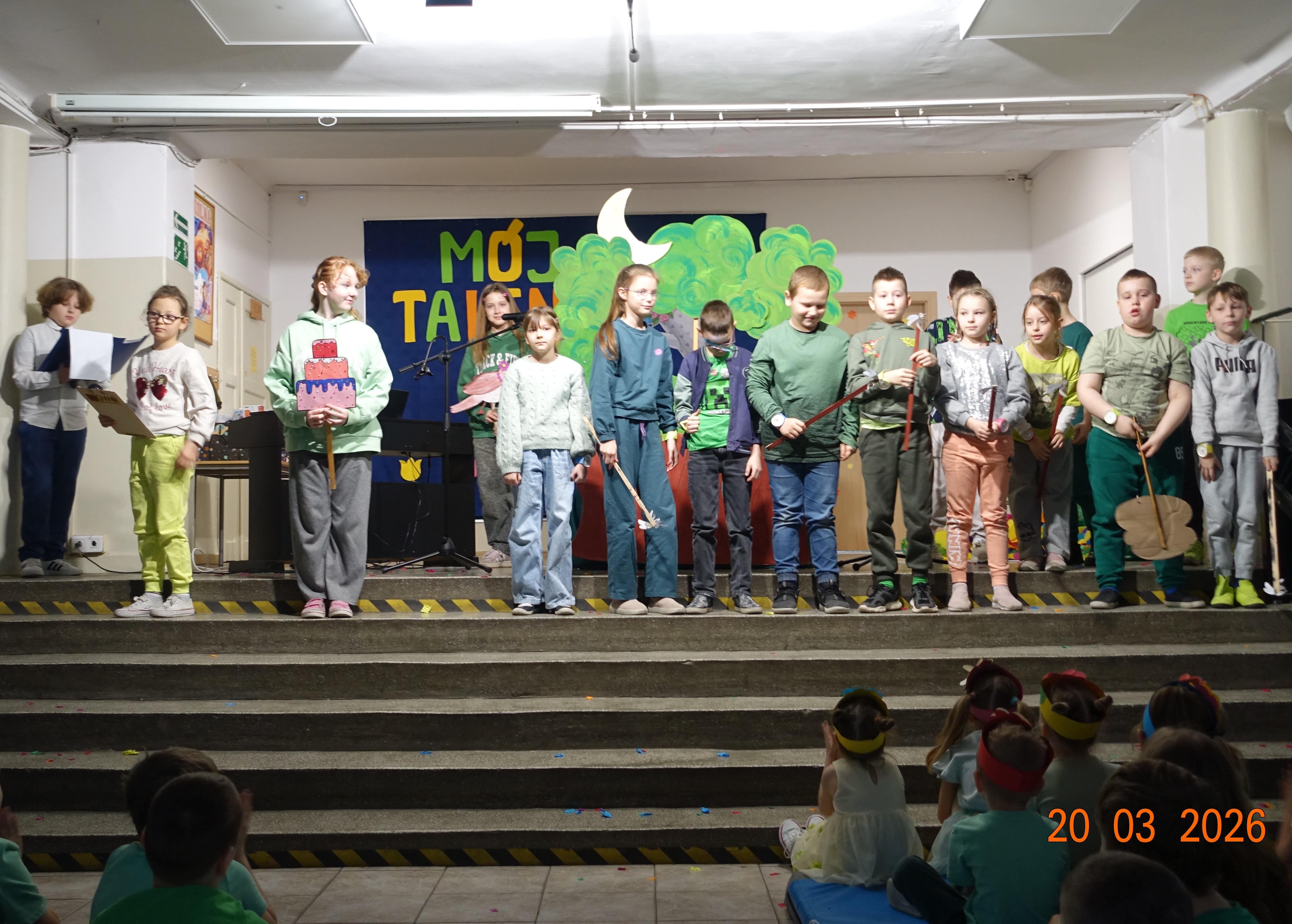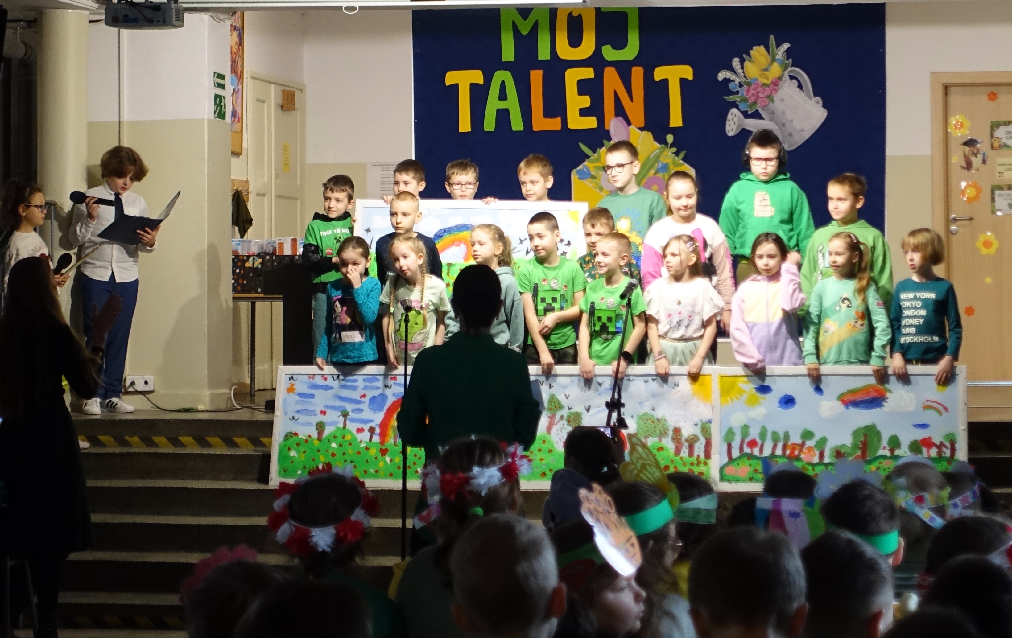 Nie zabrakło również emocji muzycznych, ponieważ wielu uczniów zdecydowało się na występy indywidualne. Soliści z wielką odwagą śpiewali piosenki, prezentując swoje głosy przed całą publicznością. Odbyły się także pozakonkursowe występy klasowe, uczniów z najmłodszych klas 0-III. Tutaj nie zabrakło przeplatanych wierszyków z rytmicznymi przyśpiewkami co sprawiało, że występy nie nużyły szkolnej publiki. Każdy uczestnik włożył w swój pokaz mnóstwo serca i pracy, co było widać w każdym elemencie występu. Publiczność, często przebrana w wiosenne kreacje /zieleń w różnych odcieniach/ reagowała entuzjastycznie, nagradzając kolegów i koleżanki gromkimi brawami. Prowadzącym edycji Mój Talent, był Tomek i Maja z klasy III b.
