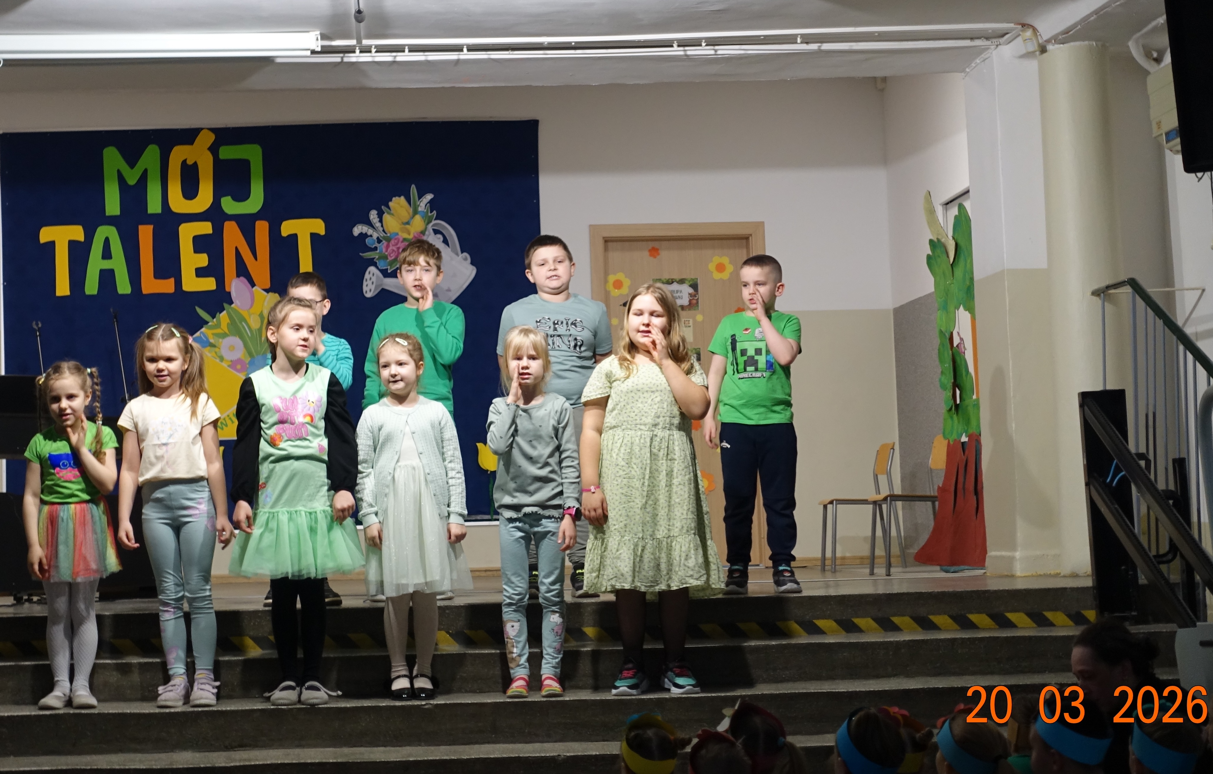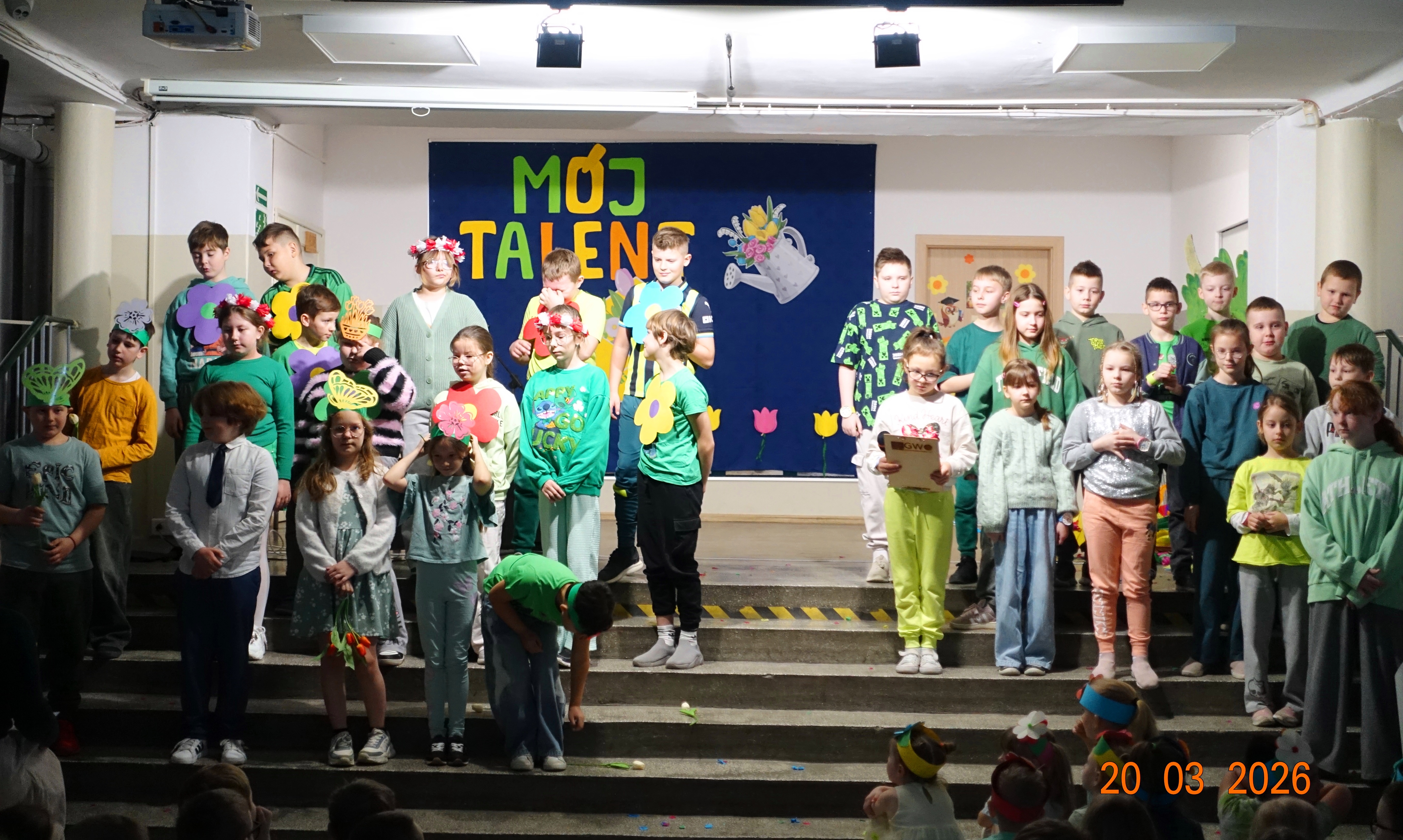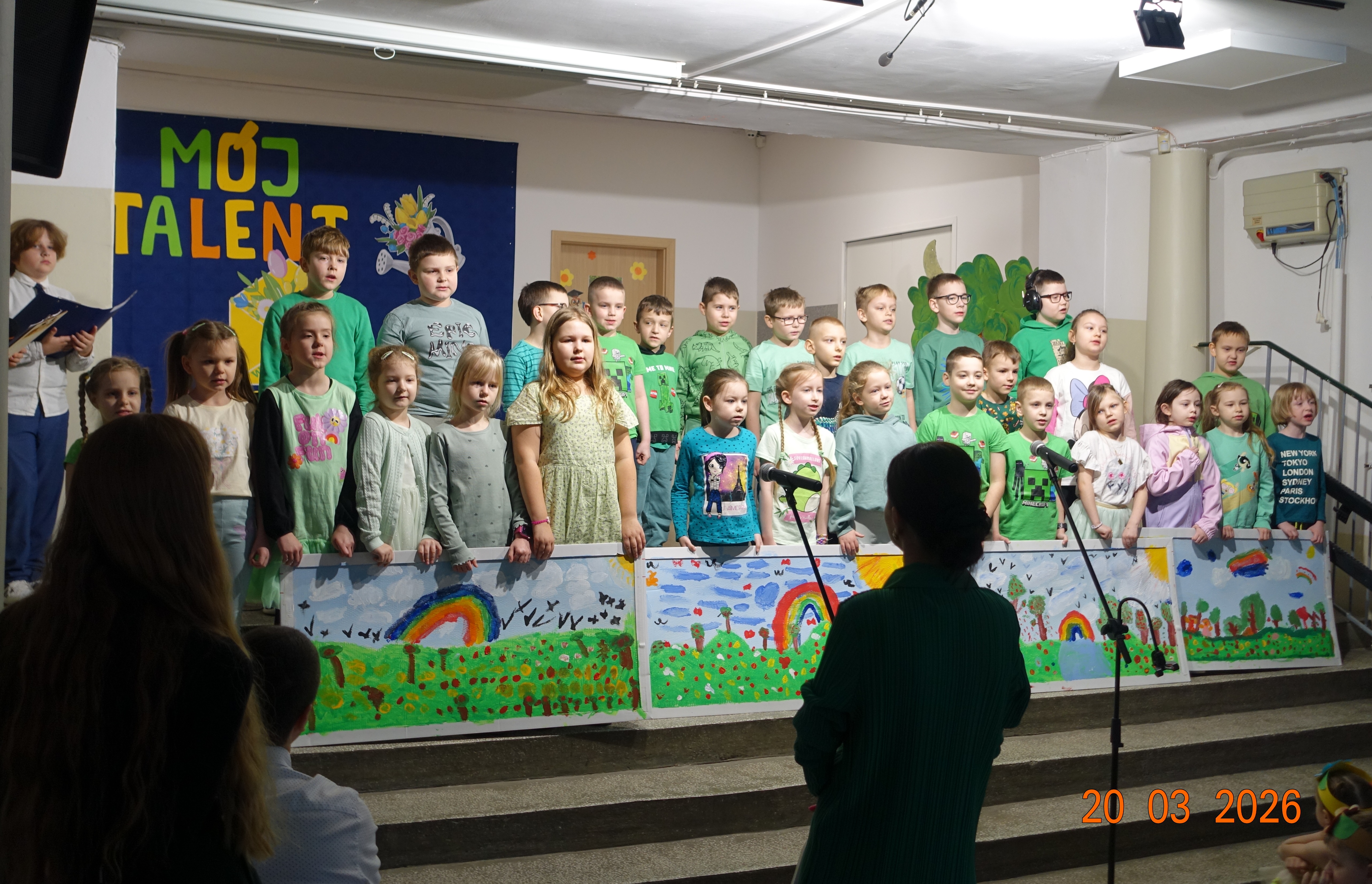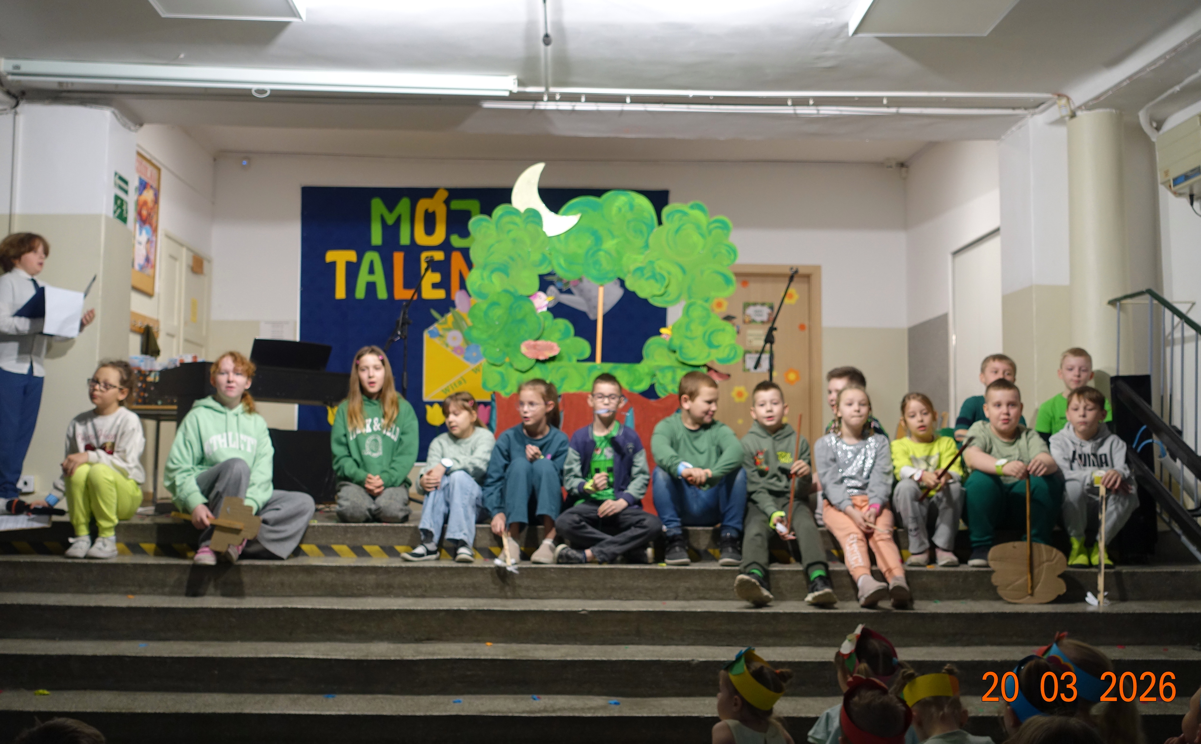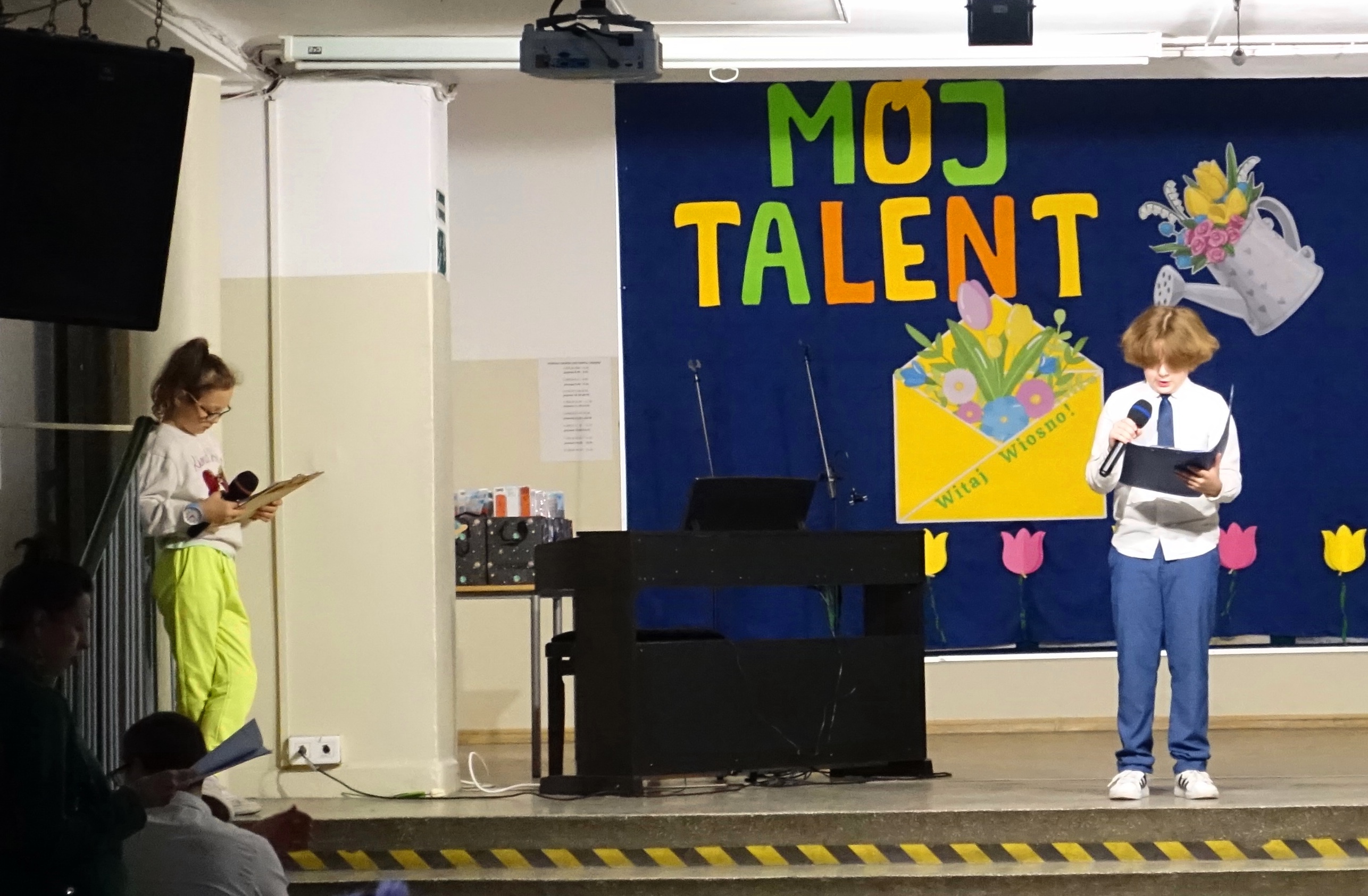 Nie zabrakło również emocji muzycznych, ponieważ wielu uczniów zdecydowało się na występy indywidualne. Soliści z wielką odwagą śpiewali piosenki, prezentując swoje głosy przed całą publicznością. Odbyły się także pozakonkursowe występy klasowe, uczniów z najmłodszych klas 0-III. Tutaj nie zabrakło przeplatanych wierszyków z rytmicznymi przyśpiewkami co sprawiało, że występy nie nużyły szkolnej publiki. Każdy uczestnik włożył w swój pokaz mnóstwo serca i pracy, co było widać w każdym elemencie występu. Publiczność, często przebrana w wiosenne kreacje /zieleń w różnych odcieniach/ reagowała entuzjastycznie, nagradzając kolegów i koleżanki gromkimi brawami. Prowadzącym edycji Mój Talent, był Tomek i Maja z klasy III b.