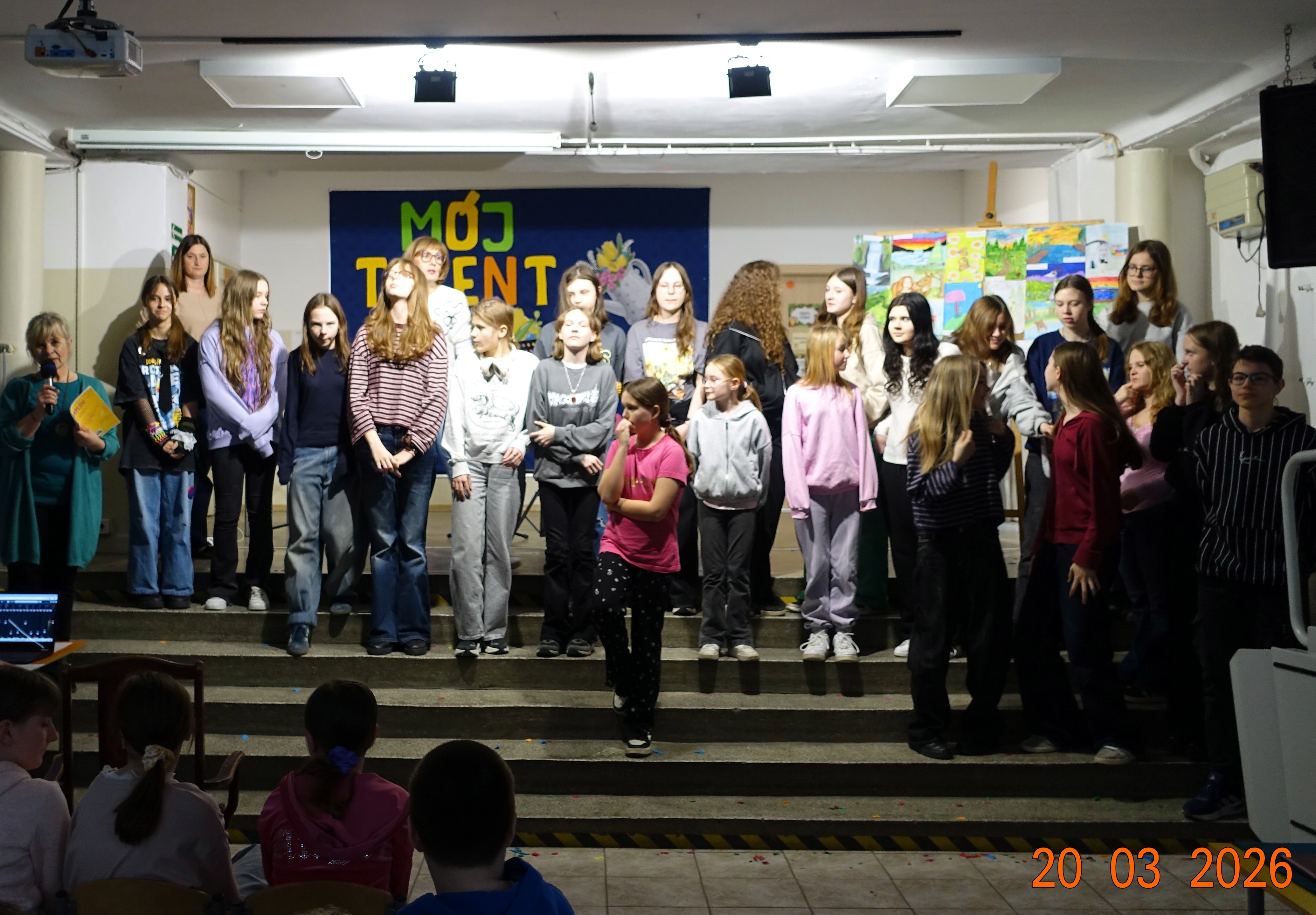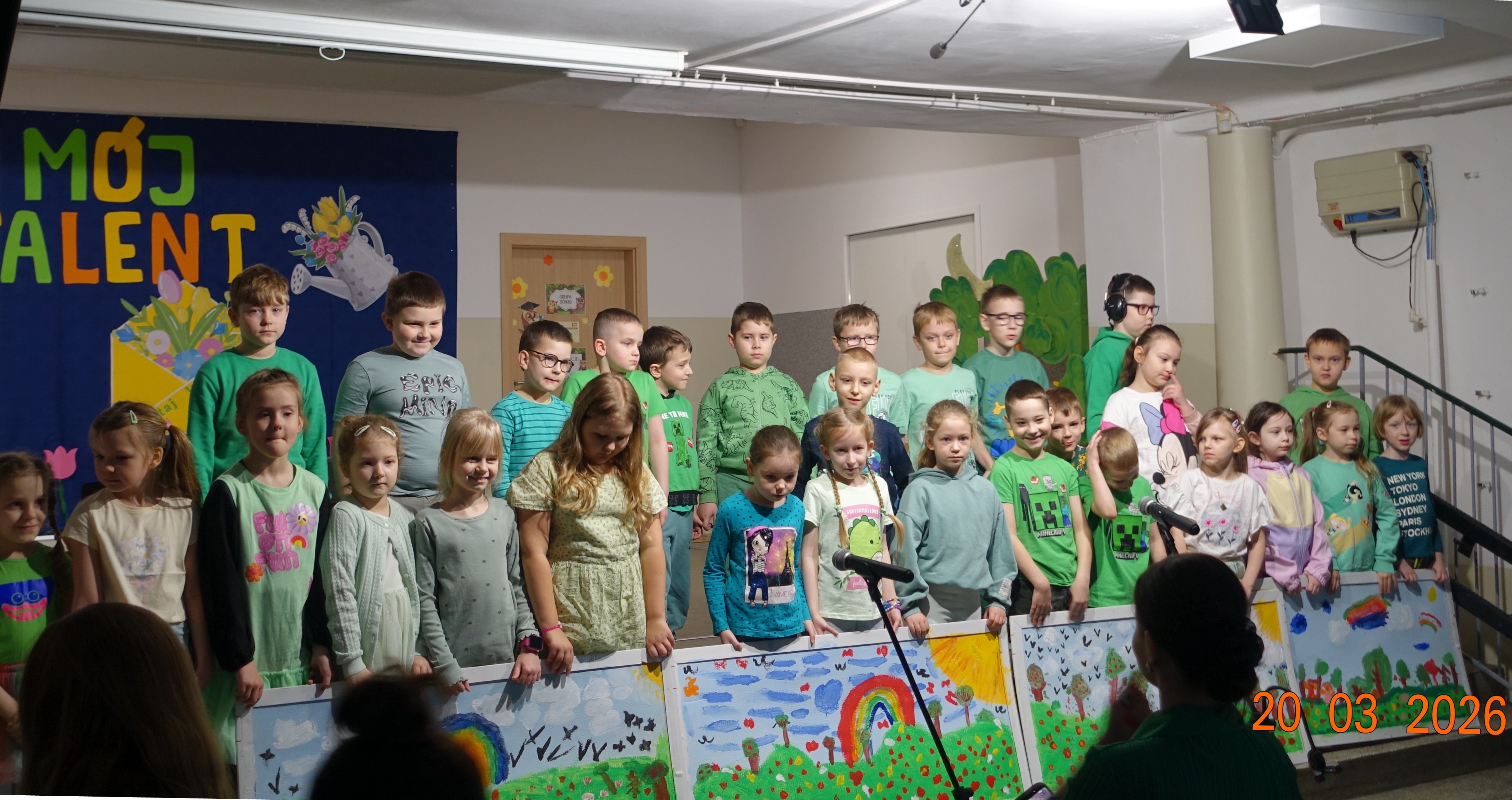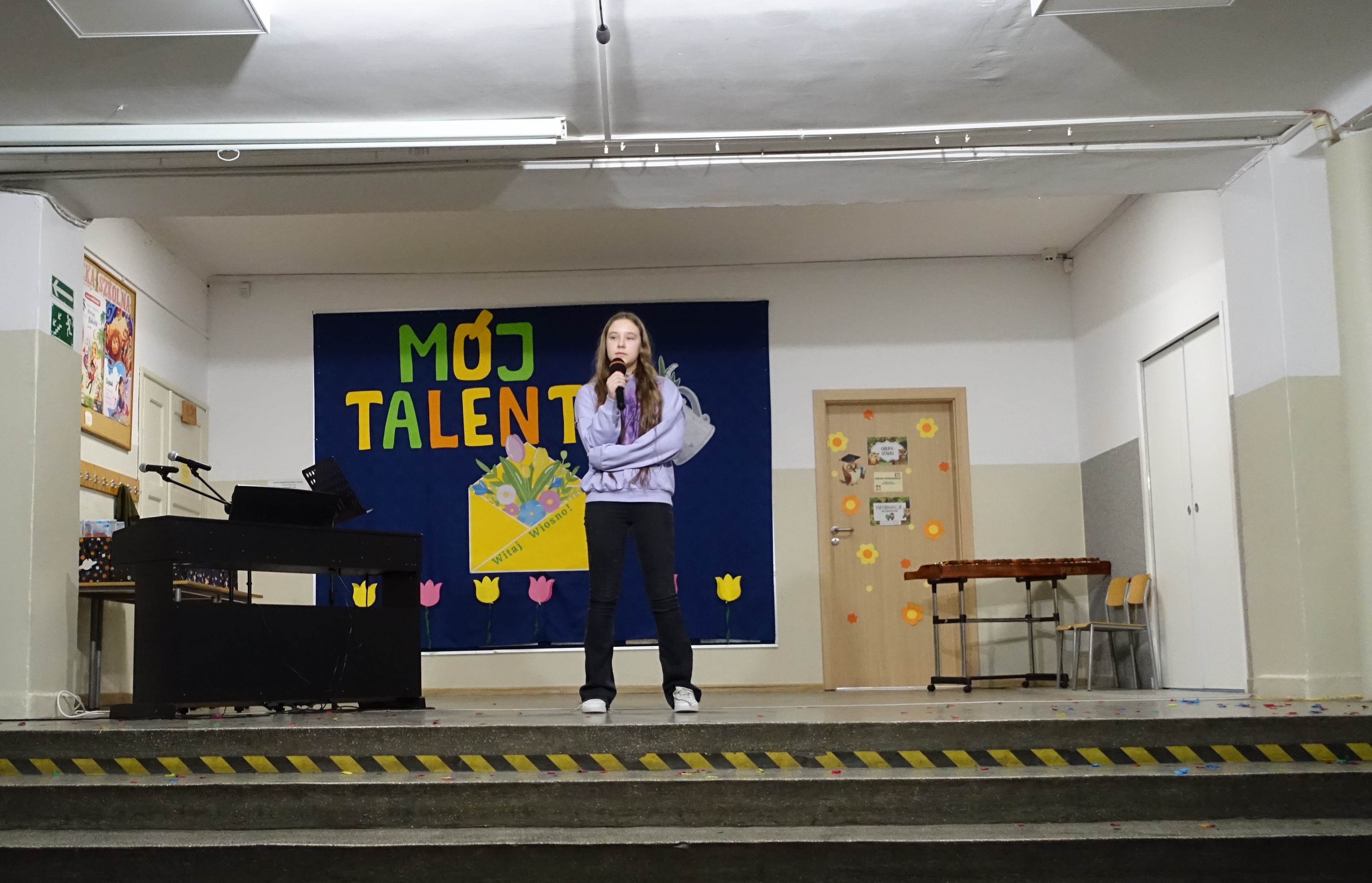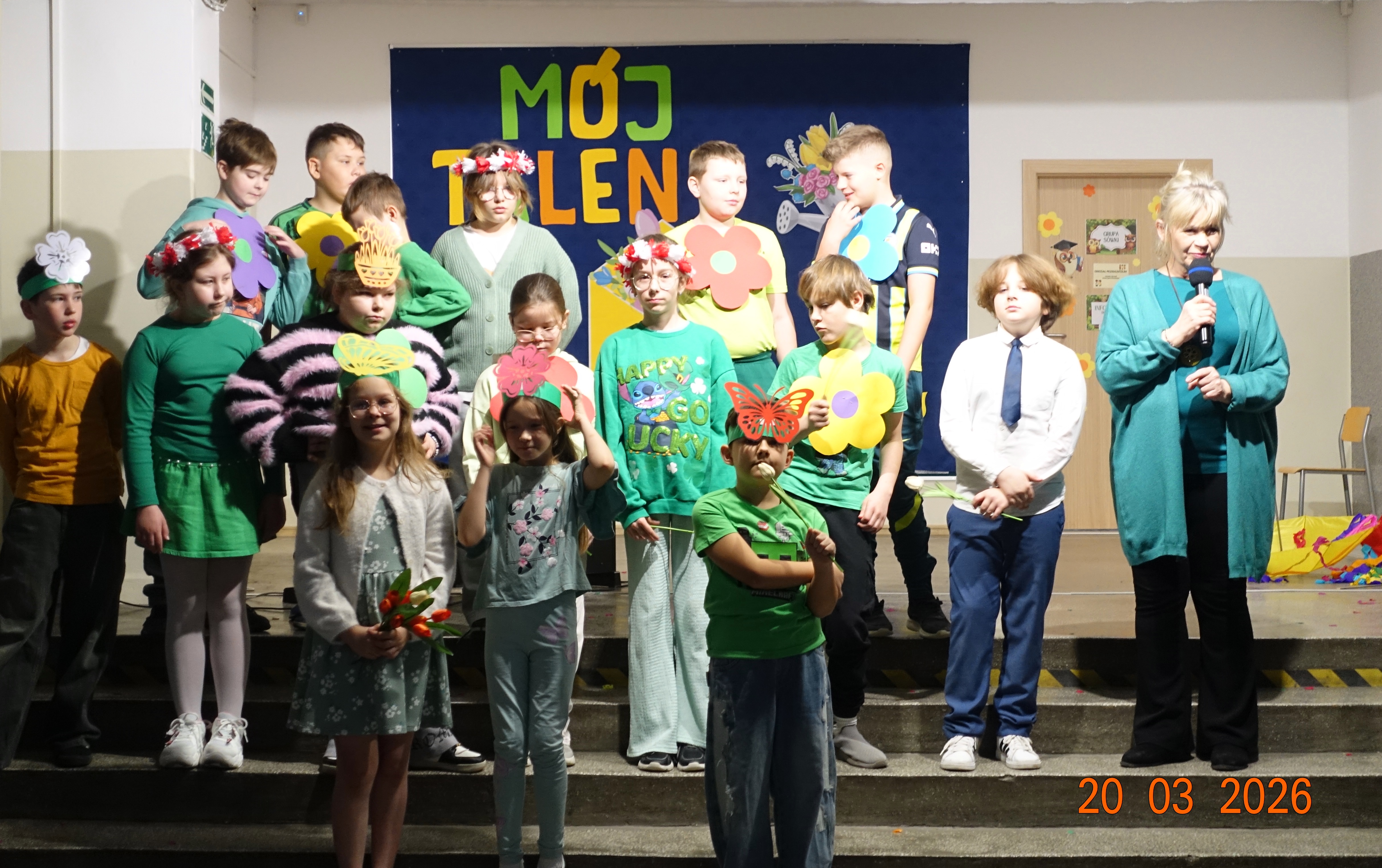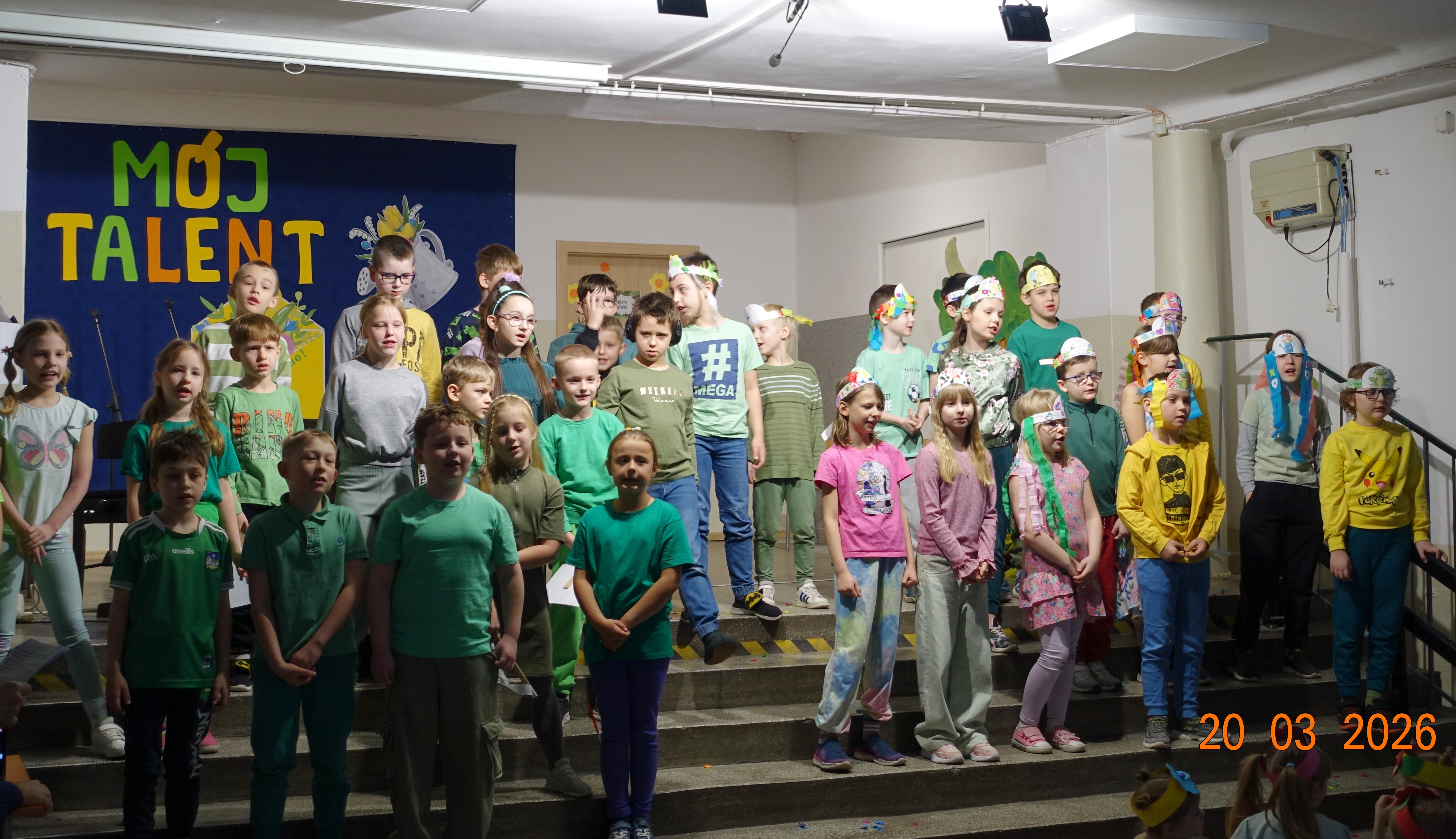 Nie zabrakło również emocji muzycznych, ponieważ wielu uczniów zdecydowało się na występy indywidualne. Soliści z wielką odwagą śpiewali piosenki, prezentując swoje głosy przed całą publicznością. Odbyły się także pozakonkursowe występy klasowe, uczniów z najmłodszych klas 0-III. Tutaj nie zabrakło przeplatanych wierszyków z rytmicznymi przyśpiewkami co sprawiało, że występy nie nużyły szkolnej publiki. Każdy uczestnik włożył w swój pokaz mnóstwo serca i pracy, co było widać w każdym elemencie występu. Publiczność, często przebrana w wiosenne kreacje /zieleń w różnych odcieniach/ reagowała entuzjastycznie, nagradzając kolegów i koleżanki gromkimi brawami. Prowadzącym edycji Mój Talent, był Tomek i Maja z klasy III b.