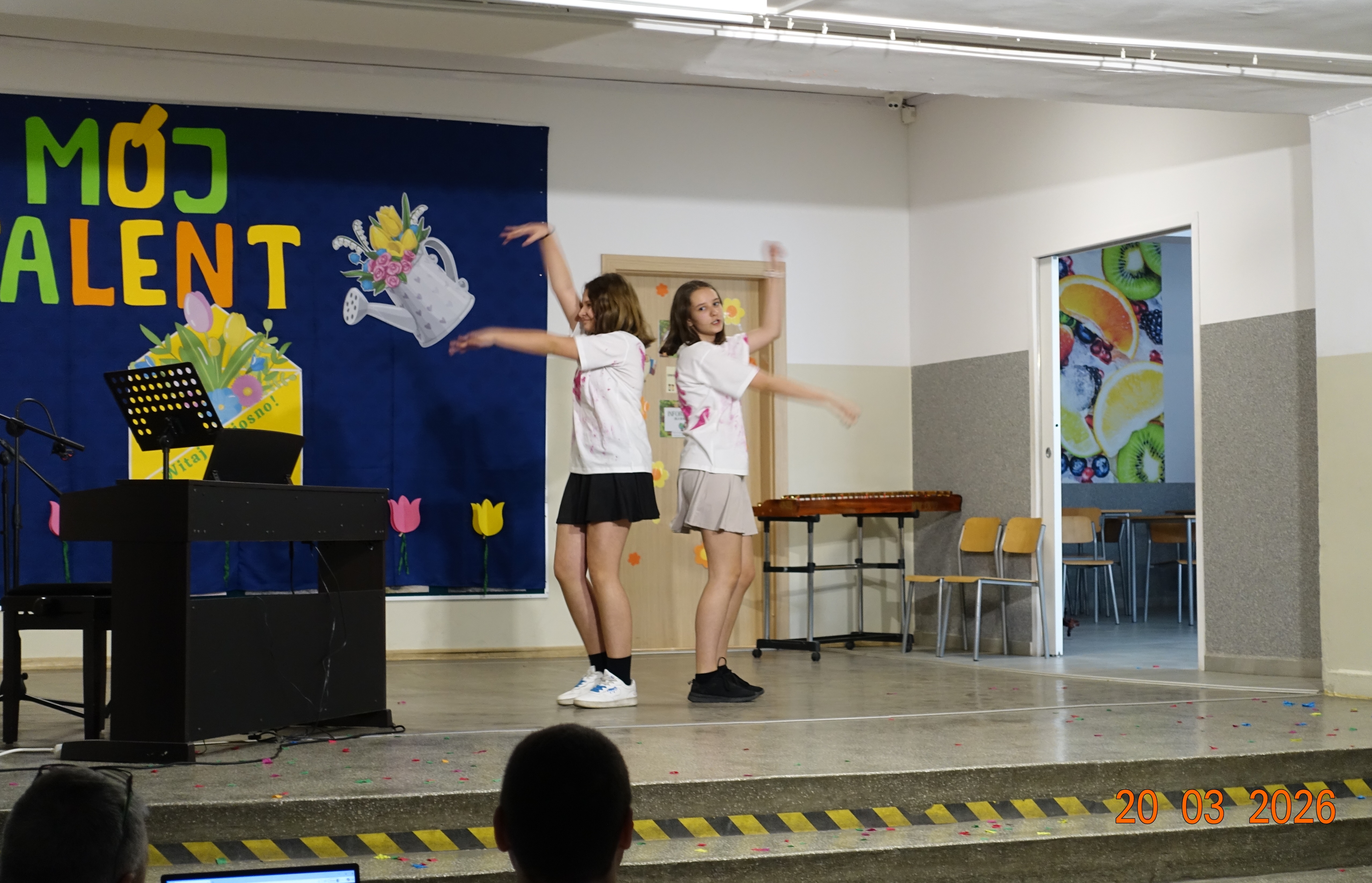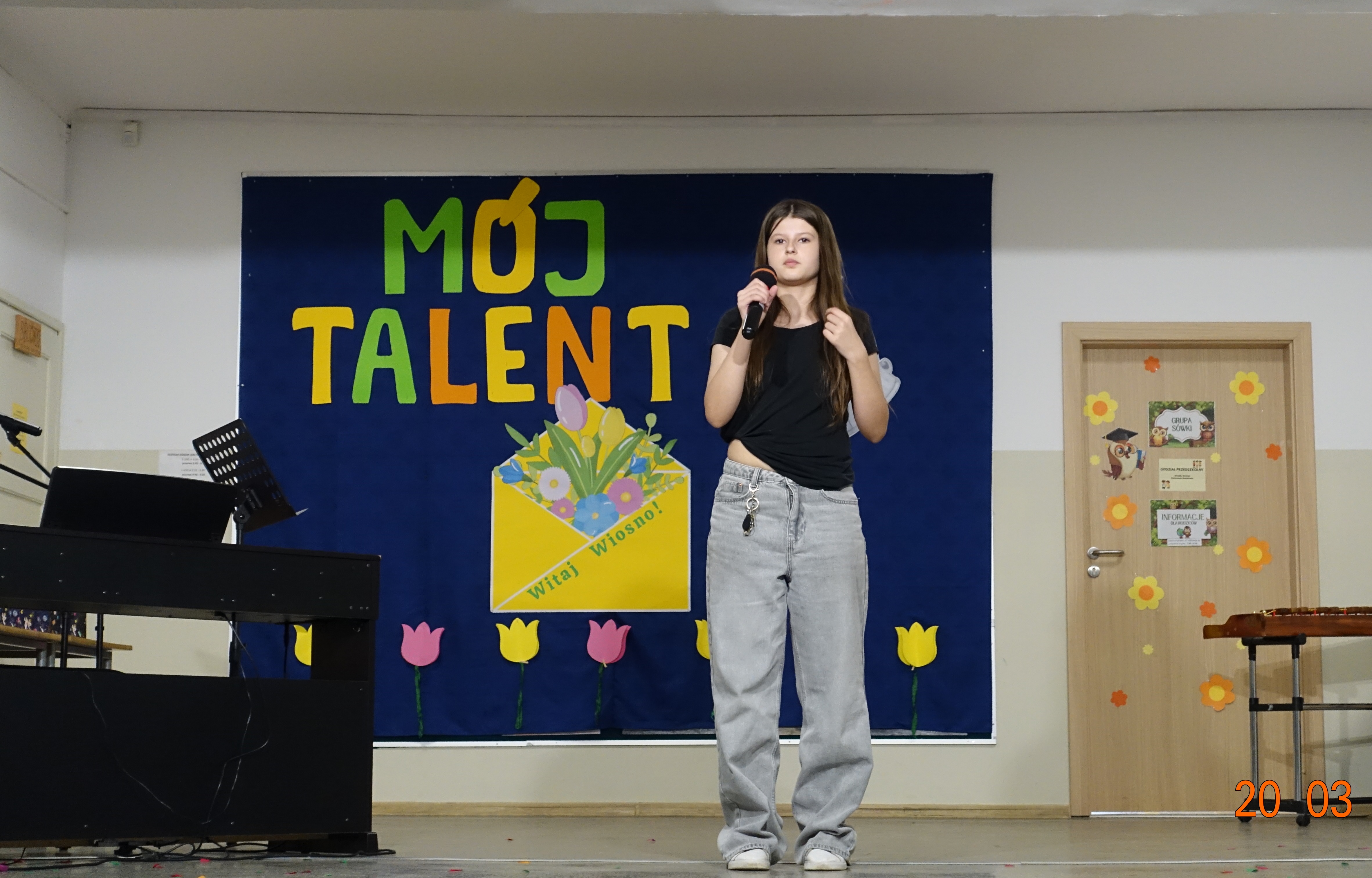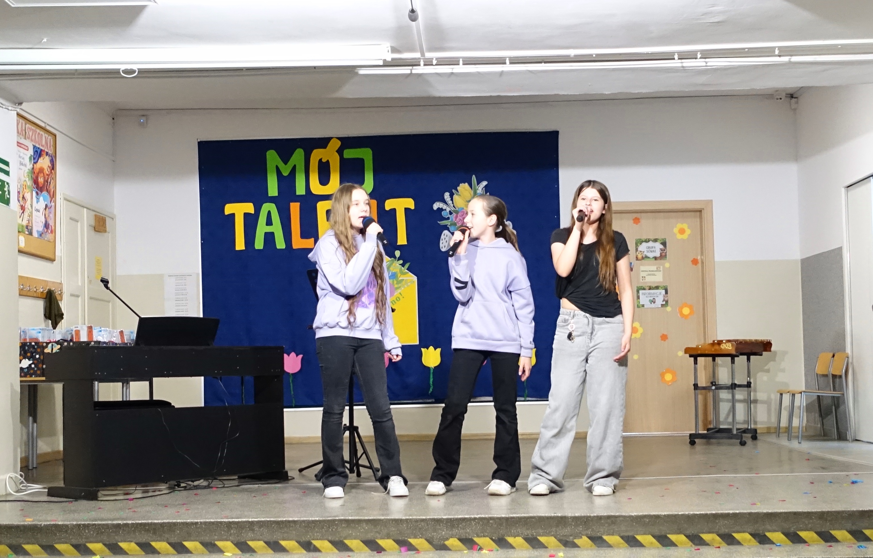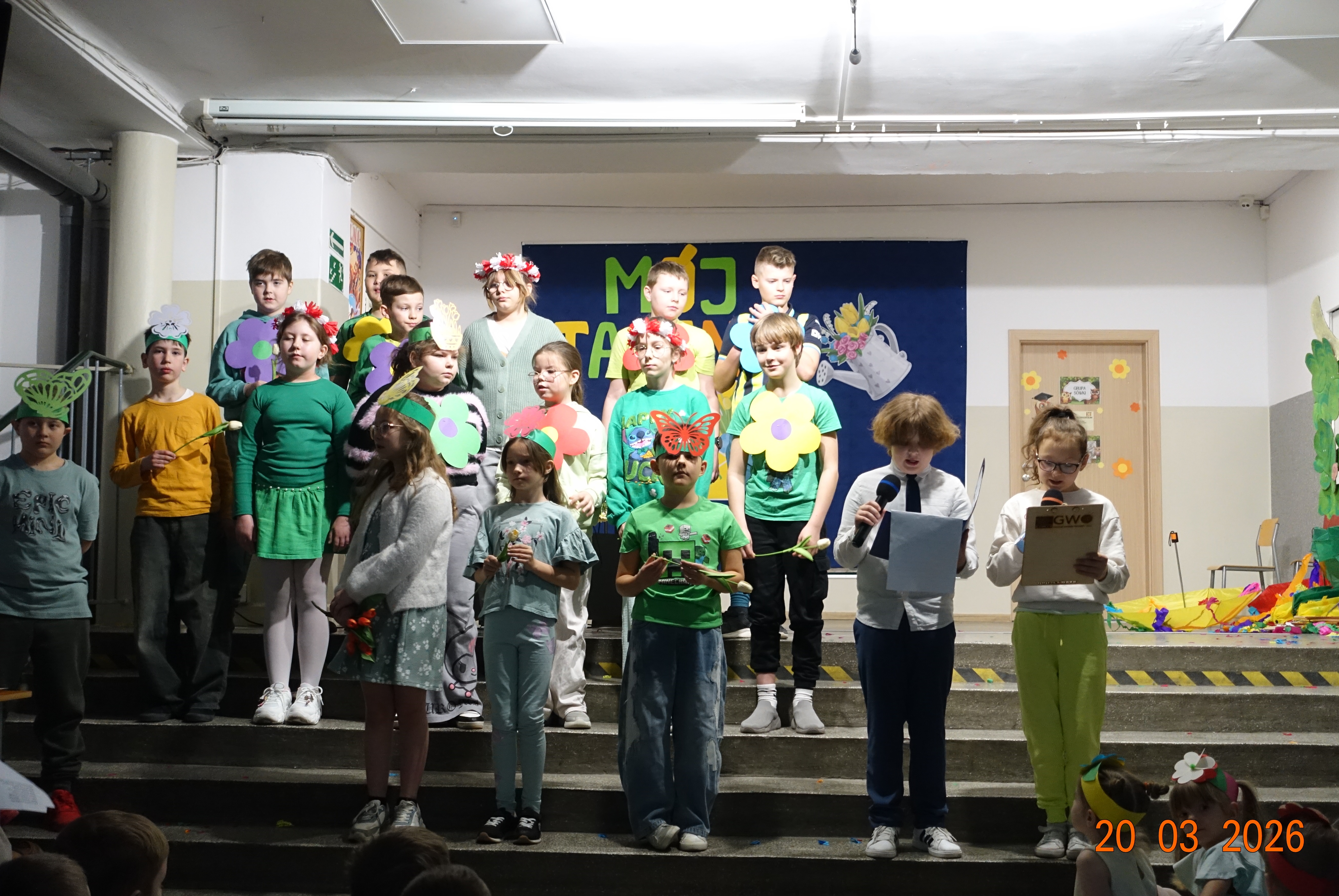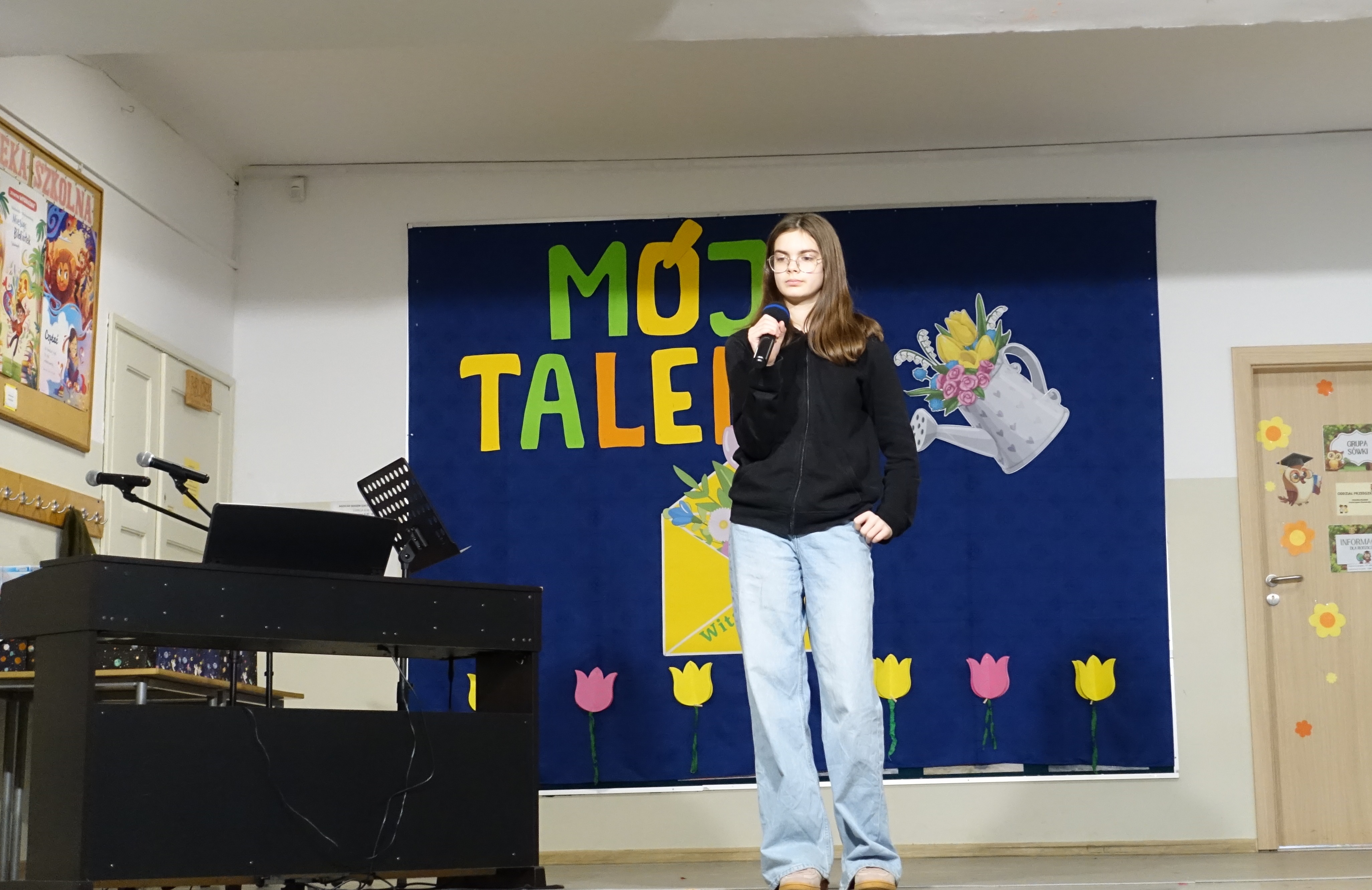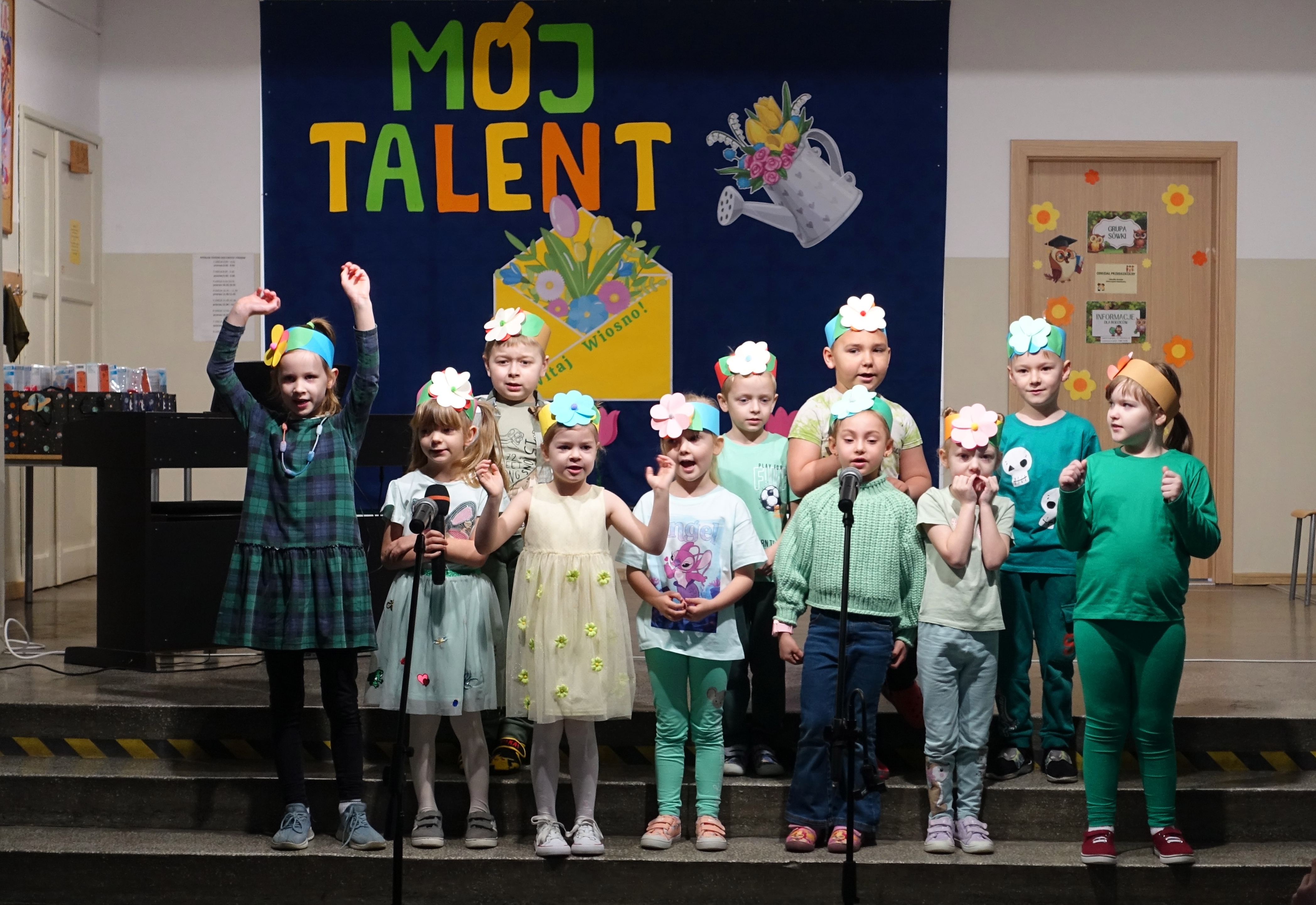 Nie zabrakło również emocji muzycznych, ponieważ wielu uczniów zdecydowało się na występy indywidualne. Soliści z wielką odwagą śpiewali piosenki, prezentując swoje głosy przed całą publicznością. Odbyły się także pozakonkursowe występy klasowe, uczniów z najmłodszych klas 0-III. Tutaj nie zabrakło przeplatanych wierszyków z rytmicznymi przyśpiewkami co sprawiało, że występy nie nużyły szkolnej publiki. Każdy uczestnik włożył w swój pokaz mnóstwo serca i pracy, co było widać w każdym elemencie występu. Publiczność, często przebrana w wiosenne kreacje /zieleń w różnych odcieniach/ reagowała entuzjastycznie, nagradzając kolegów i koleżanki gromkimi brawami. Prowadzącym edycji Mój Talent, był Tomek i Maja z klasy III b.