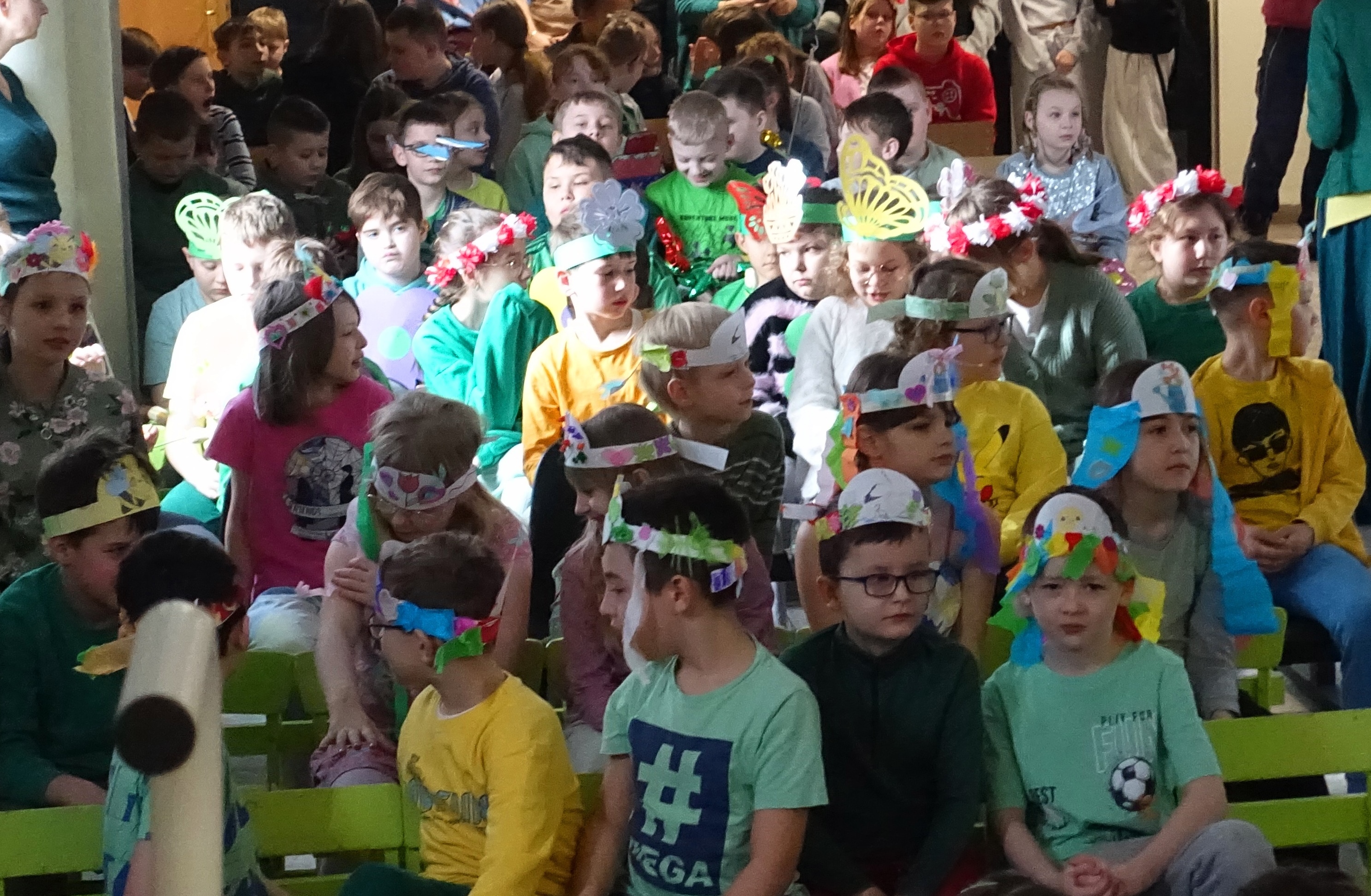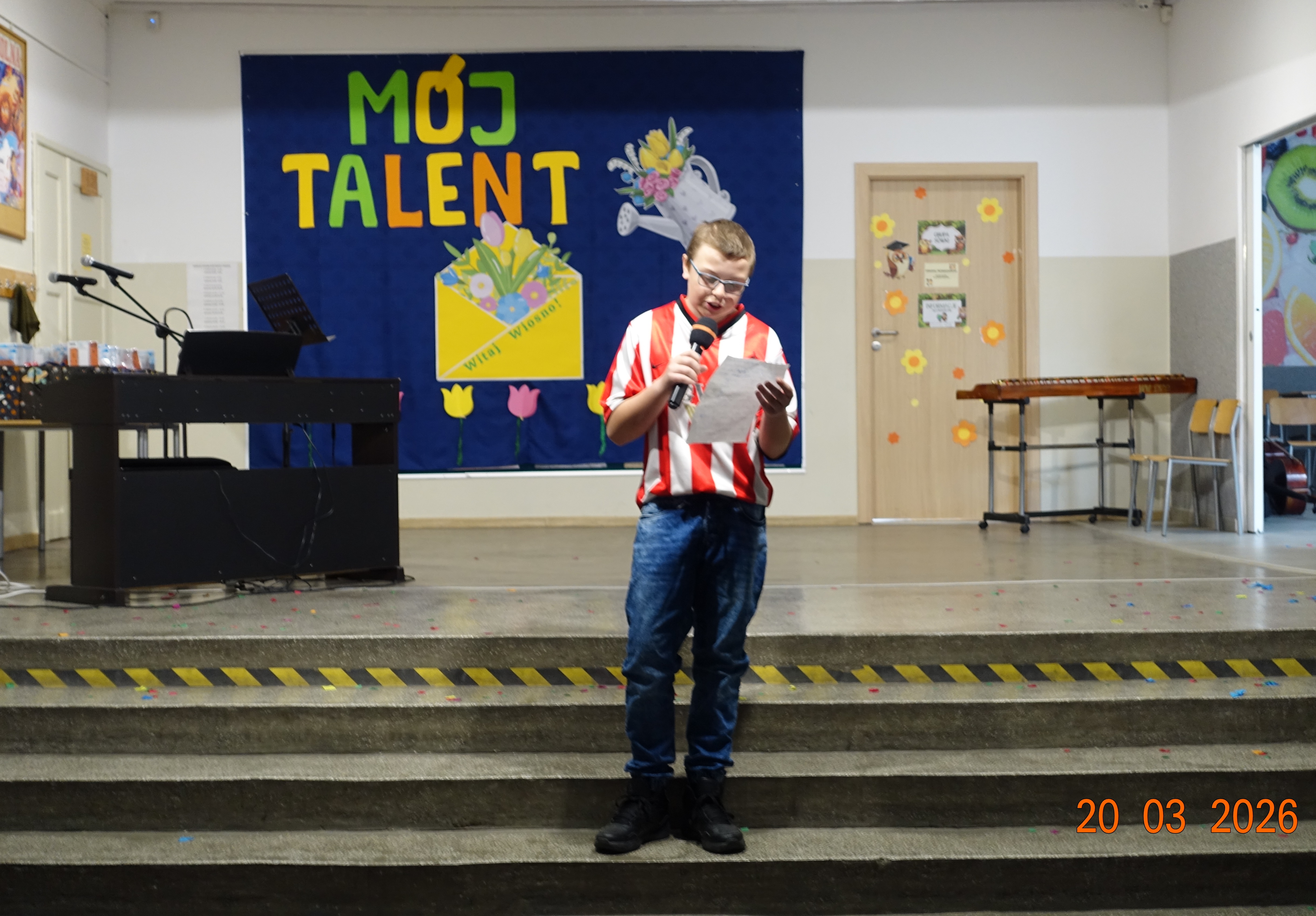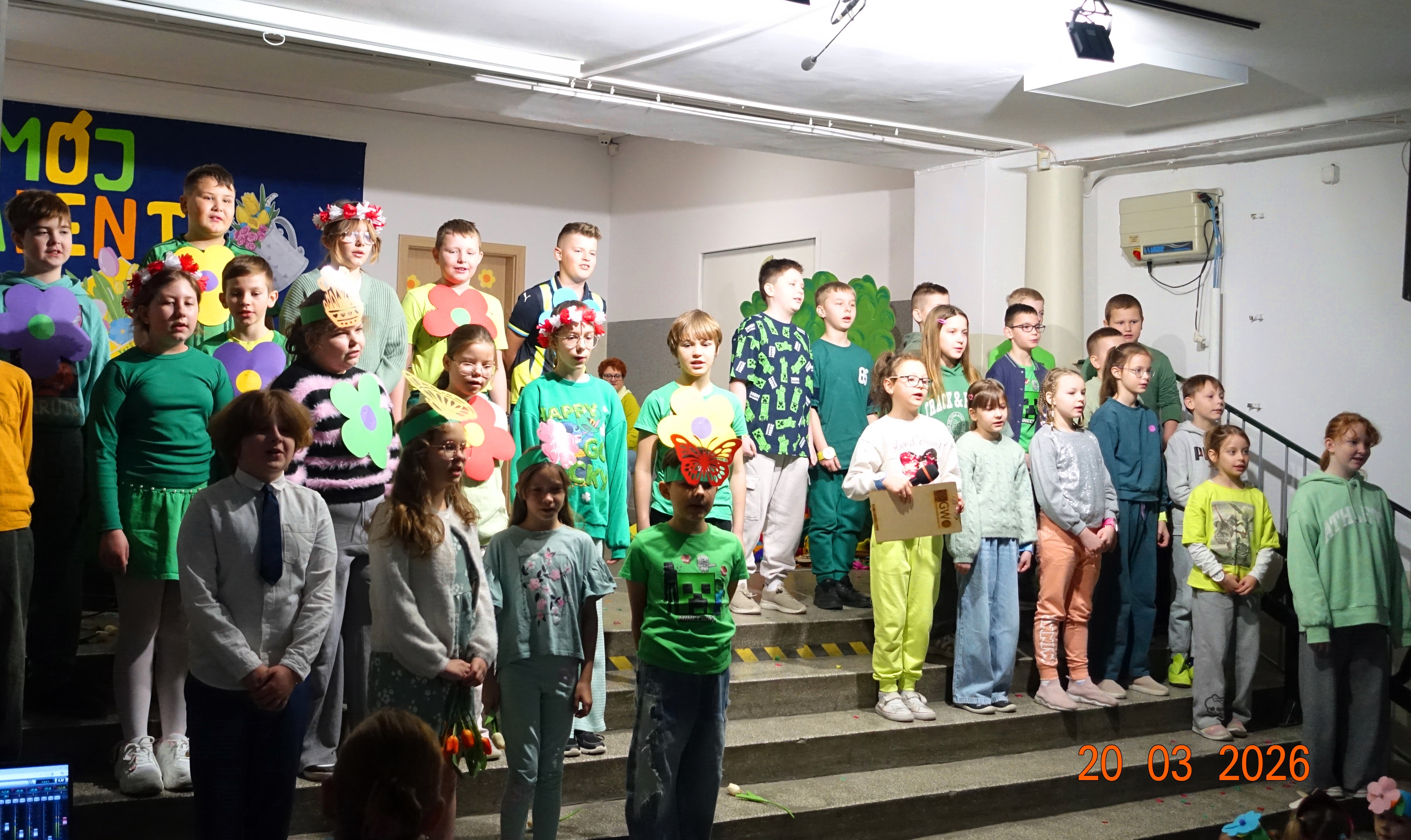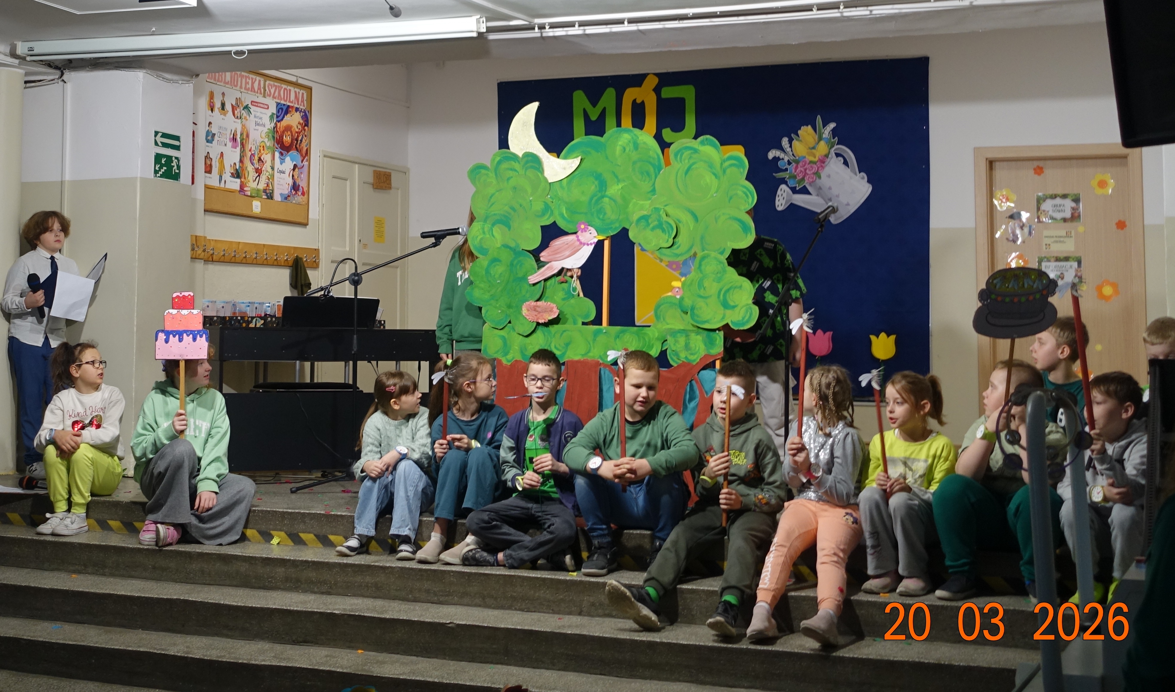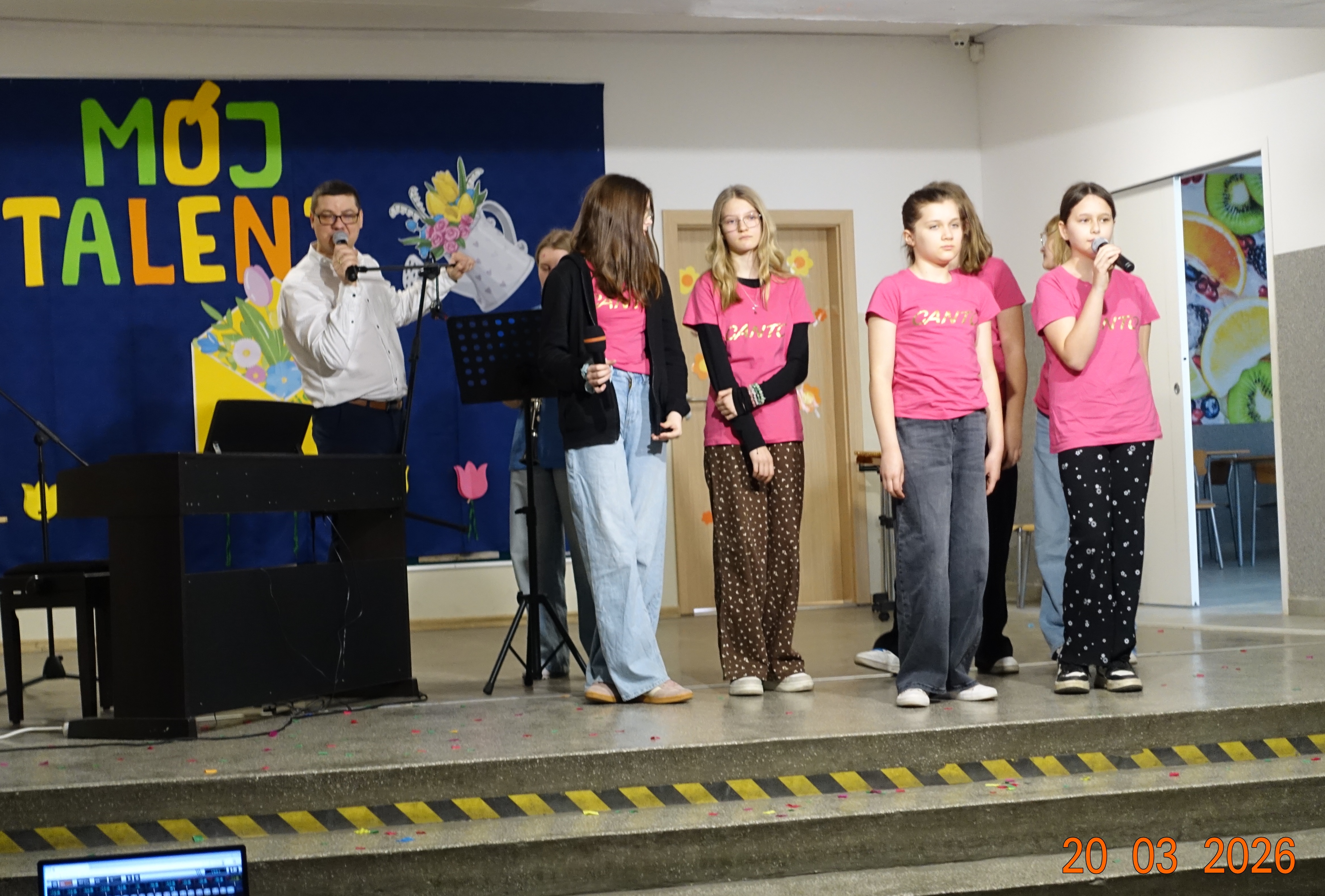 Nie zabrakło również emocji muzycznych, ponieważ wielu uczniów zdecydowało się na występy indywidualne. Soliści z wielką odwagą śpiewali piosenki, prezentując swoje głosy przed całą publicznością. Odbyły się także pozakonkursowe występy klasowe, uczniów z najmłodszych klas 0-III. Tutaj nie zabrakło przeplatanych wierszyków z rytmicznymi przyśpiewkami co sprawiało, że występy nie nużyły szkolnej publiki. Każdy uczestnik włożył w swój pokaz mnóstwo serca i pracy, co było widać w każdym elemencie występu. Publiczność, często przebrana w wiosenne kreacje /zieleń w różnych odcieniach/ reagowała entuzjastycznie, nagradzając kolegów i koleżanki gromkimi brawami. Prowadzącym edycji Mój Talent, był Tomek i Maja z klasy III b.