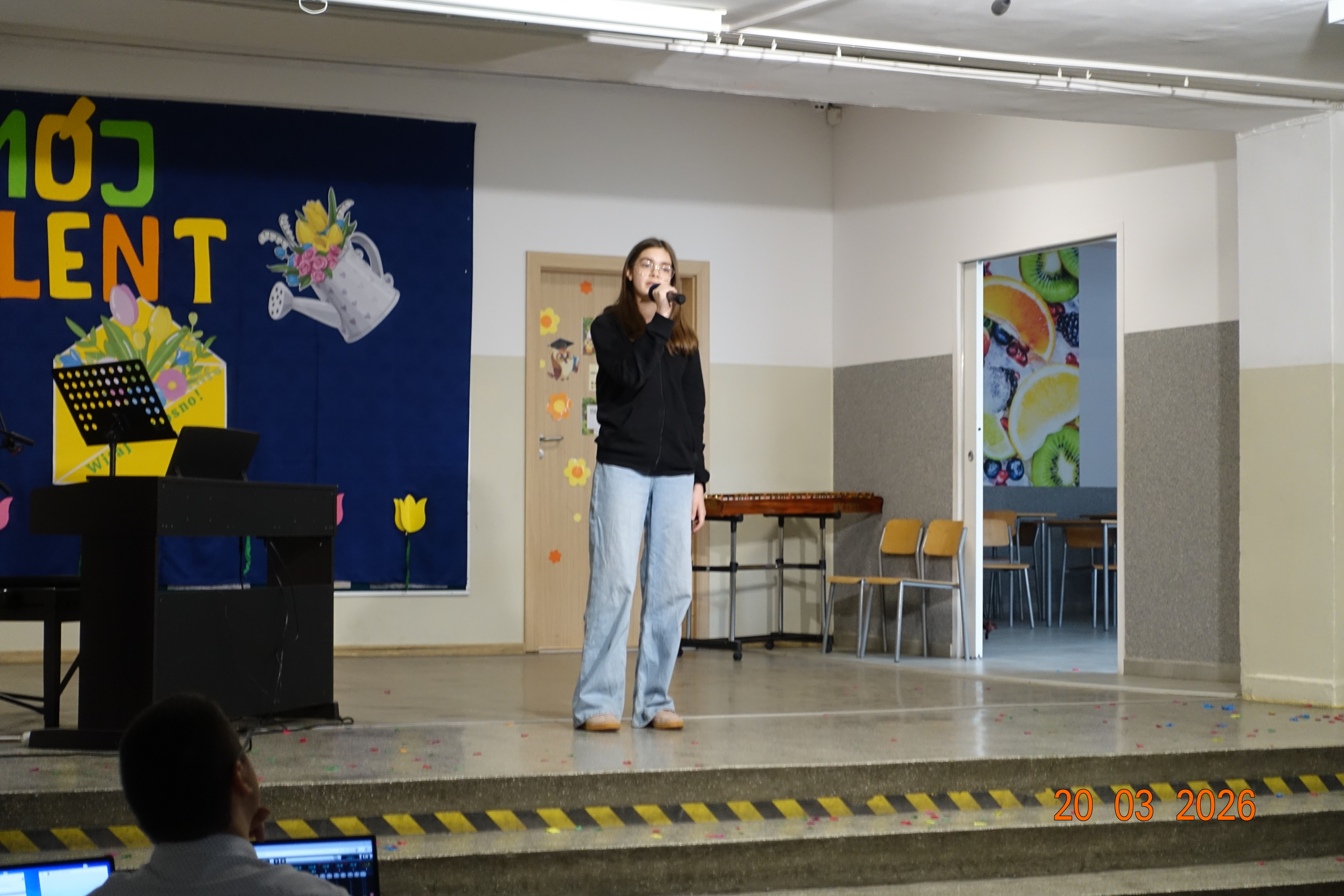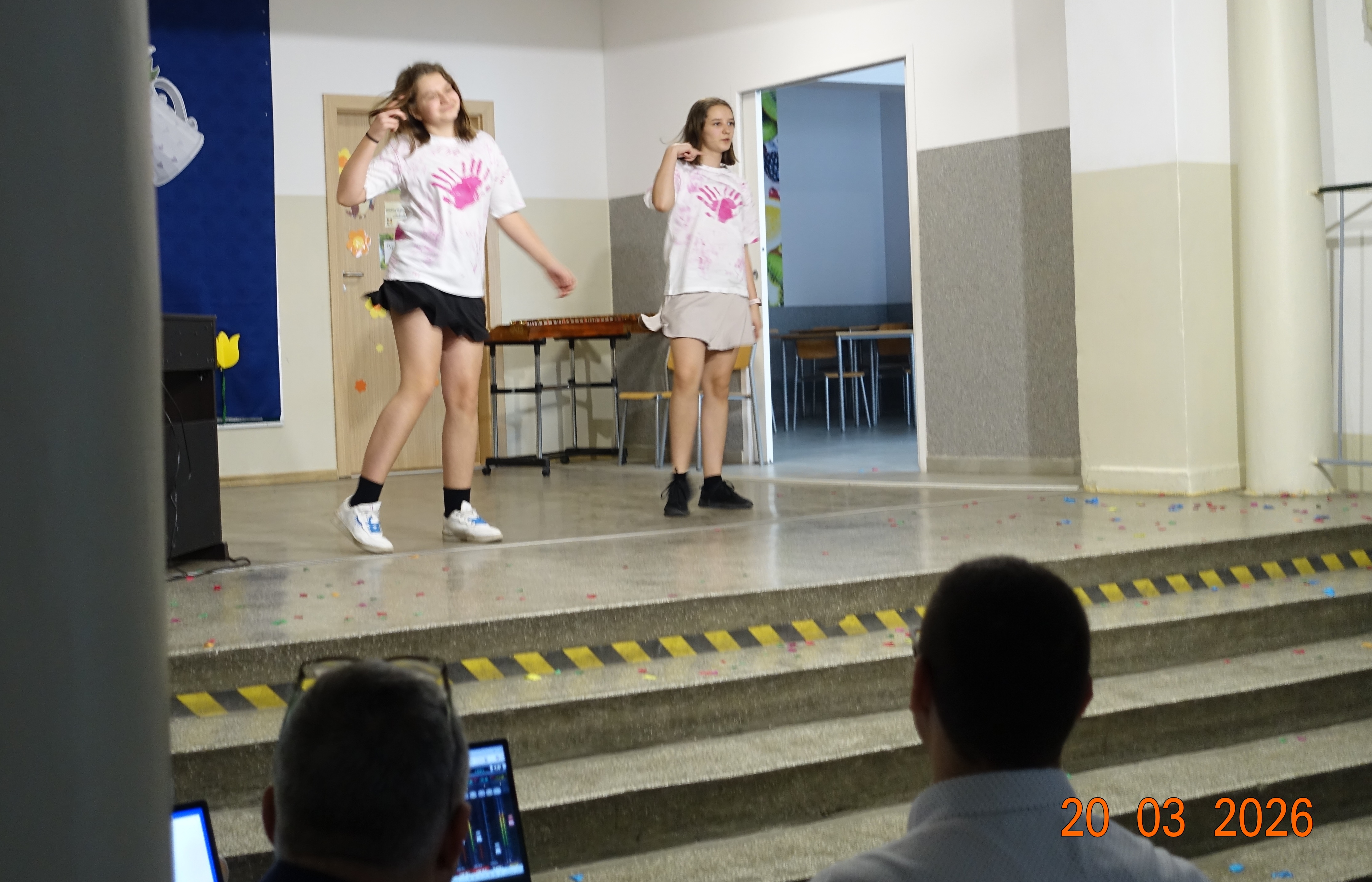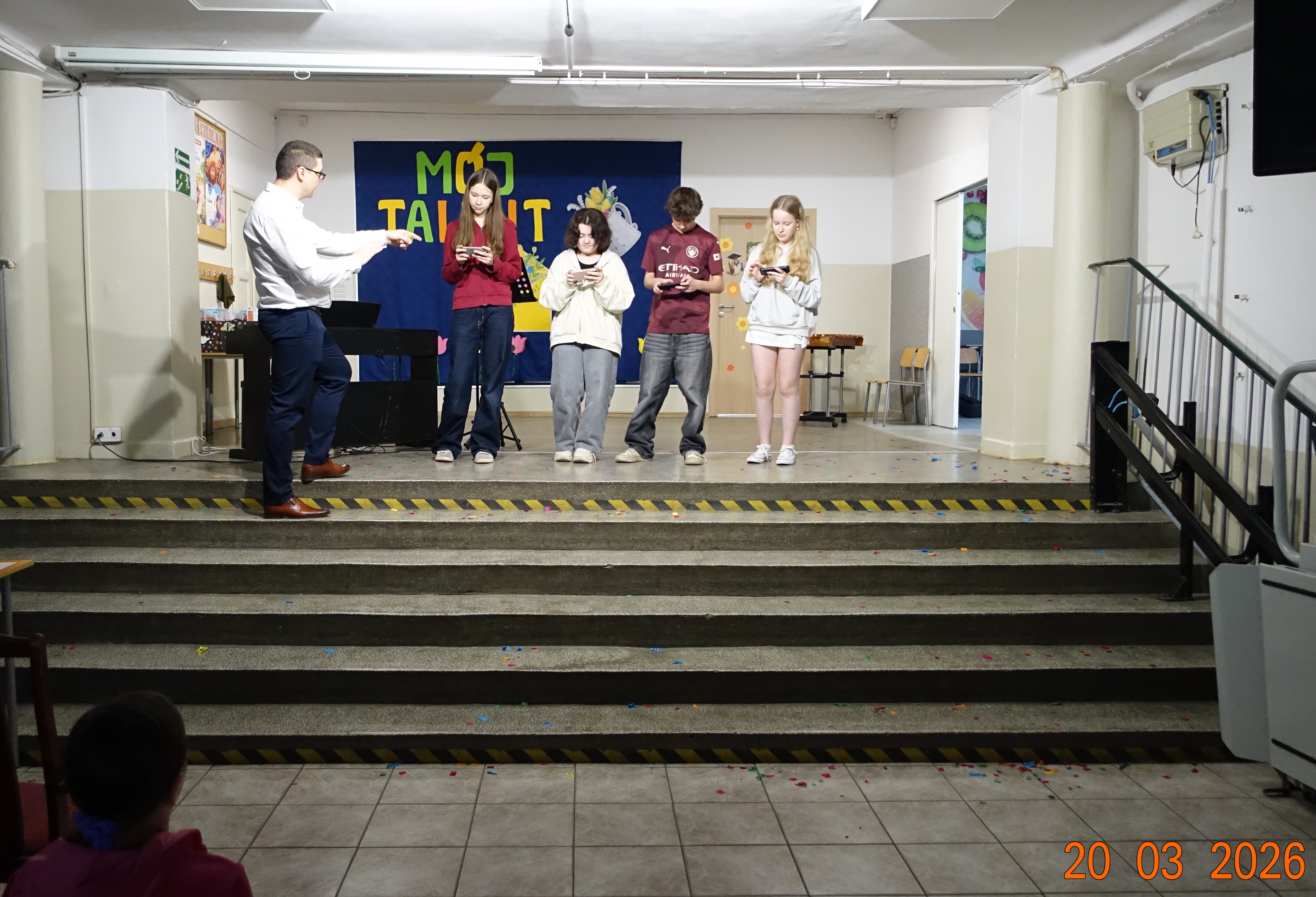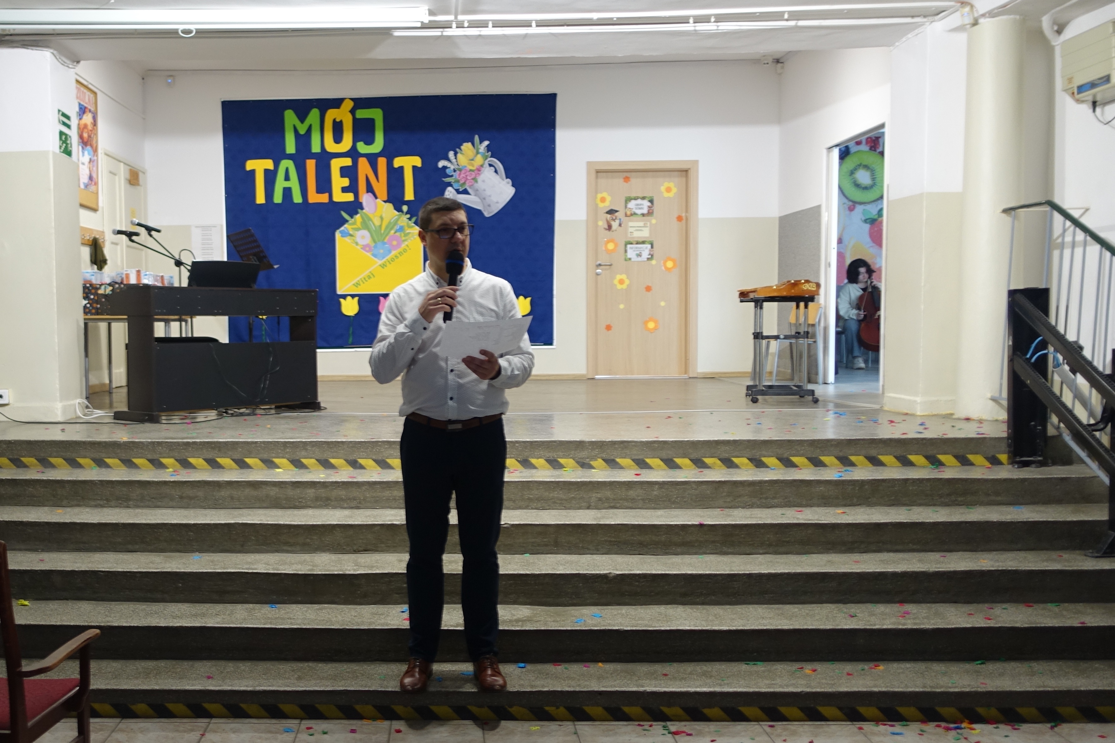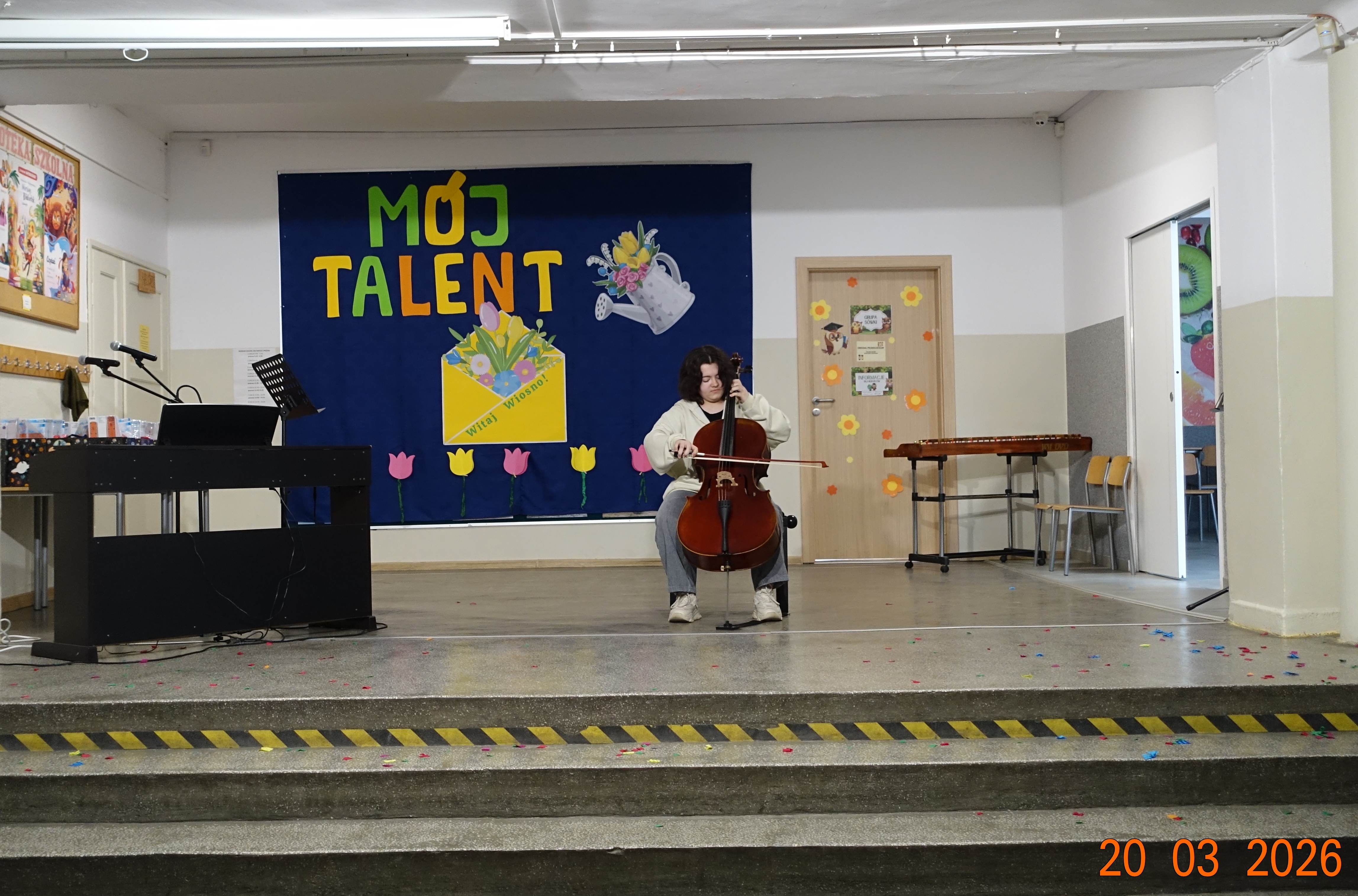 Nie zabrakło również emocji muzycznych, ponieważ wielu uczniów zdecydowało się na występy indywidualne. Soliści z wielką odwagą śpiewali piosenki, prezentując swoje głosy przed całą publicznością. Odbyły się także pozakonkursowe występy klasowe, uczniów z najmłodszych klas 0-III. Tutaj nie zabrakło przeplatanych wierszyków z rytmicznymi przyśpiewkami co sprawiało, że występy nie nużyły szkolnej publiki. Każdy uczestnik włożył w swój pokaz mnóstwo serca i pracy, co było widać w każdym elemencie występu. Publiczność, często przebrana w wiosenne kreacje /zieleń w różnych odcieniach/ reagowała entuzjastycznie, nagradzając kolegów i koleżanki gromkimi brawami. Prowadzącym edycji Mój Talent, był Tomek i Maja z klasy III b.