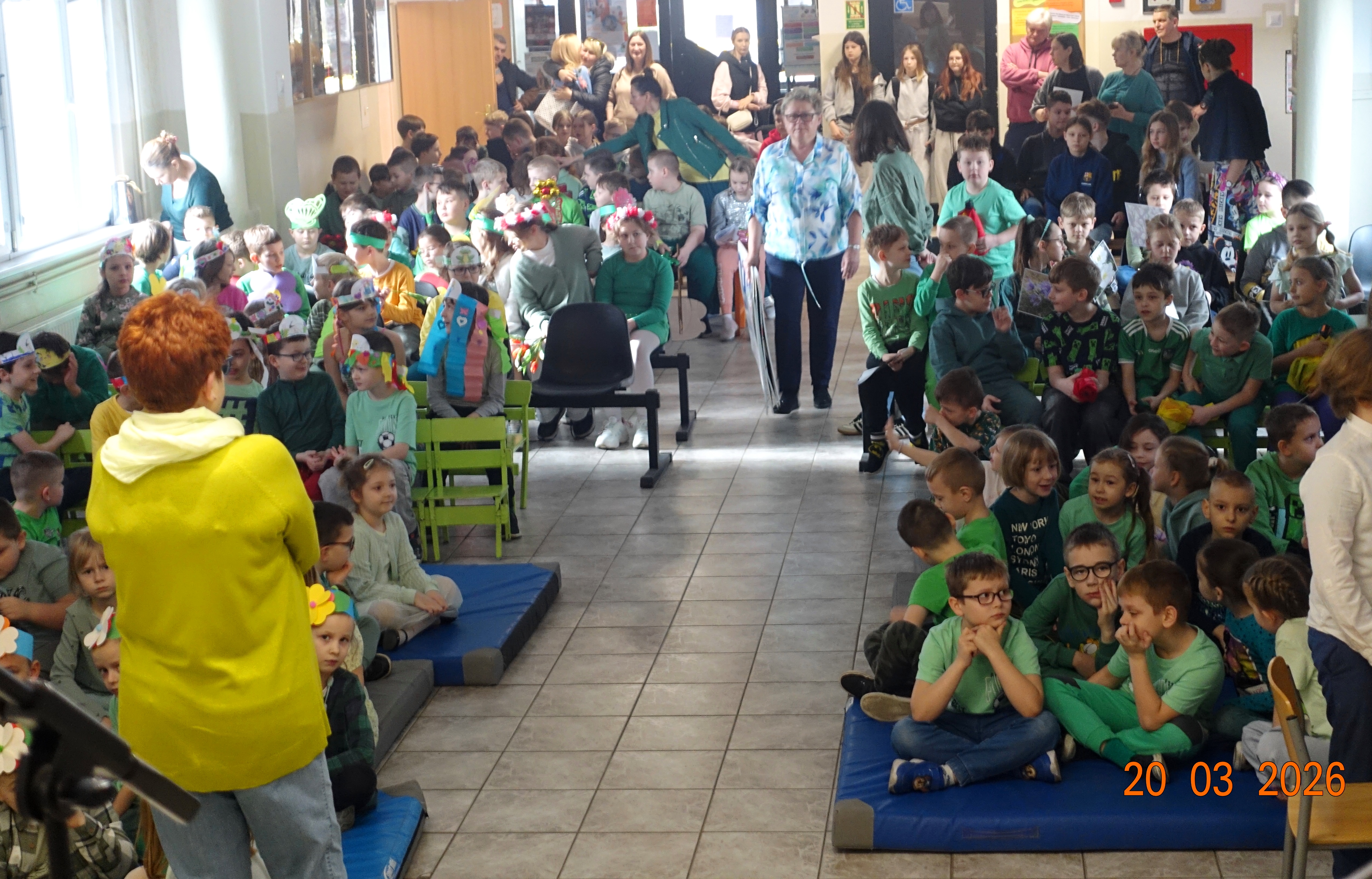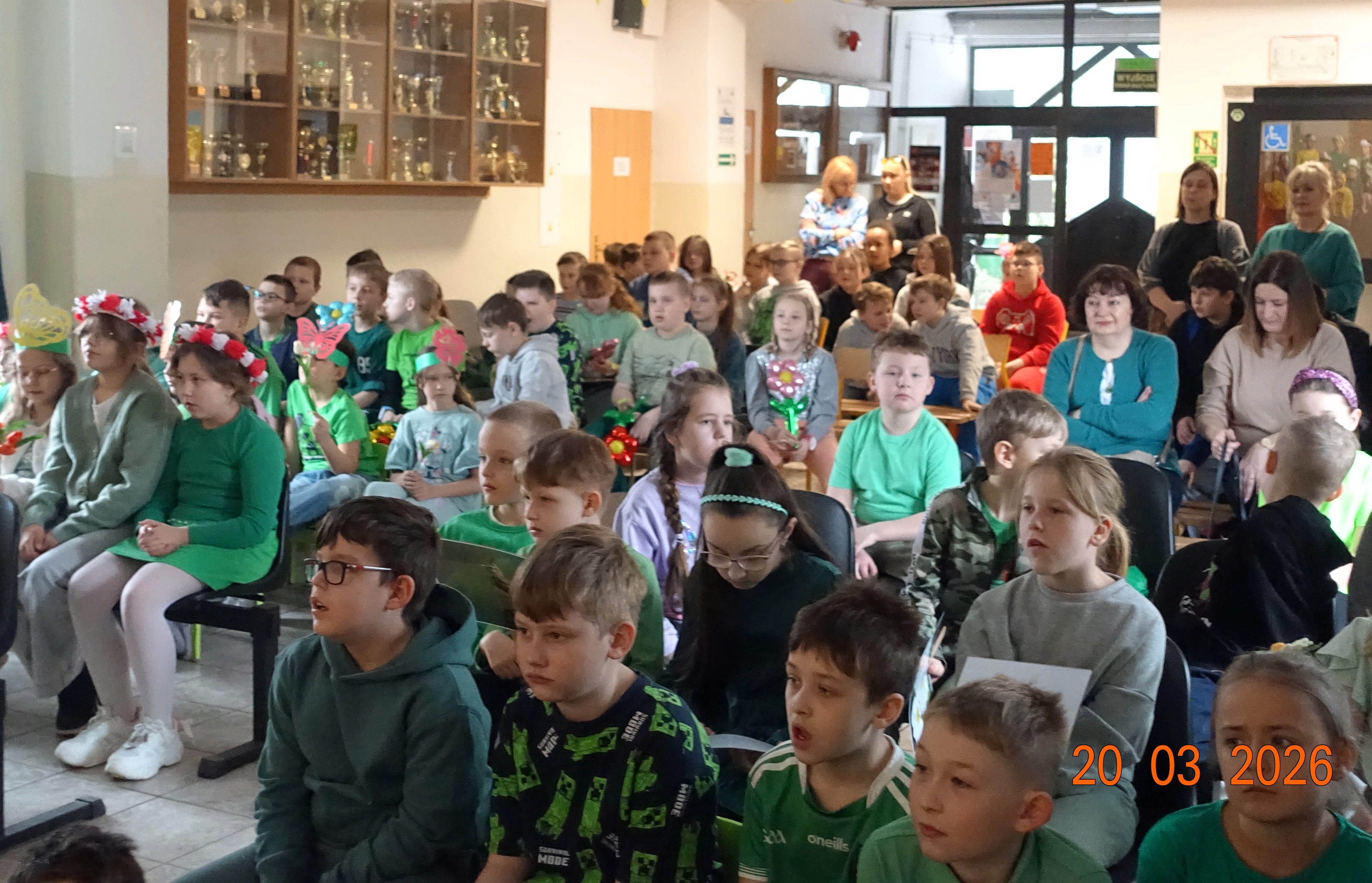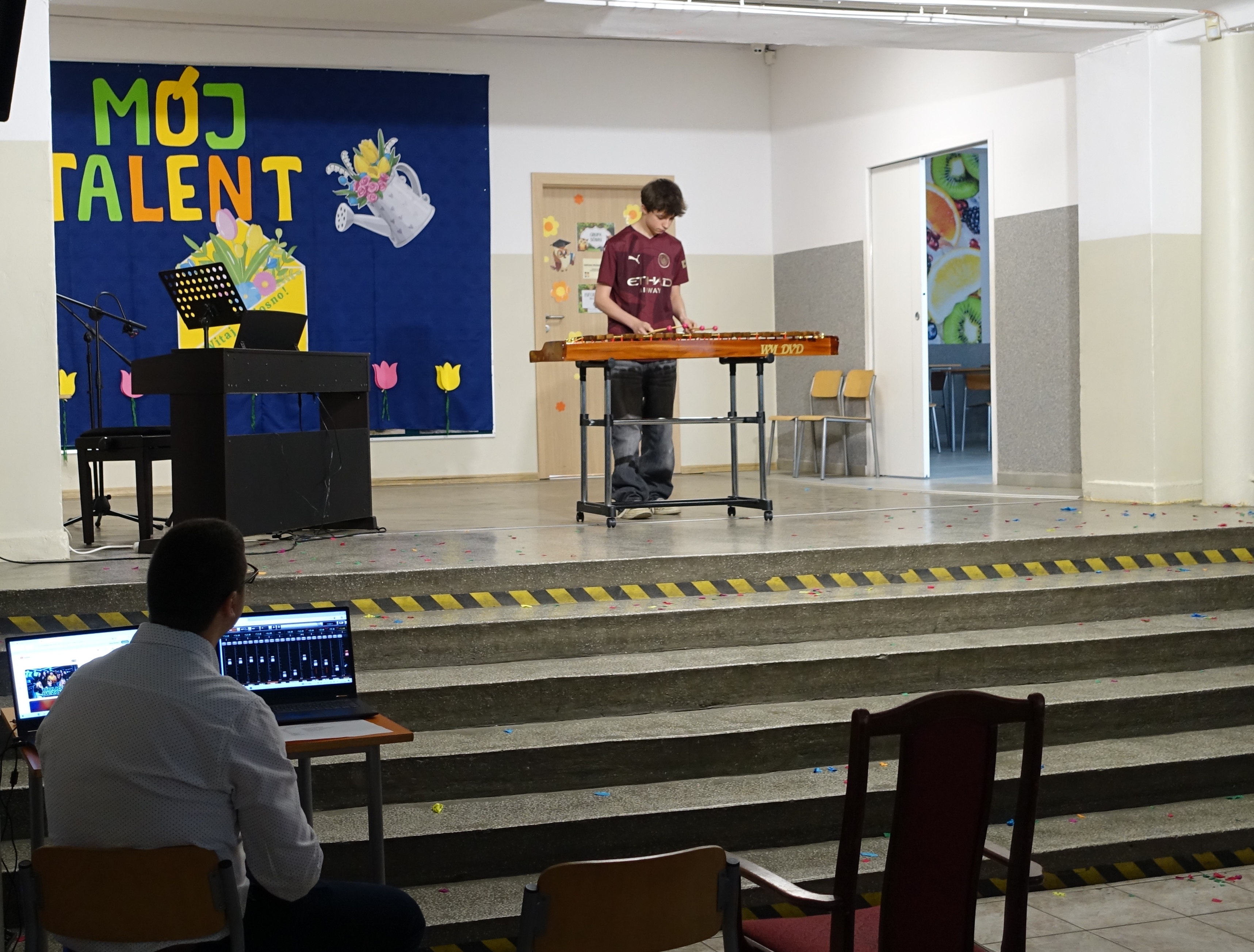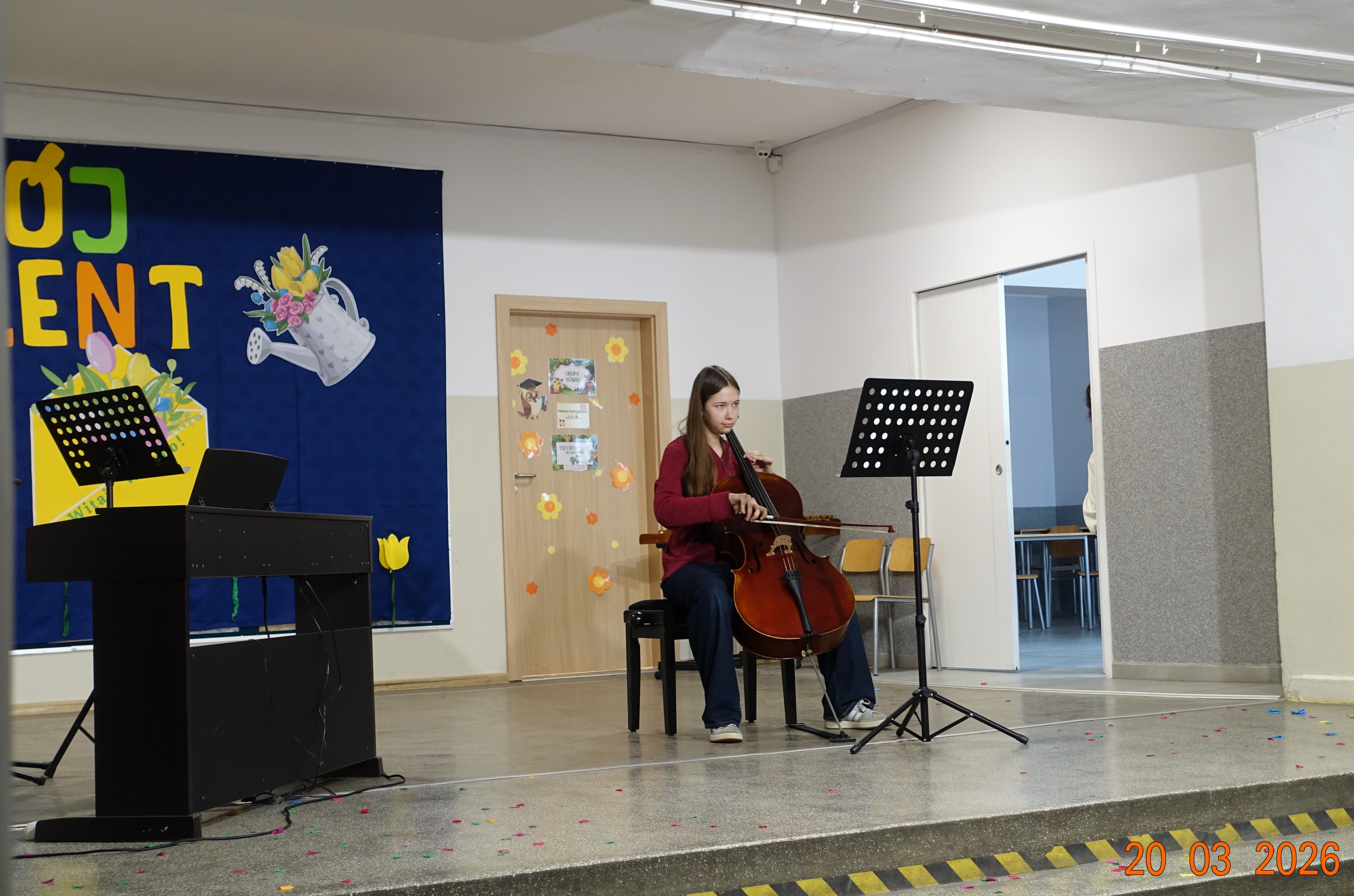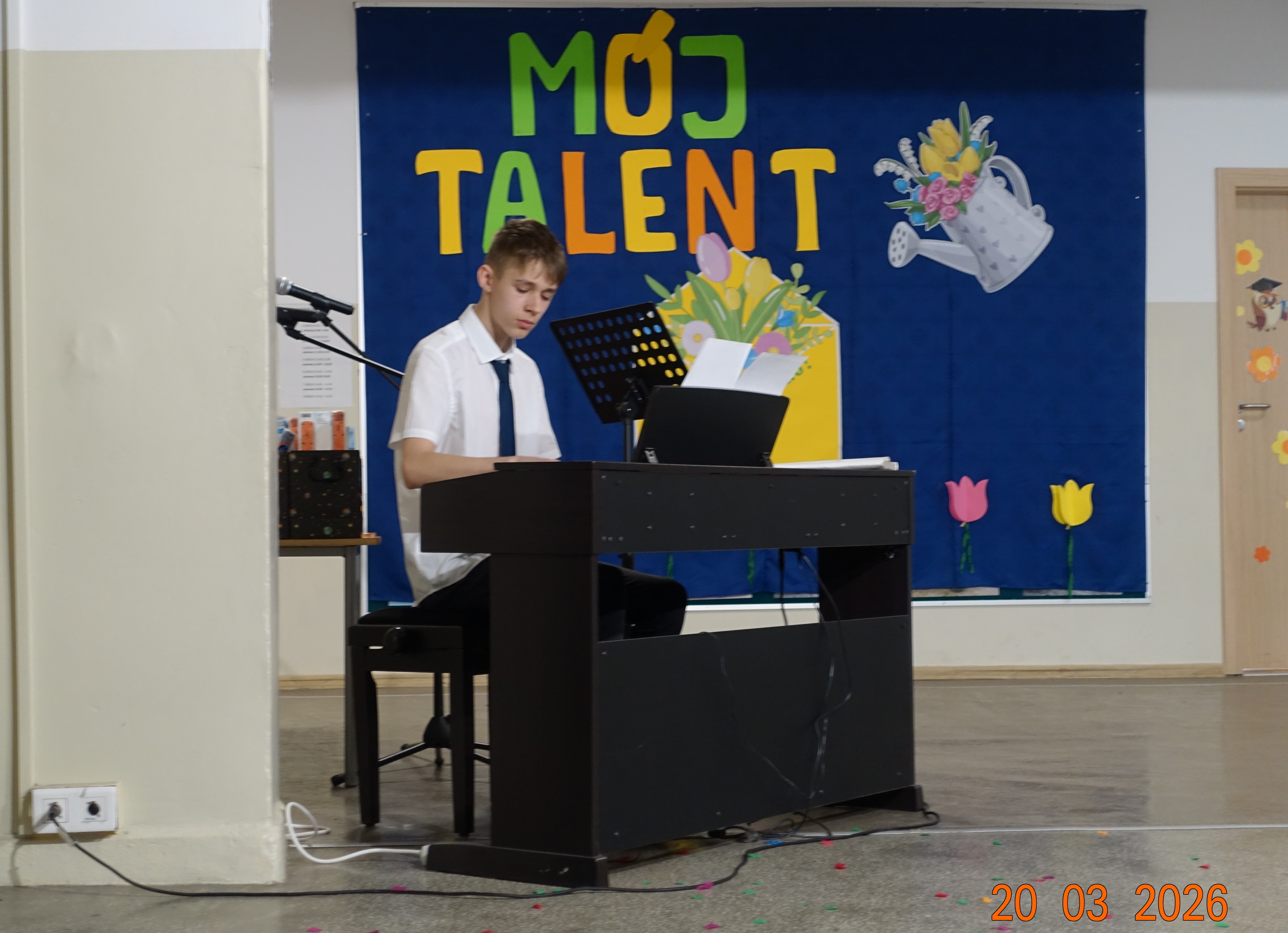 Nie zabrakło również emocji muzycznych, ponieważ wielu uczniów zdecydowało się na występy indywidualne. Soliści z wielką odwagą śpiewali piosenki, prezentując swoje głosy przed całą publicznością. Odbyły się także pozakonkursowe występy klasowe, uczniów z najmłodszych klas 0-III. Tutaj nie zabrakło przeplatanych wierszyków z rytmicznymi przyśpiewkami co sprawiało, że występy nie nużyły szkolnej publiki. Każdy uczestnik włożył w swój pokaz mnóstwo serca i pracy, co było widać w każdym elemencie występu. Publiczność, często przebrana w wiosenne kreacje /zieleń w różnych odcieniach/ reagowała entuzjastycznie, nagradzając kolegów i koleżanki gromkimi brawami. Prowadzącym edycji Mój Talent, był Tomek i Maja z klasy III b.