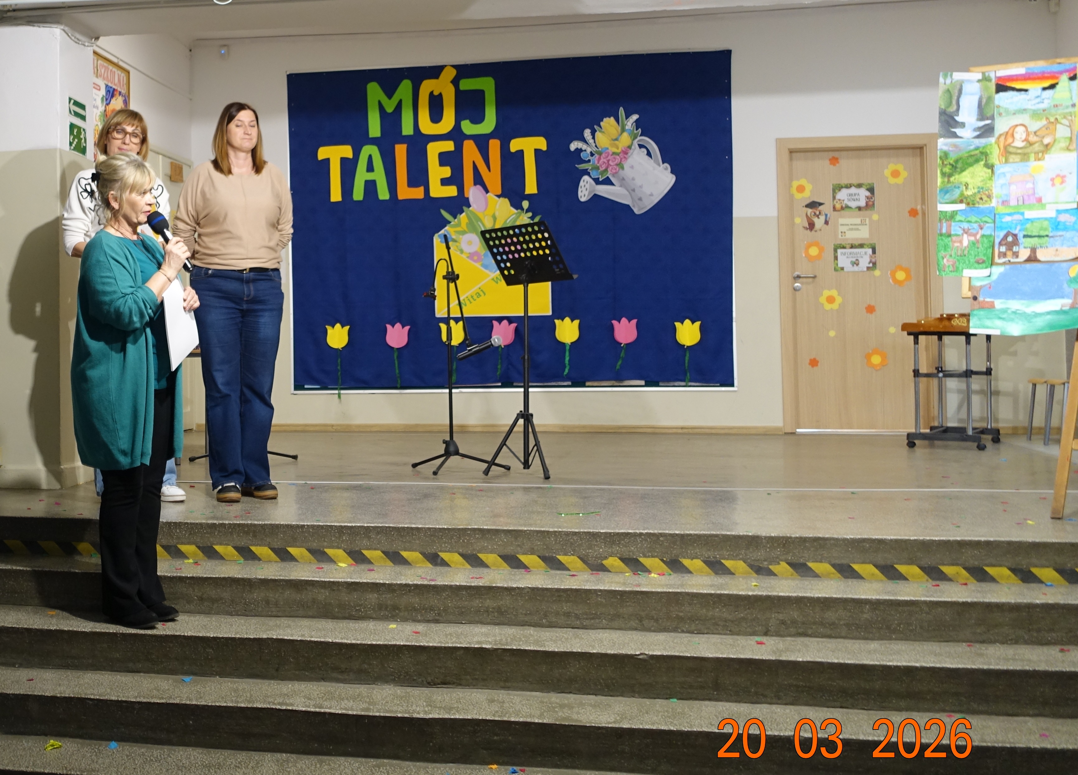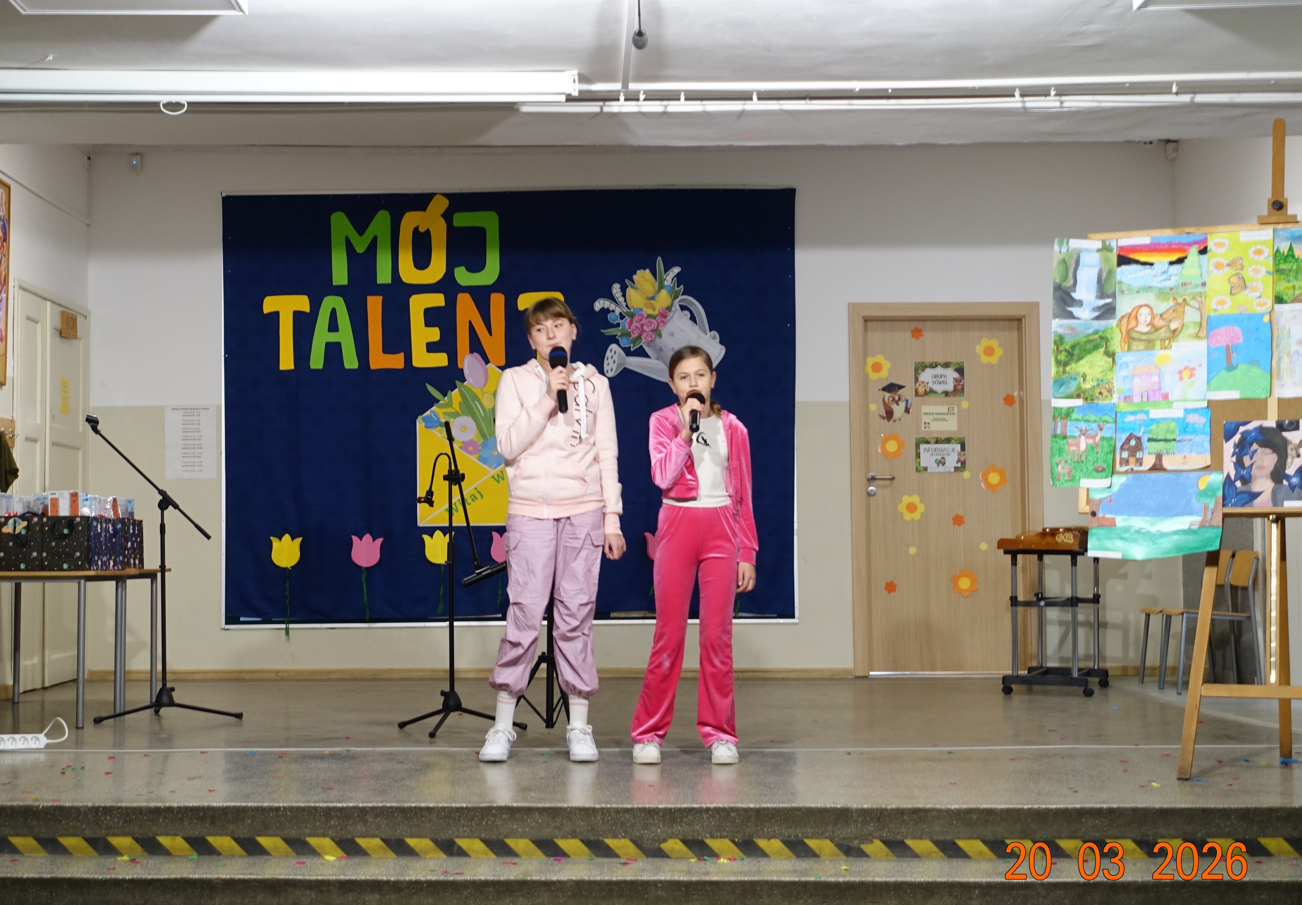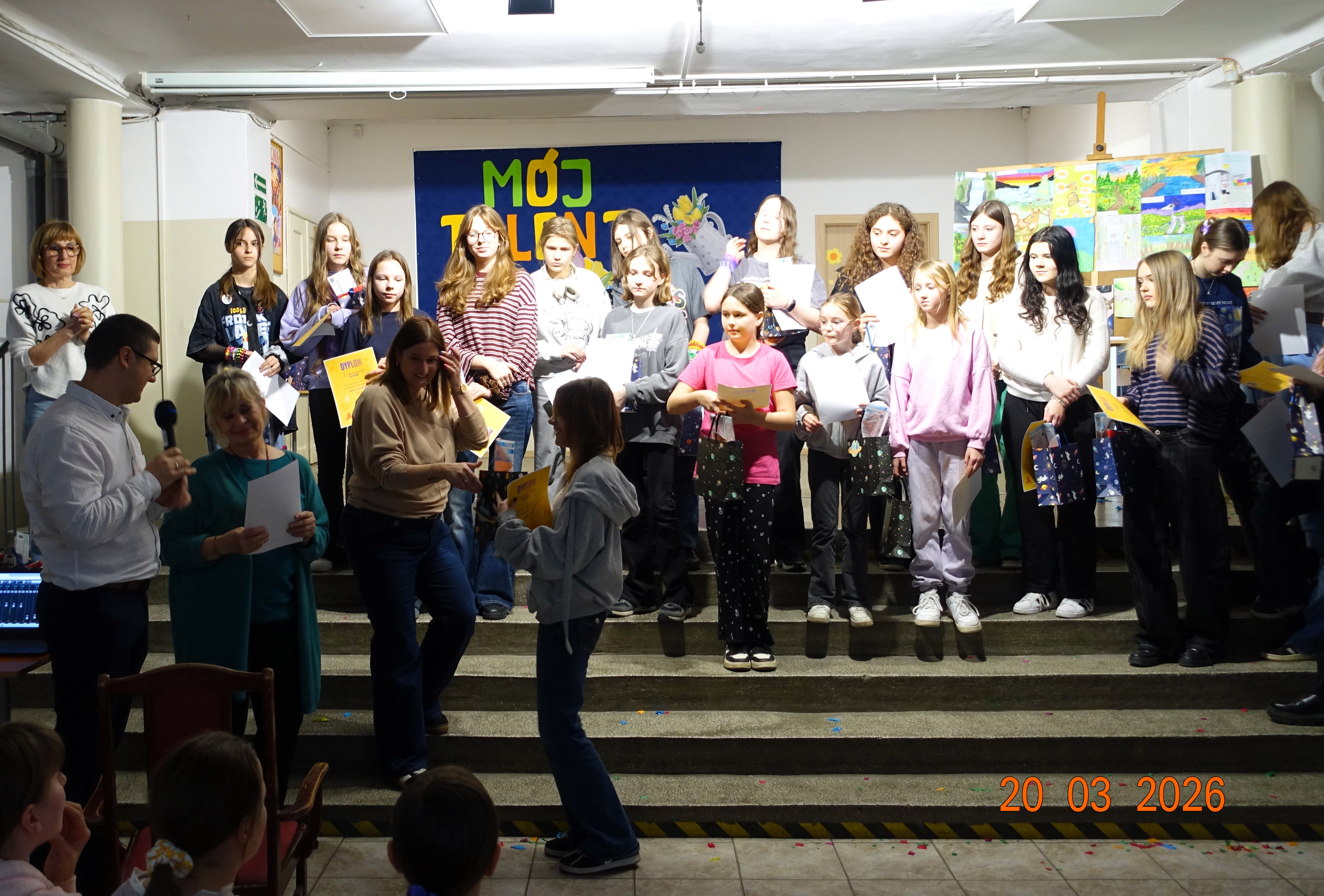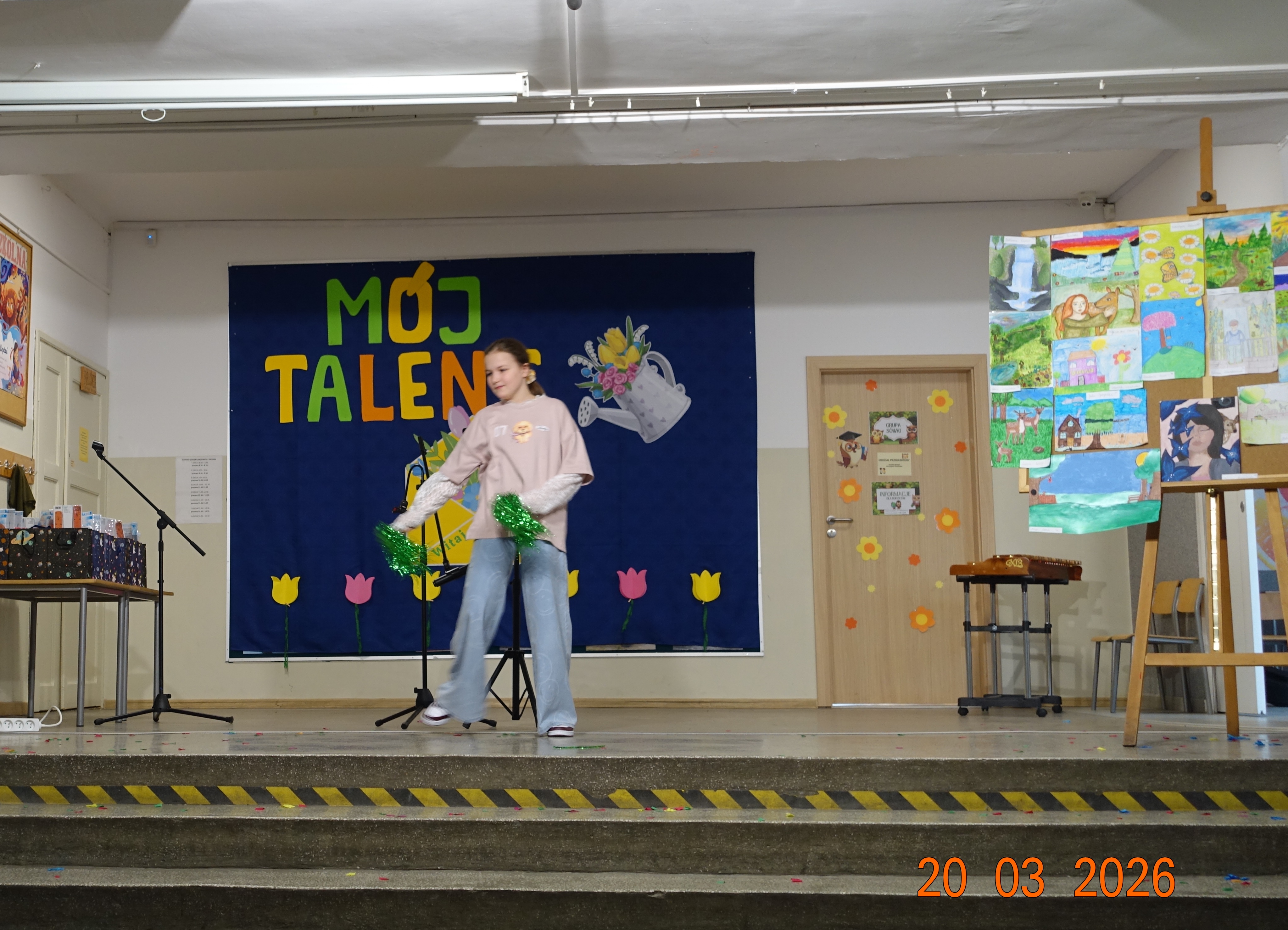 W naszej szkole /hol główny/ odbyła się w piątek 20 marca, tegoroczna edycja uwielbianego przez wszystkich uczniów konkursu „Mój Talent”. Wydarzenie to było wyjątkową okazją, aby chętni uczniowie oraz całe klasy mogli zaprezentować swoje pasje i niezwykłe umiejętności. Tym razem motywem przewodnim wielu występów była budząca się do życia wiosna. Nasi pasjonaci rysunków, malunków i śpiewu wykazali się ogromną kreatywnością. Część plastyczna konkursu zachwyciła jury – dzieci własnoręcznie rysowały przepiękne, kolorowe krajobrazy pełne pierwszych kwiatów, słońca i nie tylko.