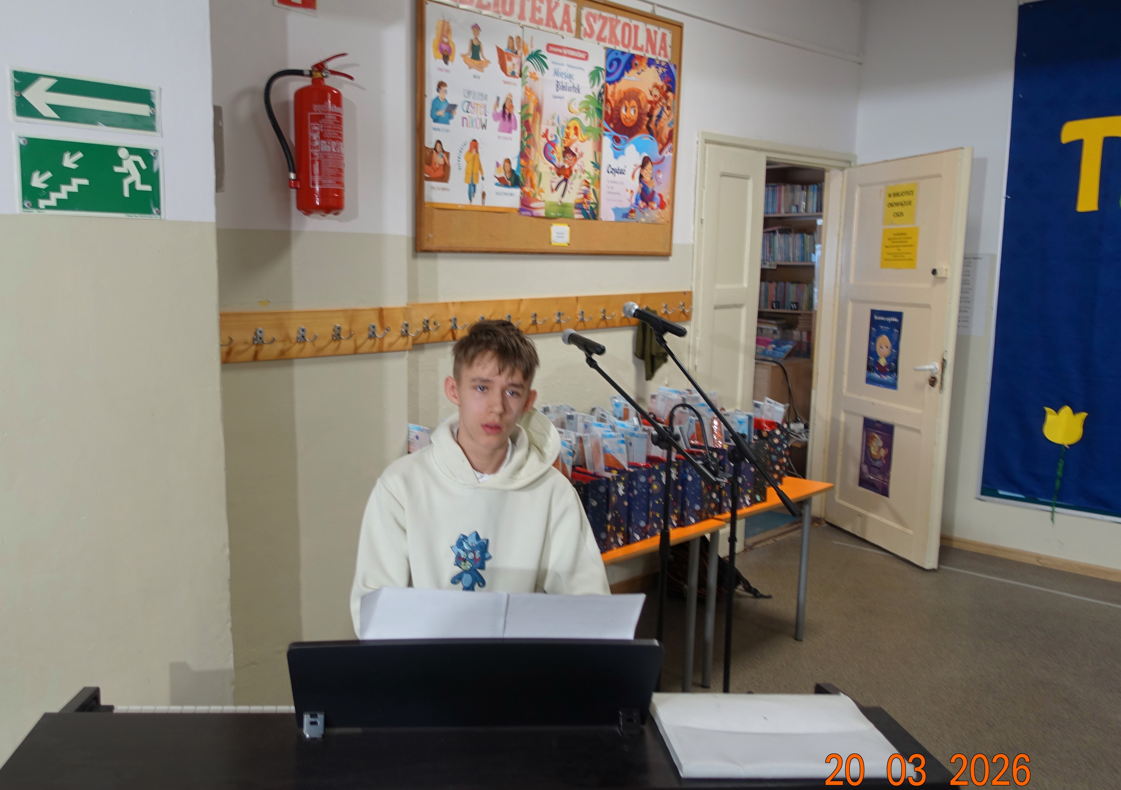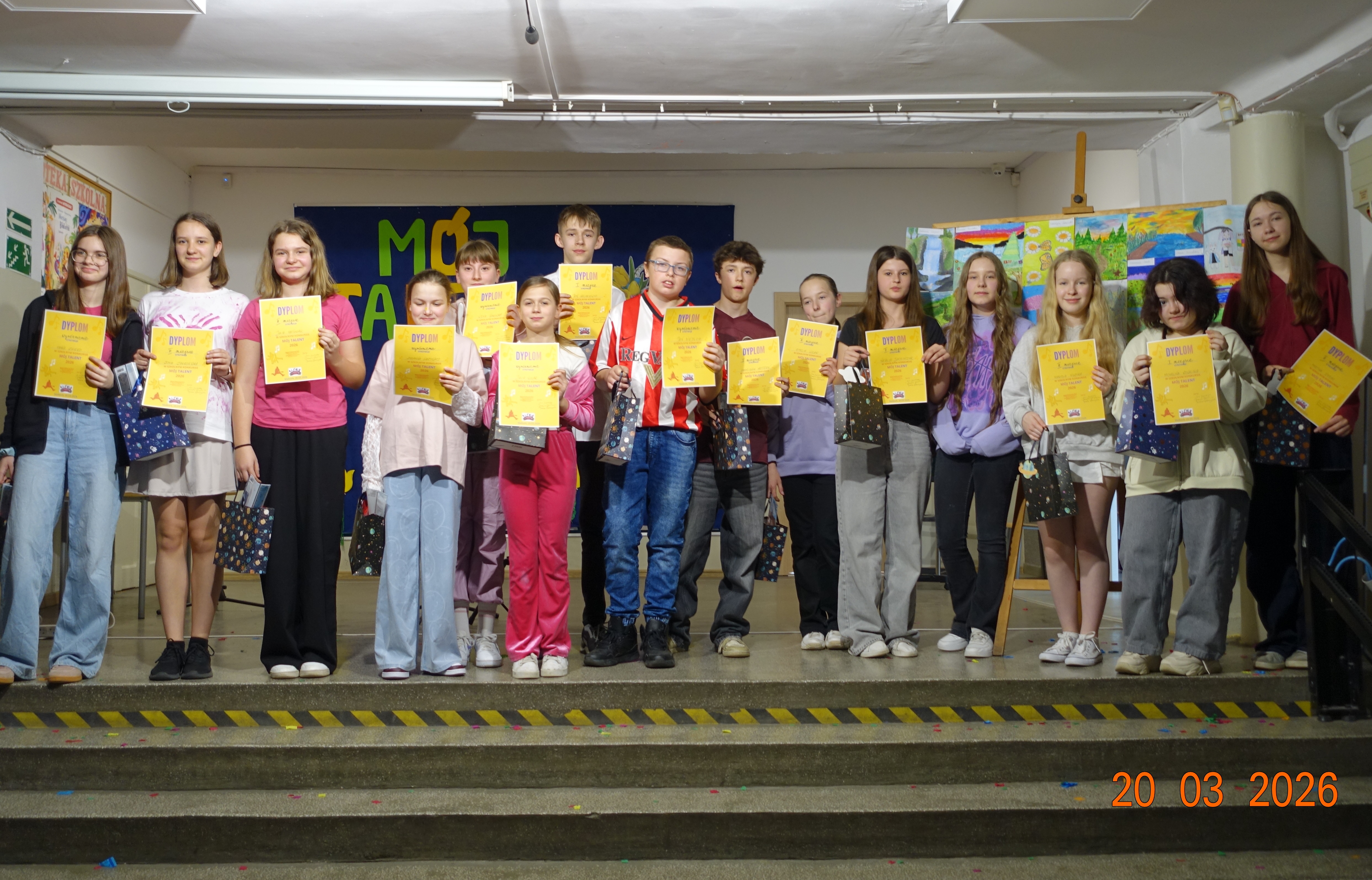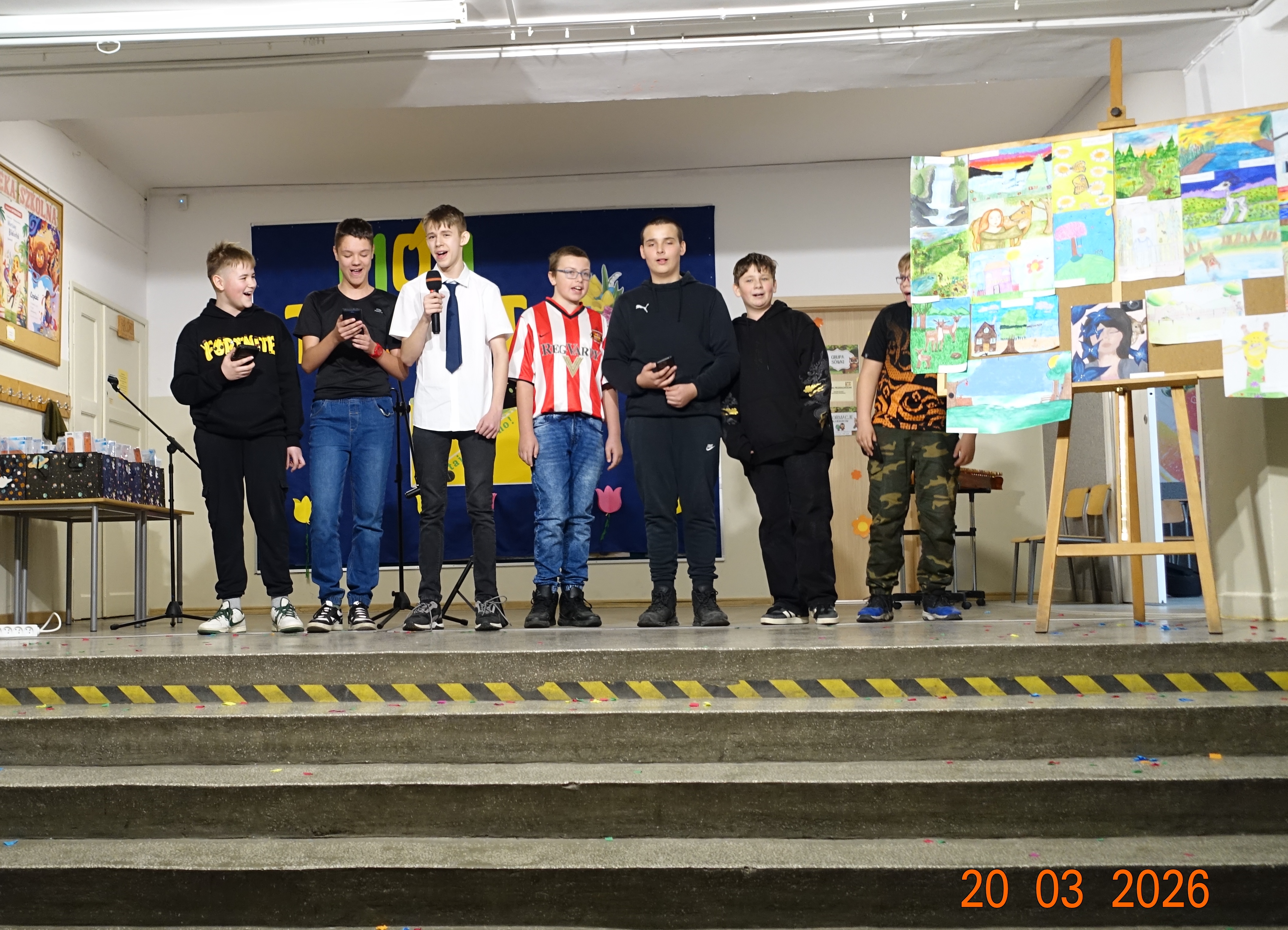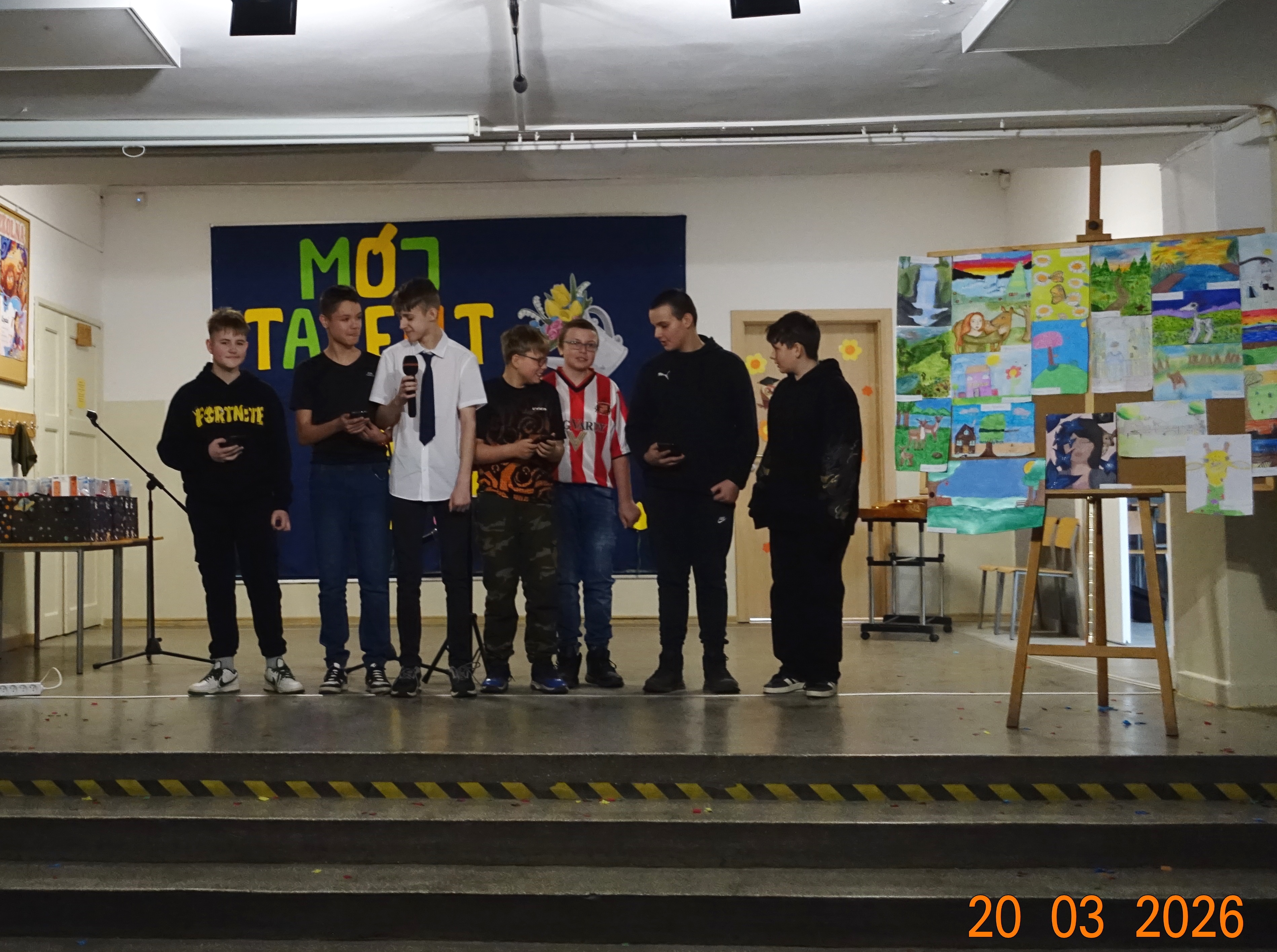 W naszej szkole /hol główny/ odbyła się w piątek 20 marca, tegoroczna edycja uwielbianego przez wszystkich uczniów konkursu „Mój Talent”. Wydarzenie to było wyjątkową okazją, aby chętni uczniowie oraz całe klasy mogli zaprezentować swoje pasje i niezwykłe umiejętności. Tym razem motywem przewodnim wielu występów była budząca się do życia wiosna. Nasi pasjonaci rysunków, malunków i śpiewu wykazali się ogromną kreatywnością. Część plastyczna konkursu zachwyciła jury – dzieci własnoręcznie rysowały przepiękne, kolorowe krajobrazy pełne pierwszych kwiatów, słońca i nie tylko.