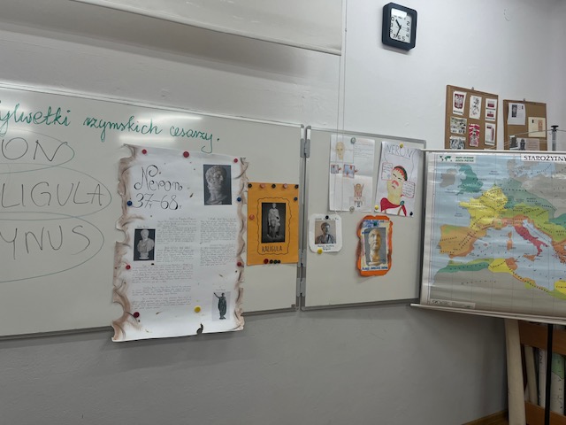 W klasie 5a odbyła się bardzo ciekawa lekcja historii, którą przygotowali sami uczniowie. Zachęceni przez nauczyciela historii, przygotowali w parach prezentacje oraz plakaty na temat życiorysów wybranych rzymskich cesarzy. Z zacięciem aktorskim wszyscy starali się, aby zainteresować słuchaczy opowieściami o niespotykanych, czasem szalonych losach władców starożytnego Rzymu. Dzięki zaangażowaniu prelegentów oraz zainteresowaniu publiczności obiecaliśmy sobie, że będziemy częściej realizować takie projekty.