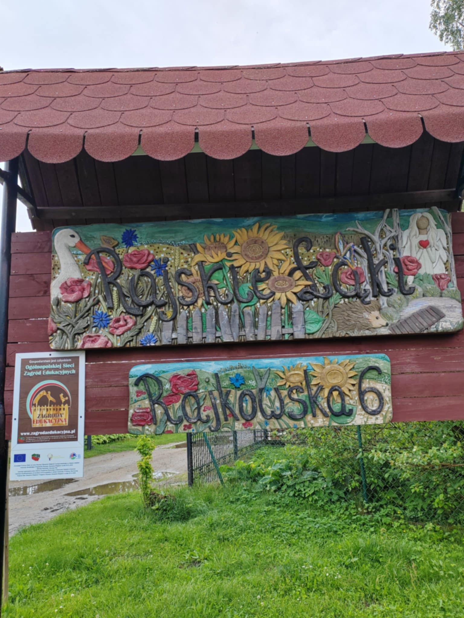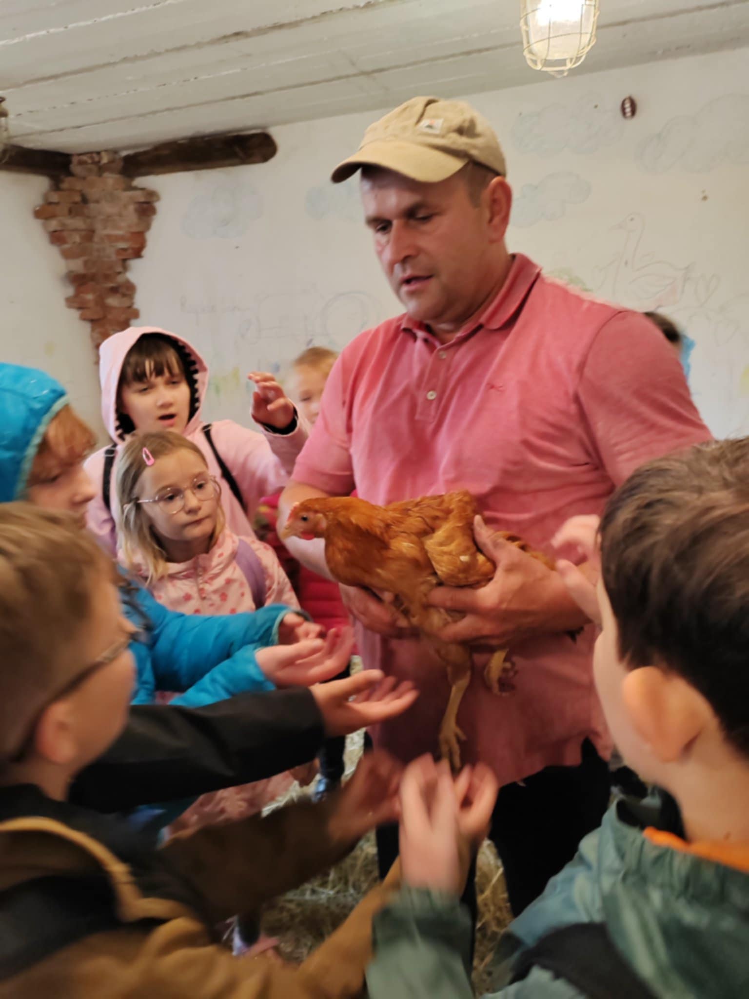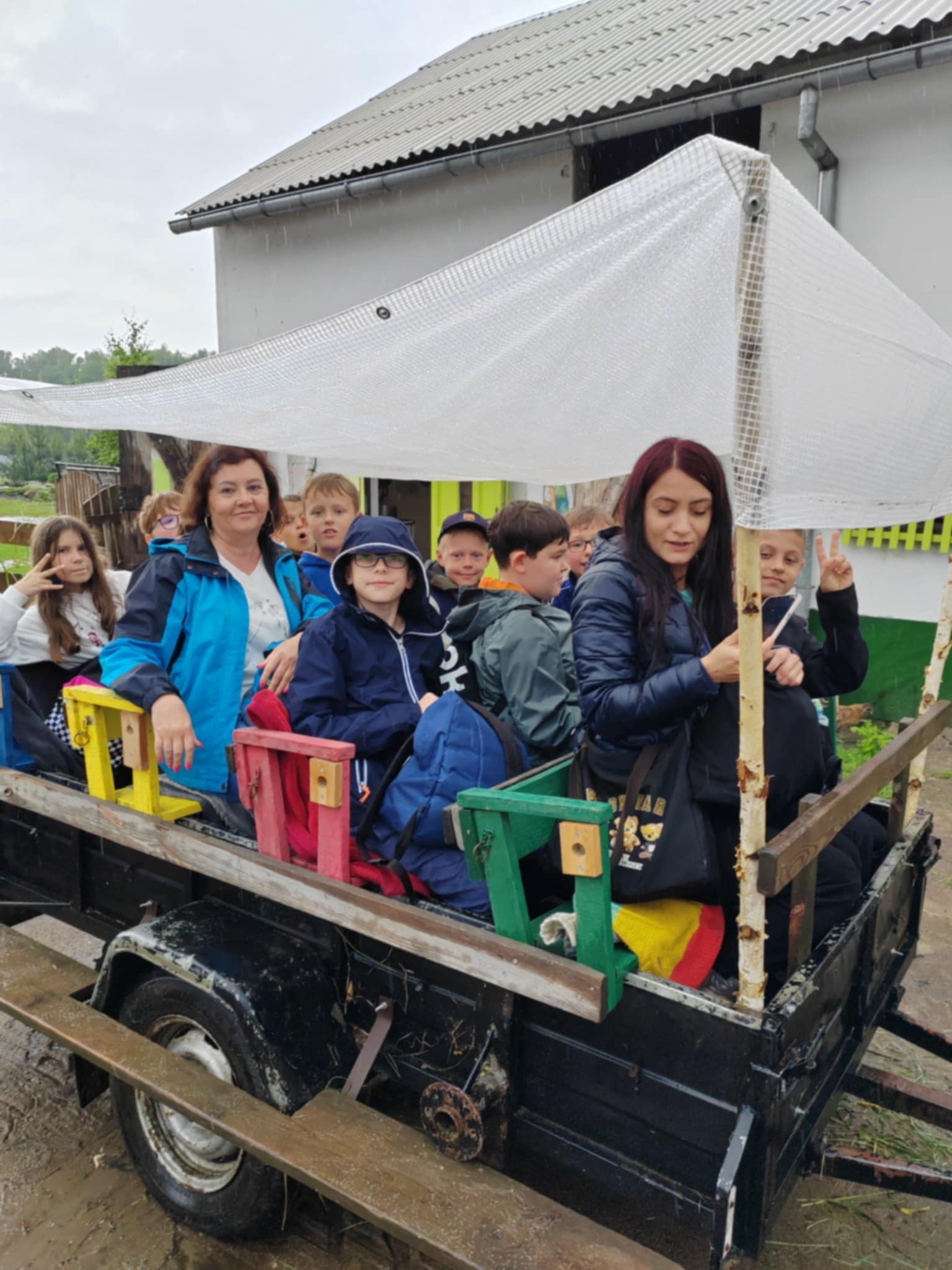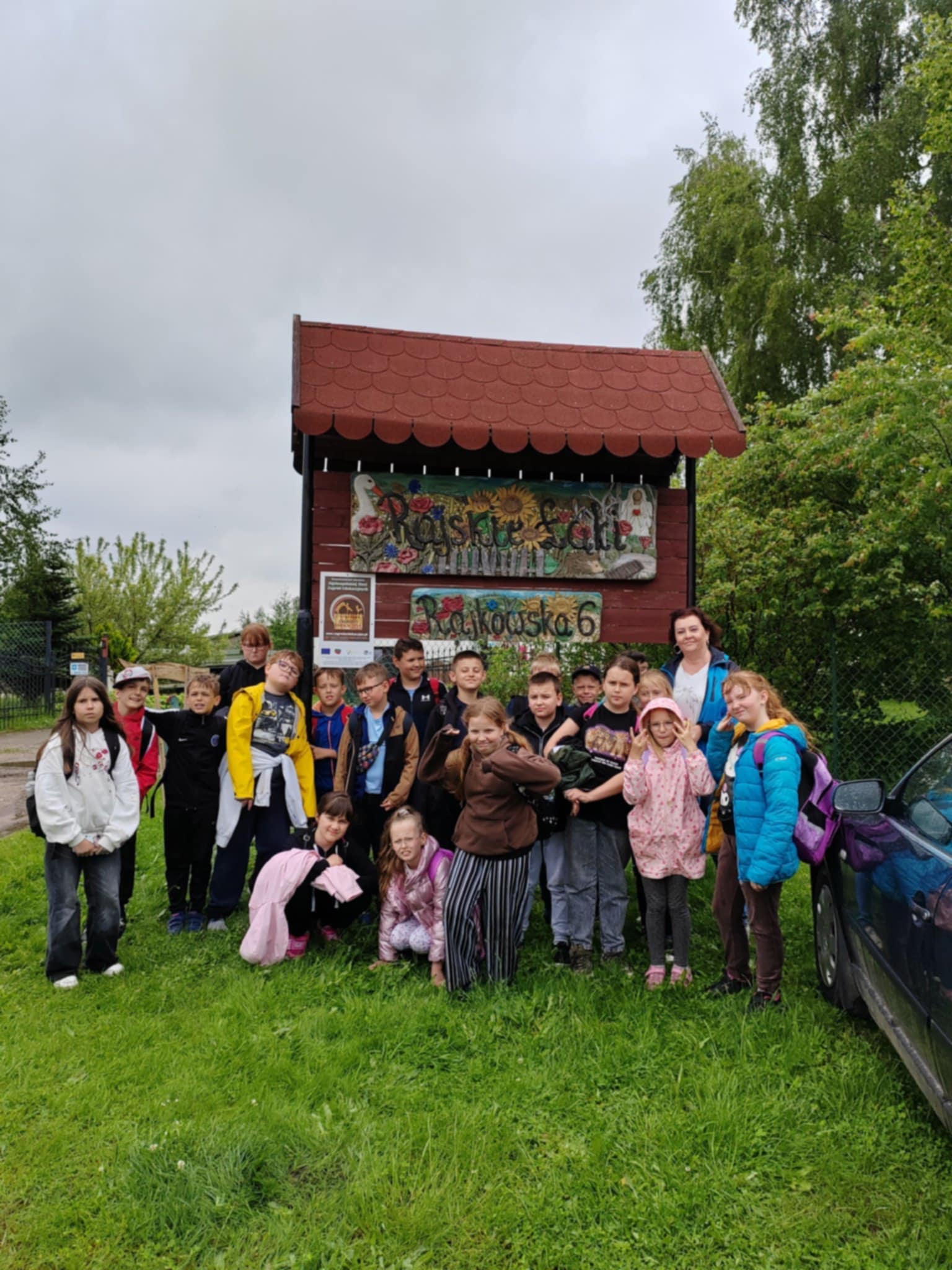 Tu jest magicznie. Zwierzęta witają wszystkich gości, bocianie gniazdo z czterema młodymi boćkami świadczy o tym, że jest to przyjazne miejsce. Dzieci gotowały obiad w glinianej kuchni, karmiły i głaskały zwierzęta. Nietypowym przeżyciem była przejażdżka w przyczepach, koszenie trawy i tropienie bobrów wzdłuż rzeki Wierzycy. Na koniec zajadaliśmy się pysznym goframi i malowaliśmy kamyki. Pomimo deszczu wycieczka była udana i dostarczyła dzieciom wielu miłych i niezapomnianych przeżyć.