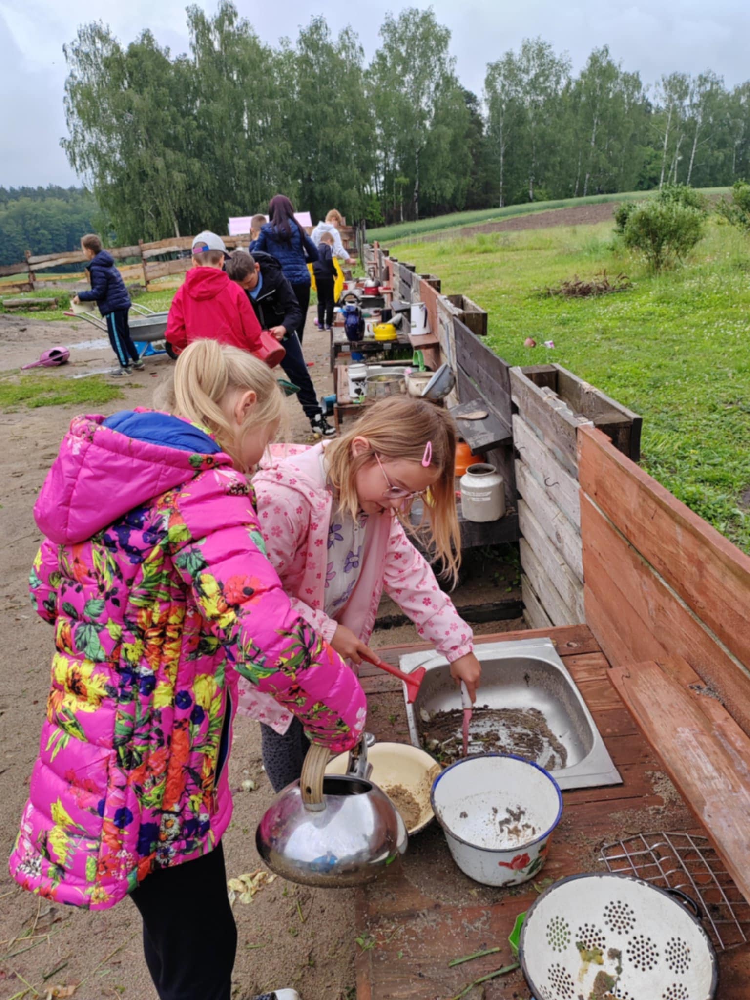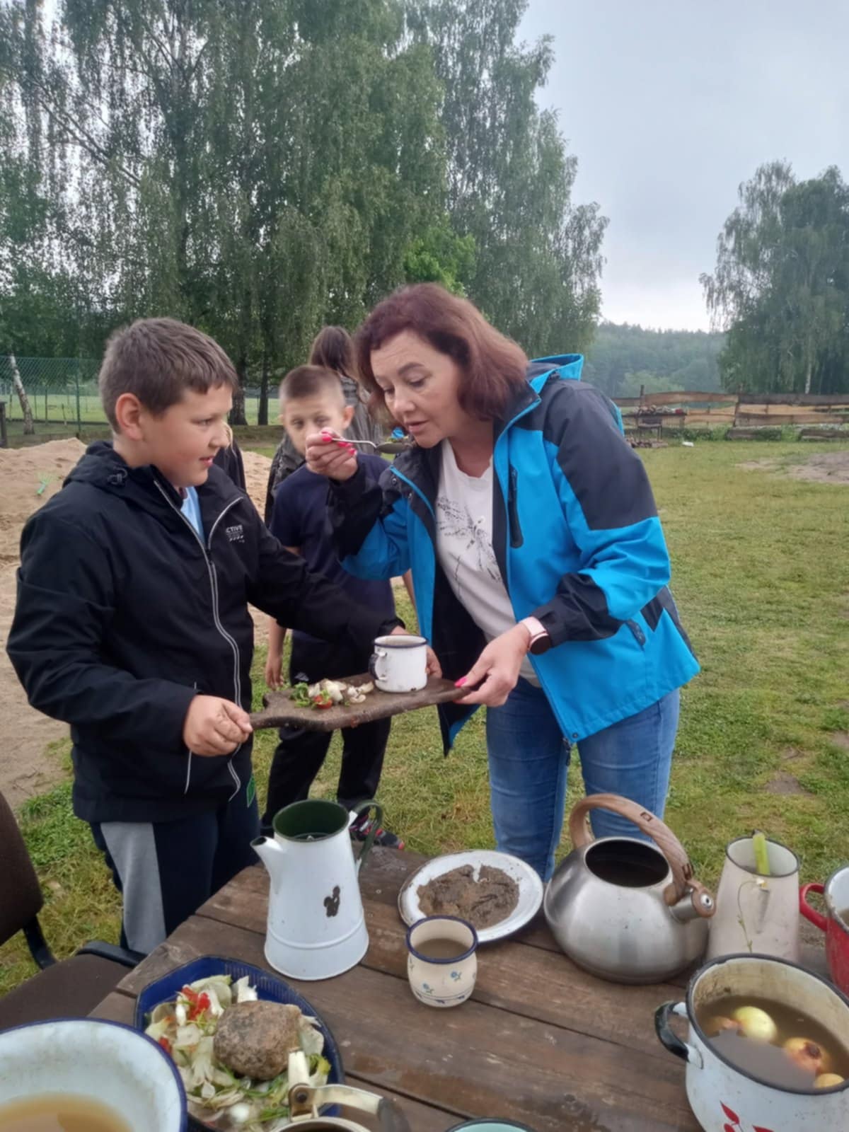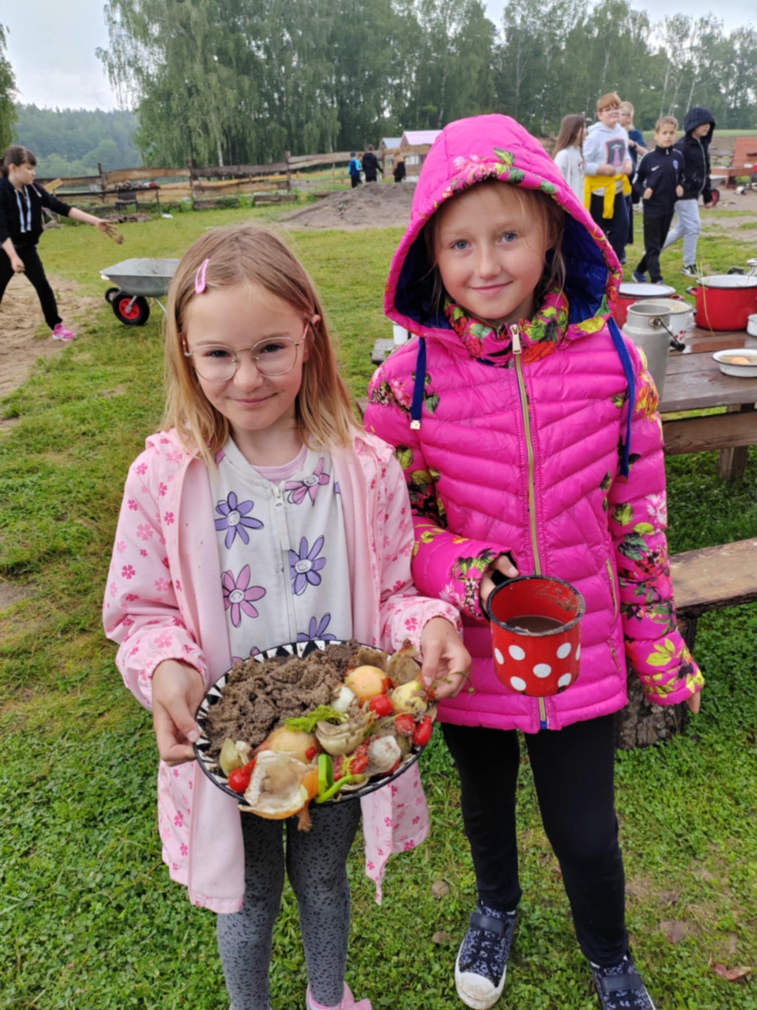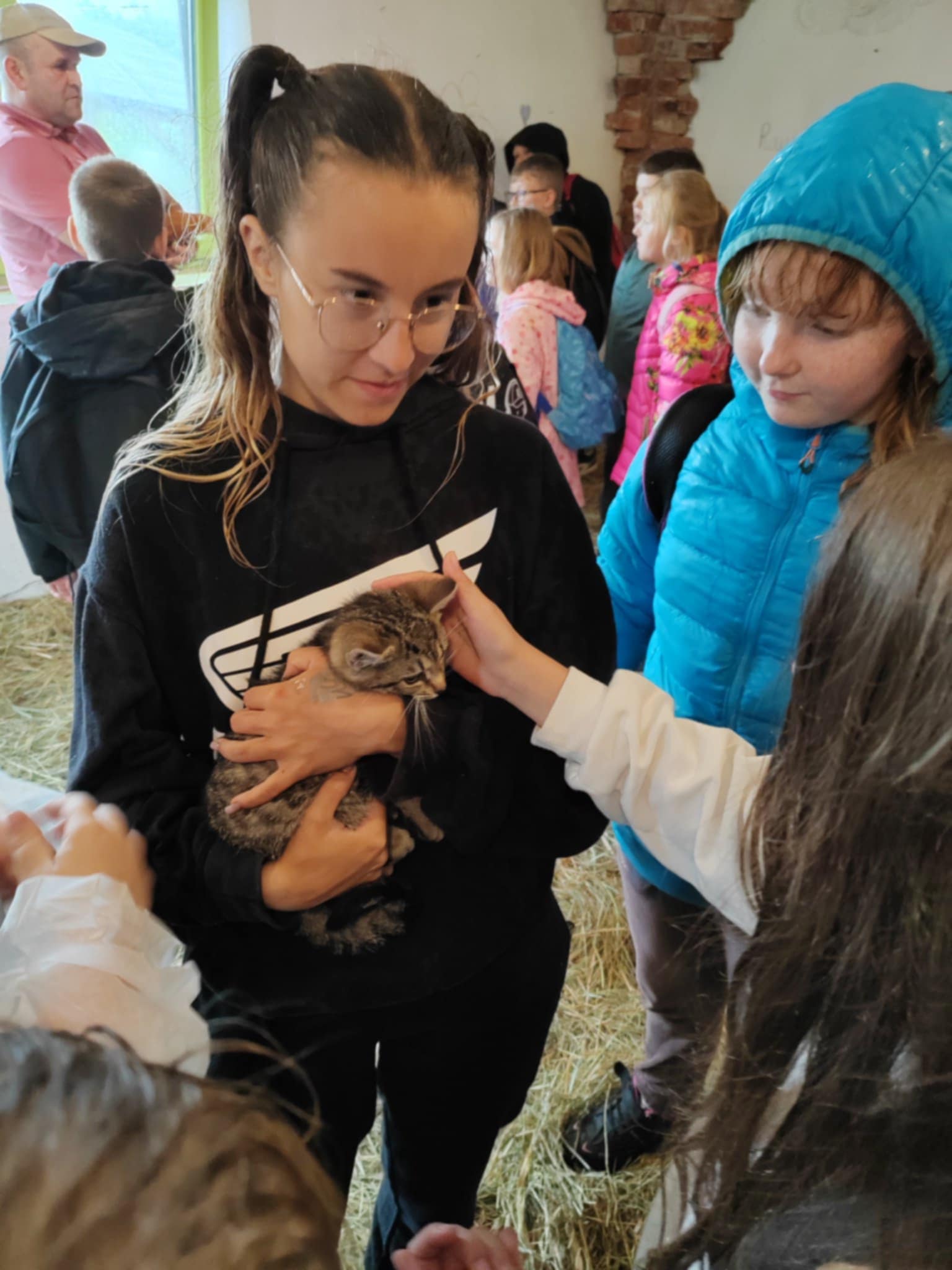 Tu jest magicznie. Zwierzęta witają wszystkich gości, bocianie gniazdo z czterema młodymi boćkami świadczy o tym, że jest to przyjazne miejsce. Dzieci gotowały obiad w glinianej kuchni, karmiły i głaskały zwierzęta. Nietypowym przeżyciem była przejażdżka w przyczepach, koszenie trawy i tropienie bobrów wzdłuż rzeki Wierzycy. Na koniec zajadaliśmy się pysznym goframi i malowaliśmy kamyki. Pomimo deszczu wycieczka była udana i dostarczyła dzieciom wielu miłych i niezapomnianych przeżyć.
