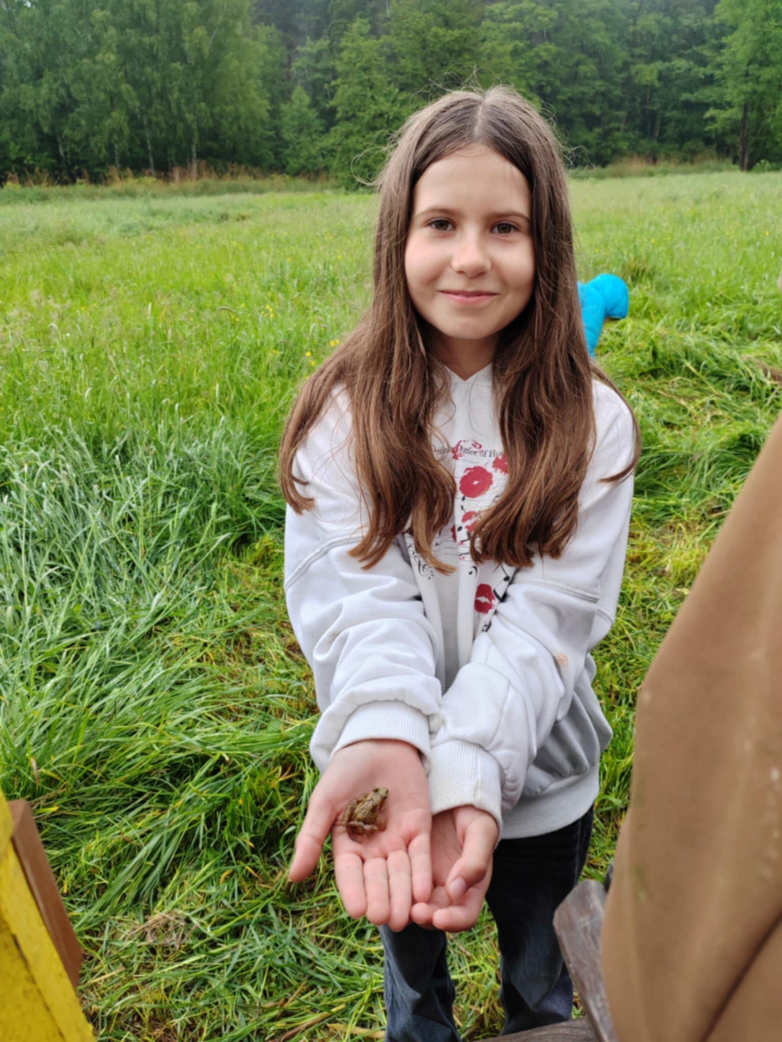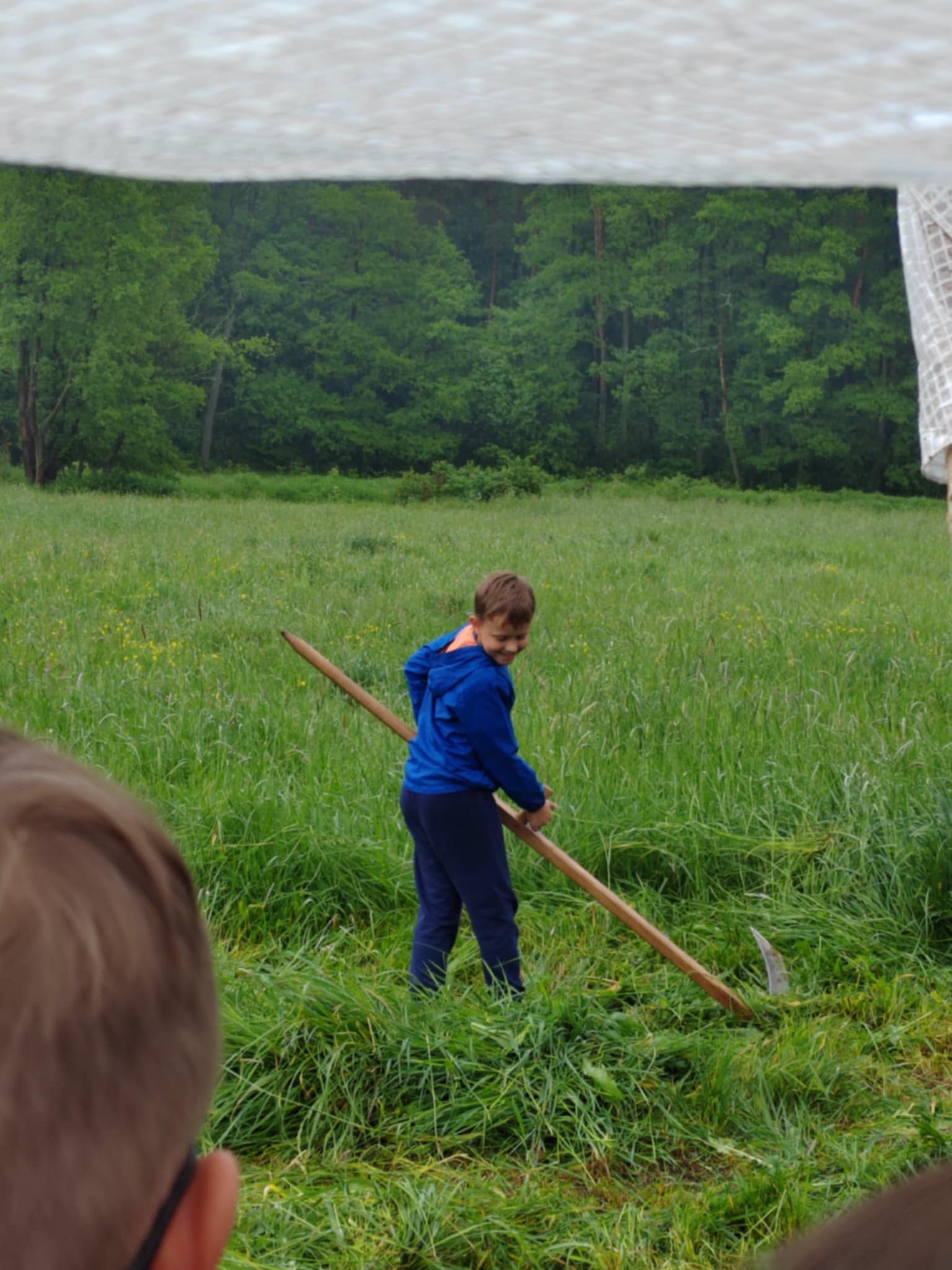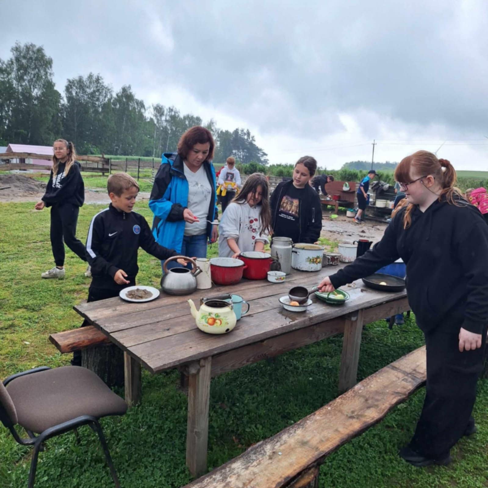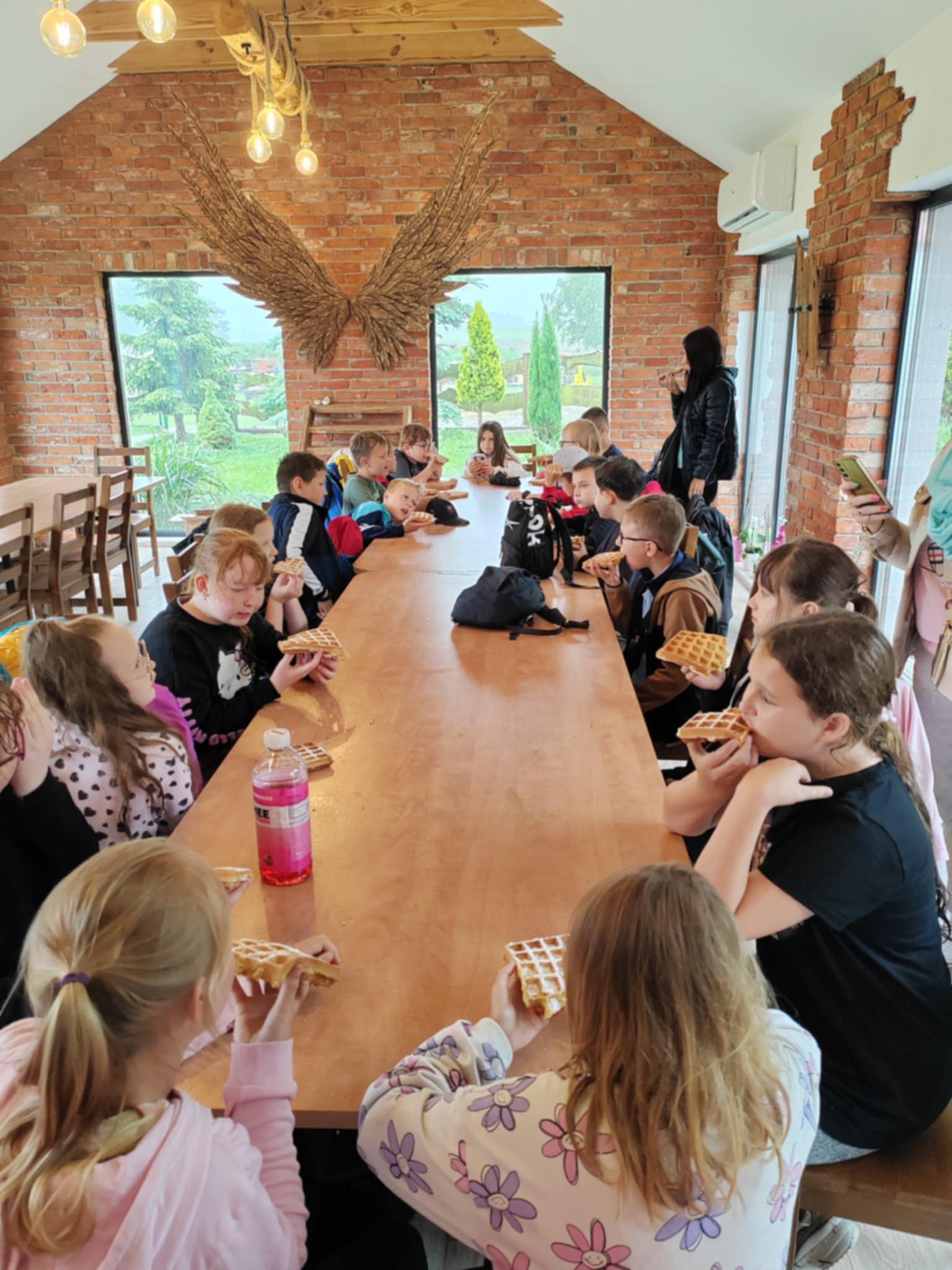 Tu jest magicznie. Zwierzęta witają wszystkich gości, bocianie gniazdo z czterema młodymi boćkami świadczy o tym, że jest to przyjazne miejsce. Dzieci gotowały obiad w glinianej kuchni, karmiły i głaskały zwierzęta. Nietypowym przeżyciem była przejażdżka w przyczepach, koszenie trawy i tropienie bobrów wzdłuż rzeki Wierzycy. Na koniec zajadaliśmy się pysznym goframi i malowaliśmy kamyki. Pomimo deszczu wycieczka była udana i dostarczyła dzieciom wielu miłych i niezapomnianych przeżyć.
