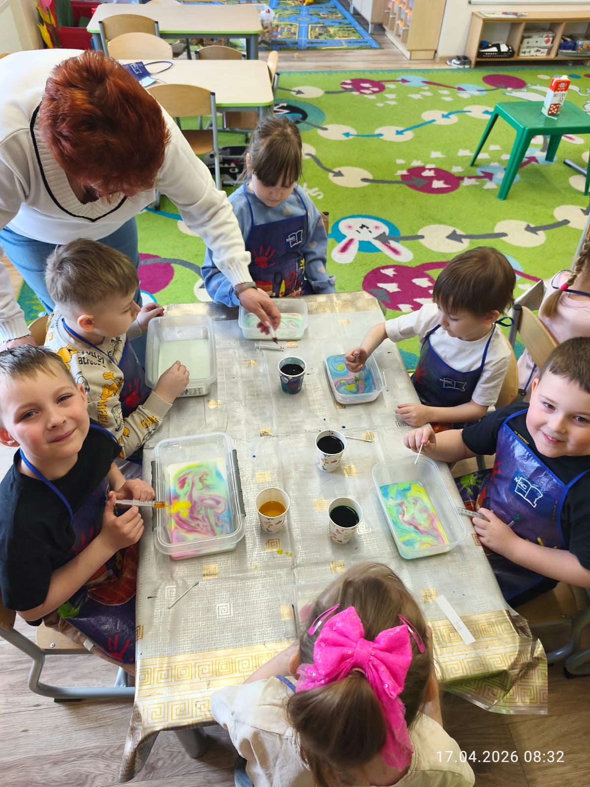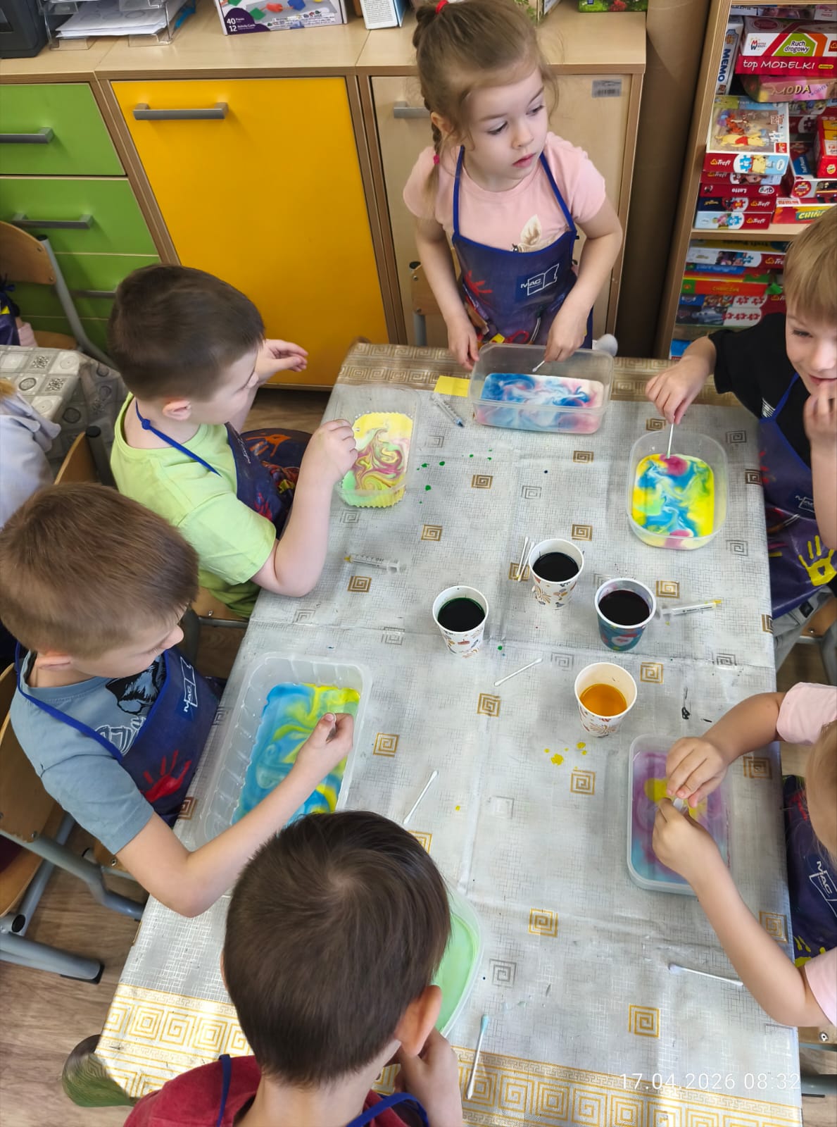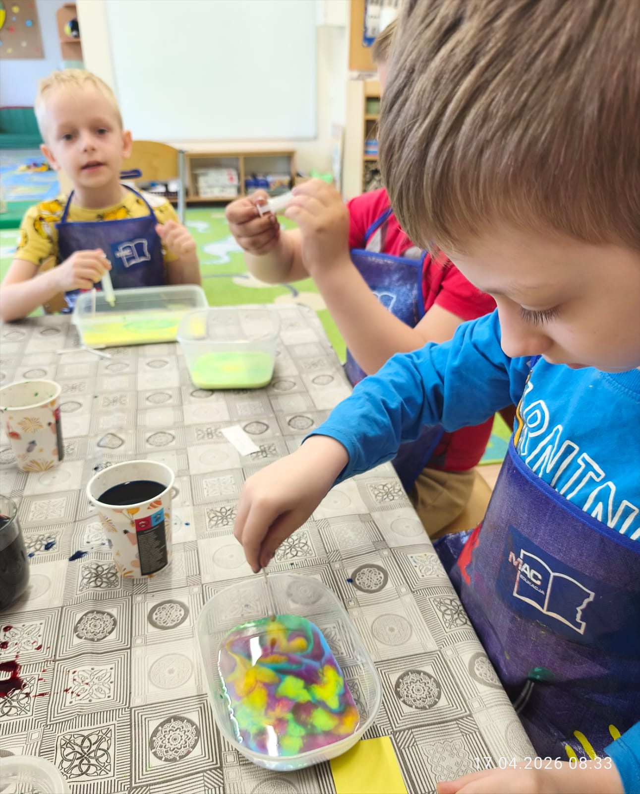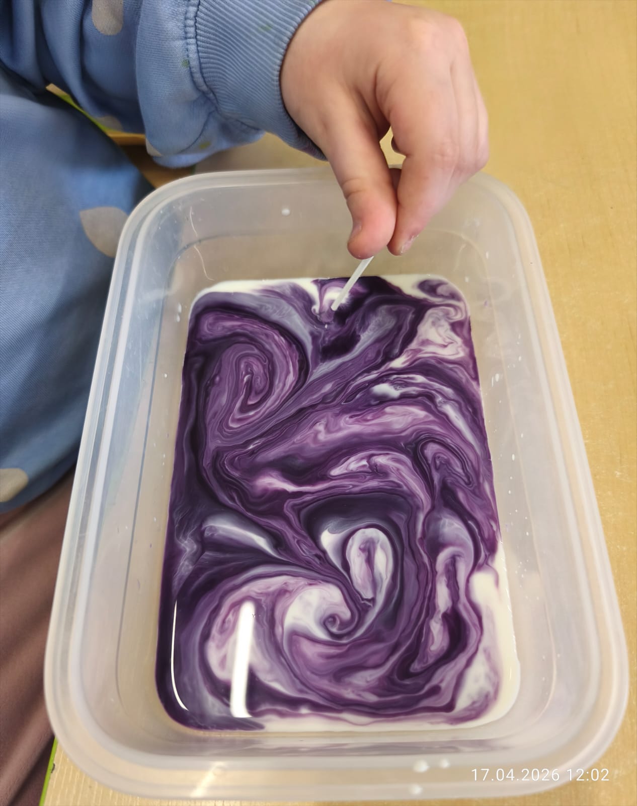 Dziś w zerówce przeprowadziliśmy wyjątkowy eksperyment – „malowanie na mleku”. Do doświadczenia użyliśmy mleka, barwników spożywczych oraz płynu do mycia naczyń. Dzieci z ogromnym zaciekawieniem obserwowały, jak kolory rozlewają się i „tańczą” na powierzchni mleka, tworząc barwne wzory. Przy okazji ćwiczyły motorykę małą – precyzyjne zakraplanie barwników strzykawką oraz koordynację ręka–oko. Zajęcia dostarczyły dużo radości i były świetnym połączeniem zabawy, nauki i kreatywności.